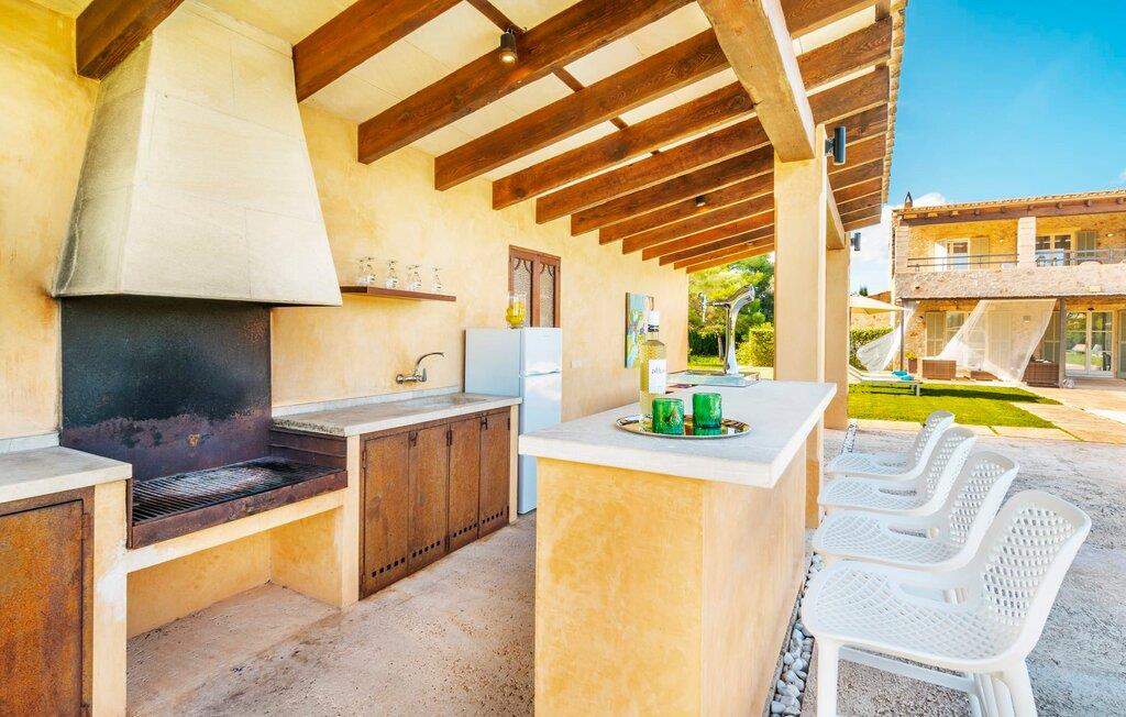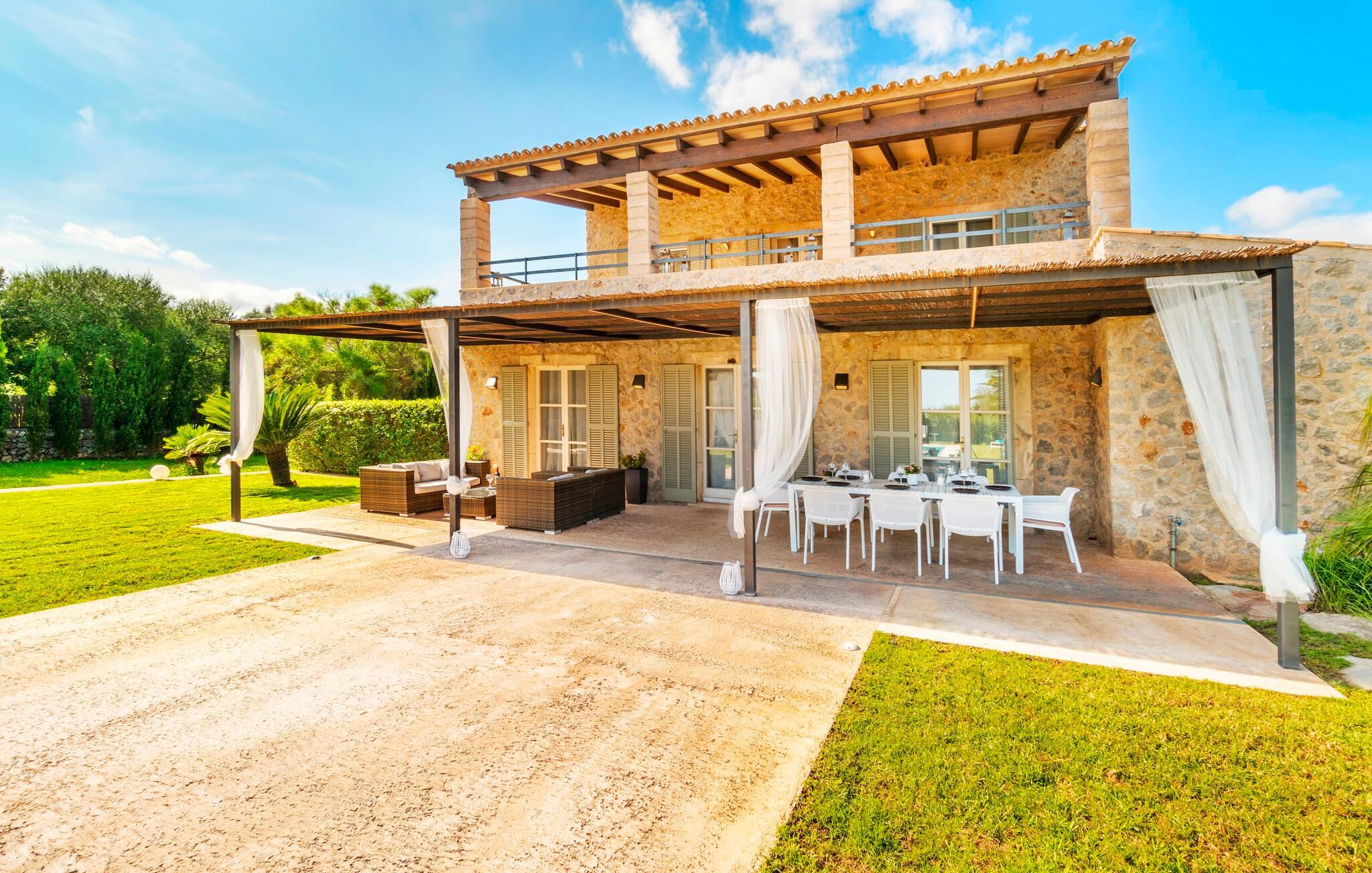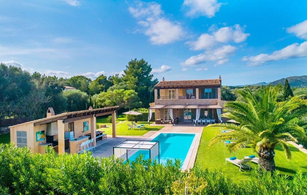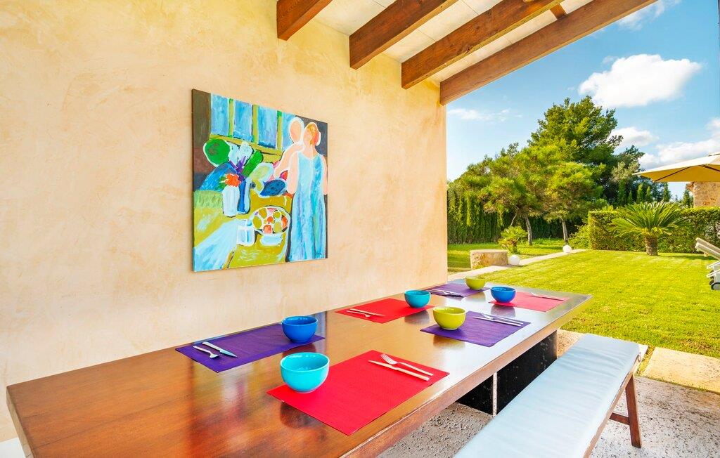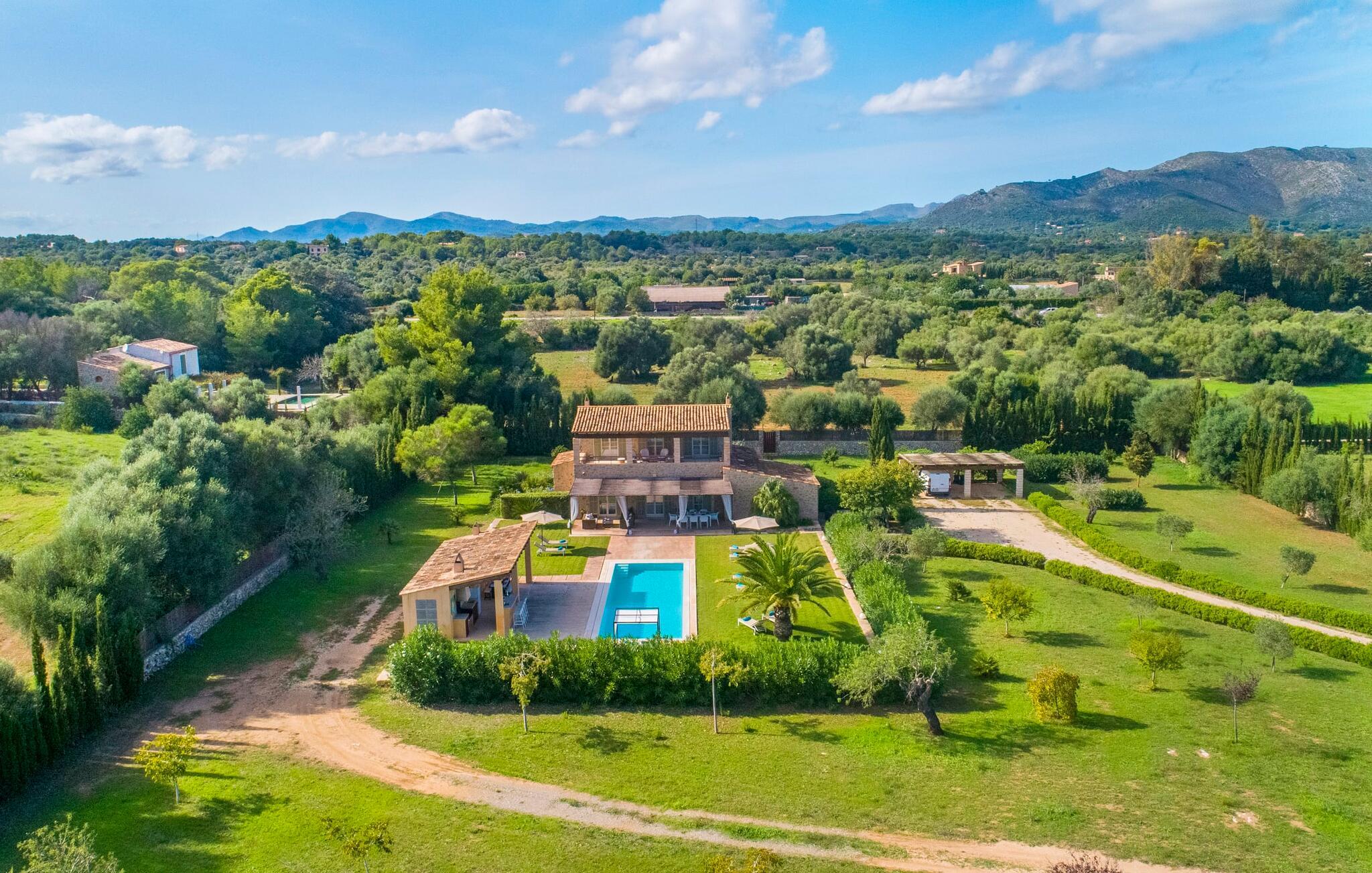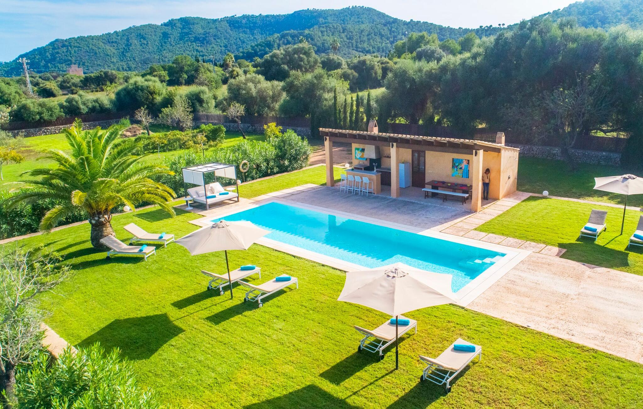 Den ædle, børnevenlige villa "Can Bossa" imponerer med sit fantastiske pris-ydelsesforhold. Alt er perfekt her: layout, indretning, udendørs område, fantastisk beliggenhed - og alt sammen til en fornuftig pris, selv i bryllupssæsonen. Villaen ligger mellem golfbanerne Capdepera og Canyamel, hvor sidstnævnte er særligt populær, da konstruktionen af komplekset har bevaret de gamle stenmure, som minder om den tidligere landbrugsstrukturelle opdeling af stedet. Nogle huller i linkene giver endda udsigt over Menorca på en klar dag. Feriegæster, der udover golf kan lide at tilbringe deres ferie udenfor, behøver ikke lede længere efter den perfekte villa. En velholdt have med store græsplæner tilskynder til omfattende udendørs afslapning. Et rigtigt højdepunkt er det originale poolhus, hvis overdækkede del er udstyret med en muret grillplads, et lille udekøkken og et indbydende spisebord. Loungeområdet lige ved siden af poolen inviterer jer til at slappe af med en lækker drink - for den rene feriefølelse. Terrassen, der støder op til den store pool med en dybde på 1,50 m byder på ti liggestole og forskellige parasoller, der giver skygge. Lige ved siden af huset finder I under forteltet med rundbuer og bambusbeklædning endnu en siddeplads med bord til 8 personer og afslapningsområde med sofa, lænestole og sofabord. Disse kan selvfølgelig også sættes sammen til at nyde en hyggelig morgenmad eller middag med en stor gruppe. Legesyge og hyggelige nicher som en sideterrasse med blot to stole ved siden af duftende lavendelbuske eller den overdækkede terrasse foran med rattan høje stole er bestemt værd at nævne her. Udemøblerne består af hvide jernlænestole med beige hynder. Selvom det generøst udstyrede udendørsområde inviterer jer til at tilbringe det meste af jeres tid udenfor under en klar blå himmel på varme dage, er indersiden af bygningen også attraktiv og vil helt sikkert appellere til alle elskere af sofistikeret boligstemning. Rummelige og lyse lokaler med klare linjer, hvide vægge og smagfulde gulvfliser venter os, så snart vi kommer ind gennem vinduerne med sprosser og sart grønne skodder. Den kombinerede stue/alrum imponerer med sit puristiske design, stilfuldt suppleret med en moderne og komfortabel stor beige sofa, et moderne spisebord med rattanstole og høje rygpuder. Takket være den åbne arkitektur kan alle gøre hvad de vil uden at forstyrre andre for meget. I kan bare slappe af i sofaen, spille et brætspil ved det store spisebord, dele jeres ferieoplevelser med jeres kære derhjemme ved hjælp af jeres smartphone, tablet eller notesbog, eller nyde middagen sammen. Det stilfulde trækøkken er moderne og fuldt udstyret med keramisk kogeplade, ovn, opvaskemaskine, køleskab med fryser, mikroovn, kaffemaskine og elkedel. Disse faciliteter giver jer mulighed for at tilbringe de dage, hvor I har besluttet at tilberede jeres egen middag i total afslapning og fuldstændig uafhængighed. De fire rummelige dobbeltværelser med aircondition inviterer jer med deres venlige elegance. Disse æstetisk designede afslapningsområder får et ekstra strejf af individualitet takket være de moderne kunstværker i stort format. Her vil alle finde den charme, der naturligt passer dem. De store garderobeskabe tilbyder nok opbevaringsplads til ferietøj, I har medbragt eller købt på Mallorca. Hvert soveværelse er også udstyret med et tv med internationale kanaler. Nogle af soveværelserne har direkte adgang til altanen eller terrassen. Inden I laver hø, eller når I vågner, så nyd naturens fred og ro, det vidunderlige middelhavsklima med en let havbrise og duften af blidt blomstrende planter. To af soveværelserne har eget badeværelse, mens de øvrige soveværelser deler endnu et badeværelse. Badeværelserne er smagfuldt designet i italiensk stil og byder på meget luksuriøse møbler. Uanset hvordan I vil tilbringe jeres ferie, om det er at spille en runde golf, besøge stranden på en af øens forskellige attraktive østkyststrækninger, shoppe i de nærliggende byer eller besøge klubberne i Cala Ratrjada – alle døre er åbne fra kl. villaen "Can Bossa" er åben for jer! Vi er sikre på, at I altid vil nyde at vende "hjem" til jeres smukke feriehus og nyde den afslappende, behagelig atmosfære. Vi hos Fincallorca ønsker jer en afslappende ferie. Den moderne villa "Can Bossa" er en smuk feriebolig med overdådig indretning - og et fremragende forhold mellem pris og ydelse. Det attraktive feriehus ligger mellem landsbyerne (og golfbanerne) Capdepera og Canyamel. I Capdepera kan I for eksempel handle på markedet hver onsdag. Artà, som har bevaret sin originalitet, er også bestemt et besøg værd. De smukke strande, herunder de fine sandstrande i Capdepera og Sa Marjal, kan hurtigt og nemt nås med lejebil.