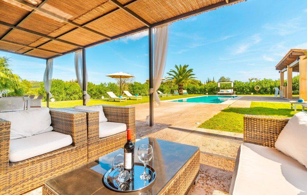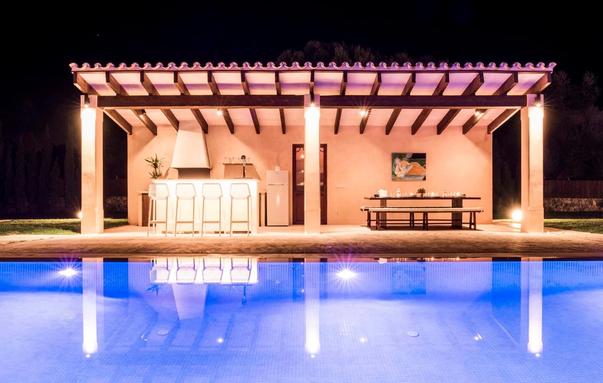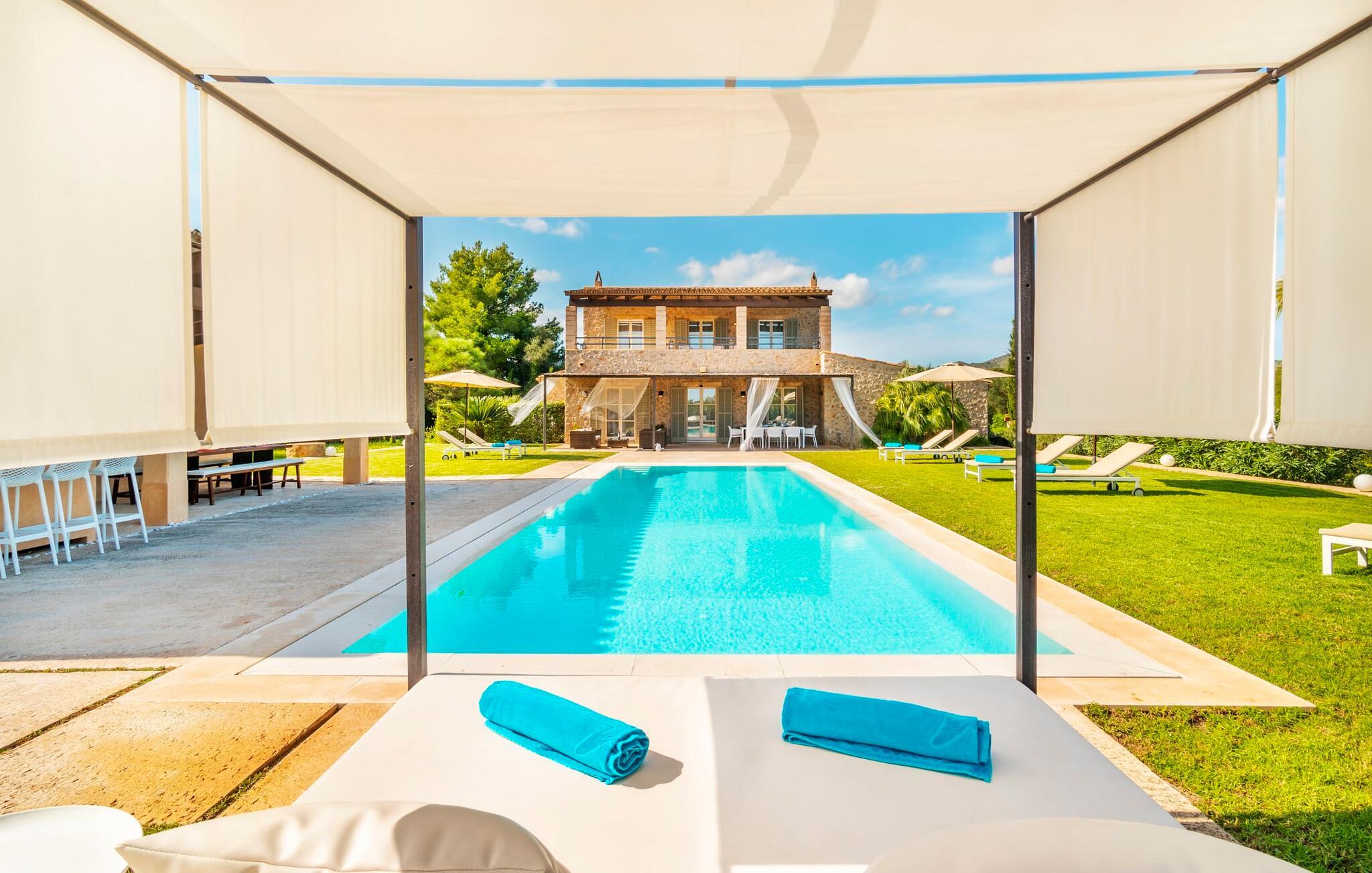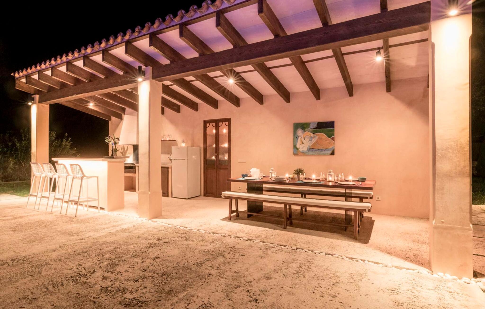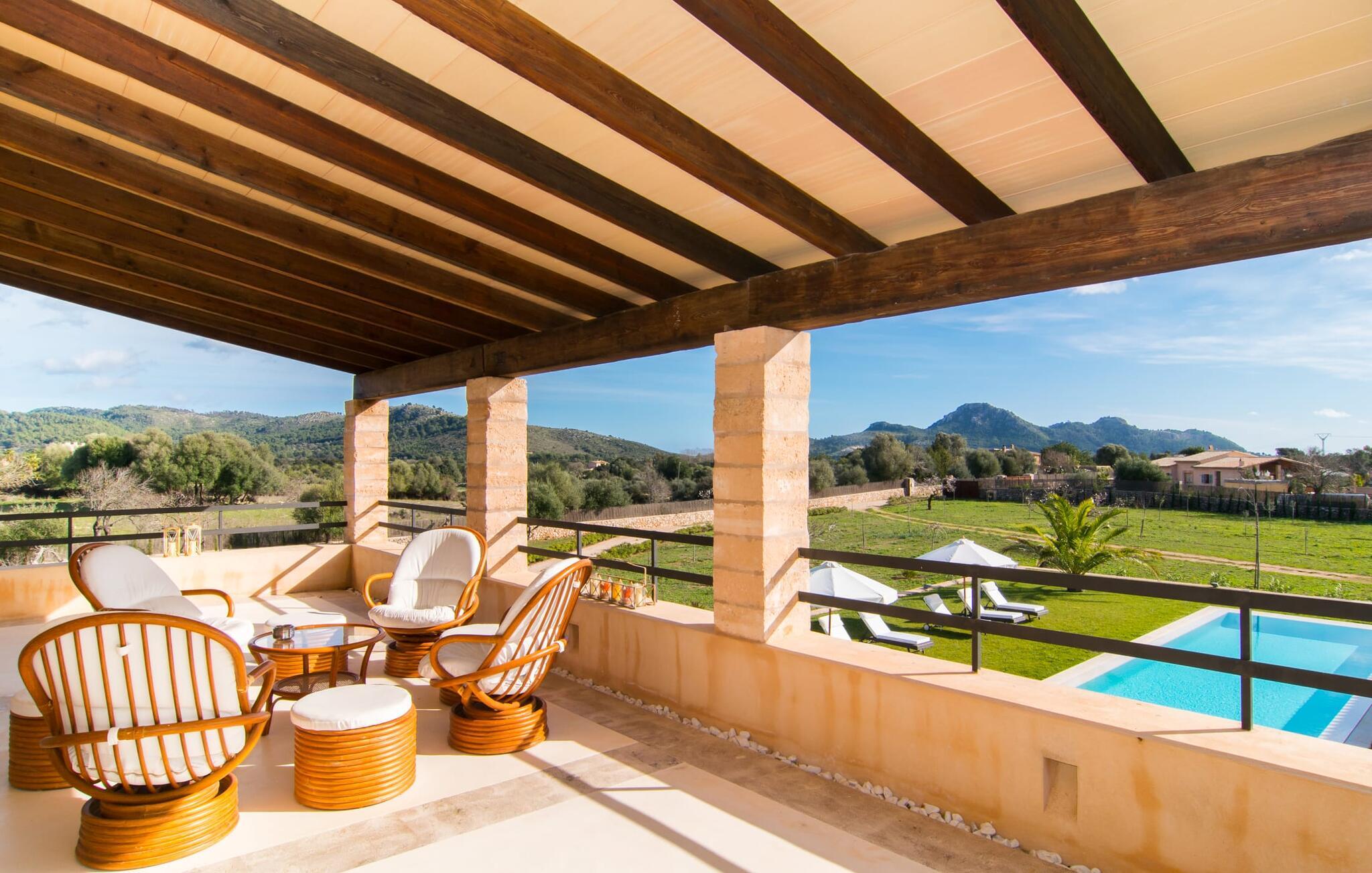 Den ædle, børnevenlige villa "Can Bossa" imponerer med sit fantastiske pris-ydelsesforhold. Alt er perfekt her: layout, indretning, udendørs område, fantastisk beliggenhed - og alt sammen til en fornuftig pris, selv i bryllupssæsonen. Villaen ligger mellem golfbanerne Capdepera og Canyamel, hvor sidstnævnte er særligt populær, da konstruktionen af komplekset har bevaret de gamle stenmure, som minder om den tidligere landbrugsstrukturelle opdeling af stedet. Nogle huller i linkene giver endda udsigt over Menorca på en klar dag. Feriegæster, der udover golf kan lide at tilbringe deres ferie udenfor, behøver ikke lede længere efter den perfekte villa. En velholdt have med store græsplæner tilskynder til omfattende udendørs afslapning. Et rigtigt højdepunkt er det originale poolhus, hvis overdækkede del er udstyret med en muret grillplads, et lille udekøkken og et indbydende spisebord. Loungeområdet lige ved siden af poolen inviterer jer til at slappe af med en lækker drink - for den rene feriefølelse. Terrassen, der støder op til den store pool med en dybde på 1,50 m byder på ti liggestole og forskellige parasoller, der giver skygge. Lige ved siden af huset finder I under forteltet med rundbuer og bambusbeklædning endnu en siddeplads med bord til 8 personer og afslapningsområde med sofa, lænestole og sofabord. Disse kan selvfølgelig også sættes sammen til at nyde en hyggelig morgenmad eller middag med en stor gruppe. Legesyge og hyggelige nicher som en sideterrasse med blot to stole ved siden af duftende lavendelbuske eller den overdækkede terrasse foran med rattan høje stole er bestemt værd at nævne her. Udemøblerne består af hvide jernlænestole med beige hynder. Selvom det generøst udstyrede udendørsområde inviterer jer til at tilbringe det meste af jeres tid udenfor under en klar blå himmel på varme dage, er indersiden af bygningen også attraktiv og vil helt sikkert appellere til alle elskere af sofistikeret boligstemning. Rummelige og lyse lokaler med klare linjer, hvide vægge og smagfulde gulvfliser venter os, så snart vi kommer ind gennem vinduerne med sprosser og sart grønne skodder. Den kombinerede stue/alrum imponerer med sit puristiske design, stilfuldt suppleret med en moderne og komfortabel stor beige sofa, et moderne spisebord med rattanstole og høje rygpuder. Takket være den åbne arkitektur kan alle gøre hvad de vil uden at forstyrre andre for meget. I kan bare slappe af i sofaen, spille et brætspil ved det store spisebord, dele jeres ferieoplevelser med jeres kære derhjemme ved hjælp af jeres smartphone, tablet eller notesbog, eller nyde middagen sammen. Det stilfulde trækøkken er moderne og fuldt udstyret med keramisk kogeplade, ovn, opvaskemaskine, køleskab med fryser, mikroovn, kaffemaskine og elkedel. Disse faciliteter giver jer mulighed for at tilbringe de dage, hvor I har besluttet at tilberede jeres egen middag i total afslapning og fuldstændig uafhængighed. De fire rummelige dobbeltværelser med aircondition inviterer jer med deres venlige elegance. Disse æstetisk designede afslapningsområder får et ekstra strejf af individualitet takket være de moderne kunstværker i stort format. Her vil alle finde den charme, der naturligt passer dem. De store garderobeskabe tilbyder nok opbevaringsplads til ferietøj, I har medbragt eller købt på Mallorca. Hvert soveværelse er også udstyret med et tv med internationale kanaler. Nogle af soveværelserne har direkte adgang til altanen eller terrassen. Inden I laver hø, eller når I vågner, så nyd naturens fred og ro, det vidunderlige middelhavsklima med en let havbrise og duften af blidt blomstrende planter. To af soveværelserne har eget badeværelse, mens de øvrige soveværelser deler endnu et badeværelse. Badeværelserne er smagfuldt designet i italiensk stil og byder på meget luksuriøse møbler. Uanset hvordan I vil tilbringe jeres ferie, om det er at spille en runde golf, besøge stranden på en af øens forskellige attraktive østkyststrækninger, shoppe i de nærliggende byer eller besøge klubberne i Cala Ratrjada – alle døre er åbne fra kl. villaen "Can Bossa" er åben for jer! Vi er sikre på, at I altid vil nyde at vende "hjem" til jeres smukke feriehus og nyde den afslappende, behagelig atmosfære. Vi hos Fincallorca ønsker jer en afslappende ferie. Den moderne villa "Can Bossa" er en smuk feriebolig med overdådig indretning - og et fremragende forhold mellem pris og ydelse. Det attraktive feriehus ligger mellem landsbyerne (og golfbanerne) Capdepera og Canyamel. I Capdepera kan I for eksempel handle på markedet hver onsdag. Artà, som har bevaret sin originalitet, er også bestemt et besøg værd. De smukke strande, herunder de fine sandstrande i Capdepera og Sa Marjal, kan hurtigt og nemt nås med lejebil.