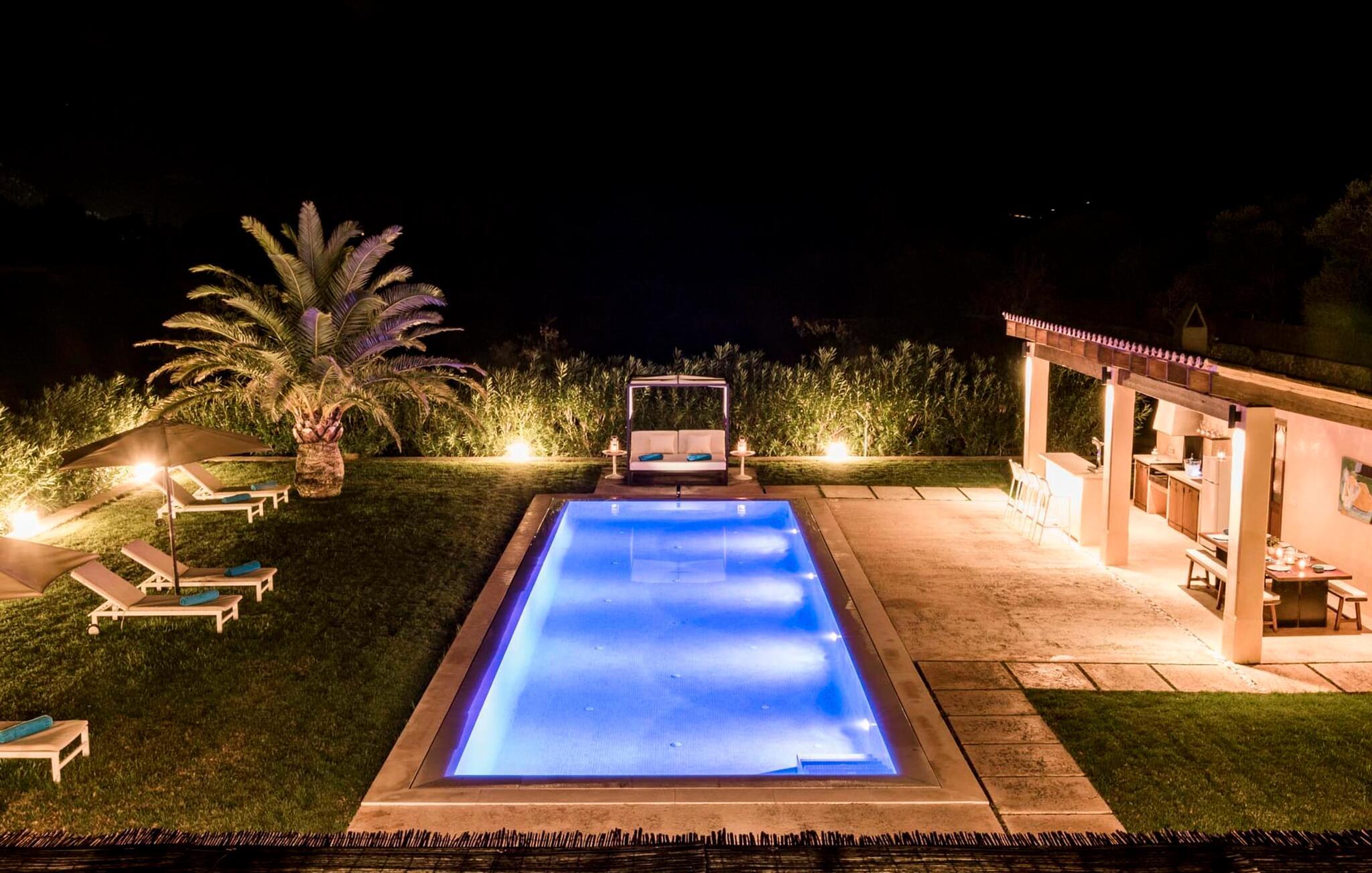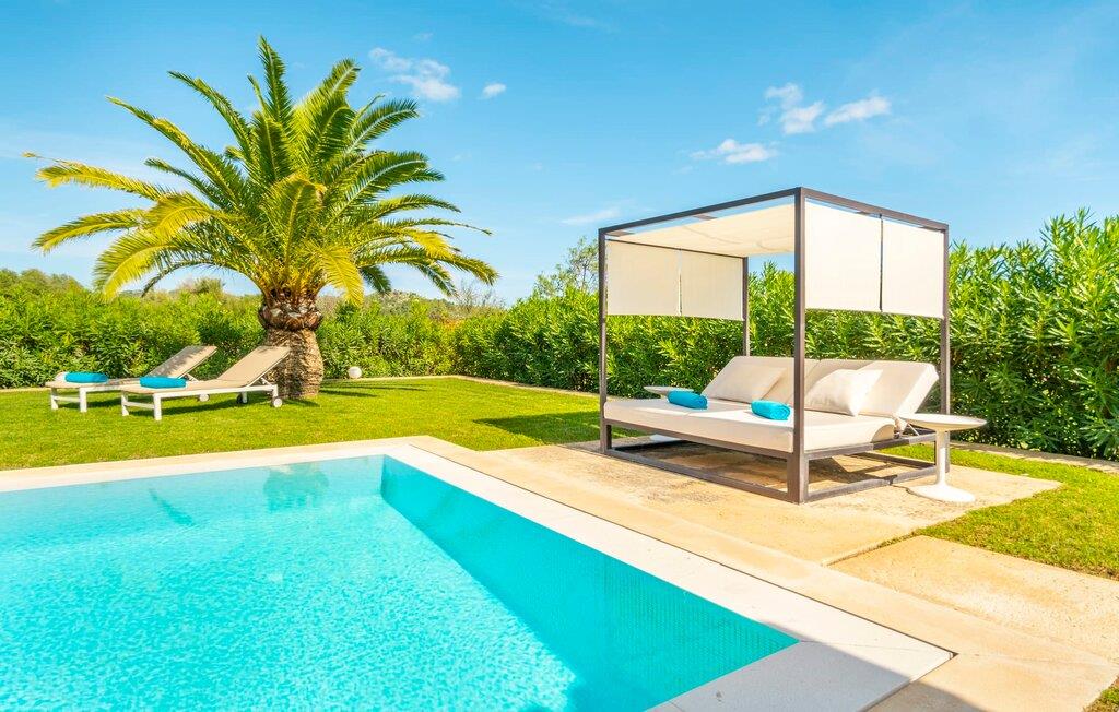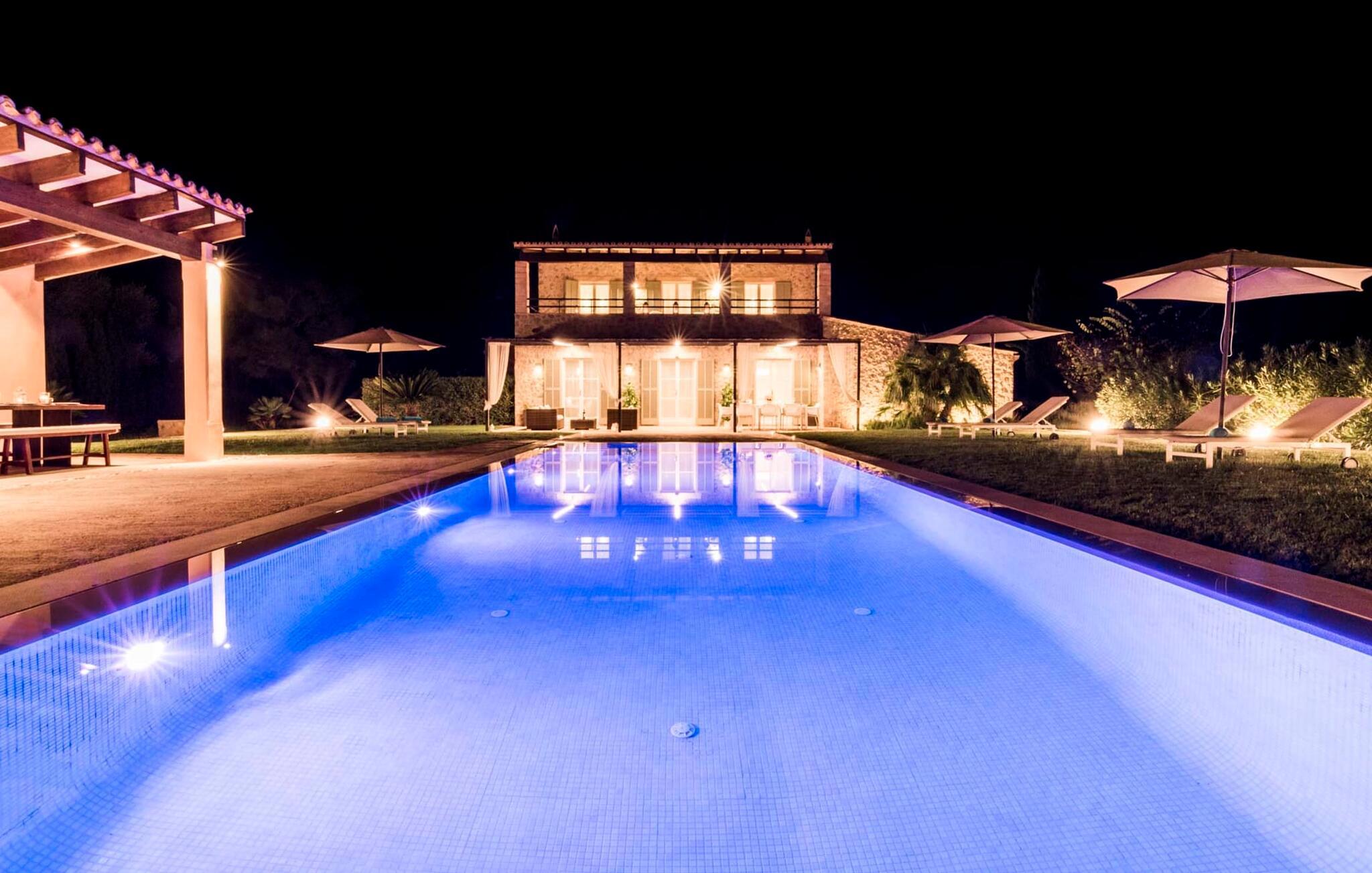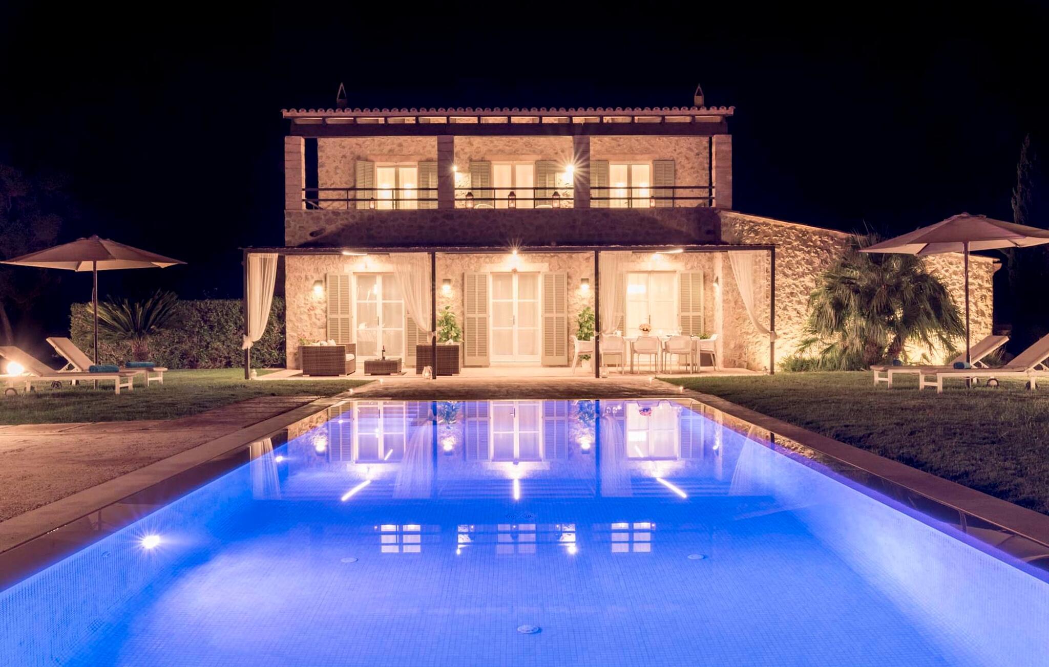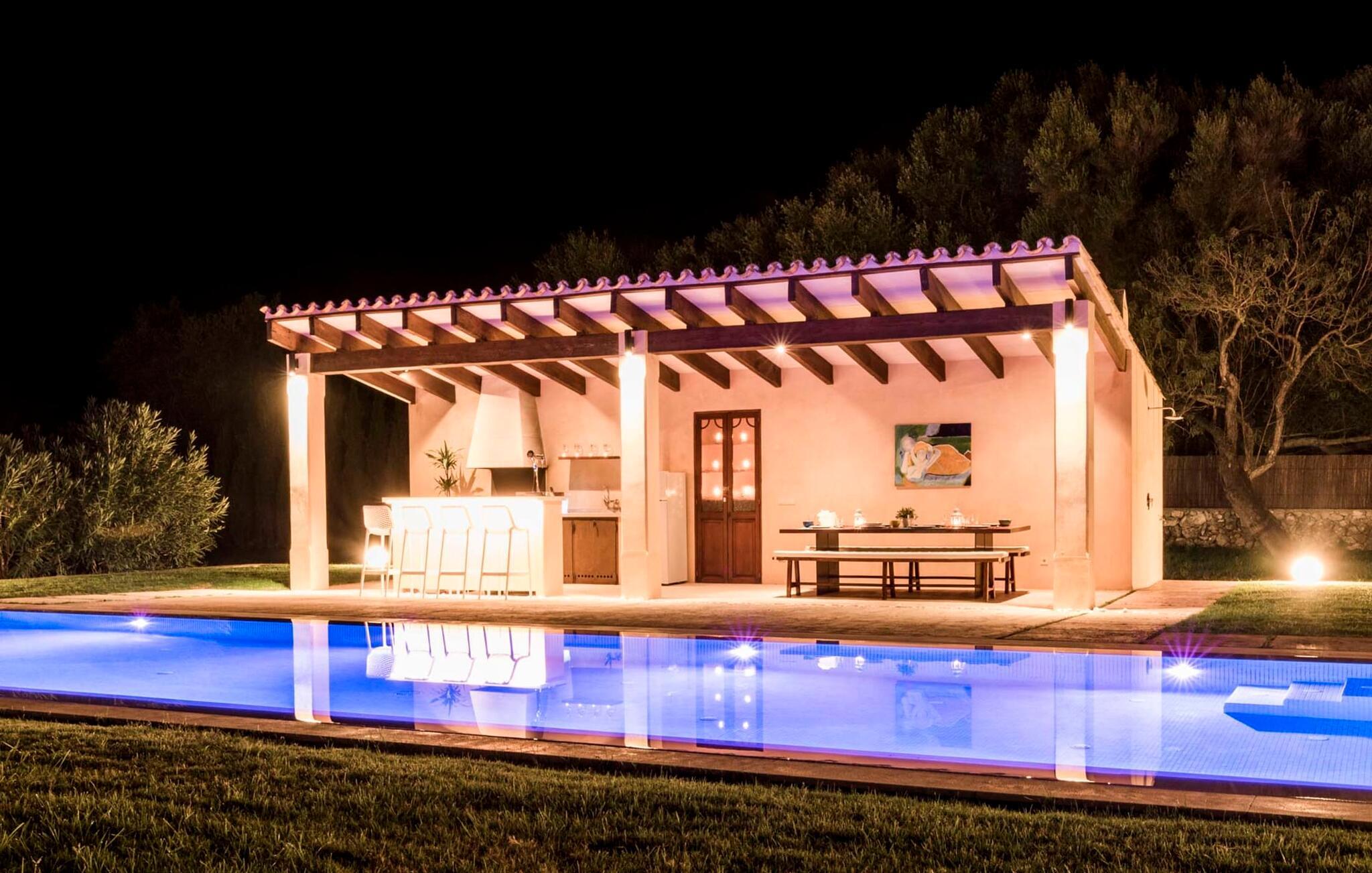 Den ædle, børnevenlige villa "Can Bossa" imponerer med sit fantastiske pris-ydelsesforhold. Alt er perfekt her: layout, indretning, udendørs område, fantastisk beliggenhed - og alt sammen til en fornuftig pris, selv i bryllupssæsonen. Villaen ligger mellem golfbanerne Capdepera og Canyamel, hvor sidstnævnte er særligt populær, da konstruktionen af komplekset har bevaret de gamle stenmure, som minder om den tidligere landbrugsstrukturelle opdeling af stedet. Nogle huller i linkene giver endda udsigt over Menorca på en klar dag. Feriegæster, der udover golf kan lide at tilbringe deres ferie udenfor, behøver ikke lede længere efter den perfekte villa. En velholdt have med store græsplæner tilskynder til omfattende udendørs afslapning. Et rigtigt højdepunkt er det originale poolhus, hvis overdækkede del er udstyret med en muret grillplads, et lille udekøkken og et indbydende spisebord. Loungeområdet lige ved siden af poolen inviterer jer til at slappe af med en lækker drink - for den rene feriefølelse. Terrassen, der støder op til den store pool med en dybde på 1,50 m byder på ti liggestole og forskellige parasoller, der giver skygge. Lige ved siden af huset finder I under forteltet med rundbuer og bambusbeklædning endnu en siddeplads med bord til 8 personer og afslapningsområde med sofa, lænestole og sofabord. Disse kan selvfølgelig også sættes sammen til at nyde en hyggelig morgenmad eller middag med en stor gruppe. Legesyge og hyggelige nicher som en sideterrasse med blot to stole ved siden af duftende lavendelbuske eller den overdækkede terrasse foran med rattan høje stole er bestemt værd at nævne her. Udemøblerne består af hvide jernlænestole med beige hynder. Selvom det generøst udstyrede udendørsområde inviterer jer til at tilbringe det meste af jeres tid udenfor under en klar blå himmel på varme dage, er indersiden af bygningen også attraktiv og vil helt sikkert appellere til alle elskere af sofistikeret boligstemning. Rummelige og lyse lokaler med klare linjer, hvide vægge og smagfulde gulvfliser venter os, så snart vi kommer ind gennem vinduerne med sprosser og sart grønne skodder. Den kombinerede stue/alrum imponerer med sit puristiske design, stilfuldt suppleret med en moderne og komfortabel stor beige sofa, et moderne spisebord med rattanstole og høje rygpuder. Takket være den åbne arkitektur kan alle gøre hvad de vil uden at forstyrre andre for meget. I kan bare slappe af i sofaen, spille et brætspil ved det store spisebord, dele jeres ferieoplevelser med jeres kære derhjemme ved hjælp af jeres smartphone, tablet eller notesbog, eller nyde middagen sammen. Det stilfulde trækøkken er moderne og fuldt udstyret med keramisk kogeplade, ovn, opvaskemaskine, køleskab med fryser, mikroovn, kaffemaskine og elkedel. Disse faciliteter giver jer mulighed for at tilbringe de dage, hvor I har besluttet at tilberede jeres egen middag i total afslapning og fuldstændig uafhængighed. De fire rummelige dobbeltværelser med aircondition inviterer jer med deres venlige elegance. Disse æstetisk designede afslapningsområder får et ekstra strejf af individualitet takket være de moderne kunstværker i stort format. Her vil alle finde den charme, der naturligt passer dem. De store garderobeskabe tilbyder nok opbevaringsplads til ferietøj, I har medbragt eller købt på Mallorca. Hvert soveværelse er også udstyret med et tv med internationale kanaler. Nogle af soveværelserne har direkte adgang til altanen eller terrassen. Inden I laver hø, eller når I vågner, så nyd naturens fred og ro, det vidunderlige middelhavsklima med en let havbrise og duften af blidt blomstrende planter. To af soveværelserne har eget badeværelse, mens de øvrige soveværelser deler endnu et badeværelse. Badeværelserne er smagfuldt designet i italiensk stil og byder på meget luksuriøse møbler. Uanset hvordan I vil tilbringe jeres ferie, om det er at spille en runde golf, besøge stranden på en af øens forskellige attraktive østkyststrækninger, shoppe i de nærliggende byer eller besøge klubberne i Cala Ratrjada – alle døre er åbne fra kl. villaen "Can Bossa" er åben for jer! Vi er sikre på, at I altid vil nyde at vende "hjem" til jeres smukke feriehus og nyde den afslappende, behagelig atmosfære. Vi hos Fincallorca ønsker jer en afslappende ferie. Den moderne villa "Can Bossa" er en smuk feriebolig med overdådig indretning - og et fremragende forhold mellem pris og ydelse. Det attraktive feriehus ligger mellem landsbyerne (og golfbanerne) Capdepera og Canyamel. I Capdepera kan I for eksempel handle på markedet hver onsdag. Artà, som har bevaret sin originalitet, er også bestemt et besøg værd. De smukke strande, herunder de fine sandstrande i Capdepera og Sa Marjal, kan hurtigt og nemt nås med lejebil.