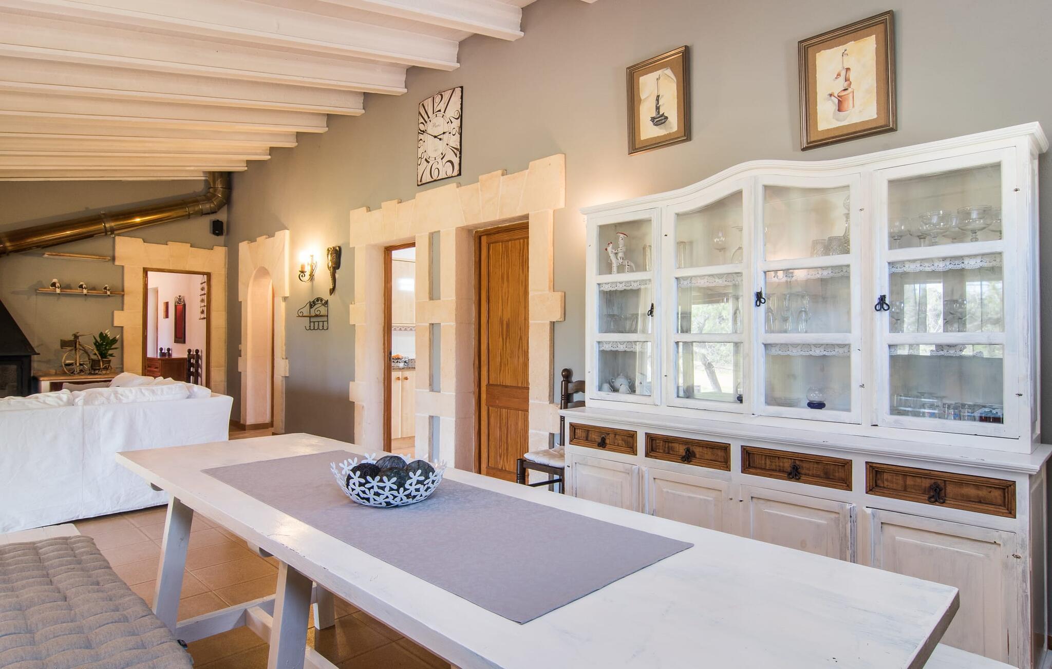 Den smukke villa "Can Caragol" er lidt mindre end mange andre i vores portefølje, men det er netop det, der gør denne lille perle med sin chalet-lignende karakter så speciel. De cremefarvede dekorationer omkring vinduerne i den orangebrune bygning ligner små kroner, mens de hvide skodder runder det indbydende indtryk af. Selvom havet og andre huse er inden for synsvidde, kan I her nyde den afsondrede landlige beliggenhed og se på tværs af ejendommen til det stedsegrønne landskab bagved. I vil opdage figen- og oliventræer i den rummelige have og samtidig nyde duften af middelhavsblomster med en uberørt karakter. Denne fornøjelse nydes bedst på solterrassen med spiseplads, men også på den overdækkede terrasse på den anden side af bygningen. Morgenmad i solen, en siesta på en af de komfortable liggestole, happy hour i de lilla loungemøbler, en grillaften i ly af verandaen - hvilken vidunderlig måde at tilbringe jeres ferie på! Poolen, der er installeret på et plateau, ligger kun få meter fra huset, og ligesom alle jeres yndlingssteder i denne store have, er den slet ikke synlig. Der er også liggestole til at slappe af og slappe af. I denne smukke villa ligger skønheden bestemt i detaljerne. Den moderne stil med et strejf af land er behagelig og afslappet. At koncentrere sig om det væsentlige, smarte detaljer og farverige accenter hjælper jer med at flygte fra hverdagen. Så snart I træder ind af døren, vil I indse, hvorfor det er så nemt at bo her – for I vil blive ramt af en imødekommende og behagelig følelse af at være hjemme. Det rustikt udseende spisebord med enkle træbænke og blødt polstrede hynder passer perfekt sammen med landstedsmøbler med et strejf af shabby chic. Den hyggelige hjørnesofa foran pejsen dominerer den anden halvdel af rummet og imponerer i kombination med sandstenselementerne på vægge og døre samt de lakerede trælofter. Alle værelser har terracotta-farvede gulvfliser, inklusive det separate køkken, som tilbyder alle de sædvanlige faciliteter til selvforplejning i sin fuldt udstyrede enhed. Da det at lave mad eller grille sammen er en integreret del af en ferie, er det en velovervejet beslutning at vælge selvforplejning. Denne anbefalede villa er velegnet til to par med eller uden børn samt til en familie med børn, der hellere vil have et hus end en ferielejlighed. Følelsen af frihed, som en ugeneret villa som denne byder på, er i sandhed noget særligt. Vores gæster er garanteret en afslappende nat i to dobbeltværelser, hver udstyret med 90 cm brede senge. De to hvide badekar med traditionelle mallorcanske blomstermotiver af keramiske kanter fuldender den harmoniske atmosfære i dette smukke hus. Ikke engang 500 m fra havet byder denne smukke villa på en smuk kombination af idyllisk landskab og alligevel veludviklet infrastruktur. Resultatet er en perfekt ferie, der henvender sig til alle interesser: slentre rundt på feriestedet, shoppe, slappe af på stranden eller slappe af i det fredeligt afsondrede feriehus under jeres uvurderlige nedetid. Det lille feriested Sa Font de Sa Cala er mest kendt for sin familievenlige atmosfære, lyse sand og krystalklare vand – stranden er endda inden for gåafstand. Vandsportsentusiaster vil finde en bred vifte af aktiviteter, herunder dykning eller leje af stand-up paddleboards eller vandcykler. Der er flere restauranter, selv lige ved stranden. Hvis I vil udforske området, vil I fortryde en tur til Capdepera eller Cala Ratjada og bestemt ikke jeres ophold på “Can Caragol”. Den markante villa "Can Caragol" med landlig flair ligger nær den lille kystby Sa Font de Sa Cala, som ligger i gåafstand. Omgivet af middelhavsvegetation og sat på baggrund af fredelige bølgende bakker, er husets beliggenhed perfekt til at besøge de nærliggende feriesteder Pedruscada, Capdepera eller det livlige Cala Ratjada. Vandsportsentusiaster vil få noget for pengene på Sa Font de Sa Cala-stranden, som er synlig fra villaen.