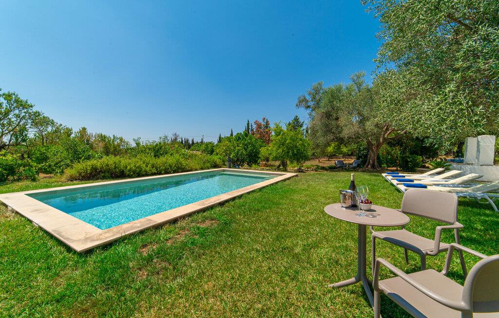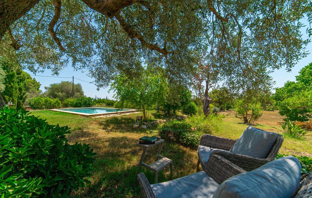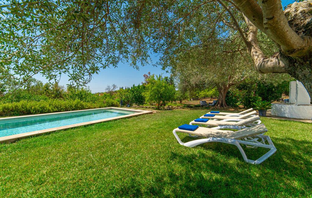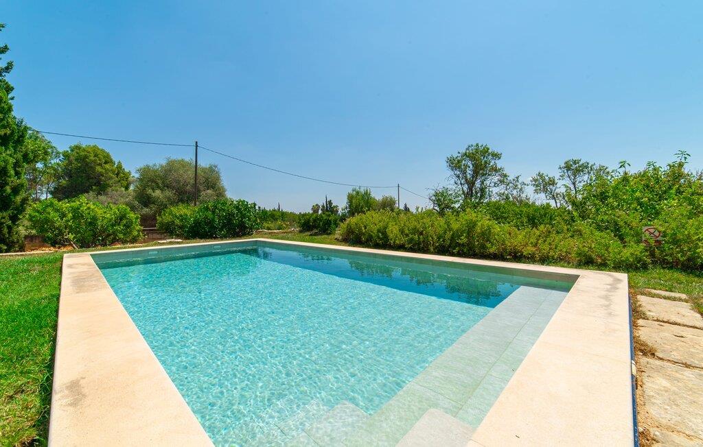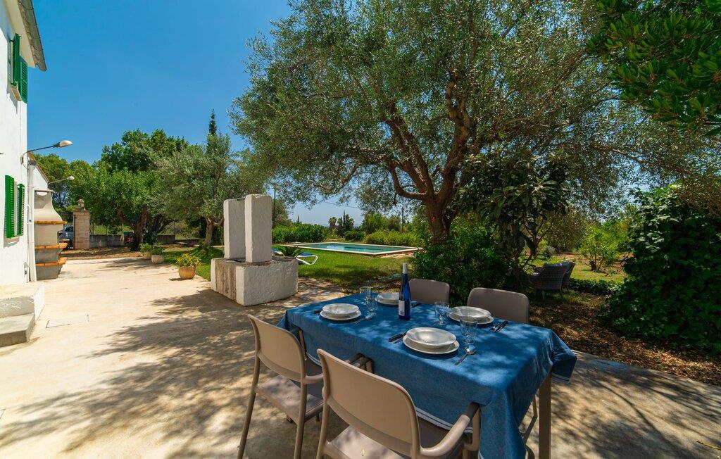 Op til fire personer kan tilbringe en vidunderlig afslappende ferie på landet her: Den velholdte hvide villa "Can Dameto" inviterer jer til at slappe af med masser af komfort og rummelig grund. Der er forskellige siddemuligheder på den brolagte terrasse bag huset, så I kan servere og nyde frisklavede lækkerier fra husets grill direkte ved bordet i det fri. Talrige gamle oliventræer giver skygge til de komfortable liggestole, mens poolen omgivet af græsplæner giver en behagelig forfriskning på varme dage. Villaens indre er venligt, lyst og smagfuldt indrettet. Traditionelle arkitektoniske elementer og til dels moderne møbler, hvide vægge og praktiske og smukke klinkegulve harmonerer vidunderligt med de smukke, brune trævinduer og det nøje udvalgte boligtilbehør. Opholds- og spiseafdelingen samt det smarte, enkle køkken flyder ind i hinanden, så I kan nyde de korte afstande. Badeværelset er også i stueetagen. En stentrappe fører jer til første sal, hvor de tre stilfulde og diskret designede soveværelser er placeret. Nyd det mallorcanske landliv fuldt ud - og i fuldstændig privatliv. Den hvide finca "Can Damento" med sine fortryllende grønne skodder og egen pool i haven ligger vidunderligt ugeneret midt i naturen. For at shoppe skal I kun køre cirka 3,1 km til den smukke vinby Binissalem. Lej en bil, der er egnet til "rustikke" sektioner af ruten. Den nærmeste strand, Ciudad Jardin, er omkring 28 km væk, ligesom øens hovedstad, Palma.