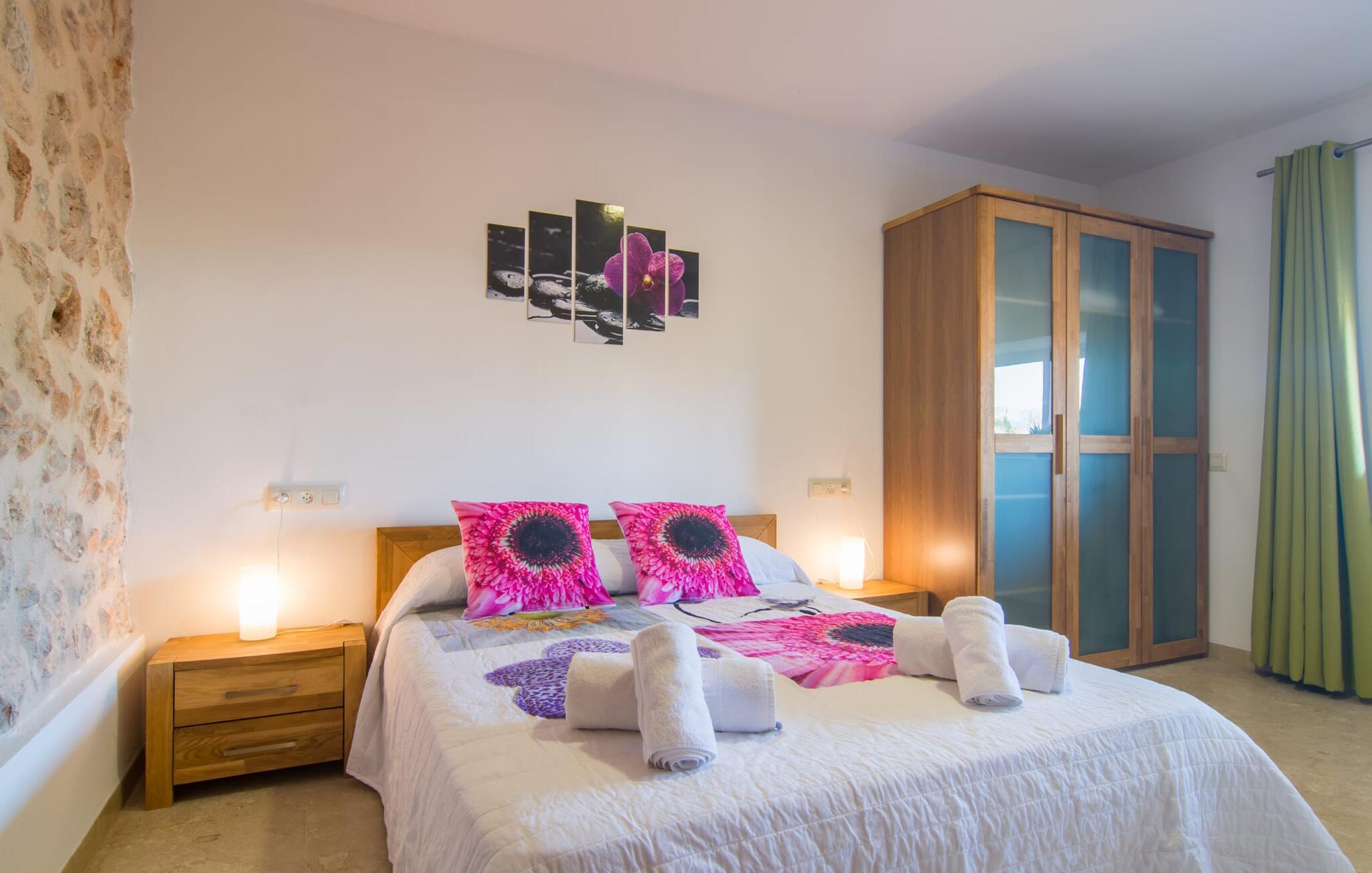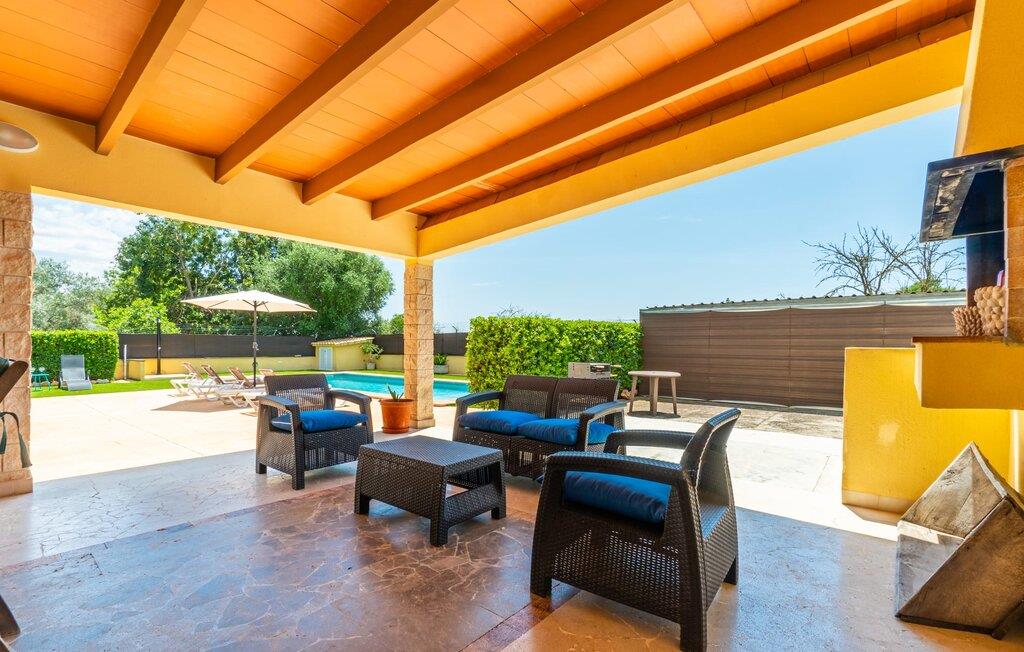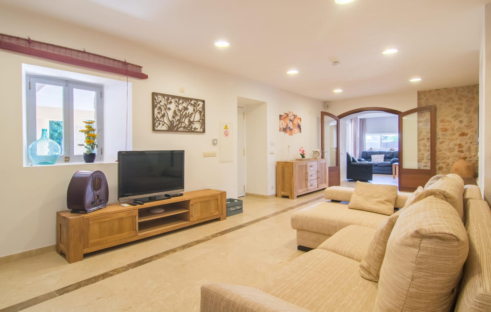 Villaen “Can Just” skinner i solgul, kombineret med rustikke natursten, nær Inca midt på øen. Det nybyggede etplanshus har et indbydende, velholdt udeareal. I midten er den store, rektangulære pool med udendørs bruser, omgivet af en asfalteret solterrasse og kunstig græsplæne med mange komfortable liggestole og en skyggefuld parasol. Her er garanteret fuldkommen privatliv, og der er også masser af plads til, at børn kan plaske rundt, og voksne kan svømme. De overdækkede terrassearealer omkring huset er særligt smukke. Med udekøkkenet og udendørsbadeværelset kan I flytte jeres ferieliv næsten udelukkende udendørs. Der er masser af sidde- og afslapningsmuligheder: fra komfortable udendørs loungemøbler til en smuk stenbænk med komfortable hynder til det store spisebord med tilhørende stole. Og hvis I leder efter en udfordring, kan I spille et spil bordtennis mod jeres medrejsende ved det interne bord. En afslappet blanding af moderne og rustikke møbler sikrer en rigtig god, afslappet behagelig atmosfære overalt i “Can Just” - kom og føl jer godt! I jeres villa finder I alt komfortabelt på ét niveau. For eksempel køkkenet med højkvalitets hvidevarer samt varme, brune træfacader og et højdepunkt i form af en knaldrød ovn. Den åbner ud i opholds- og spiseafdelingen, hvor et stort træbord og tilhørende stole samt en behagelig lædersofa med lænestole venter på jer. Drej om hjørnet, og gå gennem et imponerende sæt dobbeltdøre for at opdage endnu en komfortabel sofa til en afslappende aften med at se tv. Når I er træt, kan I trække jer tilbage til et af de tre dobbeltværelser, alle indrettet med sans for detaljer, med plads nok til jeres feriegarderobe og aircondition, så I ikke sveder selv i sommertemperaturer. Et andet soveværelse er tilgængeligt for dem, der kun virkelig kan slappe af alene om natten. Boligkomforten i villaen suppleres af to elegante og smarte badeværelser. Villaen “Can Just” er et komfortabelt feriehus på landet: Beliggende i centrum af øen, kun ca. 4,6 km fra Inca, imponerer det velholdte enplanshus ikke kun med sin flotte indretning, men også med diverse overdækkede terrassearealer og stor pool. I kan tage skønne vandreture i de landlige omgivelser med de mange omfattende olivenlunde; For en dag på stranden er det bedst at køre de 28,9 km til Alcúdia. Bemærk venligst, at denne ejendom ikke accepterer ungdomsgrupper eller polterabender. En ungdomsgruppe på denne ejendom består af personer på 28 år eller derunder. Book ikke denne ejendom, hvis I er en ungdomsgruppe eller polterabend, da jeres reservation vil blive afvist, når den er booket, hvilket også kan være tilfældet ved ankomst til ejendommen eller under jeres ophold, og I vil ikke modtage en refusion