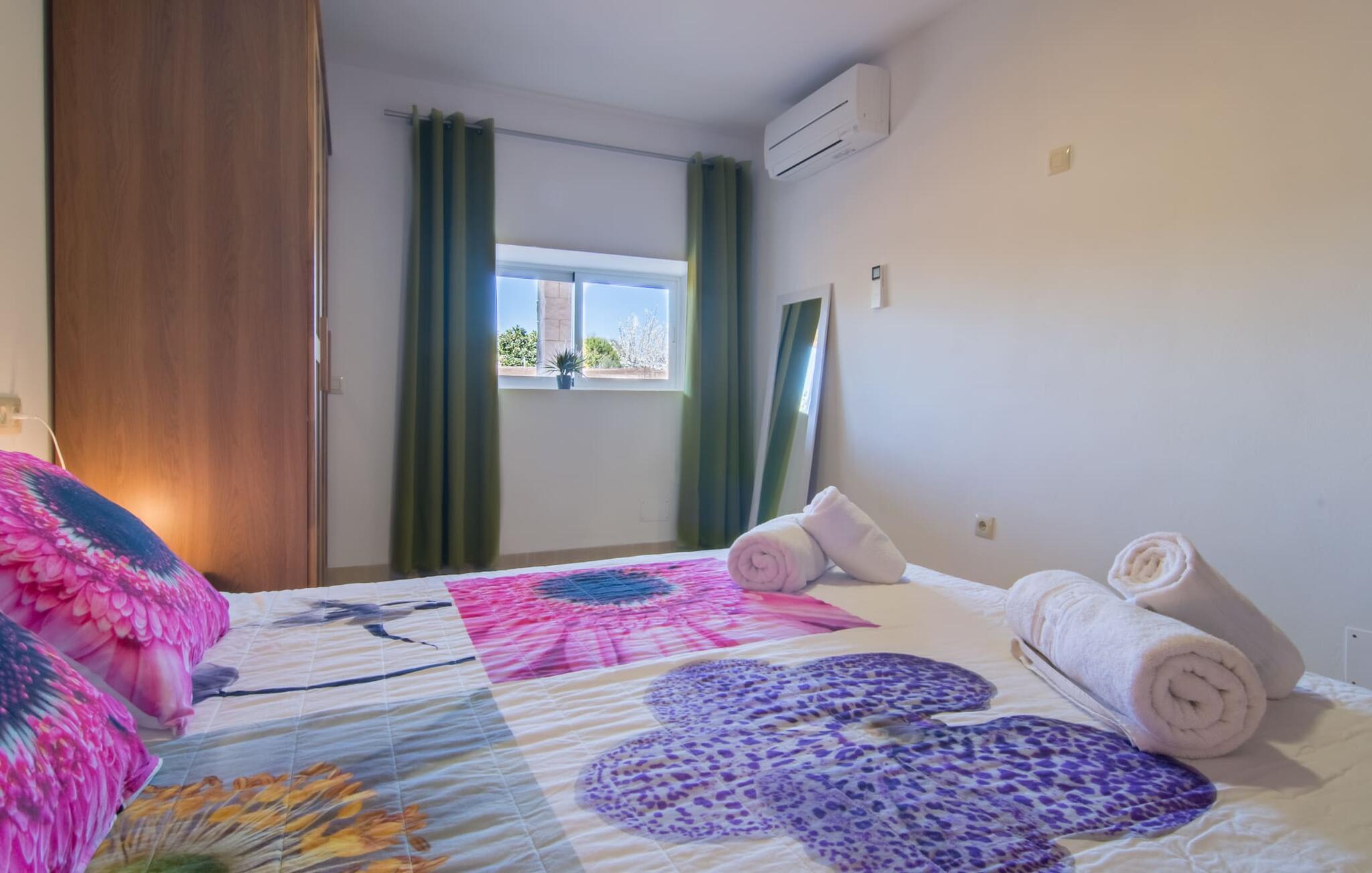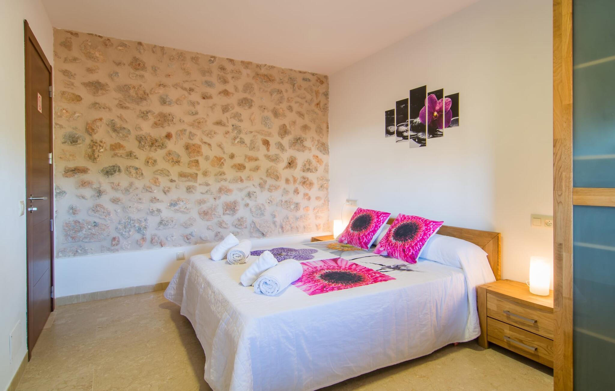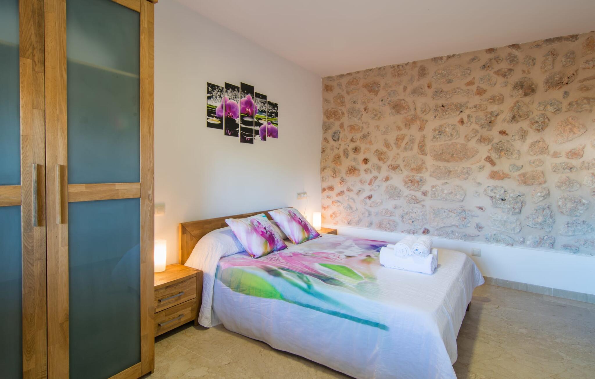 Villaen “Can Just” skinner i solgul, kombineret med rustikke natursten, nær Inca midt på øen. Det nybyggede etplanshus har et indbydende, velholdt udeareal. I midten er den store, rektangulære pool med udendørs bruser, omgivet af en asfalteret solterrasse og kunstig græsplæne med mange komfortable liggestole og en skyggefuld parasol. Her er garanteret fuldkommen privatliv, og der er også masser af plads til, at børn kan plaske rundt, og voksne kan svømme. De overdækkede terrassearealer omkring huset er særligt smukke. Med udekøkkenet og udendørsbadeværelset kan I flytte jeres ferieliv næsten udelukkende udendørs. Der er masser af sidde- og afslapningsmuligheder: fra komfortable udendørs loungemøbler til en smuk stenbænk med komfortable hynder til det store spisebord med tilhørende stole. Og hvis I leder efter en udfordring, kan I spille et spil bordtennis mod jeres medrejsende ved det interne bord. En afslappet blanding af moderne og rustikke møbler sikrer en rigtig god, afslappet behagelig atmosfære overalt i “Can Just” - kom og føl jer godt! I jeres villa finder I alt komfortabelt på ét niveau. For eksempel køkkenet med højkvalitets hvidevarer samt varme, brune træfacader og et højdepunkt i form af en knaldrød ovn. Den åbner ud i opholds- og spiseafdelingen, hvor et stort træbord og tilhørende stole samt en behagelig lædersofa med lænestole venter på jer. Drej om hjørnet, og gå gennem et imponerende sæt dobbeltdøre for at opdage endnu en komfortabel sofa til en afslappende aften med at se tv. Når I er træt, kan I trække jer tilbage til et af de tre dobbeltværelser, alle indrettet med sans for detaljer, med plads nok til jeres feriegarderobe og aircondition, så I ikke sveder selv i sommertemperaturer. Et andet soveværelse er tilgængeligt for dem, der kun virkelig kan slappe af alene om natten. Boligkomforten i villaen suppleres af to elegante og smarte badeværelser. Villaen “Can Just” er et komfortabelt feriehus på landet: Beliggende i centrum af øen, kun ca. 4,6 km fra Inca, imponerer det velholdte enplanshus ikke kun med sin flotte indretning, men også med diverse overdækkede terrassearealer og stor pool. I kan tage skønne vandreture i de landlige omgivelser med de mange omfattende olivenlunde; For en dag på stranden er det bedst at køre de 28,9 km til Alcúdia. Bemærk venligst, at denne ejendom ikke accepterer ungdomsgrupper eller polterabender. En ungdomsgruppe på denne ejendom består af personer på 28 år eller derunder. Book ikke denne ejendom, hvis I er en ungdomsgruppe eller polterabend, da jeres reservation vil blive afvist, når den er booket, hvilket også kan være tilfældet ved ankomst til ejendommen eller under jeres ophold, og I vil ikke modtage en refusion