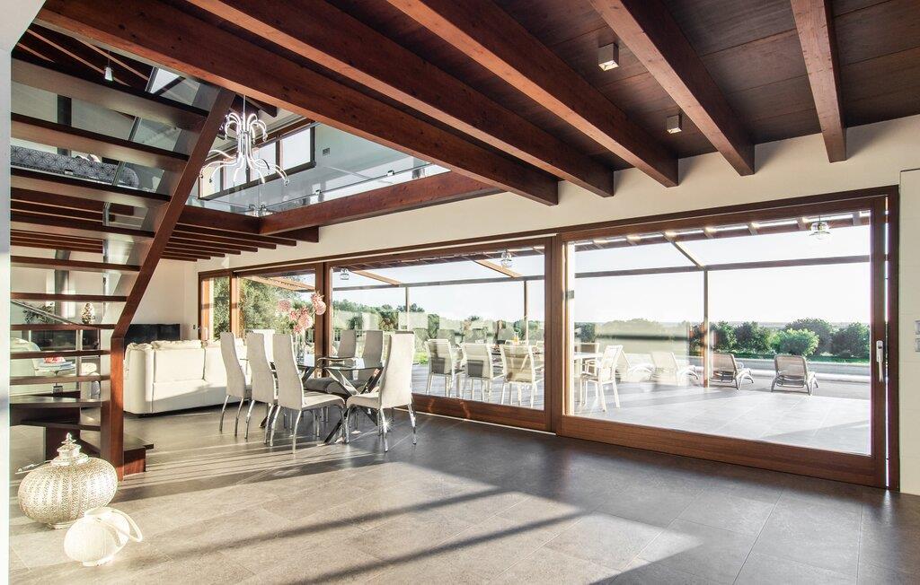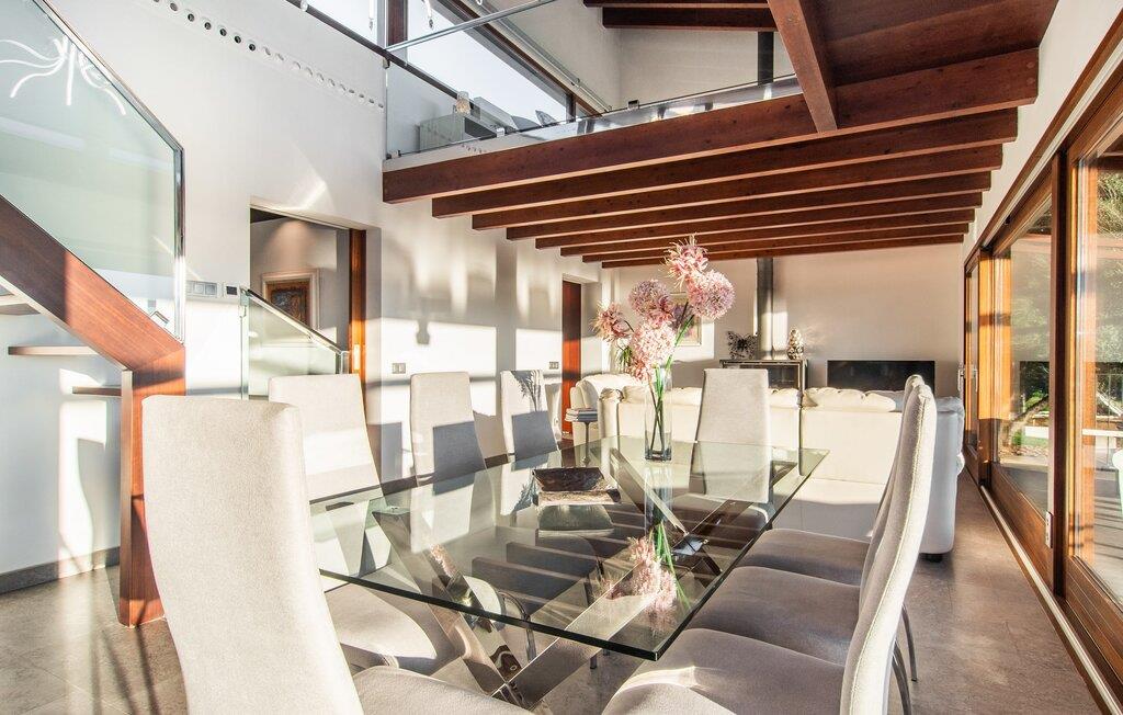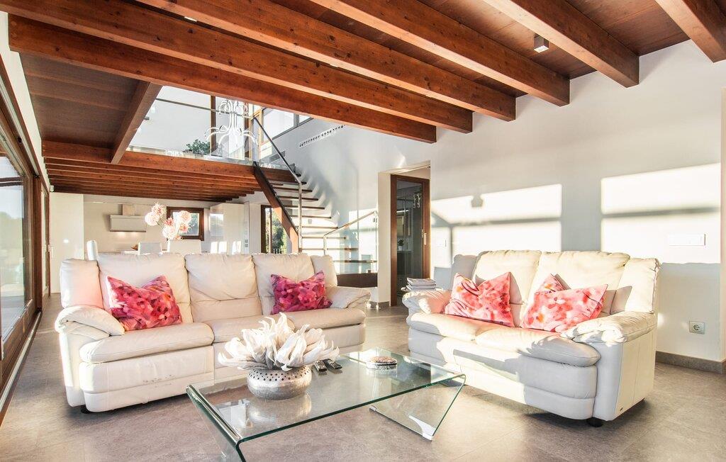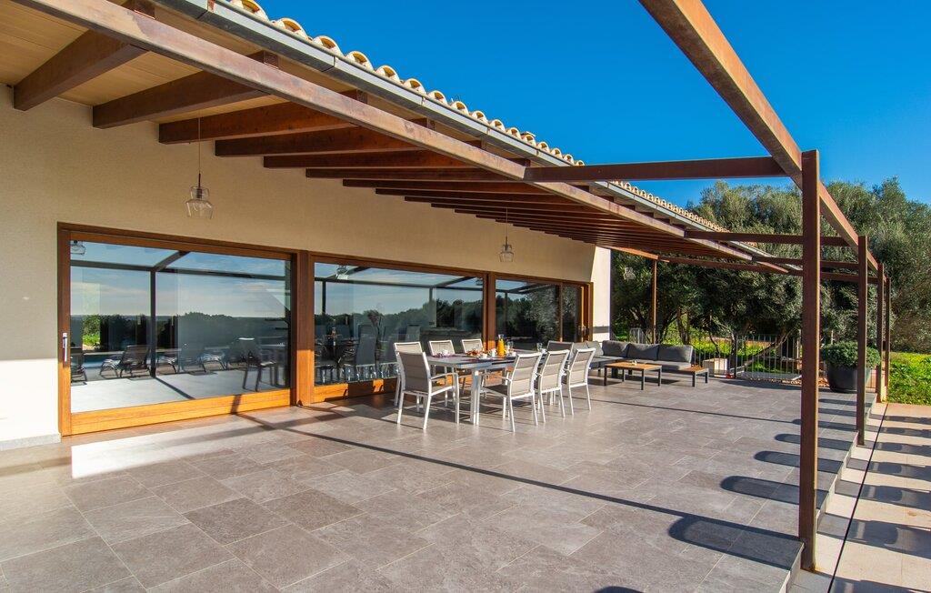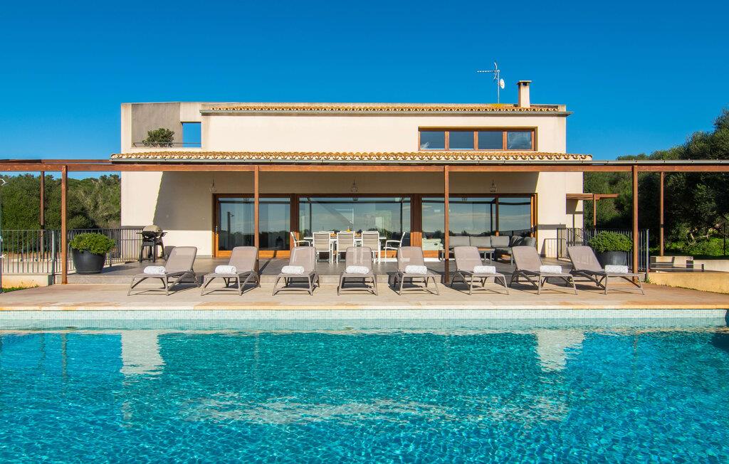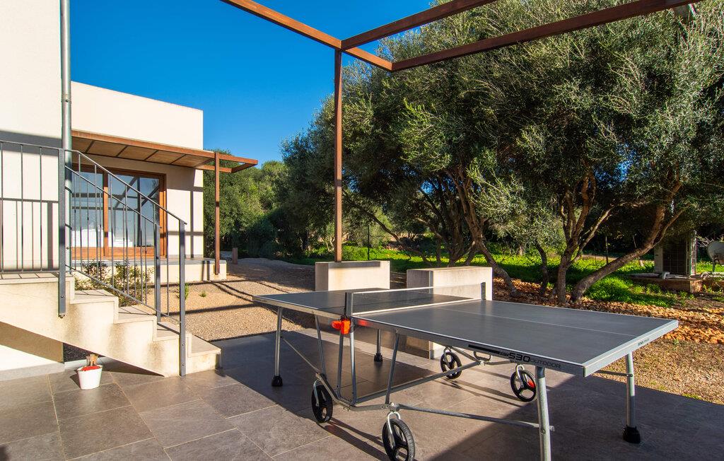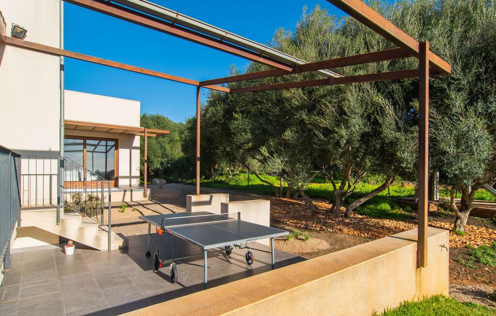 Beliggende i den sydlige del af Mallorca er "Can Maimo Nou" det perfekte valg for enhver, der drømmer om en moderne finca på Mallorca, der tilbyder både komfort og ro. Denne stilfulde bolig ligger på en stor, grøn grund uden direkte naboer, hvilket sikrer et fredeligt tilflugtssted. Fincaen har plads til op til otte gæster. Den rummelige, delvist overdækkede terrasse inviterer til solbadning eller skygge. Poolen, der er synlig fra de komfortable liggestole, er særdeles velegnet til familier med børn. Bordtennisbordet byder på timevis af sjov for gæster i alle aldre. Der er også masser af parkeringspladser til jeres lejebil. Fincaen er i åbent plan, hvor de fleste værelser flyder ind i hinanden, men kan adskilles fra hinanden med skydedøre. Store vinduer tillader middelhavslyset at oversvømme rummet, hvilket skaber en varm og indbydende atmosfære. Boligen er fordelt på to etager, forbundet med en åben trappe. I stueetagen er der opholds- og spisestue, køkken af høj kvalitet, tre soveværelser og to badeværelser, hvoraf det ene har eget bad. På øverste etage, adskilt af et glasgalleri, er der en ekstra soveplads, et skrivebord til feriearbejde og udgang til en lille solrig tagterrasse. Den moderne finca "Can Maimo Nou" er beliggende i en vidunderlig rolig beliggenhed midt i det typiske middelhavslandskab på den sydlige del af øen. For at shoppe, spise ude og slentre gennem smukke smalle gader med talrige kunstgallerier og små butikker er det kun omkring 4,4 km til Santanyí, mens den romantiske bugt Cala Llombards kun er omkring 8,9 km.