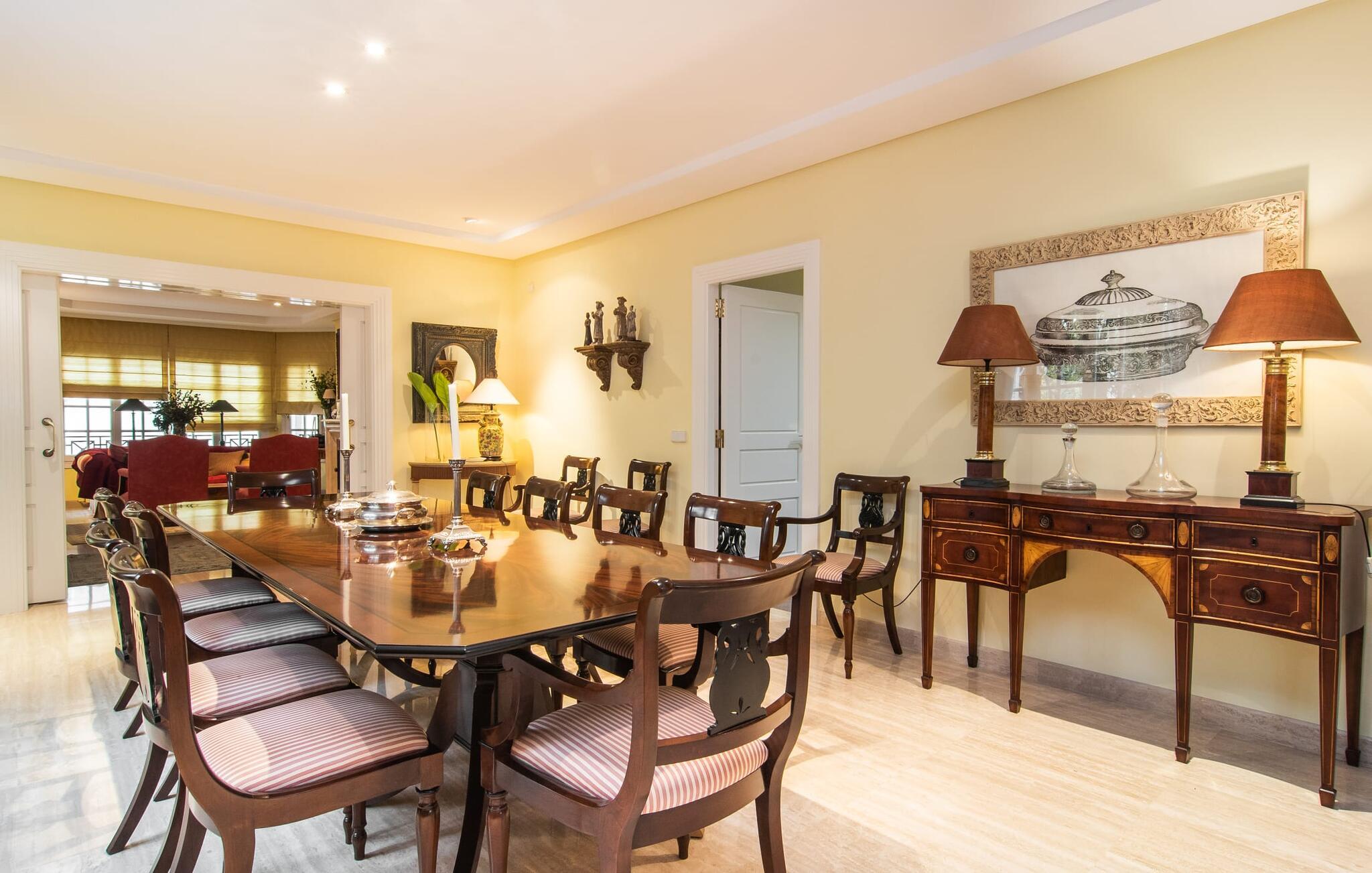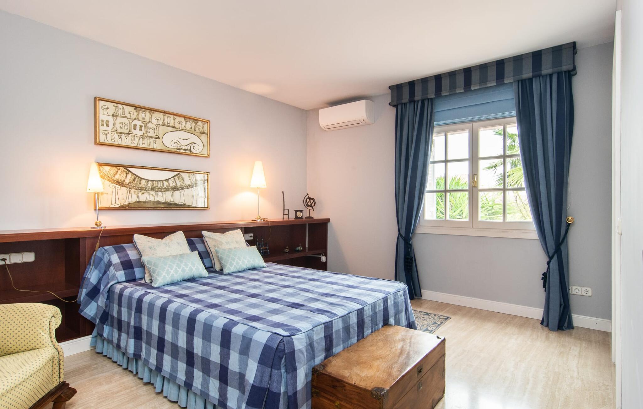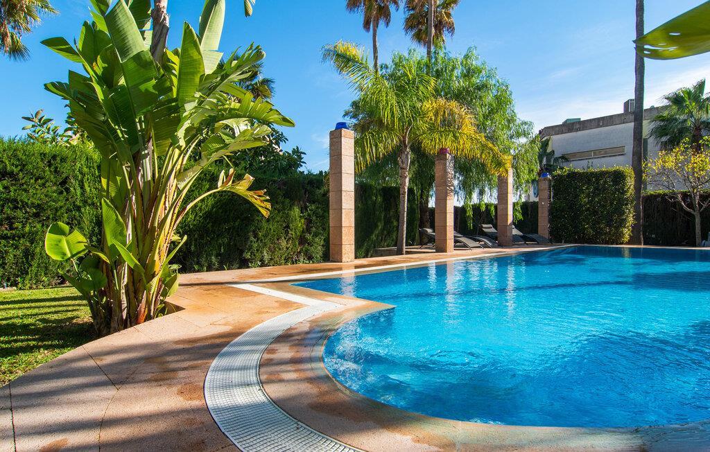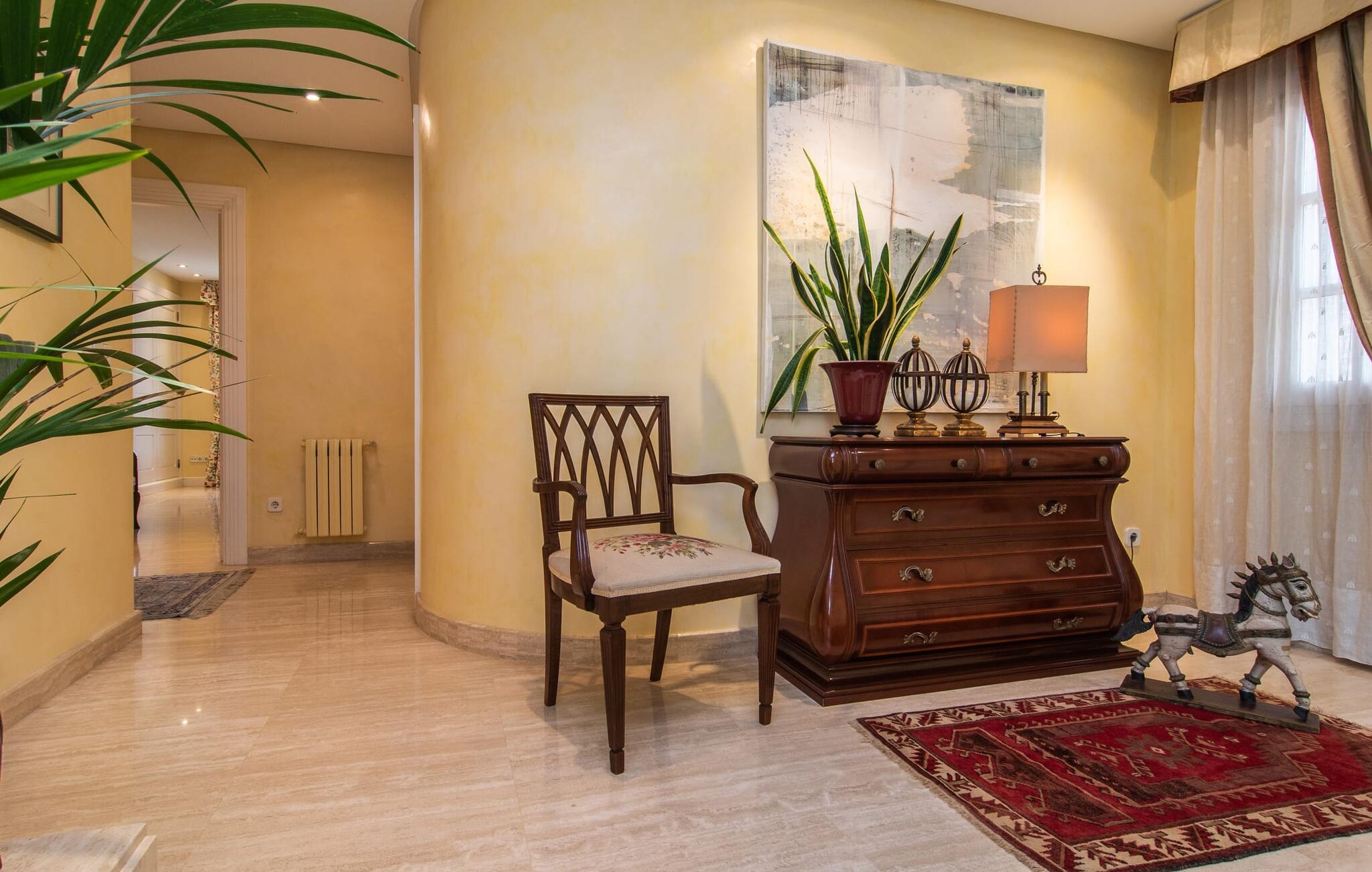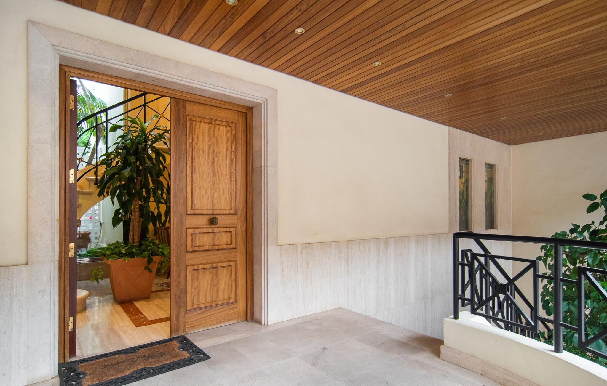 Rækkehuset "Can Mandol" er et elegant, meget rummeligt feriehus på Mallorca. Denne ejendom omdefinerer konceptet for et rækkehus, der tilbyder et byparadis på en stor grund med en række indbydende udendørs muligheder. Den frodige, parklignende vegetation skaber en fantastisk baggrund for udendørs afslapning. I vil finde velplejede græsplæner og forskellige overdækkede terrasseområder, perfekt til at nyde tid med venner eller slappe af i fred. Poolen er let tilgængelig via romerske trin og inviterer jer til at tage en forfriskende svømmetur. En enestående funktion er det fremragende udstyrede sommerkøkken, som inklusiv en grill byder på en vidunderlig beskyttet atmosfære til kulinariske eventyr. Indenfor fortsætter den luksuriøse indretning med at imponere. De rummelige værelser udstråler klassisk elegance og kan komfortabelt rumme op til otte gæster. Rigelig naturligt lys beriger opholdsrummene, hvoraf nogle er indrettet med lyse farver og gennemtænkt tilbehør. I stueetagen er der opholds- og spisestue og to soveværelser med hvert sit badeværelse og et påklædningsværelse. På øverste etage er der yderligere to soveværelser, også med private badeværelser og et med påklædningsværelse. Alle værelser er udstyret med aircondition, hvilket sikrer afslappende nætter selv i de varmere måneder. Rækkehuset "Can Mandol" præsenterer sig som et elegant, meget rummeligt feriehus på Mallorca. På grund af den urbane beliggenhed og fremragende infrastruktur kan I endda gøre jeres dagligvarer til fods, for eksempel på det ugentlige marked om torsdagen. De smukke strande, for eksempel i den lange bugt Alcúdia, ligger omkring 24 km væk.