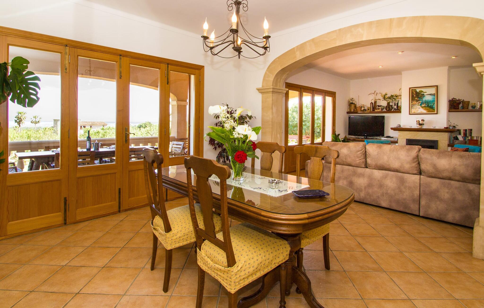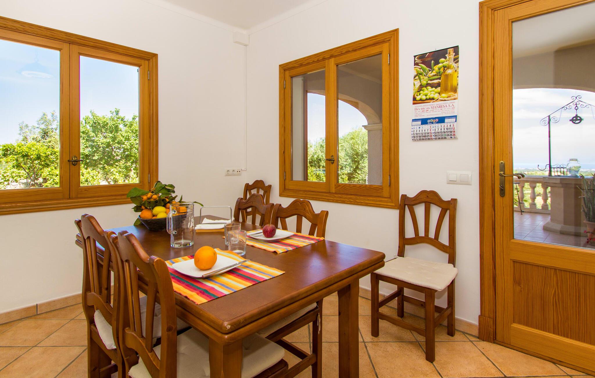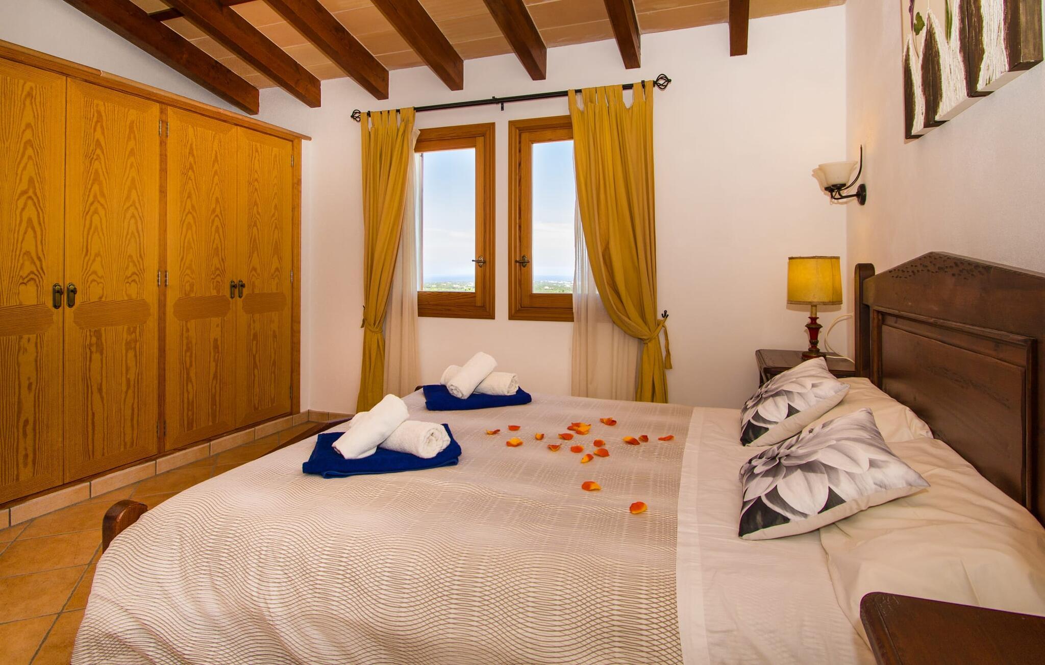 Villa "Can Marines" tilbyder den perfekte blanding af privatliv og bekvemmelighed, beliggende i en smuk grund med nem adgang til nærliggende faciliteter. Ejendommen har middelhavsflora, herunder mandeltræer, hvilket skaber et roligt udendørsområde. De omfattende terrasser tilbyder en betagende havudsigt, herunder et glimt af Portocolom fyrtårn. Poolen, med sin trappeindgang i romersk stil, er perfekt til at slappe af og nyde solen. Indvendigt har villaen med aircondition et typisk spansk design og en varm, indbydende atmosfære med fire soveværelser med dobbeltsenge, tre badeværelser (et en-suite) og en rummelig stue/spisestue med pejs. Det fuldt udstyrede køkken og et lille fitnesscenter i kælderen giver ekstra komfort. Fincaen "Can Marines" ligger på landet lige uden for S'Horta på den sydlige del af øen. Bare to minutters kørsel eller gå ind i landsbyen med et lille supermarked, restauranter og caféer, eller gå, hvis I foretrækker det. Santanyí med sit marked hver onsdag og lørdag er omkring 10 km væk. De nærmeste strande ligger kun 5 km væk, herunder Cala Sa Nau og Cala d'Or. Aircondition i denne ejendom er inkluderet i 12 timer om dagen med rimelig brug. I det sjældne tilfælde, at denne grænse overskrides, vil I blive opkrævet kontant på stedet. Bemærk venligst, at denne ejendom ikke accepterer ungdomsgrupper eller polterabender. En ungdomsgruppe på denne ejendom består af personer under 25 år. Book ikke denne ejendom, hvis I er en ungdomsgruppe eller polterabend, da jeres reservation vil blive afvist, når den er booket, hvilket kan være ved ankomsten til ejendommen eller under jeres ophold, og I vil ikke modtage en refusion.
