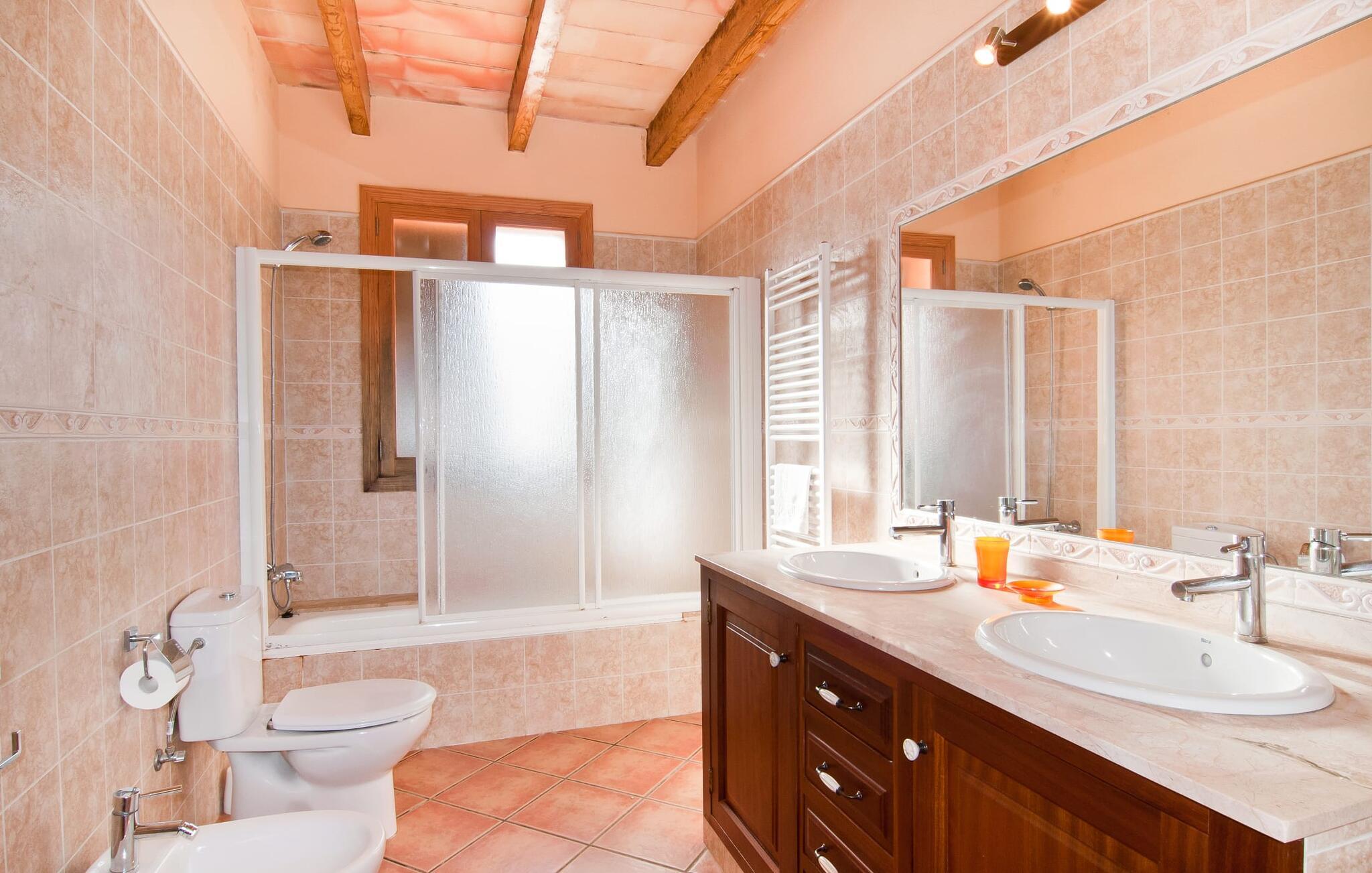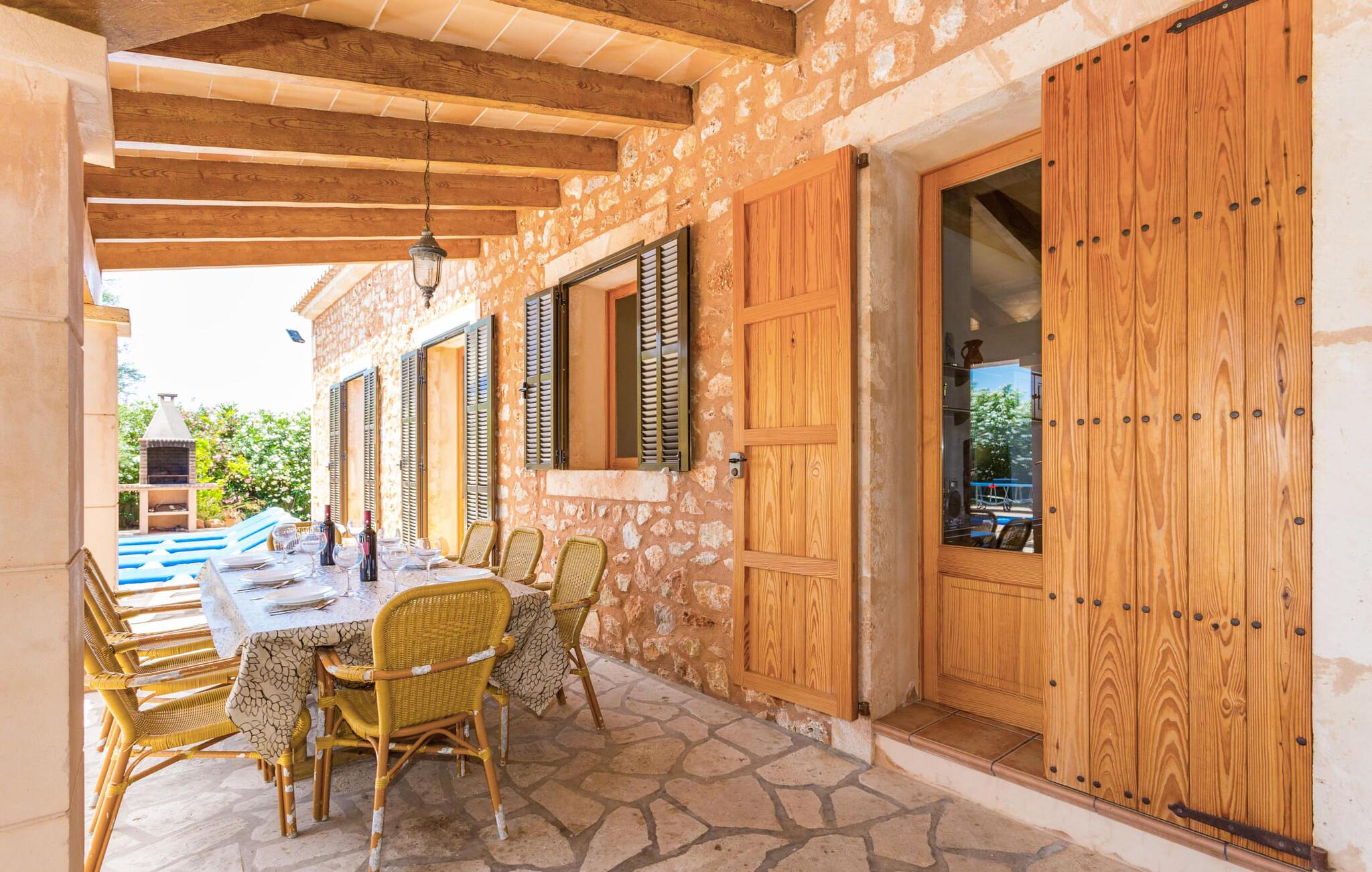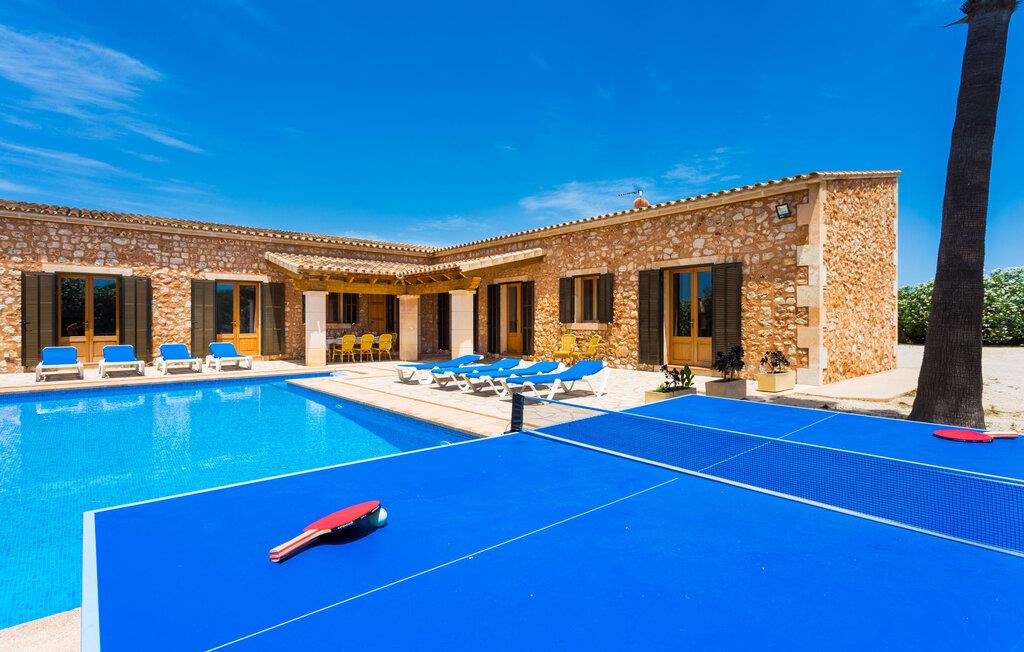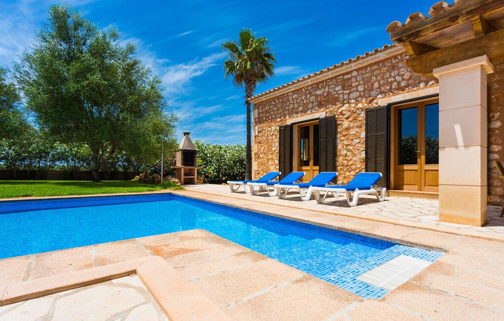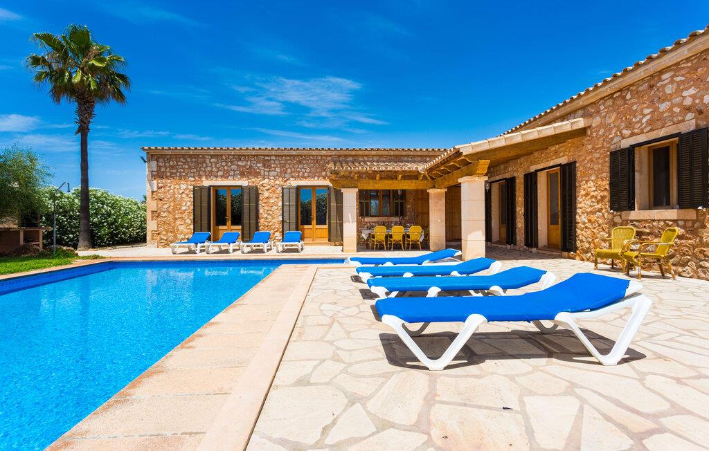 Villaen "Can Mates Nou" er omgivet af en luftig bushhæk og byder sine gæster velkommen i en idyllisk, landlig atmosfære. Store grusarealer omkranser husets forside, den nænsomt anlagte have krydses af indbydende terrasser beklædt med dekorative naturstensplader. Poolen, som ligger i husets umiddelbare nærhed, skaber en særlig maritim flair, som understreges og pyntes af de to høje palmer. Poolen er flisebelagt med smukke blå mosaikfliser og har praktisk trappeadgang. Der er også en praktisk udendørs bruser. Talrige komfortable liggestole giver jer mulighed for at slappe grundigt af mellem forfriskende dyk i poolen, måske med en kølig, lækker drink. Afhængigt af tidspunktet på dagen byder haven på lidt kølende skygge for at undslippe varmen. Børn vil elske at lege og løbe rundt på den smukke græsplæne. Den overdækkede del af terrassen, der støder op til ejendommen, byder på et vidunderligt, massivt spisebord, hvor I kan nyde jeres hyggelige middag udendørs. Uanset om det er til morgenmad eller en kulinarisk grillaften - denne smukke ejendom med en vidunderlig udsigt over den grønne have og middelhavshimlen vil glæde sine gæster på ethvert tidspunkt af dagen. I kan nemt få adgang til huset direkte fra terrassen, hvis enestående design afspejler udendørsområdets klare og sofistikerede linjer. Harmoniske farver på lofter og gulve, lyse vægge og træmøbler smelter sammen for at skabe en behagelig, hjemlig atmosfære. Samtidig vil I nyde stedets rummelige atmosfære. Selvom I er mæt i denne villa, vil I altid have mulighed for at finde et roligt og ugeneret privat område. Den rummelige stue/alrum giver jer mulighed for at slappe af på to komfortable sofaer, måske med et magasin, en god bog eller endda en underholdende film på satellit-tv. I kan nyde jeres middag sammen ved det store spisebord. Det moderne tekøkken af høj kvalitet byder på alt hvad I behøver til daglig brug. Der er også en filterkaffemaskine og en kedel. Rummelige og meget smagfuldt renoverede værelser inviterer til en afslappende nat. To senge på 1,50 x 1,90 m og fire 0,90 x 1,90 m er tilgængelige for en dyb søvn, indtil I vågner mere afslappet end nogensinde før. Tre naturligt oplyste og selektivt udstyrede moderne badeværelser tilbyder komfort og plads. Værelserne har strygejern og hårtørrer, så I behøver ikke at tage dem med. For korte udflugter bør I helt sikkert besøge den spændende og smukke havn i den tidligere fiskerlandsby Colonia de Sant Jordi (19 km). Hvis I kan lide at besøge stranden på ferie, er villaen "Can Mates Nou" perfekt for jer. De smukkeste strande på sydøstkysten, herunder den familievenlige Es Trenc strand, ligger i umiddelbar nærhed og kan nemt nås med en lejebil. Hvis I ønsker det, kan I også udforske en anderledes, unik bugt hver dag. Efter en begivenhedsrig dag fuld af udflugter kan I vende tilbage til jeres ferievilla og afslutte dagen, som I ønsker det. Den rummelige og generøst proportionerede villa "Can Mates Nou" er smukt beliggende i landlige omgivelser, kun ti minutter i bil sydøst for Campos, på en smuk lukket ejendom. I Campos finder I barer, restauranter og butikker til jeres daglige behov. Køreturen til Mallorcas sydlige strande er ikke langt fra dette feriehus. Lufthavnen ligger lidt over en halv times kørsel væk.