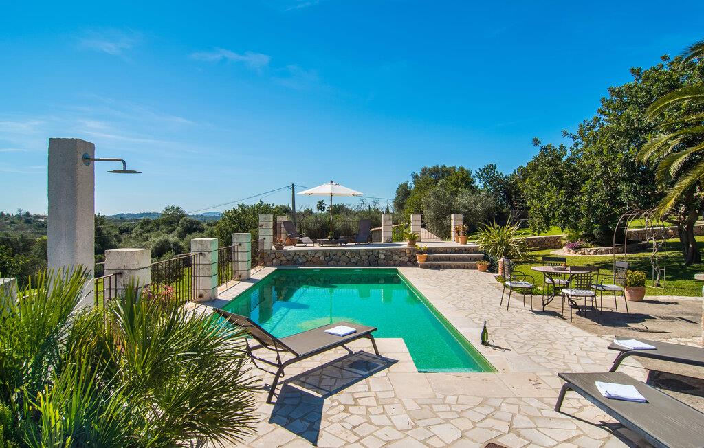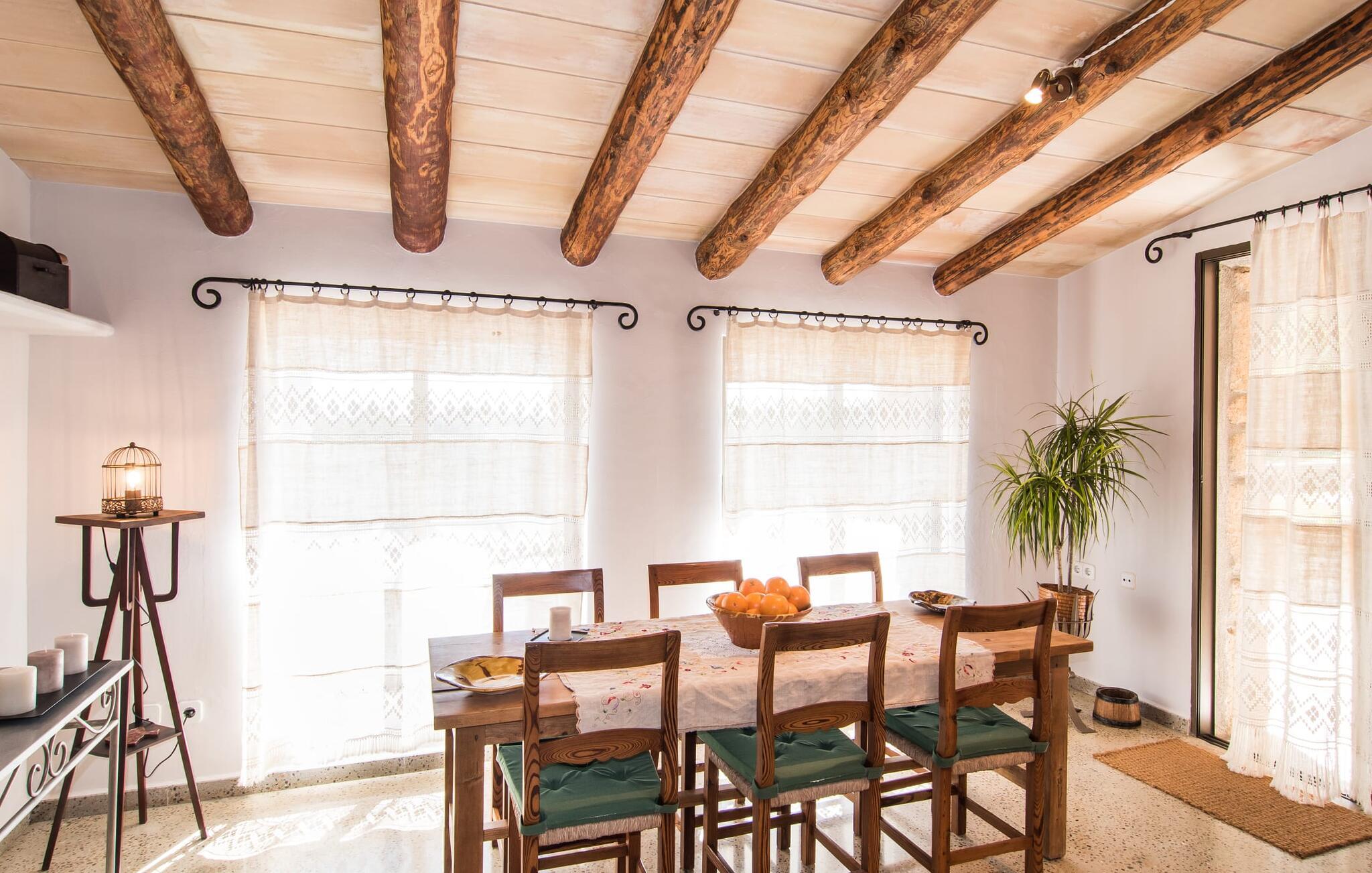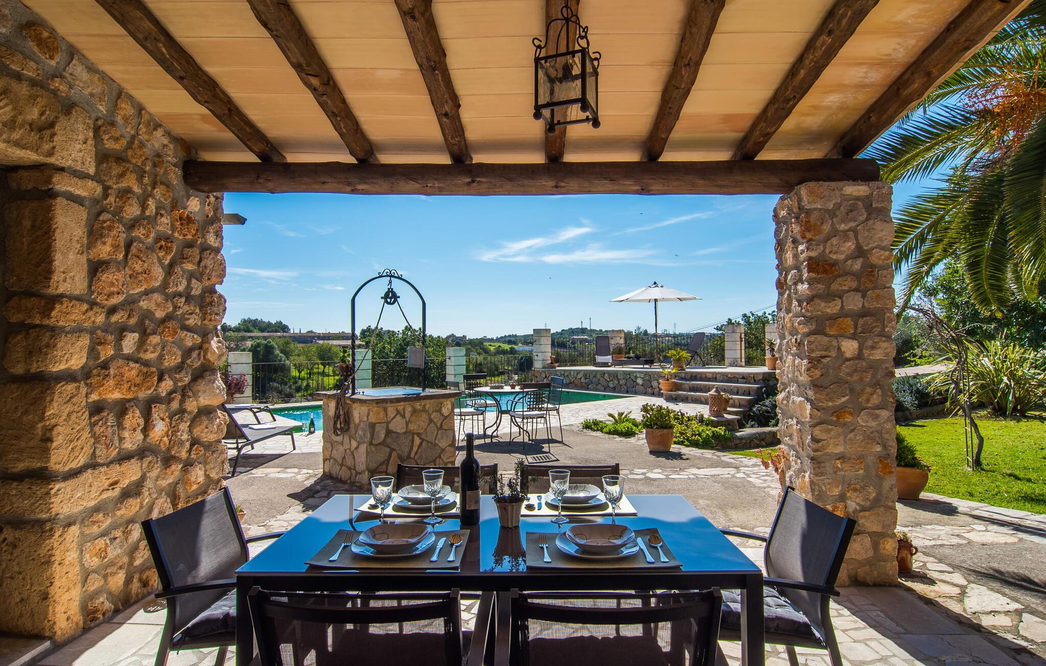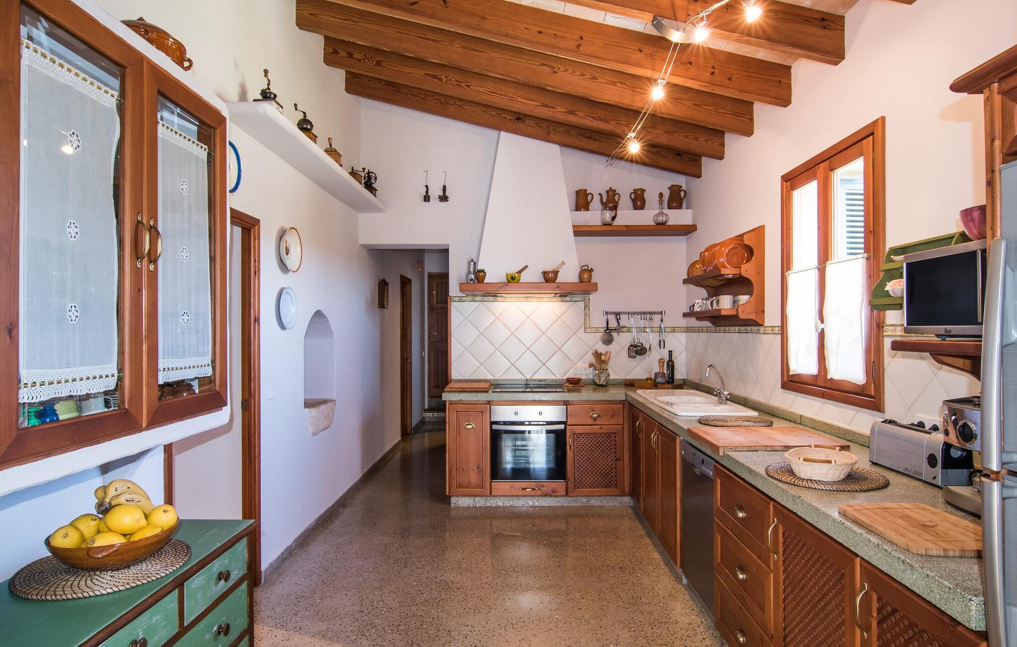 Villa "Can Matxet" er et perfekt eksempel på et mallorcansk feriehus, der kombinerer autentisk charme med moderne komfort. Villaen ligger på en let skrånende grund omgivet af en lav bakke og byder på en fantastisk udsigt fra adskillige udendørs siddepladser. Haven med mandel-, oliven- og citrustræer blander sig problemfrit ind i det naturlige landskab, selv inden for stenmuren. Slående sofaborde og robuste stenbænke er spredt ud over de solbeskinnede terrasser, mens liggestole i aluminium er det perfekte sted at slappe af efter en svømmetur i den azurblå pool. To cardio-maskiner er tilgængelige for fitness-entusiaster. Nyd grillet mad ved det moderne spisebord under den overdækkede terrasse. Tagterrassen byder på en uforglemmelig udsigt over landskabet, perfekt til stjernekiggeri, mens I lytter til de beroligende lyde fra græshopperne og mærker den varme brise. Indenfor fortsætter villaen med at imponere med sin blanding af lyse gulve, synlige murværker og træelementer. De rummelige opholds- og spiseområder suppleres af et separat køkken med kaffebrune møbler. Tre dobbeltværelser deler to stilfulde badeværelser, hvoraf det ene har badekar. Den øverste etage byder på endnu et rum, der er ideelt som lounge eller kontor. Villaen er beliggende i den rolige østlige del af øen i det blidt bølgende landskab omkring Sant Llorenc. Middelalderbyen Artà med sit landmandsmarked om tirsdagen og Manacor, Mallorcas næststørste by, er gode til shopping og ligger kun en kort køretur væk. Smukke sandstrande som Cala Marcal eller smukke naturlige strande som Cala Varques er kun 15 km væk.