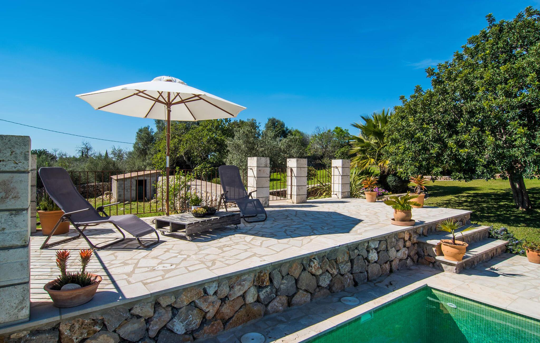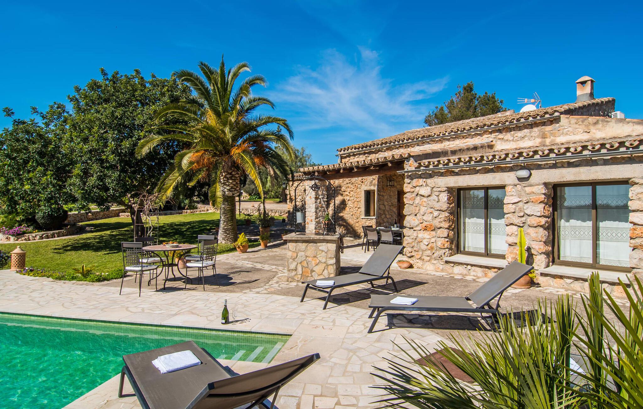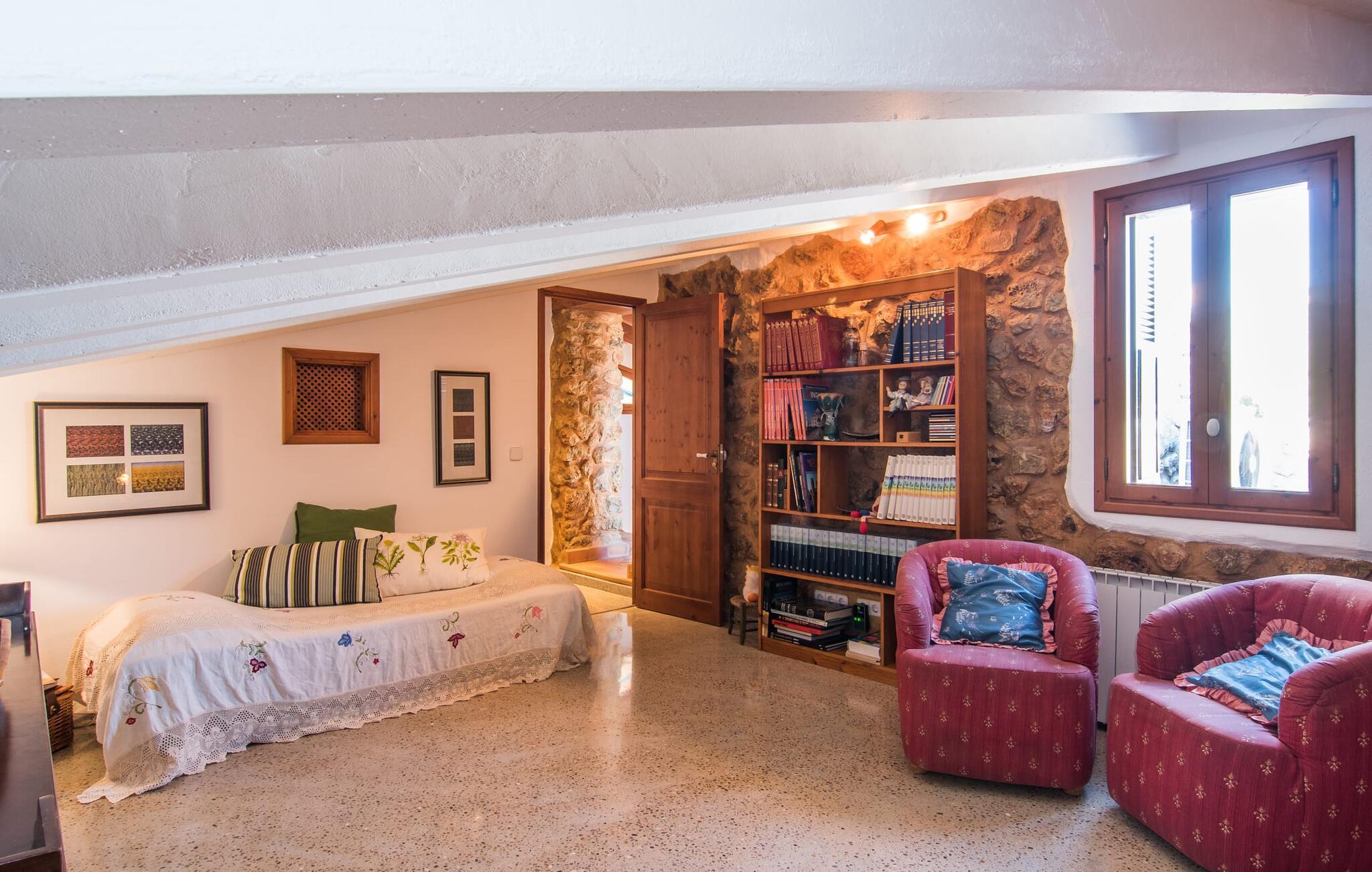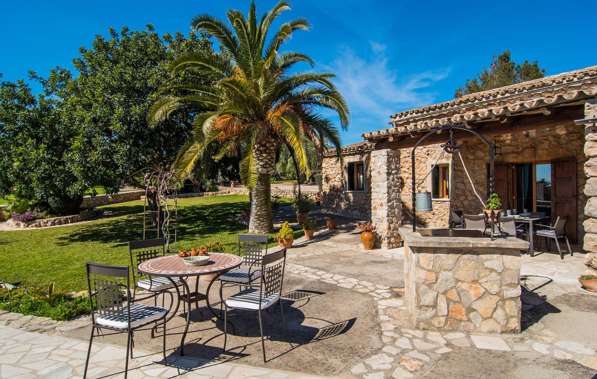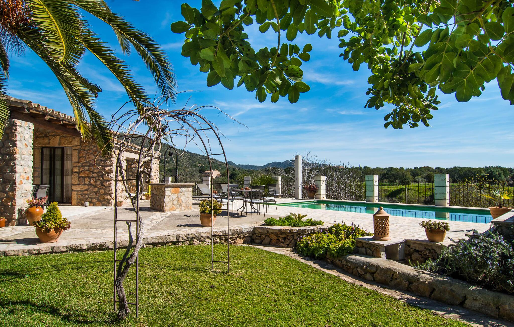 Villa "Can Matxet" er et perfekt eksempel på et mallorcansk feriehus, der kombinerer autentisk charme med moderne komfort. Villaen ligger på en let skrånende grund omgivet af en lav bakke og byder på en fantastisk udsigt fra adskillige udendørs siddepladser. Haven med mandel-, oliven- og citrustræer blander sig problemfrit ind i det naturlige landskab, selv inden for stenmuren. Slående sofaborde og robuste stenbænke er spredt ud over de solbeskinnede terrasser, mens liggestole i aluminium er det perfekte sted at slappe af efter en svømmetur i den azurblå pool. To cardio-maskiner er tilgængelige for fitness-entusiaster. Nyd grillet mad ved det moderne spisebord under den overdækkede terrasse. Tagterrassen byder på en uforglemmelig udsigt over landskabet, perfekt til stjernekiggeri, mens I lytter til de beroligende lyde fra græshopperne og mærker den varme brise. Indenfor fortsætter villaen med at imponere med sin blanding af lyse gulve, synlige murværker og træelementer. De rummelige opholds- og spiseområder suppleres af et separat køkken med kaffebrune møbler. Tre dobbeltværelser deler to stilfulde badeværelser, hvoraf det ene har badekar. Den øverste etage byder på endnu et rum, der er ideelt som lounge eller kontor. Villaen er beliggende i den rolige østlige del af øen i det blidt bølgende landskab omkring Sant Llorenc. Middelalderbyen Artà med sit landmandsmarked om tirsdagen og Manacor, Mallorcas næststørste by, er gode til shopping og ligger kun en kort køretur væk. Smukke sandstrande som Cala Marcal eller smukke naturlige strande som Cala Varques er kun 15 km væk.
