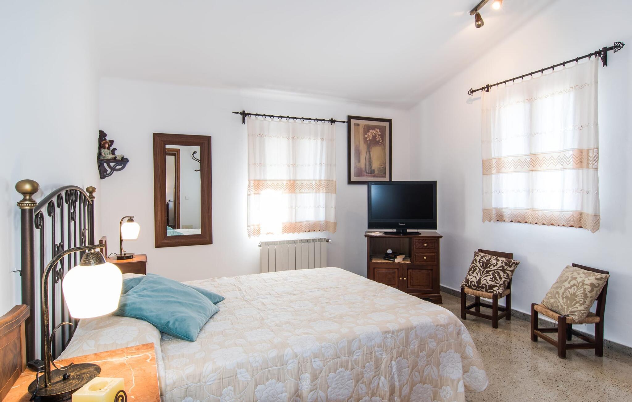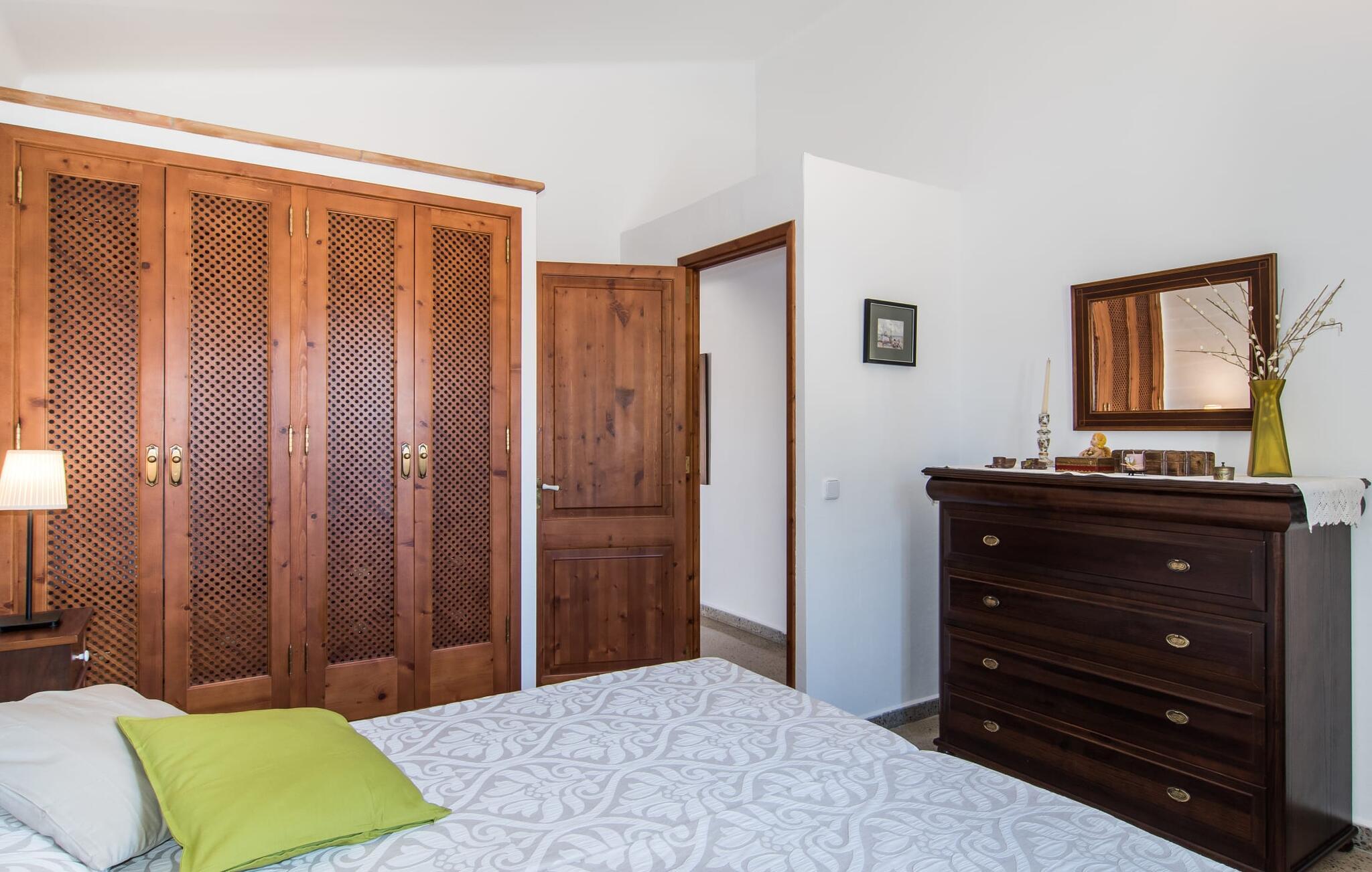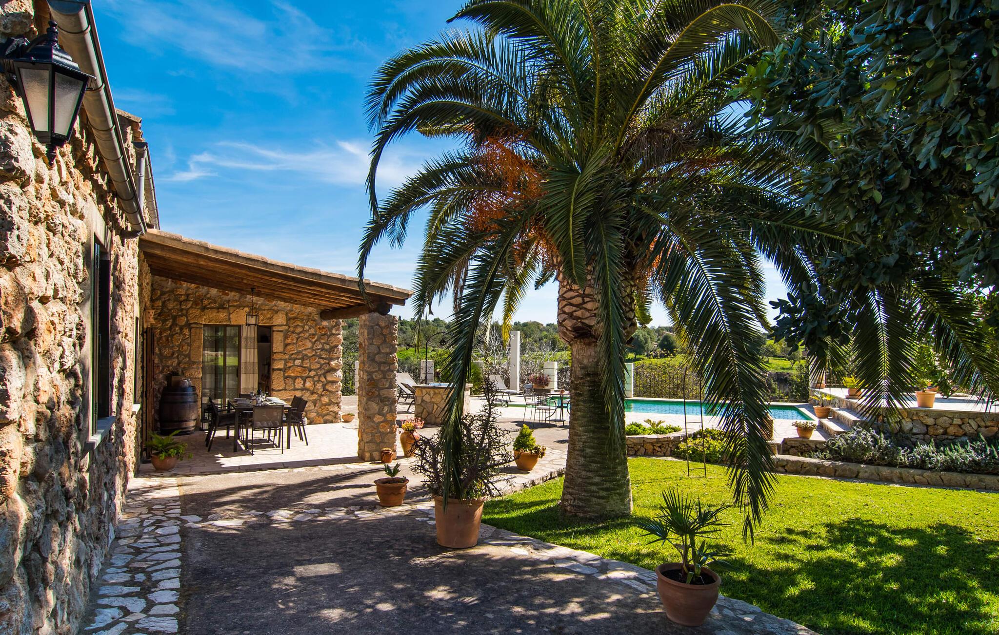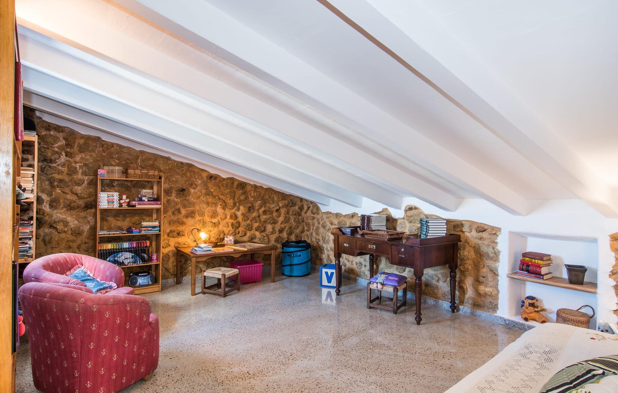Villa "Can Matxet" er et perfekt eksempel på et mallorcansk feriehus, der kombinerer autentisk charme med moderne komfort. Villaen ligger på en let skrånende grund omgivet af en lav bakke og byder på en fantastisk udsigt fra adskillige udendørs siddepladser. Haven med mandel-, oliven- og citrustræer blander sig problemfrit ind i det naturlige landskab, selv inden for stenmuren. Slående sofaborde og robuste stenbænke er spredt ud over de solbeskinnede terrasser, mens liggestole i aluminium er det perfekte sted at slappe af efter en svømmetur i den azurblå pool. To cardio-maskiner er tilgængelige for fitness-entusiaster. Nyd grillet mad ved det moderne spisebord under den overdækkede terrasse. Tagterrassen byder på en uforglemmelig udsigt over landskabet, perfekt til stjernekiggeri, mens I lytter til de beroligende lyde fra græshopperne og mærker den varme brise. Indenfor fortsætter villaen med at imponere med sin blanding af lyse gulve, synlige murværker og træelementer. De rummelige opholds- og spiseområder suppleres af et separat køkken med kaffebrune møbler. Tre dobbeltværelser deler to stilfulde badeværelser, hvoraf det ene har badekar. Den øverste etage byder på endnu et rum, der er ideelt som lounge eller kontor. Villaen er beliggende i den rolige østlige del af øen i det blidt bølgende landskab omkring Sant Llorenc. Middelalderbyen Artà med sit landmandsmarked om tirsdagen og Manacor, Mallorcas næststørste by, er gode til shopping og ligger kun en kort køretur væk. Smukke sandstrande som Cala Marcal eller smukke naturlige strande som Cala Varques er kun 15 km væk.