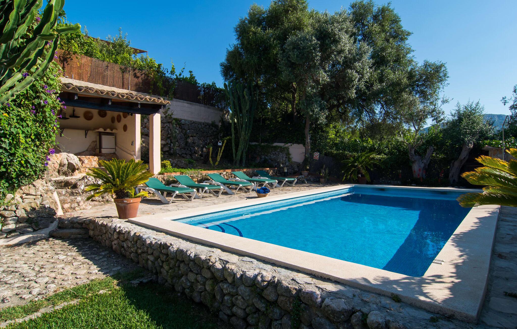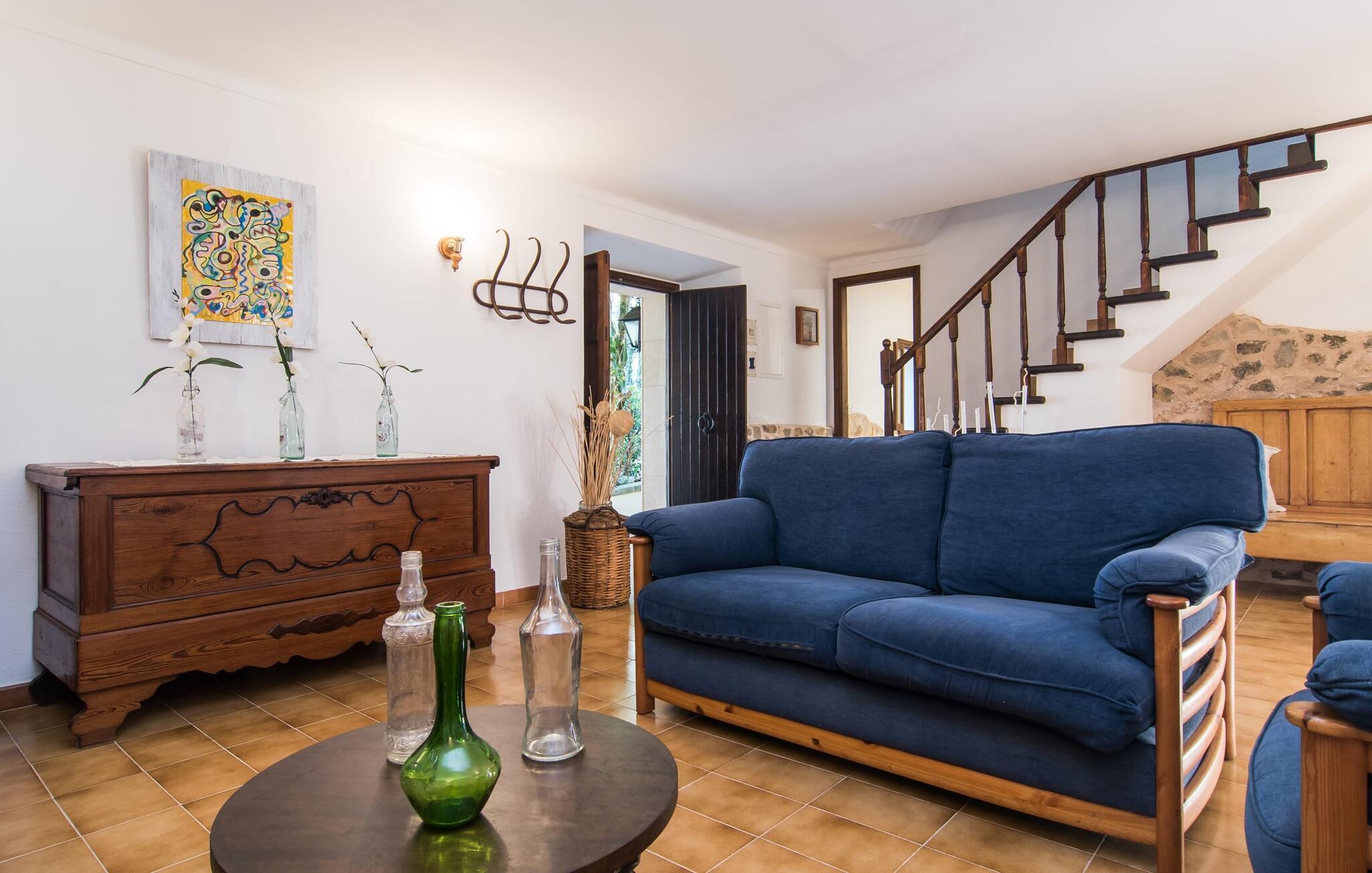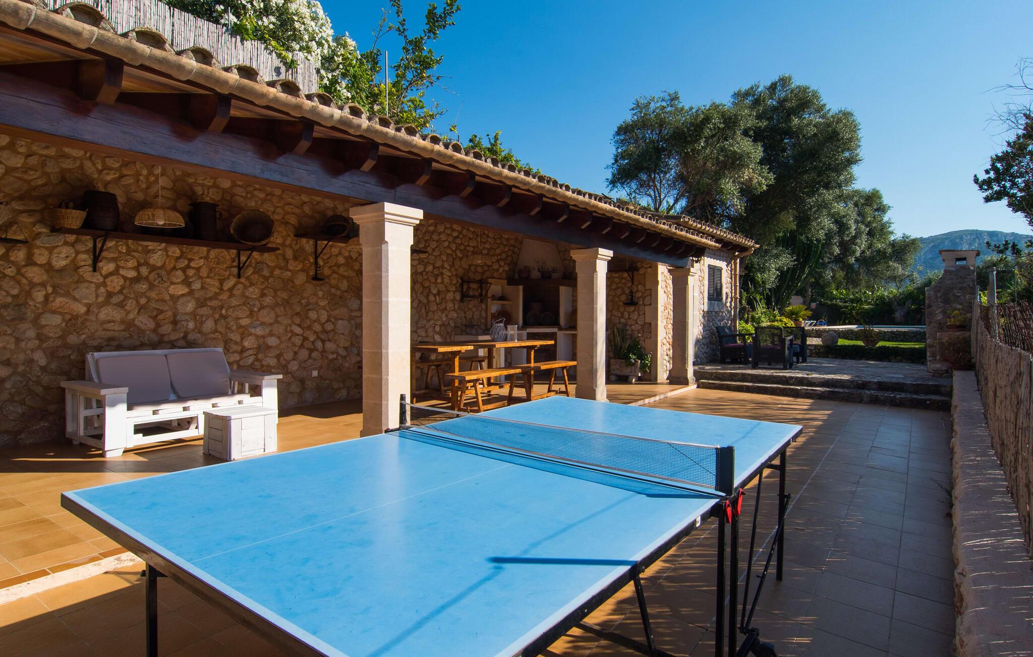 Omgivet af frodig middelhavsflora skinner villaen "Can Moragues" på en yderst charmerende måde med sine kontrasterende naturtoner og byder den nytilkomne velkommen. Udendørsområdet byder på smukke små stier, områder, trapper og stengærder langs frodige græsplæner og blomsterbede. En romantisk pergola, foret til venstre og højre med søjler og en lav mur, fører til hovedindgangen til huset. Udeområdets hjerte er den 32 m², let forhøjede swimmingpool, som er flisebelagt med dekorative blå mosaiksten og er meget let tilgængelig via en bred trappe. I kan slappe af af hjertens lyst på i alt fem komfortable liggestole under den dybblå middelhavshimmel og bare slappe af. En overdækket terrasse, tilgængelig via få trin, giver mulighed for at blive hængende i den luftige skygge, mens I nyder den vidunderlige udsigt over Pollença fra et lidt lavere niveau. Afhængigt af tidspunktet på dagen finder I også skøn naturlig skygge ved poolen. Tættere på huset når man den alsidige terrasse, som er halvt åben og halvt overdækket. I den sidste del er der i det væsentlige en udendørs stue, hvori der er en hyggelig siddegruppe med polyrattan møbler på den ene side og lige ved siden af et solidt spisebord til fællesspisning. Den nærliggende murede grill og udendørs vandforsyning giver jer mulighed for at tilberede og tilberede måltider udendørs, hvis I ønsker det. Husvæggen i natursten skaber i kombination med de smukke fliser og træbjælkeloftet en særlig behagelig stemning i dette område. Den udendørs terrasse tilbyder et sted at solbade, og der er endda et bordtennisbord. Dette giver sportsinteresserede mulighed for at blive aktive. Inde i villaen præsenteres den besøgende for en stor åben stue/spisestue med et tilstødende køkken, løst adskilt af en disk. Et hyggeligt sofahjørne inviterer jer til at slappe af og slappe af. Her kan I roligt læse en god bog eller blive underholdt af en film, da fjernsynet også er bekvemt placeret her. Spisebordet lige ved siden af er ideelt til sofistikeret indendørs spisning. Der er ingen lange rejser, fordi køkkenet ligger lige ved siden af. Her finder I alle de moderne faciliteter I har brug for til hverdagsbrug, herunder en kedel og en filterkaffemaskine. Det giver endda plads til et ekstra lille spisebord. Et andet ret rummeligt fællesrum med siddepladser giver mulighed for at trække sig tilbage og finde et privat sted, selv når man rejser med en større gruppe. Medfølgende børn vil helt sikkert nyde at lege her. Fire komfortabelt møblerede værelser med aircondition tilbyder en vidunderlig ramme for en afslappende søvn. Badeværelserne er venlige og funktionelt indrettede. Et strygejern og en hårtørrer er også tilgængelige i huset, så I behøver ikke at tage dem med. Den attraktive beliggenhed af denne villa kan være landlig, men havet er kun et par minutters kørsel væk. Sandstrandene omkring Port Pollença er fremragende og har en lavvandet indgang til vandet. Port de Pollença byder på en smuk promenade langs stranden og havnen med butikker, barer og restauranter. Kunne I tænke jer at tilbringe aftenen et andet sted end den smukke villa, finder I her et absolut seværdigt alternativ. Villaen "Can Moragues" er beliggende i en smuk bjergskråning i udkanten af Pollença. Det ligger på en frodig, grøn ejendom og er indrettet med stor sans for detaljer. Port de Pollença ligger 9 km derfra. Denne lille kystby imponerer med sin smukke promenade, som indbyder til at slentre og besøge de talrige caféer. Sandstrandene kan nås fra feriehuset på ingen tid. Bemærk venligst, at denne ejendom ikke accepterer ungdomsgrupper eller polterabender. En ungdomsgruppe på denne ejendom består af personer på 25 år eller derunder. Book ikke denne ejendom, hvis I er en ungdomsgruppe eller polterabend, da jeres reservation vil blive afvist, når den er booket, hvilket også kan være tilfældet ved ankomst til ejendommen eller under jeres ophold, og I vil ikke modtage en refusion