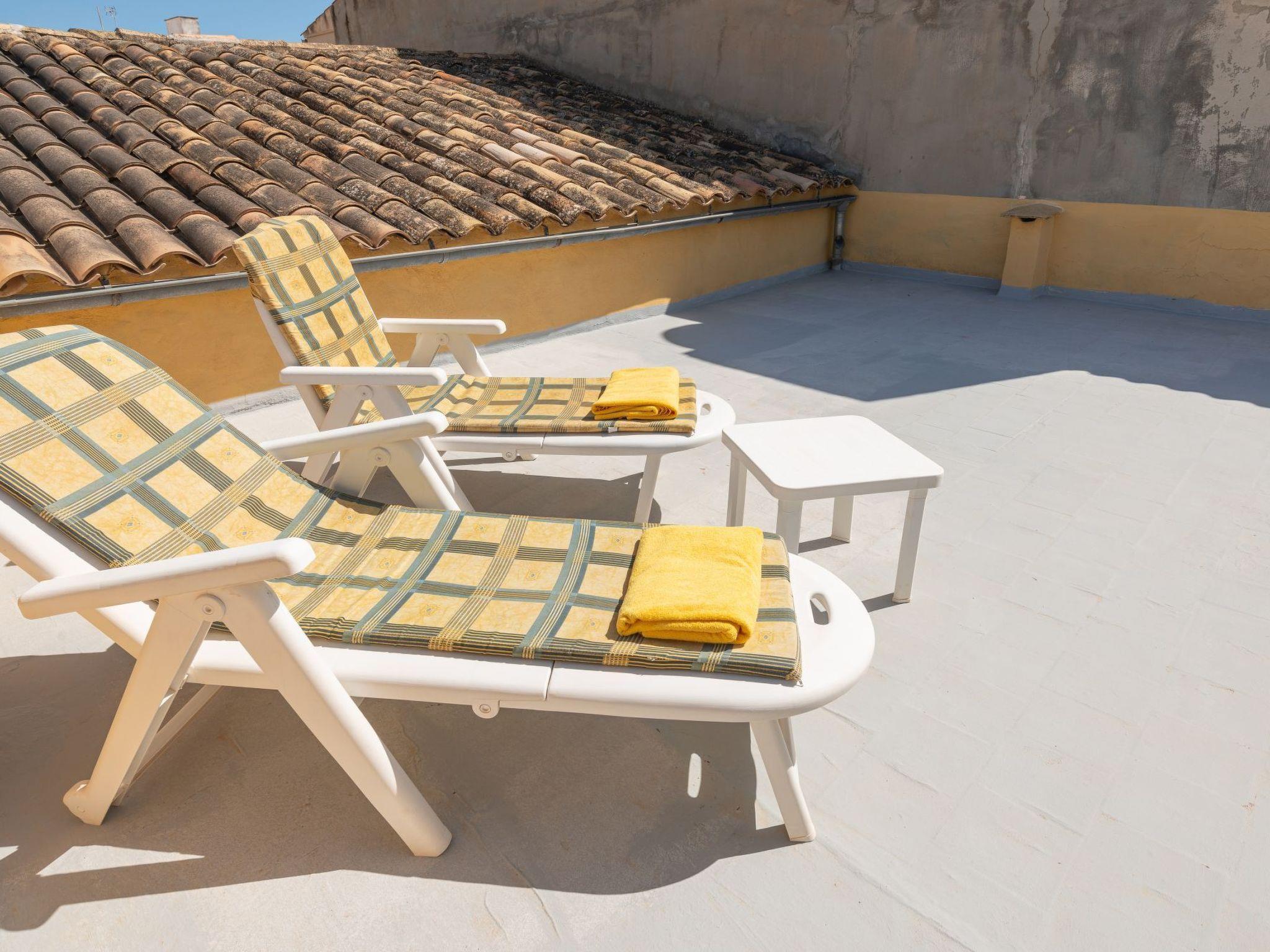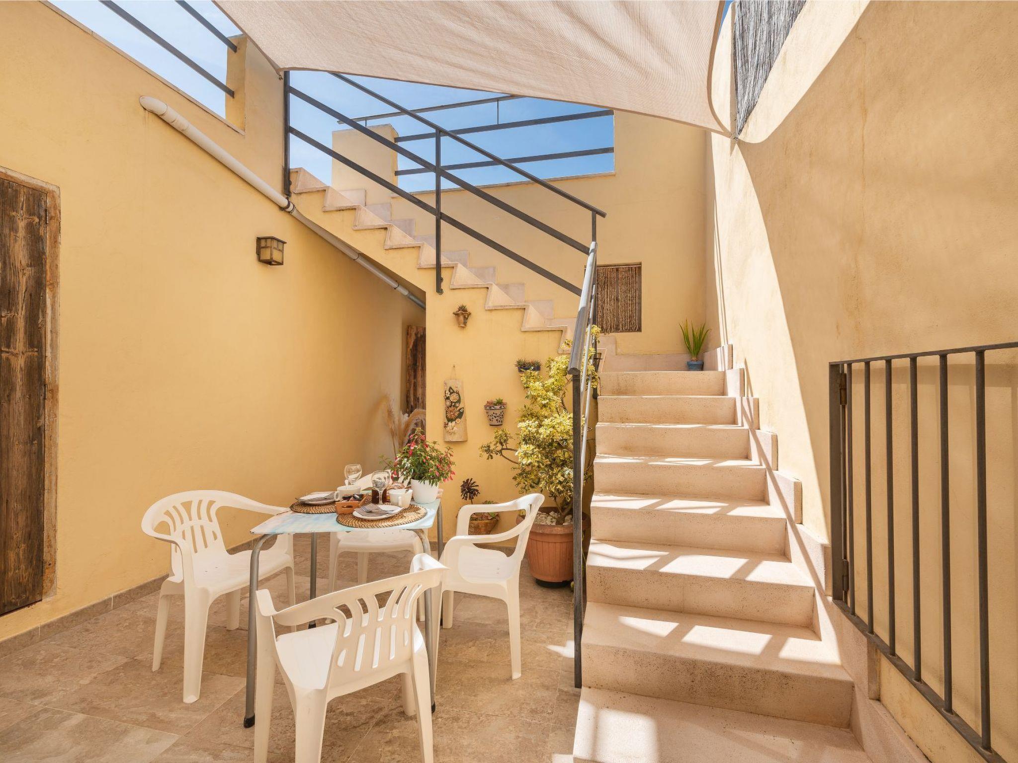 Step outside to discover a lovely inner courtyard, an iconic feature of Mallorcan homes, offering an intimate outdoor bathroom and a separate laundry area. Ascend from the courtyard to the private roof terrace, where sun loungers await to offer you moments of relaxation under the Mediterranean sun. This space is perfect for enjoying privacy and open air, embodying the essence of laid-back island living.