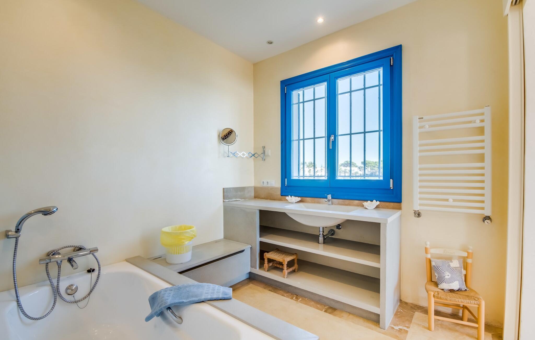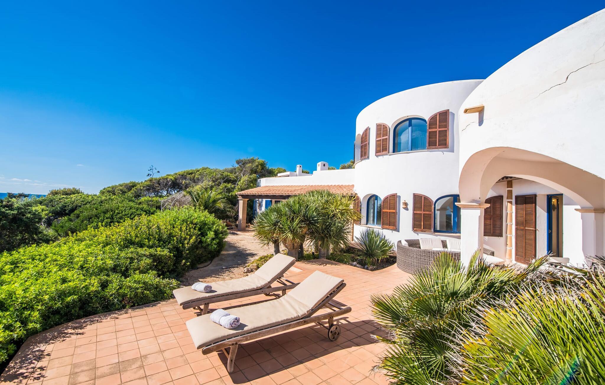 Villaen "Can Roca de Cala d'Or", bygget i Ibiza-stil, imponerer med sin førsteklasses beliggenhed direkte ved havet over Cala d'Ors forrevne kyst. Villaen er beliggende i et roligt boligområde, kun få minutters gang fra Cala Egos strand. Den sydøstvendte terrasse med havudsigt er omgivet af et middelhavsnaturlandskab og byder på betagende solopgange og lange solskinstimer. Slap af på en liggestol, spis morgenmad eller nyd et godt glas vin i den hyggelige lounge. På den anden side af villaen er der vind- og udsigtsbeskyttet have med 12 x 5 m pool. Her kan I placere jeres liggestol under høje palmer på den hyggelige græsplæne. Ved siden af poolområdet er der et bordtennisområde. Under verandaen ved indgangen er endnu en attraktiv udendørs spiseplads med sommerkøkken og indbygget grill. Der er en åben parkeringsplads og den brede villavej byder også på praktiske parkeringsmuligheder. Villaens lyse rum er spredt over to fløje, forbundet med et rundt tårn. Begge fløje har udgang til terrasse med havudsigt. To af de fem dobbeltværelser har direkte adgang til haven, mens det store master bedroom med tilstødende kontor og et enkeltværelse fører direkte ud til terrassen med havudsigt. På tårnets øverste etage er der endnu et dobbeltværelse med himmelseng og sensationel havudsigt. Vinduerne har myggenet og kan mørklægges med rulleskodder. Det rummelige, fuldt udstyrede køkken med to køleskabe er placeret i stueetagen af tårnet. Også på denne etage er den store stue med engelsk satellit-tv og spisestuen, begge med vidunderlig havudsigt. I de køligere måneder sørger flere pejse og gulvvarme (undtagen på øverste etage) for en hyggelig atmosfære. et pool- og terrasselandskab med uhindret havudsigt. Det trendy feriested Cala d'Or tilbyder det perfekte sted for kræsne feriegæster med sine hvide villaer og fremragende infrastruktur. I denne premium urbanisering er miljøet behageligt og kun delvist akustisk forurenet af biler. Der er kun 300 m til den nærmeste sandstrand med en lavvandet indgang til det krystalklare vand. De nærmeste butikker (Eroski) ligger kun 10 minutters gang fra villaen (mellem påske og oktober).