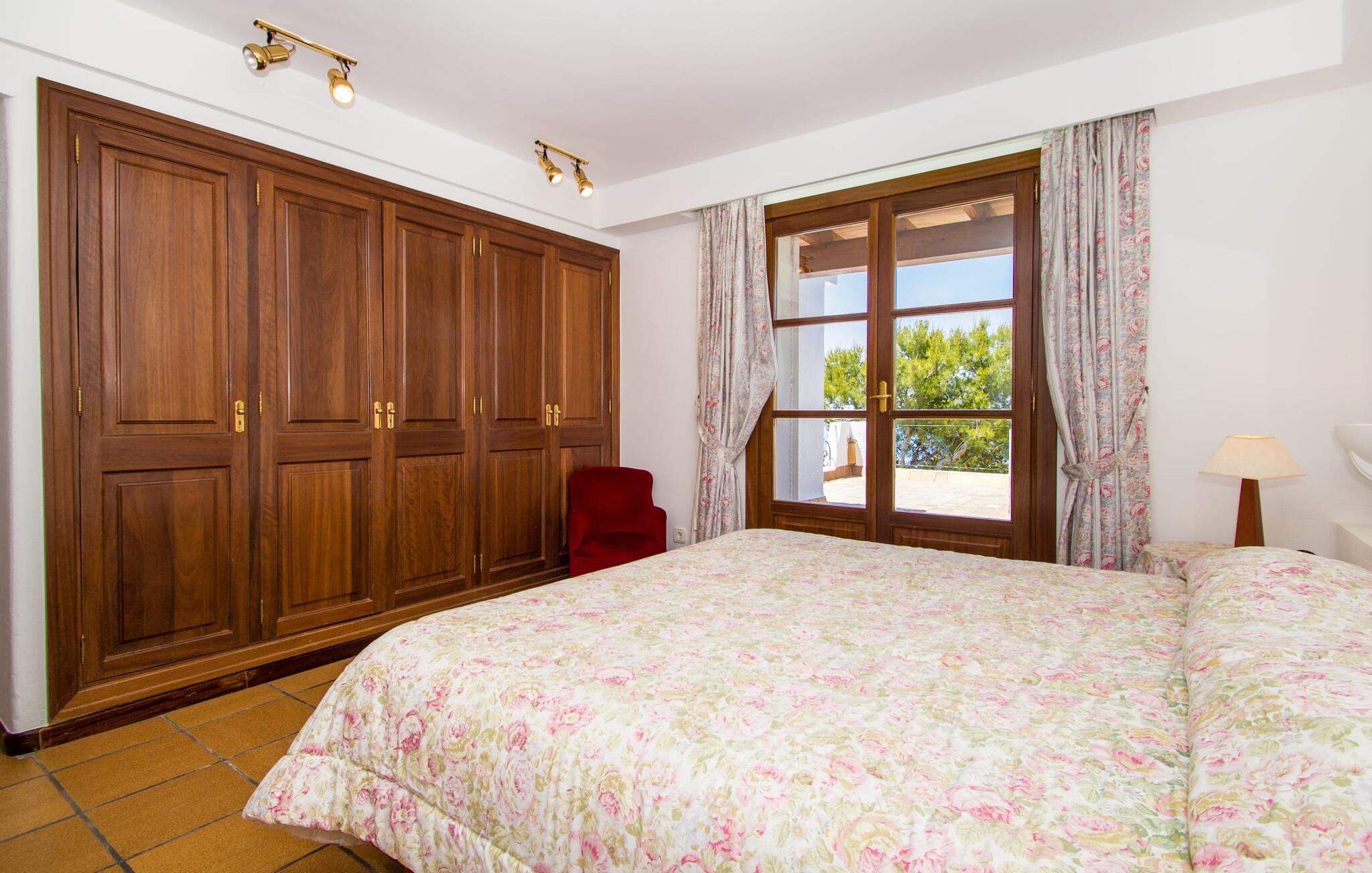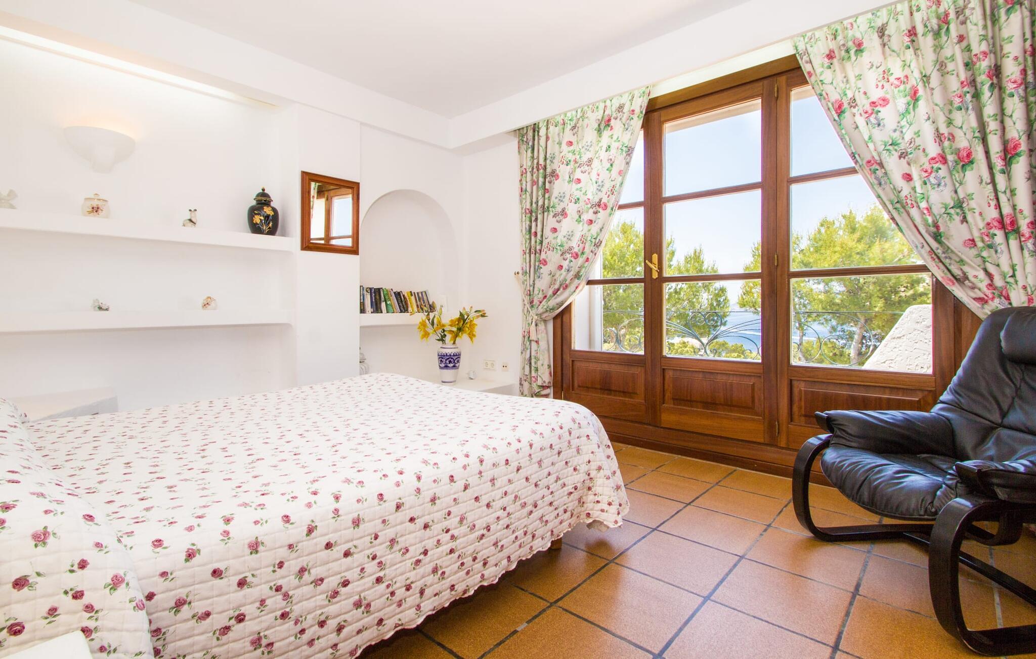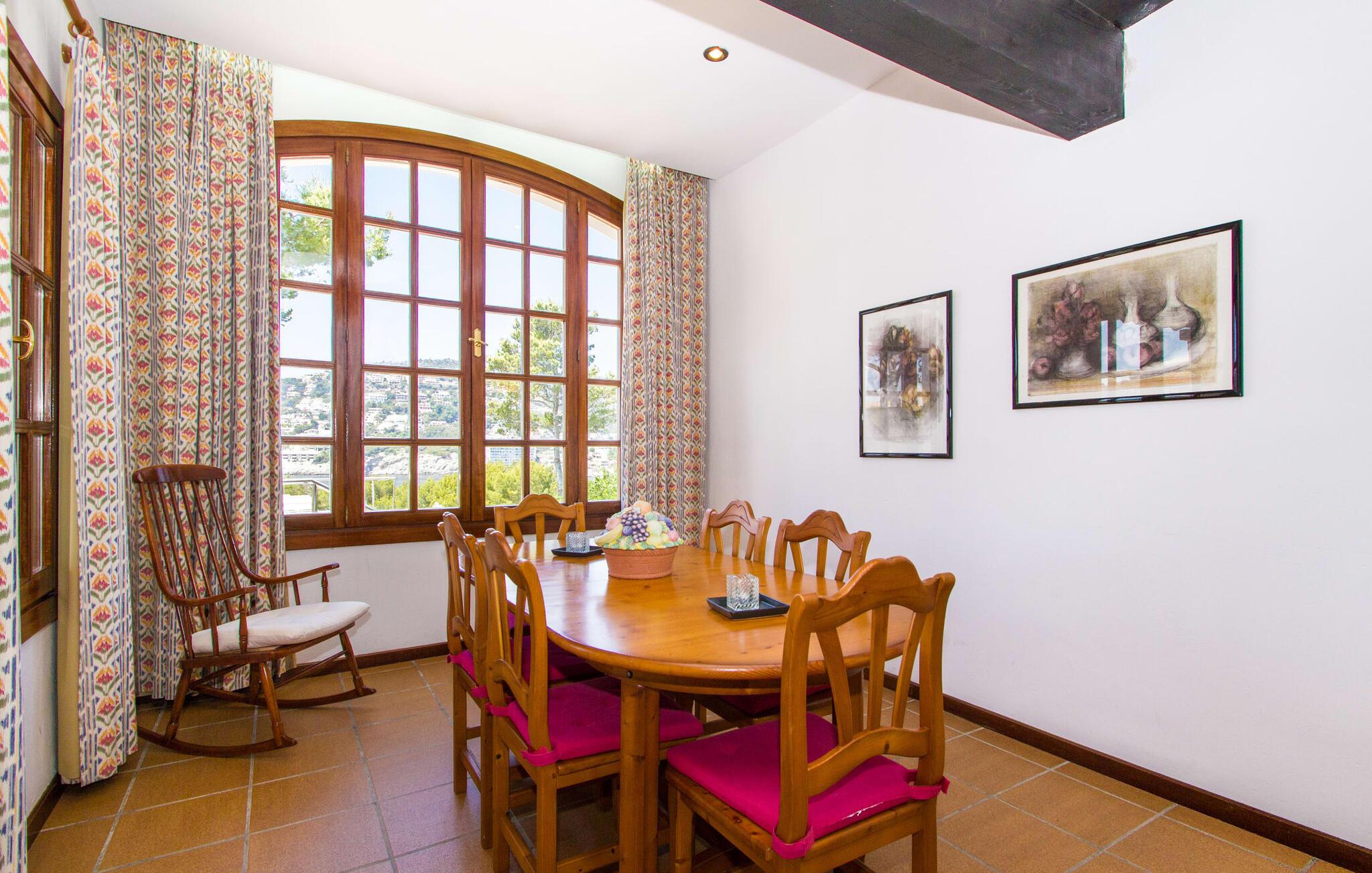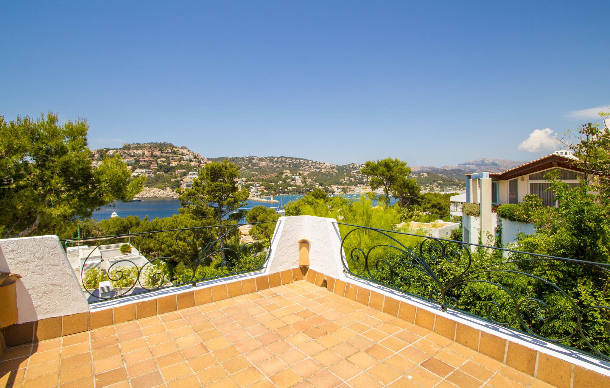 "Sikke en vidunderlig udsigt!" kan I udbryde, når I ankommer til den skinnende hvide villa "Can Rubi" og først nyder panoramaet af Port d'Andratx-bugten, der strækker sig ud foran jer. Og faktisk er den utroligt smukke udsigt over havet det mest markante træk ved dette feriehus. Beliggende i et boligbyggeri nær havnen, rejser huset sig lidt højere end naboejendommene, hvilket giver uhindret udsigt over hustagene til det dybe blå vand i bugten og dele udenfor. Fra stuen er der direkte adgang til en delvis overdækket terrasse, hvor man kan læne sig tilbage og nyde udsigten. Den er selvfølgelig også ideel til at dele måltider sammen i det fri. På lune aftener vil I helt sikkert gerne tænde op for grillen og fylde grillen med friske lokale råvarer. På grund af villaens beliggenhed på bjergsiden er poolen lidt lavere og kan nås via trapper fra terrassen eller via trapperne på siden af huset. Med en længde på næsten 9 m og varierende dybder byder poolen på en kølig forandring på varme dage; brede trin fører ud i vandet. Terrassen ved siden af poolen er udstyret med liggestole og parasoller, hvor I kan ligge og slappe af i det varme solskin, så længe I har lyst. En havegynge og andre siddemuligheder gør også dette til et godt sted at tilbringe tid udendørs. Ejendommen er omgivet af middelhavsflora, herunder to høje fyrretræer, hvilket giver villaens udendørsarealer en hyggelig, forfriskende privat atmosfære. I kan parkere jeres lejebil på den lille gade, der løber forbi huset eller på indkørslen foran huset. Lige så behageligt tiden udenfor vil være, byder interiøret også på en tiltalende, afslappet atmosfære. Værelserne er fordelt på forskellige niveauer, hvilket yderligere forstærker indtrykket af rummelighed og orden. Lyse vægge, masser af træ og matchende accentfarver skaber en atmosfære fuld af varme og komfort. Klimaanlægget giver jer mulighed for at justere temperaturen efter jeres smag, uanset årstiden. En stærkt oplyst, rummelig entré fører ned et par trin til stuen, hvor komfortable sofaer, en pejs og et fladskærms-satellit-tv skaber et miljø, der er velegnet til timers afslapning. Dette værelse fører direkte tilbage til terrassen. Til højre for indgangen er der et soveværelse med eget badeværelse og et ekstra toilet. En bred buegang i stuen fører til et værelse, hvor en disk adskiller køkkenet fra et lille opholdsområde. Udover en elkedel, en filterkaffemaskine og en Dolce Gusto-kaffemaskine er der også større hvidevarer som ovn, komfur, vaskemaskine og to køleskabe – og god plads til arbejde og opbevaring. I det næste værelse kan I takket være den åbne spiseplads og det store træbord spise sammen med stil, mens I nyder udsigten over bugten! Der er yderligere tre soveværelser ovenpå. En af dem har eget badeværelse, de to andre deler badeværelse. Alle værelser er komfortabelt indrettede og giver nem adgang til terrassen. Nyd en afslappende søvn på følgende sengestørrelser: en seng, der måler 1,80 x 2 m, to, der måler 1,50 x 1,90 m og en anden, der måler 0,90 x 1,90 m. De smukke badeværelser, som har tre funktioner hårtørrer og andre faciliteter, giver naturligt lys og nok plads til alle på turen. Hvis I er interesseret i at udforske nogle af øens kulturskatte, er der flere værdifulde destinationer i nærheden. For eksempel kan I på en vandretur til ruinerne af et trappistkloster i La Trapa komme helt tæt på det smukke bjerglandskab i denne vestlige del af øen. Hvis I er interesseret i moderne kunst og arkitektur, anbefaler vi et besøg på Studio Weil i Port d'Andratx. Fra Port d'Andratx har I mulighed for at tage en tur til den ubeboede klippeø Sa Dragonera og opdage den ekstraordinære flora og fauna der. Nyd en vidunderlig dag på stranden, herunder i Camp de Mar eller Cala Egos. Det, der gør den vestlige del af Mallorca så speciel, er mangfoldigheden i denne region, som gør hver dag i jeres ferie til en helt ny oplevelse. Udnyt alt, hvad området har at byde på, og vend derefter tilbage til den smukke villa "Can Rubi" og nyd hvert øjeblik af de lange ferieaftener. Den velholdte villa "Can Rubi" har en vidunderlig udsigt over havet fra sin bjergskråning på den vestlige del af øen, kun omkring 1,3 km fra centrum af havnebyen Port d'Andratx. Nyd en betagende udsigt i alle retninger fra villaens unikke udsigtspunkt. Byen Andratx er ideel til shopping eller gå en tur med bjergene som kulisse. Sandstranden i Camp de Mar kan nås på 15 minutter i lejebil.