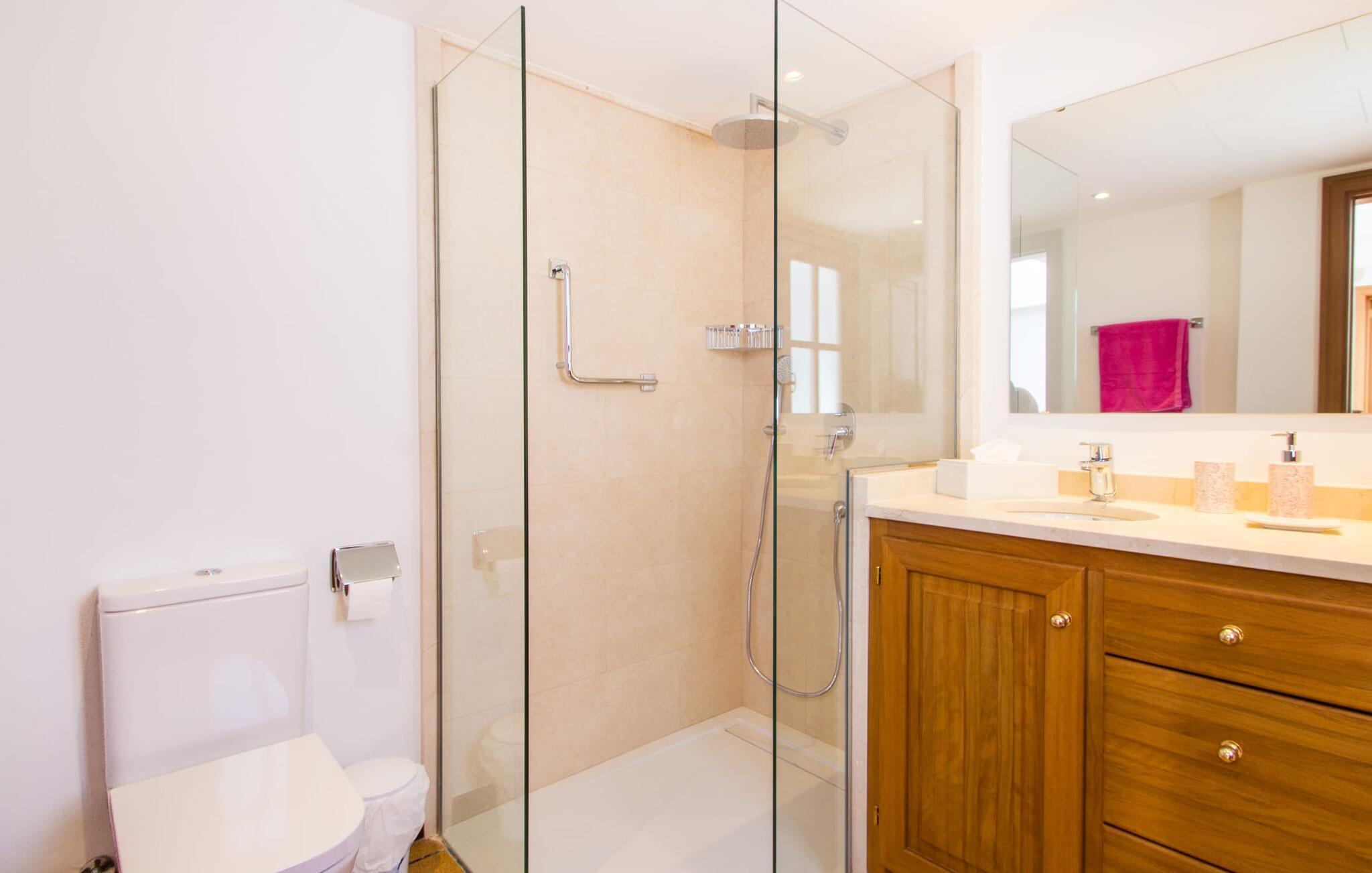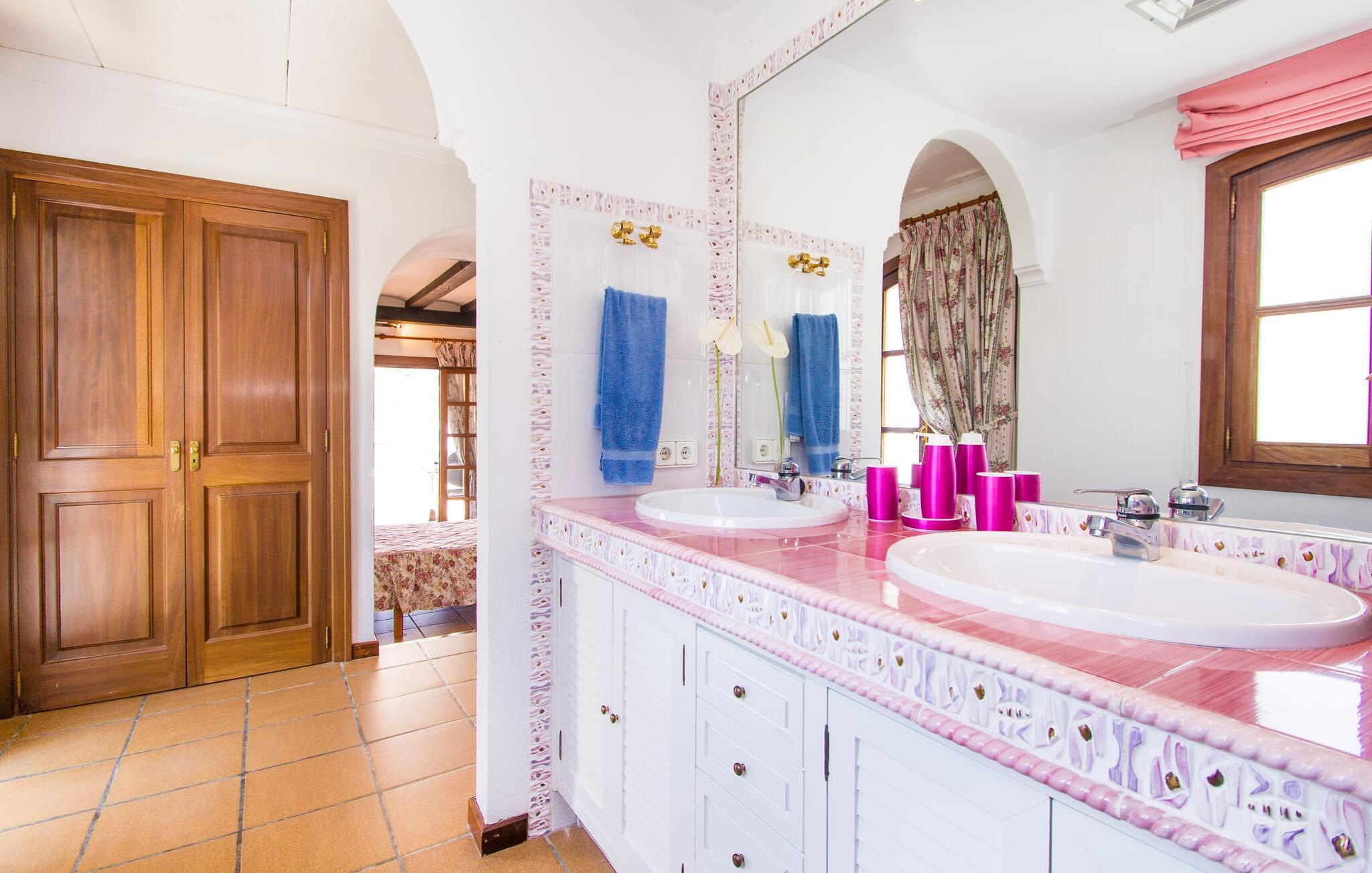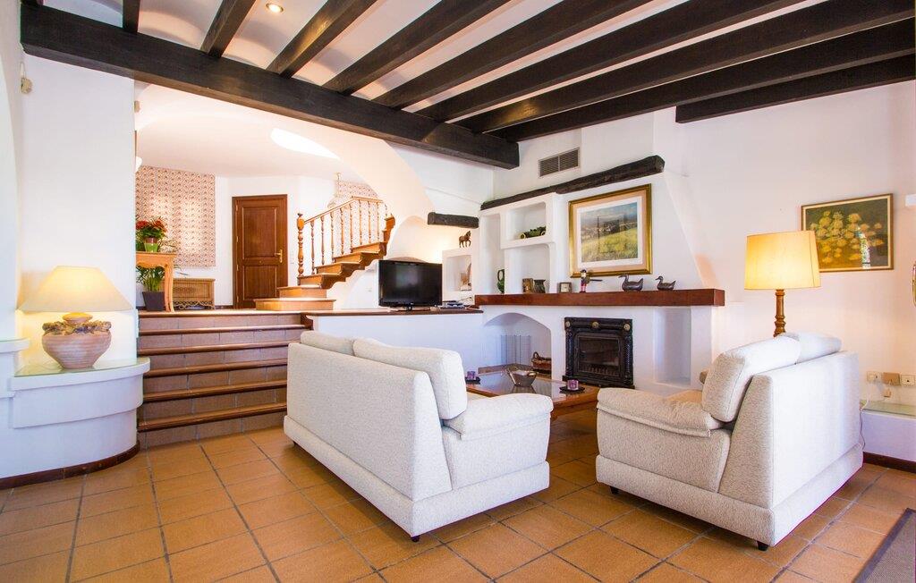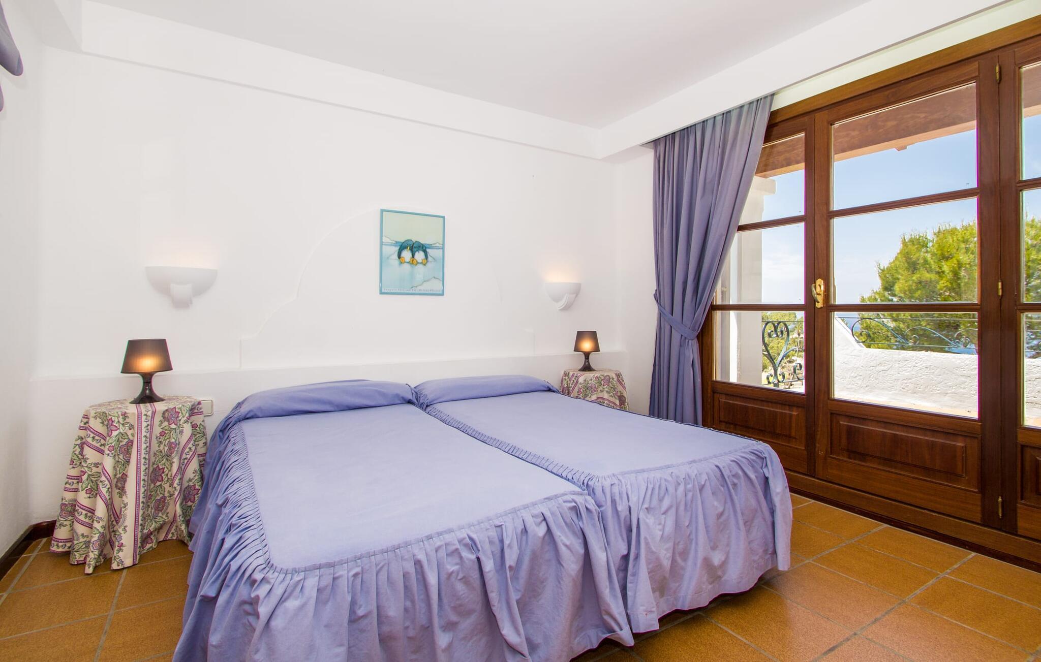 "Sikke en vidunderlig udsigt!" kan I udbryde, når I ankommer til den skinnende hvide villa "Can Rubi" og først nyder panoramaet af Port d'Andratx-bugten, der strækker sig ud foran jer. Og faktisk er den utroligt smukke udsigt over havet det mest markante træk ved dette feriehus. Beliggende i et boligbyggeri nær havnen, rejser huset sig lidt højere end naboejendommene, hvilket giver uhindret udsigt over hustagene til det dybe blå vand i bugten og dele udenfor. Fra stuen er der direkte adgang til en delvis overdækket terrasse, hvor man kan læne sig tilbage og nyde udsigten. Den er selvfølgelig også ideel til at dele måltider sammen i det fri. På lune aftener vil I helt sikkert gerne tænde op for grillen og fylde grillen med friske lokale råvarer. På grund af villaens beliggenhed på bjergsiden er poolen lidt lavere og kan nås via trapper fra terrassen eller via trapperne på siden af huset. Med en længde på næsten 9 m og varierende dybder byder poolen på en kølig forandring på varme dage; brede trin fører ud i vandet. Terrassen ved siden af poolen er udstyret med liggestole og parasoller, hvor I kan ligge og slappe af i det varme solskin, så længe I har lyst. En havegynge og andre siddemuligheder gør også dette til et godt sted at tilbringe tid udendørs. Ejendommen er omgivet af middelhavsflora, herunder to høje fyrretræer, hvilket giver villaens udendørsarealer en hyggelig, forfriskende privat atmosfære. I kan parkere jeres lejebil på den lille gade, der løber forbi huset eller på indkørslen foran huset. Lige så behageligt tiden udenfor vil være, byder interiøret også på en tiltalende, afslappet atmosfære. Værelserne er fordelt på forskellige niveauer, hvilket yderligere forstærker indtrykket af rummelighed og orden. Lyse vægge, masser af træ og matchende accentfarver skaber en atmosfære fuld af varme og komfort. Klimaanlægget giver jer mulighed for at justere temperaturen efter jeres smag, uanset årstiden. En stærkt oplyst, rummelig entré fører ned et par trin til stuen, hvor komfortable sofaer, en pejs og et fladskærms-satellit-tv skaber et miljø, der er velegnet til timers afslapning. Dette værelse fører direkte tilbage til terrassen. Til højre for indgangen er der et soveværelse med eget badeværelse og et ekstra toilet. En bred buegang i stuen fører til et værelse, hvor en disk adskiller køkkenet fra et lille opholdsområde. Udover en elkedel, en filterkaffemaskine og en Dolce Gusto-kaffemaskine er der også større hvidevarer som ovn, komfur, vaskemaskine og to køleskabe – og god plads til arbejde og opbevaring. I det næste værelse kan I takket være den åbne spiseplads og det store træbord spise sammen med stil, mens I nyder udsigten over bugten! Der er yderligere tre soveværelser ovenpå. En af dem har eget badeværelse, de to andre deler badeværelse. Alle værelser er komfortabelt indrettede og giver nem adgang til terrassen. Nyd en afslappende søvn på følgende sengestørrelser: en seng, der måler 1,80 x 2 m, to, der måler 1,50 x 1,90 m og en anden, der måler 0,90 x 1,90 m. De smukke badeværelser, som har tre funktioner hårtørrer og andre faciliteter, giver naturligt lys og nok plads til alle på turen. Hvis I er interesseret i at udforske nogle af øens kulturskatte, er der flere værdifulde destinationer i nærheden. For eksempel kan I på en vandretur til ruinerne af et trappistkloster i La Trapa komme helt tæt på det smukke bjerglandskab i denne vestlige del af øen. Hvis I er interesseret i moderne kunst og arkitektur, anbefaler vi et besøg på Studio Weil i Port d'Andratx. Fra Port d'Andratx har I mulighed for at tage en tur til den ubeboede klippeø Sa Dragonera og opdage den ekstraordinære flora og fauna der. Nyd en vidunderlig dag på stranden, herunder i Camp de Mar eller Cala Egos. Det, der gør den vestlige del af Mallorca så speciel, er mangfoldigheden i denne region, som gør hver dag i jeres ferie til en helt ny oplevelse. Udnyt alt, hvad området har at byde på, og vend derefter tilbage til den smukke villa "Can Rubi" og nyd hvert øjeblik af de lange ferieaftener. Den velholdte villa "Can Rubi" har en vidunderlig udsigt over havet fra sin bjergskråning på den vestlige del af øen, kun omkring 1,3 km fra centrum af havnebyen Port d'Andratx. Nyd en betagende udsigt i alle retninger fra villaens unikke udsigtspunkt. Byen Andratx er ideel til shopping eller gå en tur med bjergene som kulisse. Sandstranden i Camp de Mar kan nås på 15 minutter i lejebil.