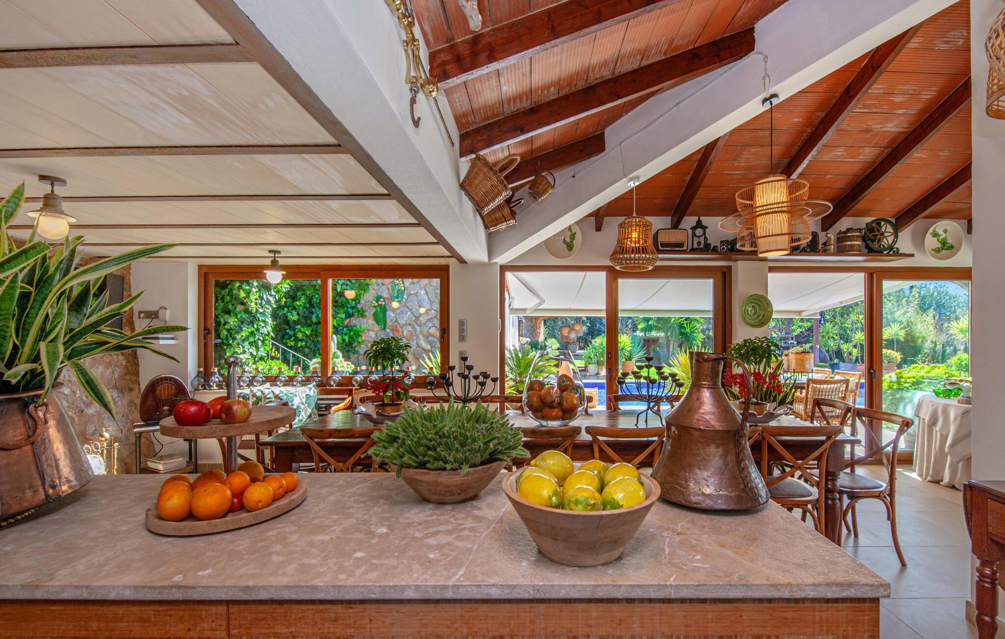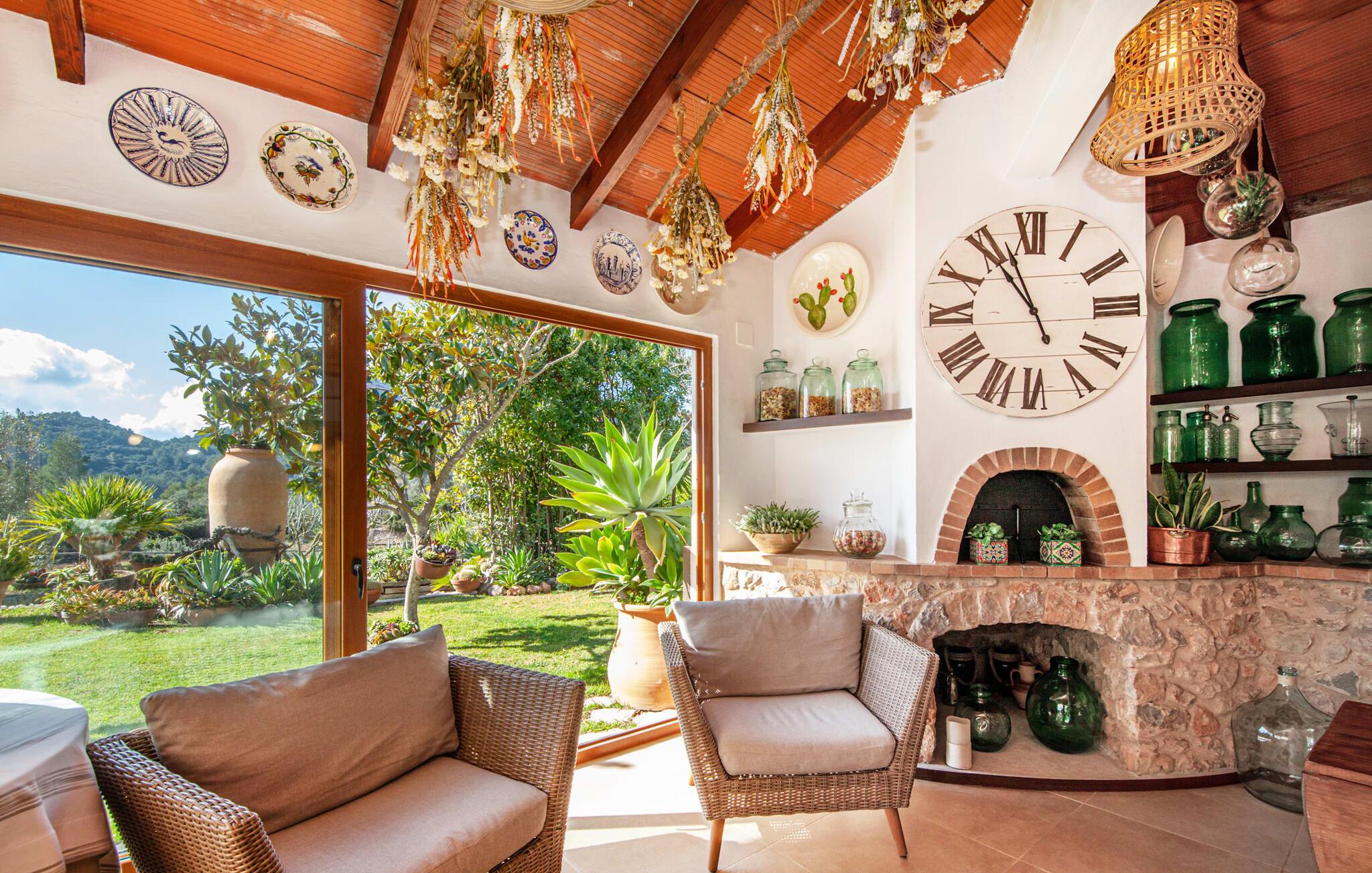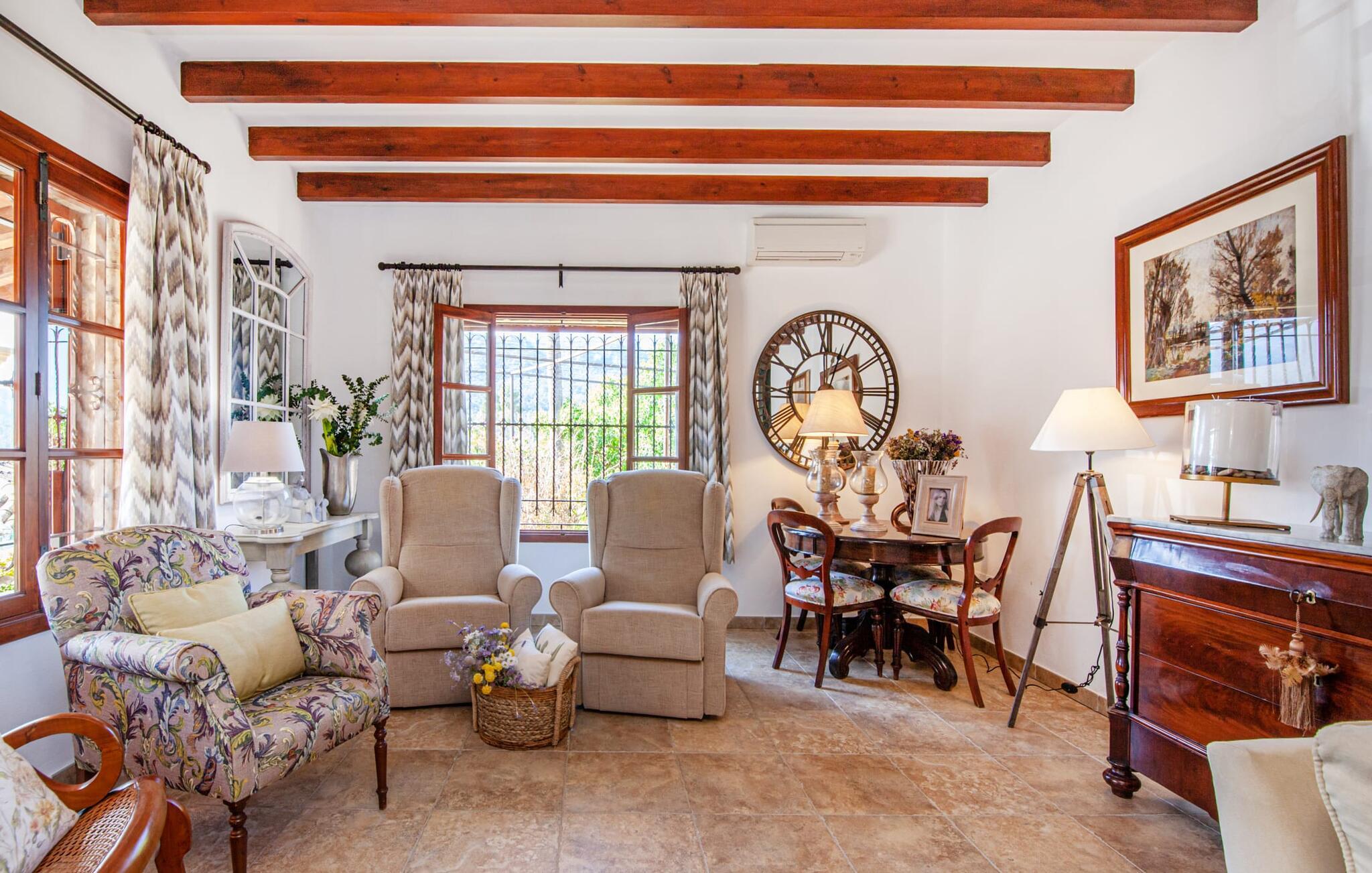 Den gamle villa "Can Sion" er et lille stykke paradis. Ejendommen, som består af tre bygninger, er over 100 år gammel og er blevet perfekt renoveret og udstyret til en høj standard. Bygningerne vender mod syd og er omgivet af en utrolig smuk have. Ved første øjekast ser det ud til, at det vokser naturligt, men ved nærmere eftersyn kan man se, at havearkitekturen er smart planlagt med palmer og andre træer, blomster, frodige grønne plæner og endda en frugthave. Det er også smukt dekoreret med antikt landbrugsudstyr, talrige terracotta urtepotter og diskret placerede dekorative genstande. Vores fotograf blev straks forelsket i denne ejendom, og vi mener også, at et malet billede ikke fuldt ud afspejler dens skønhed. Poolen ligger lige ved siden af annekset, med et meget praktisk udendørs badeværelse med toilet og et soveværelse. Terrassetilbygningen har et overdækket område med tøndelignende træbeklædning - stemningen omkring det store spisebord er rigtig god, især om aftenen, hvor I kan slappe af og forberede jeres grill ved den fritstående udendørs brændeovn. I kan også sidde på de komfortable aluminiums liggestole eller bruge lidt tid sammen i et af de andre siddepladser med klassiske kurvestole og komfortable liggestole, mens I nyder den vidunderlige udsigt. Indretningen af alle tre bygninger passer ind i den hyggelige haveidyl og danner en vellykket kombination af rustik mallorcansk landstedsstil med klassisk elegance. Store vinduesfronter i træ bader hovedhuset med sin rummelige stue i blødt lys. Et lyst sofasæt, en støbejernspejs og mange kærligt sammensatte detaljer skaber en hjemlig, behagelig atmosfære. Bag stuen er et soveværelse med dobbeltseng med en hånddrejet seng og et en-suite badeværelse, moderne moderne og præget af naturstensfliser og bruseniche. Det tilstødende udhus rummer kun det pragtfulde køkken med et langt spisebord i midten. Synligt stenbrud, store glasskydedøre, storformat gulvfliser og en hyggelig pejs giver dette flotte rum sin karakter, som opfylder meget mere end blot en køkkenfunktion. De sofistikerede detaljer definerer interiøret med murstensskabe, et køleskab i rustfrit stål, tørrede pimiento-ledninger og et ensemble af glaskuglelamper, for blot at nævne nogle af de utallige kærlige detaljer, I finder her. Det andet soveværelse med direkte adgang til haven ligger også i annekset ved siden af poolen. De to enkeltværelser suppleres af en ekstra seng, som er ideel til et barn. Den maleriske ejendom er derfor særdeles velegnet til et eller to par med et barn eller en familie med to børn. Den spændende villa “Can Sion” passer ind i dette spektakulære område, hvor der næsten ikke er nogen naboer. Det ligger mellem Esporles og kystbyen Port des Canonges. Bjerglandsbyen Esporles, 4 km væk i en dal på sydsiden af Tramuntana-bjergene, har nogle hyggelige caféer og små, lokale restauranter. Den charmerende fiskerby Port de Canonges har en badebugt med en imponerende udsigtsplatform og et par meget gode restauranter. Derfra fører en nem vandresti til den nærliggende kystby Banyalbufar. Den fører jer ad smalle stier langs kysten gennem en fyrreskov. Omgivet af stejle klipper på den ene side og vild kystlinje på den anden, kan I nyde en betagende udsigt over det turkise hav. Takket være villaens nærhed til en landevej med meget lidt trafik og derfor kun delvis hørbarhed, kan I nemt og komfortabelt køre overalt. Valldemossa, en landsby med romantiske huse i et malerisk landskab, er også et besøg værd. Den bemærkelsesværdigt opdelte villa "Can Sion" med interiør i høj kvalitet er beliggende midt i en idyllisk naturhave, med en sensationel beliggenhed på den vestlige del af øen. Ejendommen har udsigt over Tramuntana-bjergene mellem Esporles og kystbyen Port des Canonges. Her finder I også en skøn strand med en fantastisk udsigtsplatform. I kan shoppe i Esporles eller på det ugentlige marked, der finder sted hver søndag i den romantiske bjerglandsby Valldemossa.