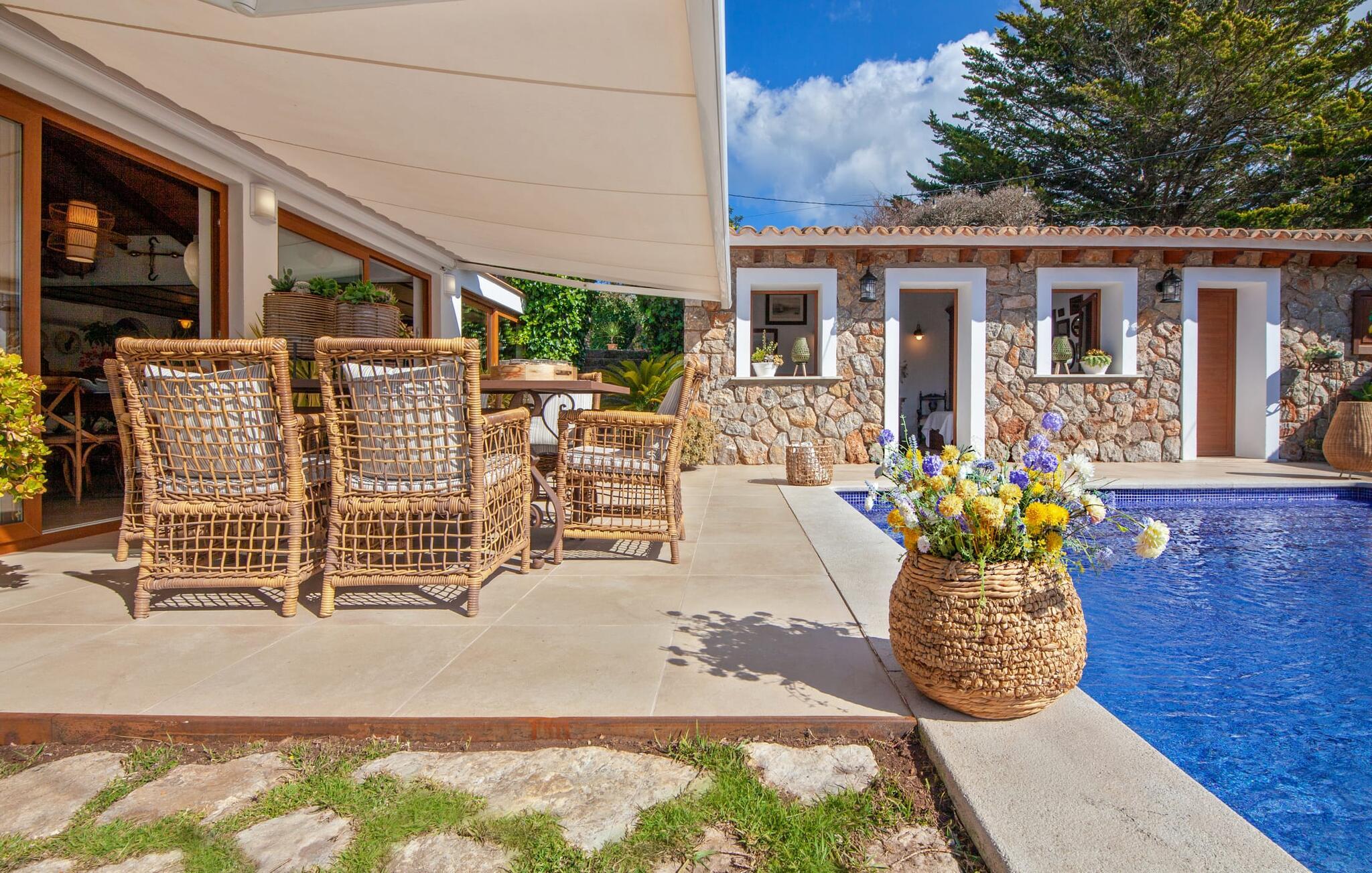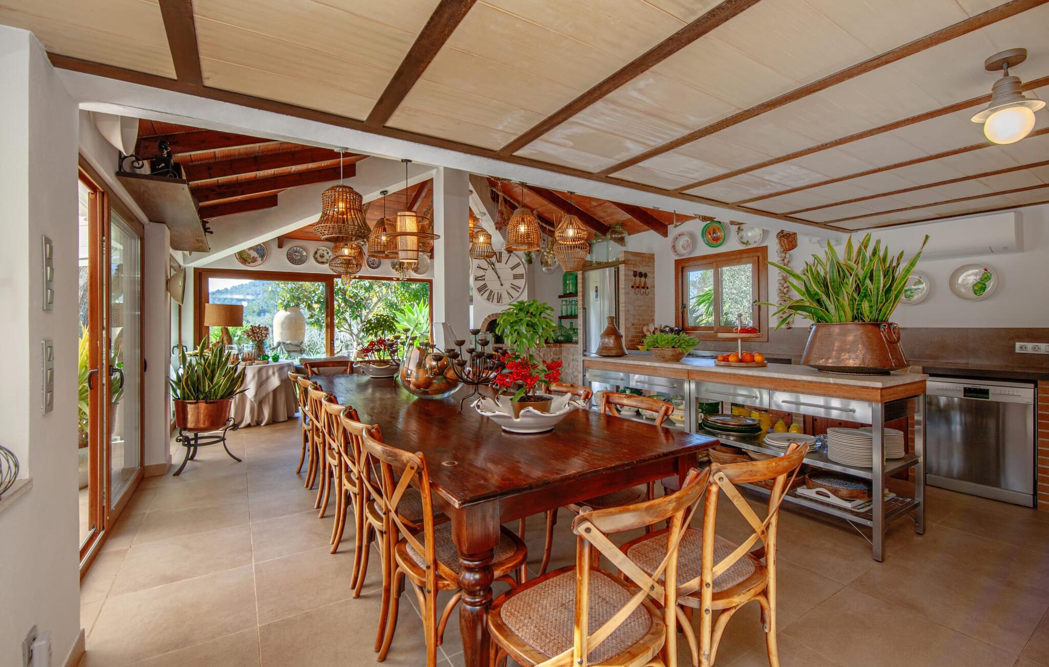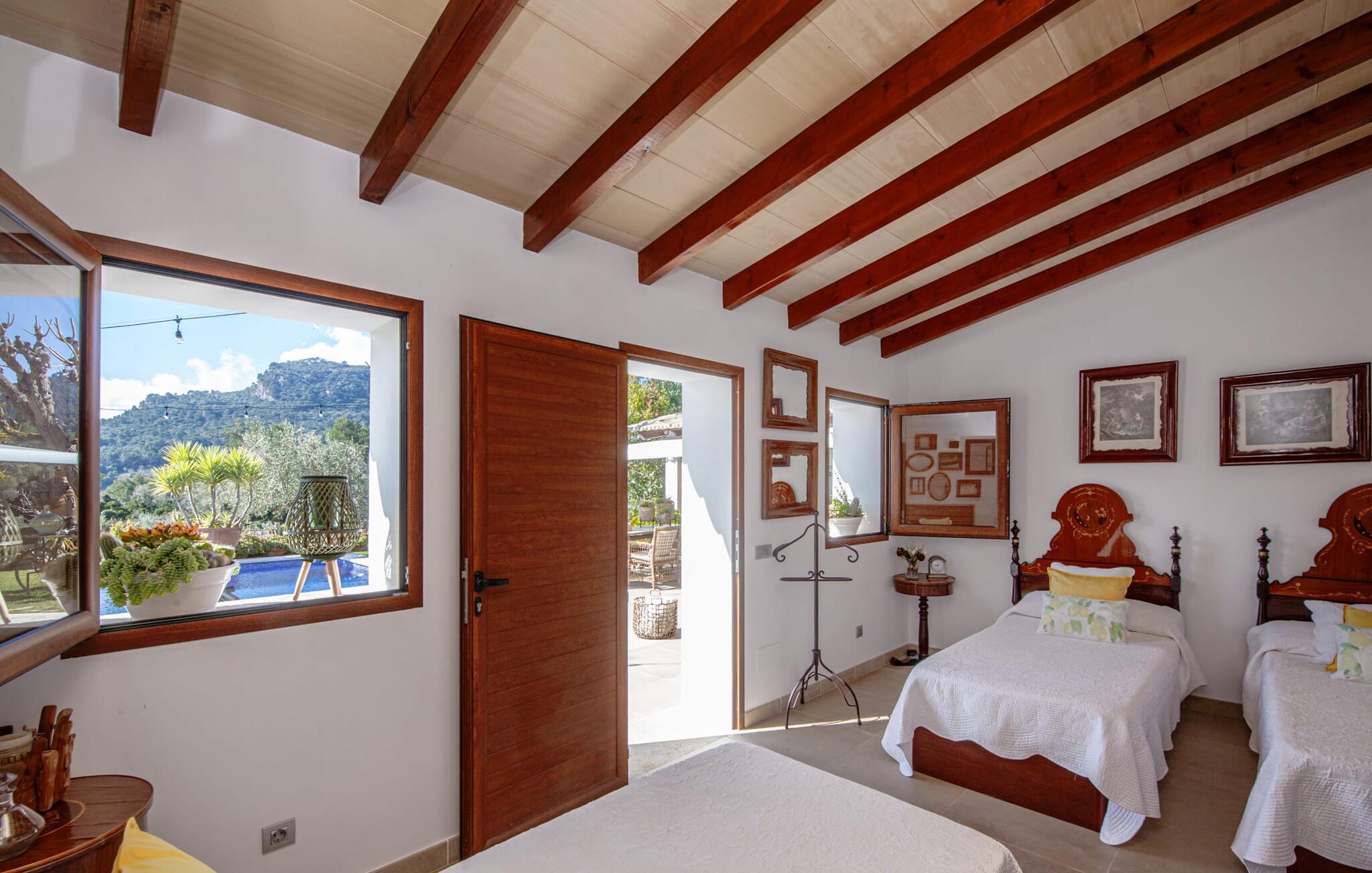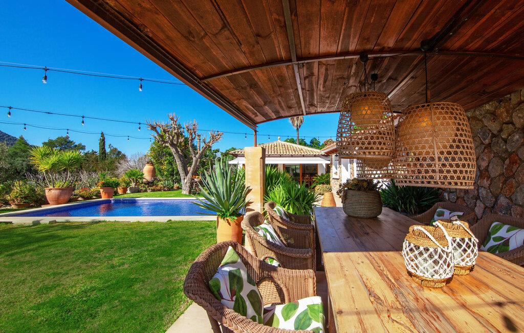 Den gamle villa "Can Sion" er et lille stykke paradis. Ejendommen, som består af tre bygninger, er over 100 år gammel og er blevet perfekt renoveret og udstyret til en høj standard. Bygningerne vender mod syd og er omgivet af en utrolig smuk have. Ved første øjekast ser det ud til, at det vokser naturligt, men ved nærmere eftersyn kan man se, at havearkitekturen er smart planlagt med palmer og andre træer, blomster, frodige grønne plæner og endda en frugthave. Det er også smukt dekoreret med antikt landbrugsudstyr, talrige terracotta urtepotter og diskret placerede dekorative genstande. Vores fotograf blev straks forelsket i denne ejendom, og vi mener også, at et malet billede ikke fuldt ud afspejler dens skønhed. Poolen ligger lige ved siden af annekset, med et meget praktisk udendørs badeværelse med toilet og et soveværelse. Terrassetilbygningen har et overdækket område med tøndelignende træbeklædning - stemningen omkring det store spisebord er rigtig god, især om aftenen, hvor I kan slappe af og forberede jeres grill ved den fritstående udendørs brændeovn. I kan også sidde på de komfortable aluminiums liggestole eller bruge lidt tid sammen i et af de andre siddepladser med klassiske kurvestole og komfortable liggestole, mens I nyder den vidunderlige udsigt. Indretningen af alle tre bygninger passer ind i den hyggelige haveidyl og danner en vellykket kombination af rustik mallorcansk landstedsstil med klassisk elegance. Store vinduesfronter i træ bader hovedhuset med sin rummelige stue i blødt lys. Et lyst sofasæt, en støbejernspejs og mange kærligt sammensatte detaljer skaber en hjemlig, behagelig atmosfære. Bag stuen er et soveværelse med dobbeltseng med en hånddrejet seng og et en-suite badeværelse, moderne moderne og præget af naturstensfliser og bruseniche. Det tilstødende udhus rummer kun det pragtfulde køkken med et langt spisebord i midten. Synligt stenbrud, store glasskydedøre, storformat gulvfliser og en hyggelig pejs giver dette flotte rum sin karakter, som opfylder meget mere end blot en køkkenfunktion. De sofistikerede detaljer definerer interiøret med murstensskabe, et køleskab i rustfrit stål, tørrede pimiento-ledninger og et ensemble af glaskuglelamper, for blot at nævne nogle af de utallige kærlige detaljer, I finder her. Det andet soveværelse med direkte adgang til haven ligger også i annekset ved siden af poolen. De to enkeltværelser suppleres af en ekstra seng, som er ideel til et barn. Den maleriske ejendom er derfor særdeles velegnet til et eller to par med et barn eller en familie med to børn. Den spændende villa “Can Sion” passer ind i dette spektakulære område, hvor der næsten ikke er nogen naboer. Det ligger mellem Esporles og kystbyen Port des Canonges. Bjerglandsbyen Esporles, 4 km væk i en dal på sydsiden af Tramuntana-bjergene, har nogle hyggelige caféer og små, lokale restauranter. Den charmerende fiskerby Port de Canonges har en badebugt med en imponerende udsigtsplatform og et par meget gode restauranter. Derfra fører en nem vandresti til den nærliggende kystby Banyalbufar. Den fører jer ad smalle stier langs kysten gennem en fyrreskov. Omgivet af stejle klipper på den ene side og vild kystlinje på den anden, kan I nyde en betagende udsigt over det turkise hav. Takket være villaens nærhed til en landevej med meget lidt trafik og derfor kun delvis hørbarhed, kan I nemt og komfortabelt køre overalt. Valldemossa, en landsby med romantiske huse i et malerisk landskab, er også et besøg værd. Den bemærkelsesværdigt opdelte villa "Can Sion" med interiør i høj kvalitet er beliggende midt i en idyllisk naturhave, med en sensationel beliggenhed på den vestlige del af øen. Ejendommen har udsigt over Tramuntana-bjergene mellem Esporles og kystbyen Port des Canonges. Her finder I også en skøn strand med en fantastisk udsigtsplatform. I kan shoppe i Esporles eller på det ugentlige marked, der finder sted hver søndag i den romantiske bjerglandsby Valldemossa.