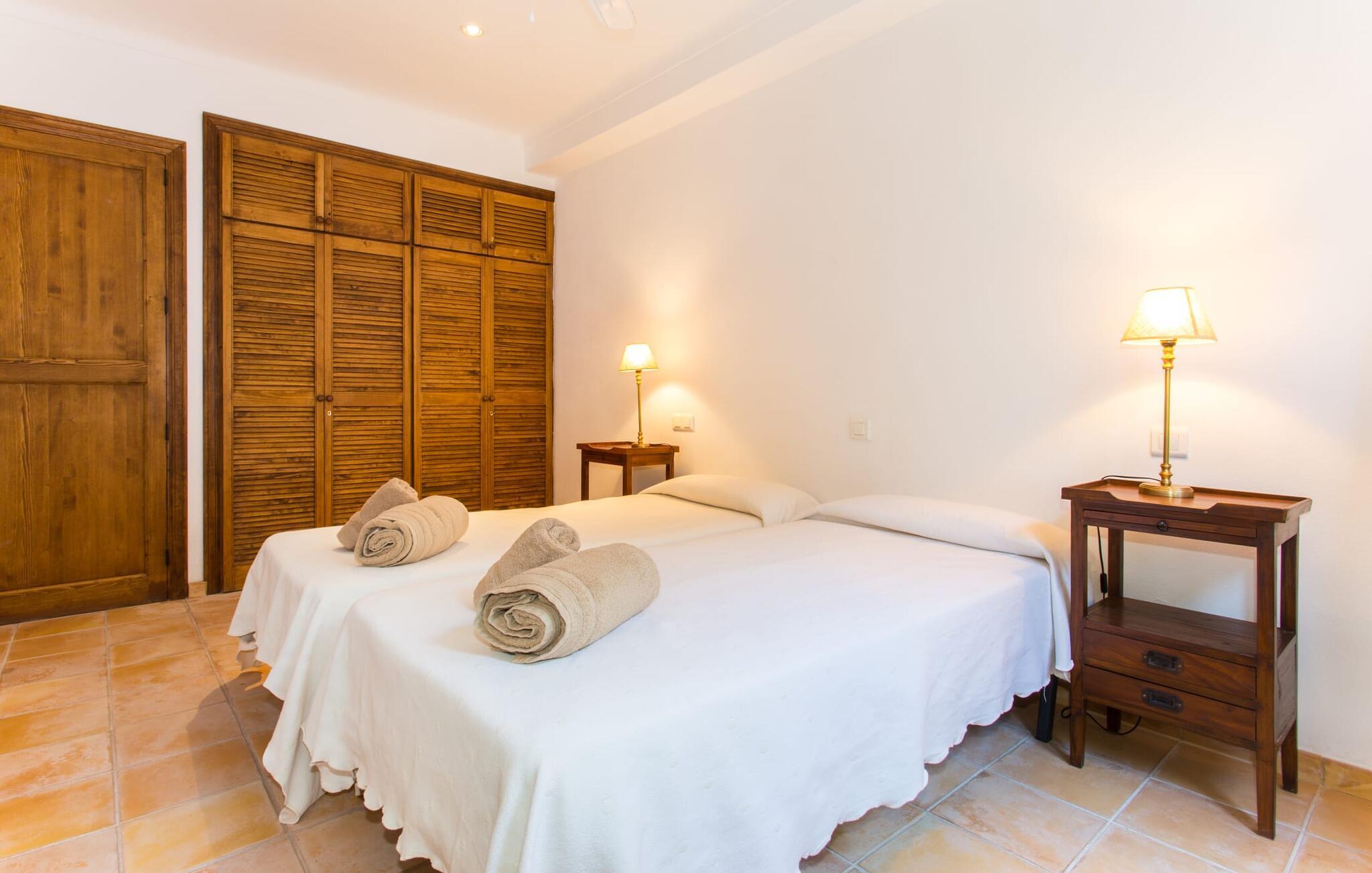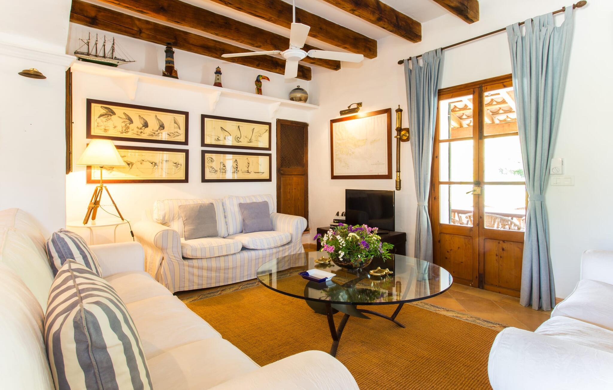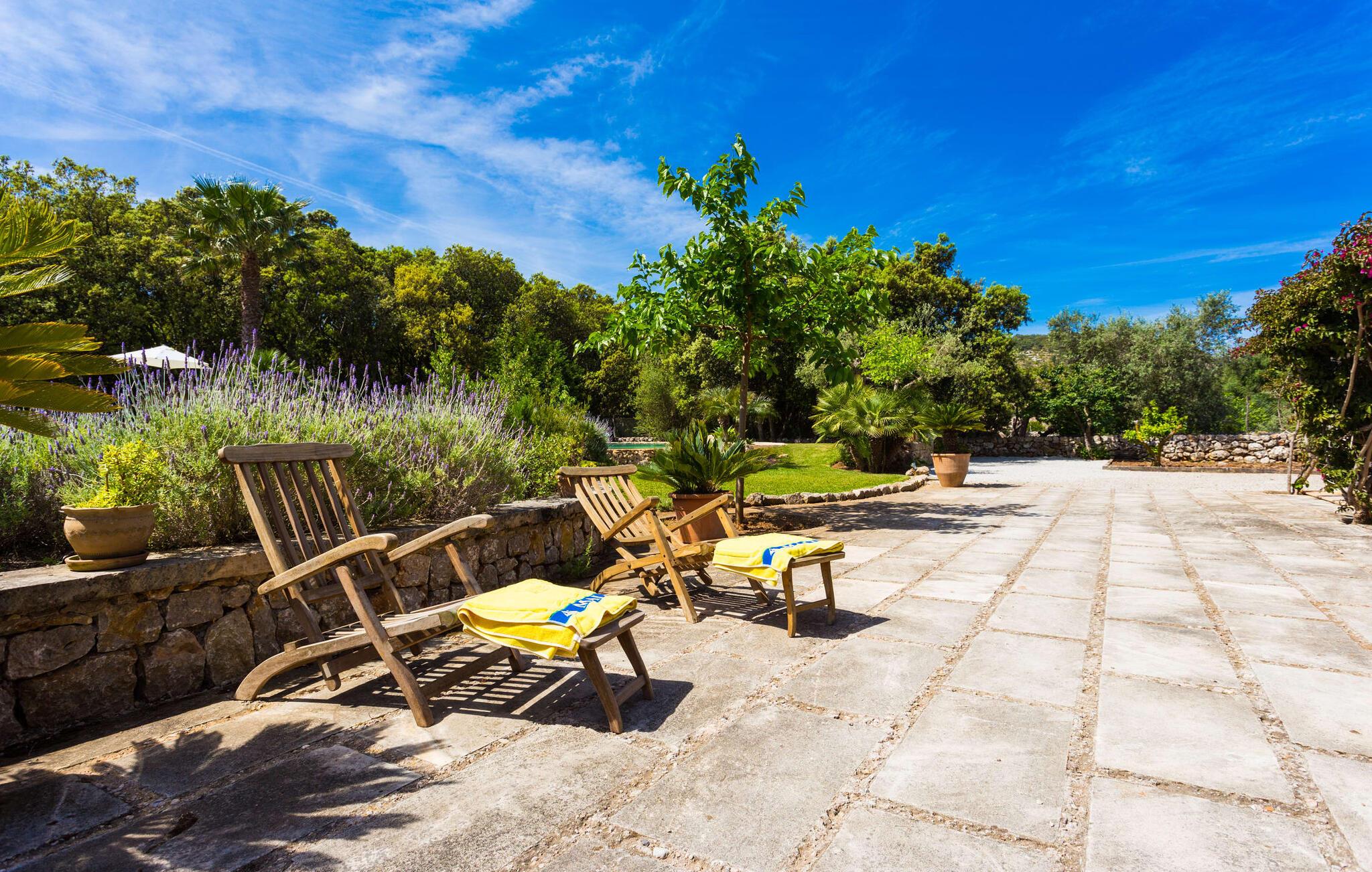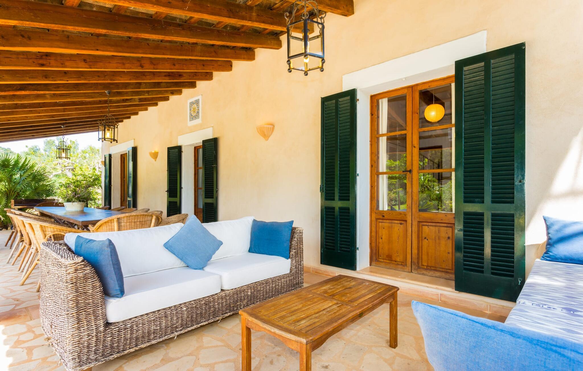 Efter at have kørt ad nogle små lokale veje, ankommer vi på en solskinsdag for at besøge villaen "Can Teulada". Vores første indtryk er: "Sikke et malerisk sted dette er!" Fra første øjeblik mærker vi den overordnede hyggelige atmosfære, der gennemsyrer alt her, og føler os spændte på at udforske ejendommen yderligere. Undervejs stopper vi for at beundre det frodige middelhavsgrønt i form af palmer, buske og blomster, der dekorerer grunden. Foran huset er der en veranda med et kæmpe spisebord i træ. Alle i jeres gruppe kan sidde og spise sammen i dette luftige, overdækkede område. Det bliver også dejligt at få en solid morgenmad herude og hilse på den nye dag med udsigt til haven. På den anden side af verandaen er der en rattan sofa og en anden lavet af mursten, hvilket gør det til et fantastisk sted at slappe af udendørs. Lav jer en god drink og nyd den bare herude på dette hyggelige sted. De grønne skodder på huset, de rustikke synlige loftsbjælker og naturstensgulvene bidrager til følelsen af ??komfort og komfort; Om aftenen fuldender romantiske pendellamper effekten. Blot få skridt væk ligger poolen, hvis afrundede form næsten får det til at ligne en stor dam. Dette indtryk forstærkes yderligere af de store sten, der er placeret rundt om kanterne. Dette fantasifulde design gør poolen til et enestående sted at køle af på en varm sommerdag. Trin, der fører ned i vandet, gør det lettere at komme ind og ud. Så læg jer ned på en af ??de otte komfortable liggestole og forkæl jer selv med den varme middelhavssol, så længe I har lyst. Og foretrækker I at ligge i skyggen, kan I gøre det hele dagen lang i træernes naturlige skygge eller herude under parasollen. Vil I hellere lave noget andet end bare at nyde lediggang ved poolen, så er bordtennisbordet perfekt til jer. Da vi træder ind i villaen, bliver vi straks overrasket over den fortryllende effekt af de forskellige stoffer, farver og møbler i rumsammensætningen. Lyse vægge, synlige loftsbjælker, afrundede buegange og terracotta gulvfliser giver rummet en hyggelig og varm atmosfære, mens unikke kunstværker forstærker den overordnede indbydende atmosfære på dette sted. I stueetagen er der en stor stue med komfortable sofaer og en pejs, der giver ekstra atmosfære på køligere aftener. Lige rundt om hjørnet ligger det traditionelle mallorcanske køkken med et smukt antikt træbord i midten af ??rummet, perfekt til en overdådig indendørs fest. Køkkenet er fuldt udstyret med alt hvad I behøver til hverdagsbrug, herunder ovn, komfur, køleskab med fryser, opvaskemaskine, brødrister, elkedel og filterkaffemaskine. Der er endnu et bord mellem stue og køkken, så der skal altid være plads nok til alle. Der er også et soveværelse og et badeværelse på denne etage; de andre tre soveværelser og to badeværelser er ovenpå. Alle værelser er varme og indbydende og har et højt niveau af æstetik. Intet må forstyrre jeres fred og ro her i dette miljø – også selvom I af og til hører naboernes hunde gø i det fjerne. De moderne badeværelser tilbyder plads og komfort nok til alle på turen; Der er også to hårtørrere til rådighed, så I ikke behøver at tage dem med hele vejen hjemmefra. Et særligt højdepunkt i dette hus er den ombyggede kælder med et stærkt oplyst hovedrum med et spisebord og to senge. Der er også tekøkken med køleskab og komfur. Dette originale opholdsrum er afrundet af yderligere to soveværelser og et badeværelse. Dette område er ideelt for alle teenagere, der tager på turen eller andre, der værdsætter deres privatliv. En anden fordel er, at det på grund af designet holder sig ret køligt her, også når det er rigtig varmt udenfor. Udover alle de ting, vi allerede har nævnt, er en af ??hovedtrækkene ved Villa "Teulada" naturligvis den fantastiske beliggenhed. På den ene side er I omgivet af grønt, men på den anden side er I kun få minutter væk fra havet i bil. Sandstrandene omkring Port de Pollença har en lavvandet indgang til vandet, hvilket gør dem særligt attraktive for familier. Og Pollença er en ideel destination, hvis I nogensinde ønsker at forlade den landlige komfort i jeres villa for et stykke tid. Byen Pollença ligger omkring 7 km fra kysten og har et par egne attraktioner, herunder en smuk kirke. Når I bestiger bakken til Golgata-kapellet, vil I blive belønnet med en storslået udsigt fra oven. Den utroligt charmerende villa "Can Teulada" ligger på en smukt anlagt ejendom kun 3 km fra Pollença. Og den smukke Port de Polleça ligger kun 7 km væk. Denne attraktive lille kystby har en indbydende havnefront med hyggelige caféer, butikker og restauranter. Der er også nogle sandstrande kun en kort køretur væk. For eksempel er der kun 5 km til Platja de Port de Pollença.