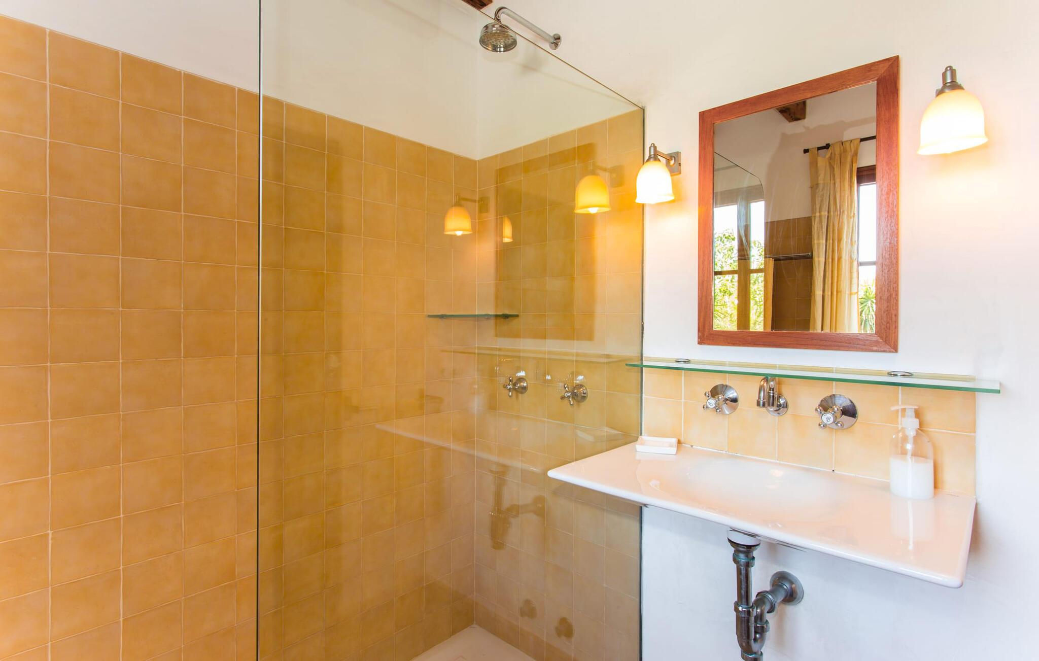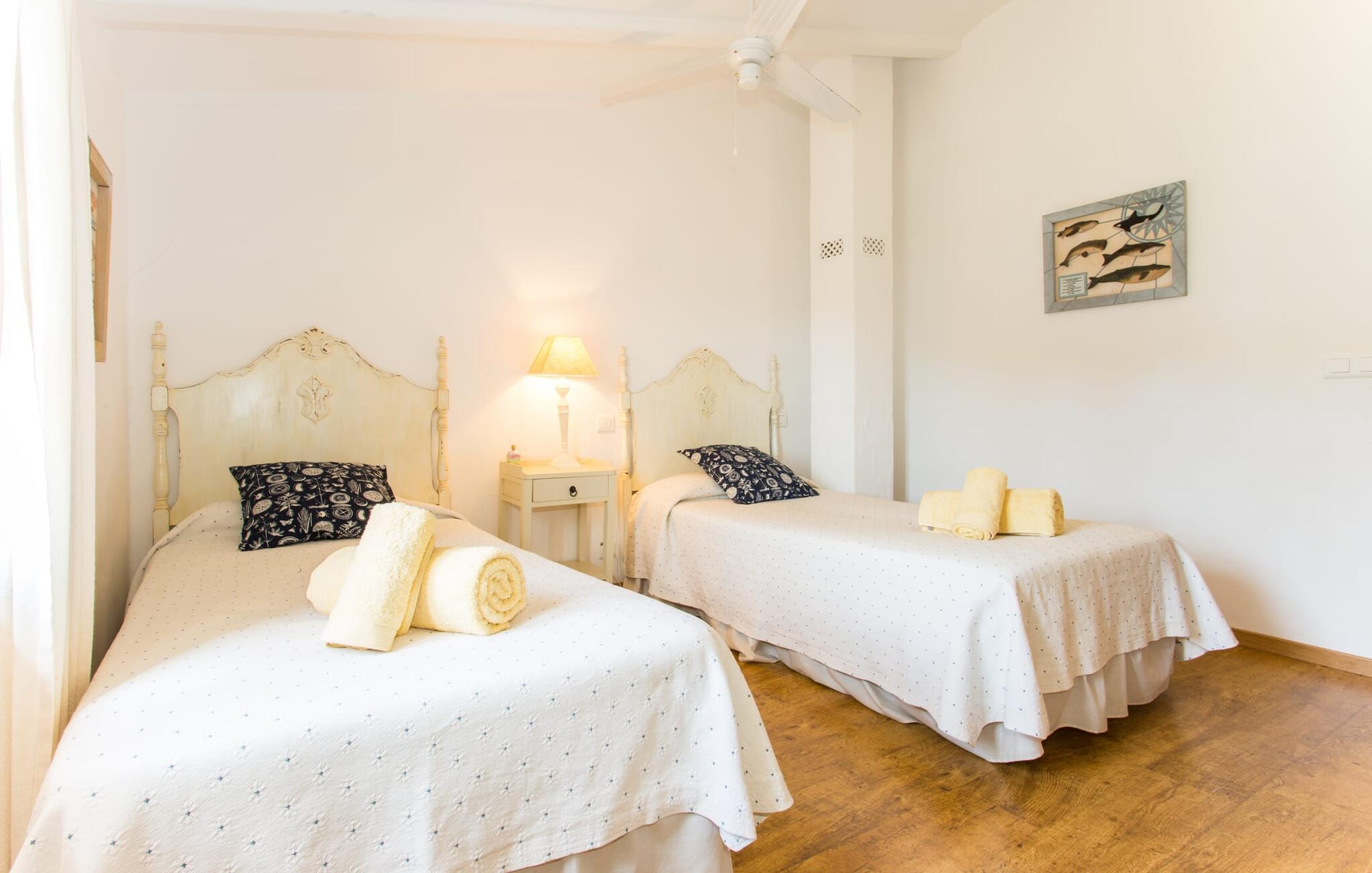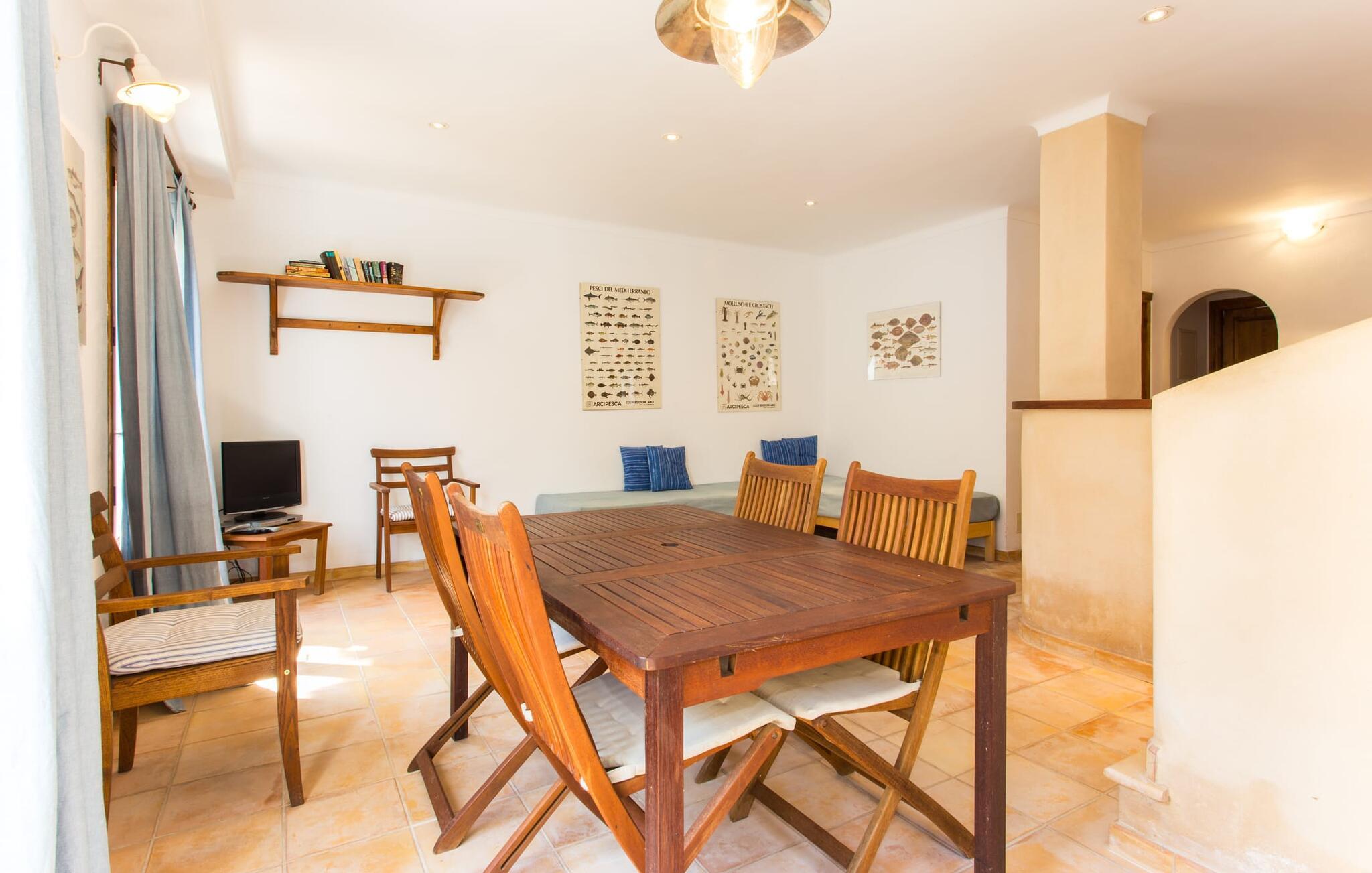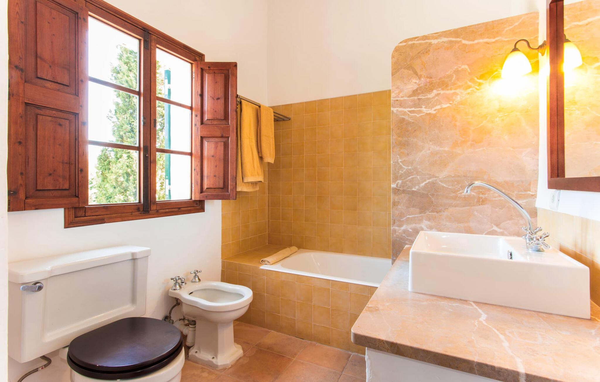 Efter at have kørt ad nogle små lokale veje, ankommer vi på en solskinsdag for at besøge villaen "Can Teulada". Vores første indtryk er: "Sikke et malerisk sted dette er!" Fra første øjeblik mærker vi den overordnede hyggelige atmosfære, der gennemsyrer alt her, og føler os spændte på at udforske ejendommen yderligere. Undervejs stopper vi for at beundre det frodige middelhavsgrønt i form af palmer, buske og blomster, der dekorerer grunden. Foran huset er der en veranda med et kæmpe spisebord i træ. Alle i jeres gruppe kan sidde og spise sammen i dette luftige, overdækkede område. Det bliver også dejligt at få en solid morgenmad herude og hilse på den nye dag med udsigt til haven. På den anden side af verandaen er der en rattan sofa og en anden lavet af mursten, hvilket gør det til et fantastisk sted at slappe af udendørs. Lav jer en god drink og nyd den bare herude på dette hyggelige sted. De grønne skodder på huset, de rustikke synlige loftsbjælker og naturstensgulvene bidrager til følelsen af ??komfort og komfort; Om aftenen fuldender romantiske pendellamper effekten. Blot få skridt væk ligger poolen, hvis afrundede form næsten får det til at ligne en stor dam. Dette indtryk forstærkes yderligere af de store sten, der er placeret rundt om kanterne. Dette fantasifulde design gør poolen til et enestående sted at køle af på en varm sommerdag. Trin, der fører ned i vandet, gør det lettere at komme ind og ud. Så læg jer ned på en af ??de otte komfortable liggestole og forkæl jer selv med den varme middelhavssol, så længe I har lyst. Og foretrækker I at ligge i skyggen, kan I gøre det hele dagen lang i træernes naturlige skygge eller herude under parasollen. Vil I hellere lave noget andet end bare at nyde lediggang ved poolen, så er bordtennisbordet perfekt til jer. Da vi træder ind i villaen, bliver vi straks overrasket over den fortryllende effekt af de forskellige stoffer, farver og møbler i rumsammensætningen. Lyse vægge, synlige loftsbjælker, afrundede buegange og terracotta gulvfliser giver rummet en hyggelig og varm atmosfære, mens unikke kunstværker forstærker den overordnede indbydende atmosfære på dette sted. I stueetagen er der en stor stue med komfortable sofaer og en pejs, der giver ekstra atmosfære på køligere aftener. Lige rundt om hjørnet ligger det traditionelle mallorcanske køkken med et smukt antikt træbord i midten af ??rummet, perfekt til en overdådig indendørs fest. Køkkenet er fuldt udstyret med alt hvad I behøver til hverdagsbrug, herunder ovn, komfur, køleskab med fryser, opvaskemaskine, brødrister, elkedel og filterkaffemaskine. Der er endnu et bord mellem stue og køkken, så der skal altid være plads nok til alle. Der er også et soveværelse og et badeværelse på denne etage; de andre tre soveværelser og to badeværelser er ovenpå. Alle værelser er varme og indbydende og har et højt niveau af æstetik. Intet må forstyrre jeres fred og ro her i dette miljø – også selvom I af og til hører naboernes hunde gø i det fjerne. De moderne badeværelser tilbyder plads og komfort nok til alle på turen; Der er også to hårtørrere til rådighed, så I ikke behøver at tage dem med hele vejen hjemmefra. Et særligt højdepunkt i dette hus er den ombyggede kælder med et stærkt oplyst hovedrum med et spisebord og to senge. Der er også tekøkken med køleskab og komfur. Dette originale opholdsrum er afrundet af yderligere to soveværelser og et badeværelse. Dette område er ideelt for alle teenagere, der tager på turen eller andre, der værdsætter deres privatliv. En anden fordel er, at det på grund af designet holder sig ret køligt her, også når det er rigtig varmt udenfor. Udover alle de ting, vi allerede har nævnt, er en af ??hovedtrækkene ved Villa "Teulada" naturligvis den fantastiske beliggenhed. På den ene side er I omgivet af grønt, men på den anden side er I kun få minutter væk fra havet i bil. Sandstrandene omkring Port de Pollença har en lavvandet indgang til vandet, hvilket gør dem særligt attraktive for familier. Og Pollença er en ideel destination, hvis I nogensinde ønsker at forlade den landlige komfort i jeres villa for et stykke tid. Byen Pollença ligger omkring 7 km fra kysten og har et par egne attraktioner, herunder en smuk kirke. Når I bestiger bakken til Golgata-kapellet, vil I blive belønnet med en storslået udsigt fra oven. Den utroligt charmerende villa "Can Teulada" ligger på en smukt anlagt ejendom kun 3 km fra Pollença. Og den smukke Port de Polleça ligger kun 7 km væk. Denne attraktive lille kystby har en indbydende havnefront med hyggelige caféer, butikker og restauranter. Der er også nogle sandstrande kun en kort køretur væk. For eksempel er der kun 5 km til Platja de Port de Pollença.