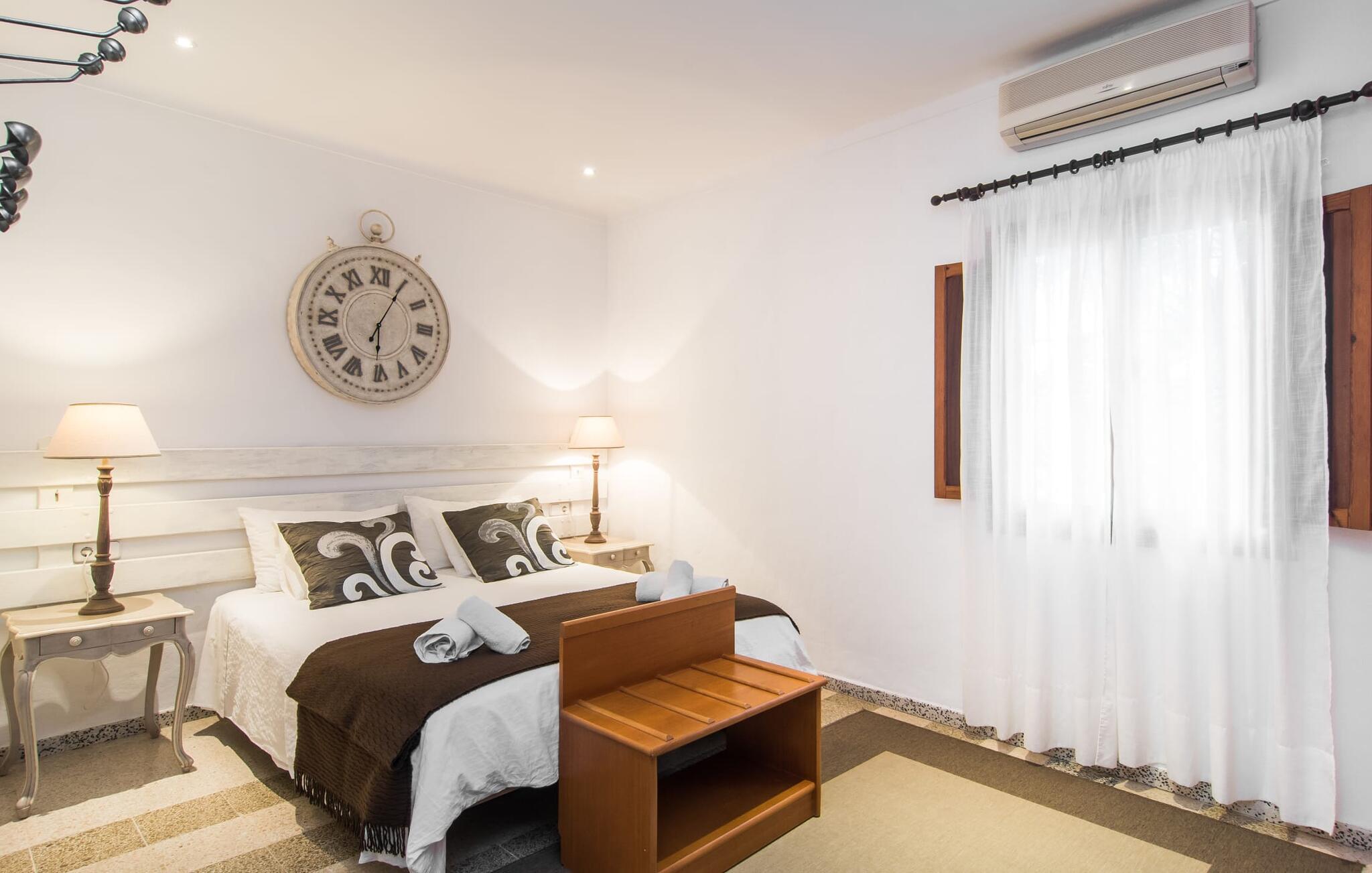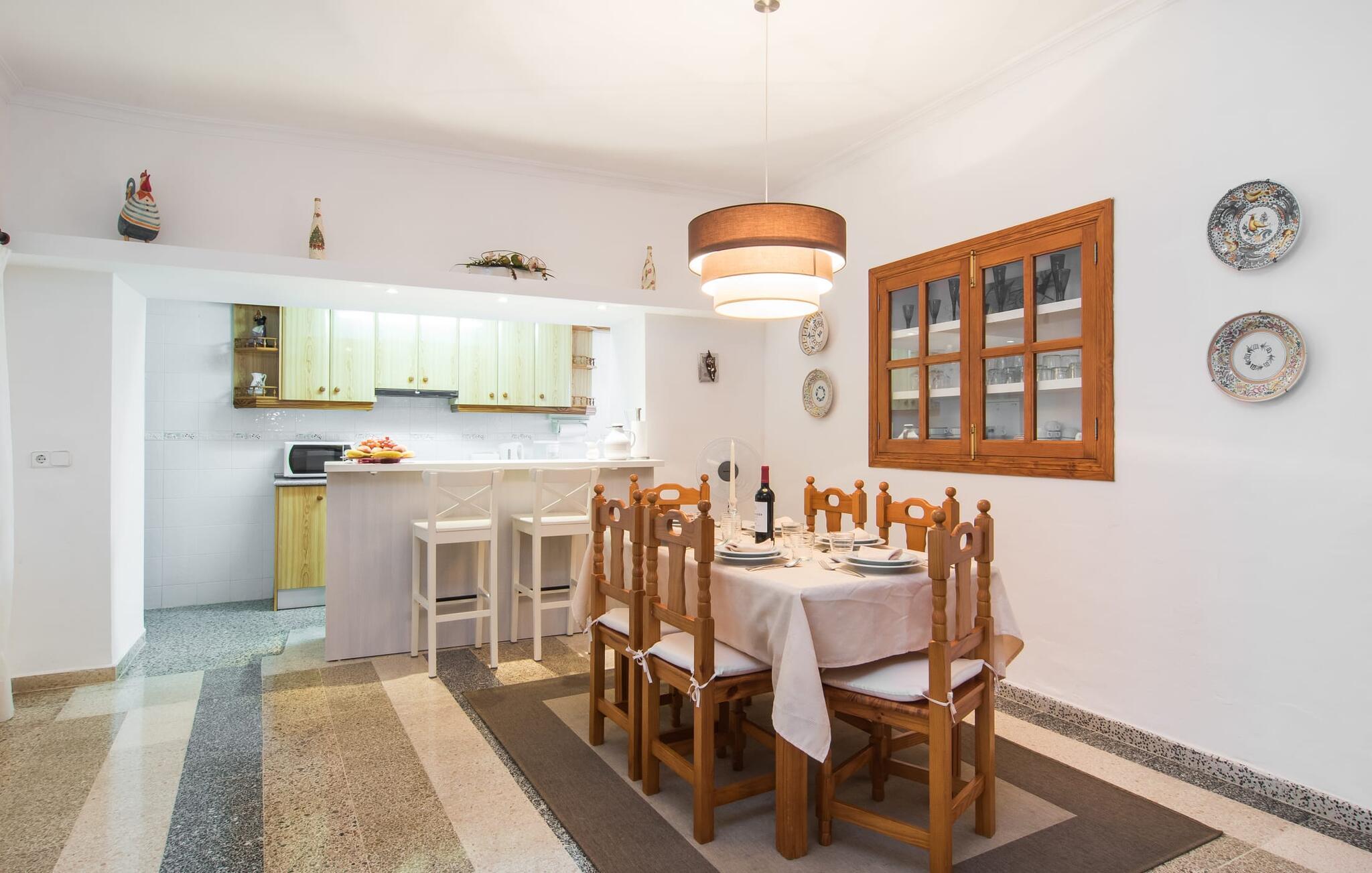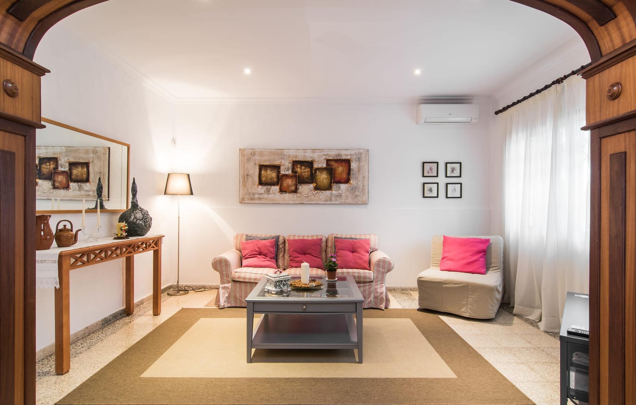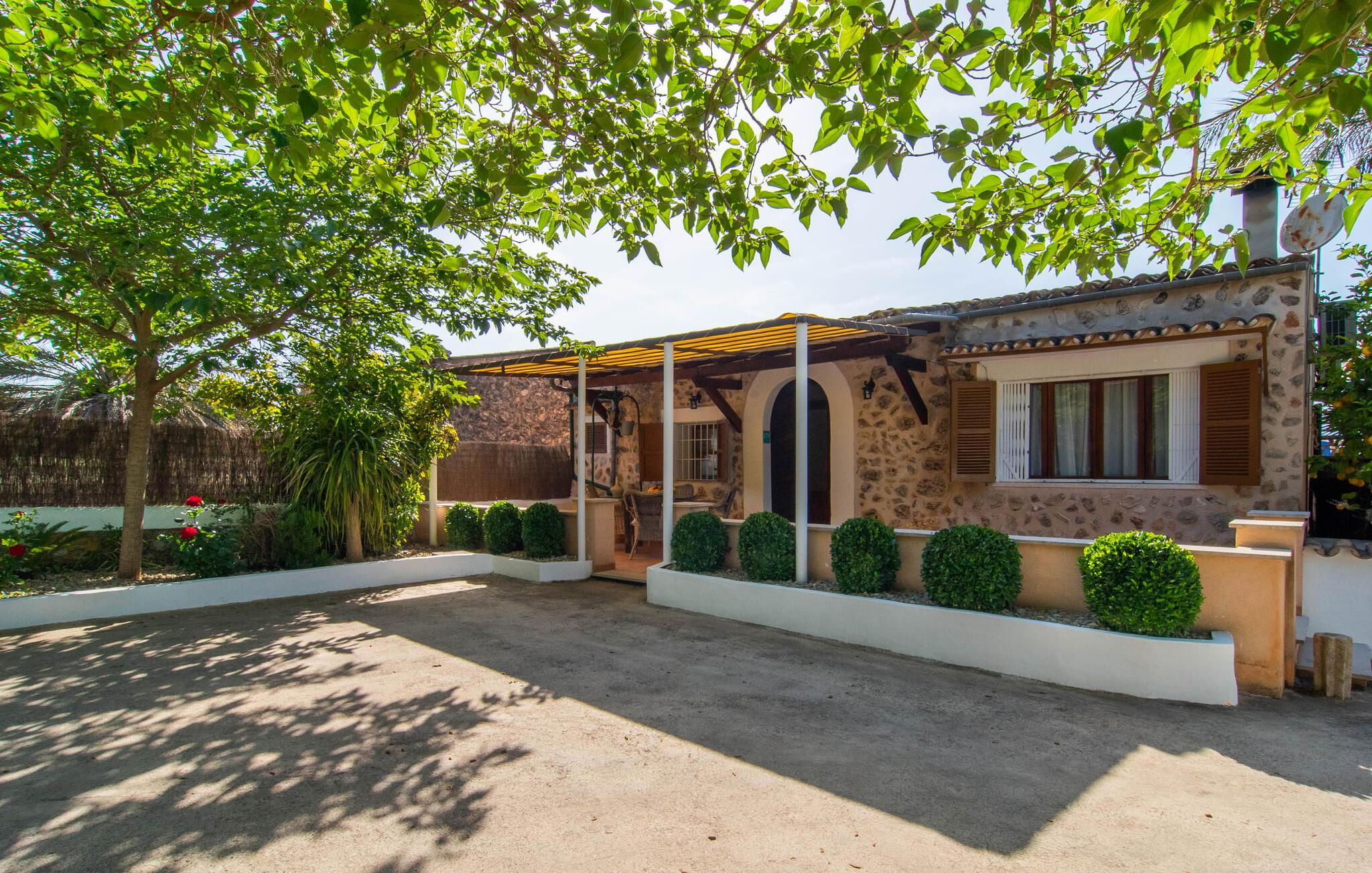 Den charmerende stenfinca "Can Tiró" ligger på en stor grund med frodige grønne områder og sin egen appelsinlund, hvor I kan høste friske, lækre tropiske frugter efter årstiden. Huset er omgivet af terrasser og en pool og tilbyder et afsondret, men ikke-isoleret tilflugtssted i hjertet af det mallorcanske landskab. Poolen, som ligger på et af terrasseniveauerne, er forsvarligt lukket med en låge, hvilket gør den ideel til familier med små børn. Fra poolen kan I nyde en betagende udsigt over den omkringliggende natur og de fjerne bjerge. Med liggestole og forskellige siddepladser er der altid et perfekt sted at slappe af i solen eller skyggen. I kan parkere jeres lejebil direkte ved indgangen. Indenfor er "Can Tiró" lige så indbydende med en nøje sammensat blanding af traditionelle og moderne elementer. Mørkt træ komplementerer lyse hvide vægge, og klinkegulve er kombineret med charmerende boligtilbehør. Alle værelser er på ét plan. Den åbne planløsning og spiseplads giver jer mulighed for at slappe af på den komfortable sofa, mens I nyder fjernsynet, med en smukt udskåret træbue, der fører til spisepladsen. Det lille, men fuldt udstyrede køkken byder på ekstra siddepladser ved den smarte disk, perfekt til en hurtig morgenmad eller et glas vin, mens I laver mad. To soveværelser og et badeværelse en suite fuldender boligarealet. Denne ejendom ligger i en smuk landlig beliggenhed i centrum af Mallorca. Byen Costitx ligger kun omkring 1,4 km væk via den akustisk mærkbare vej, og Alcúdia-bugten med dens forskellige strande er godt 26 km væk.