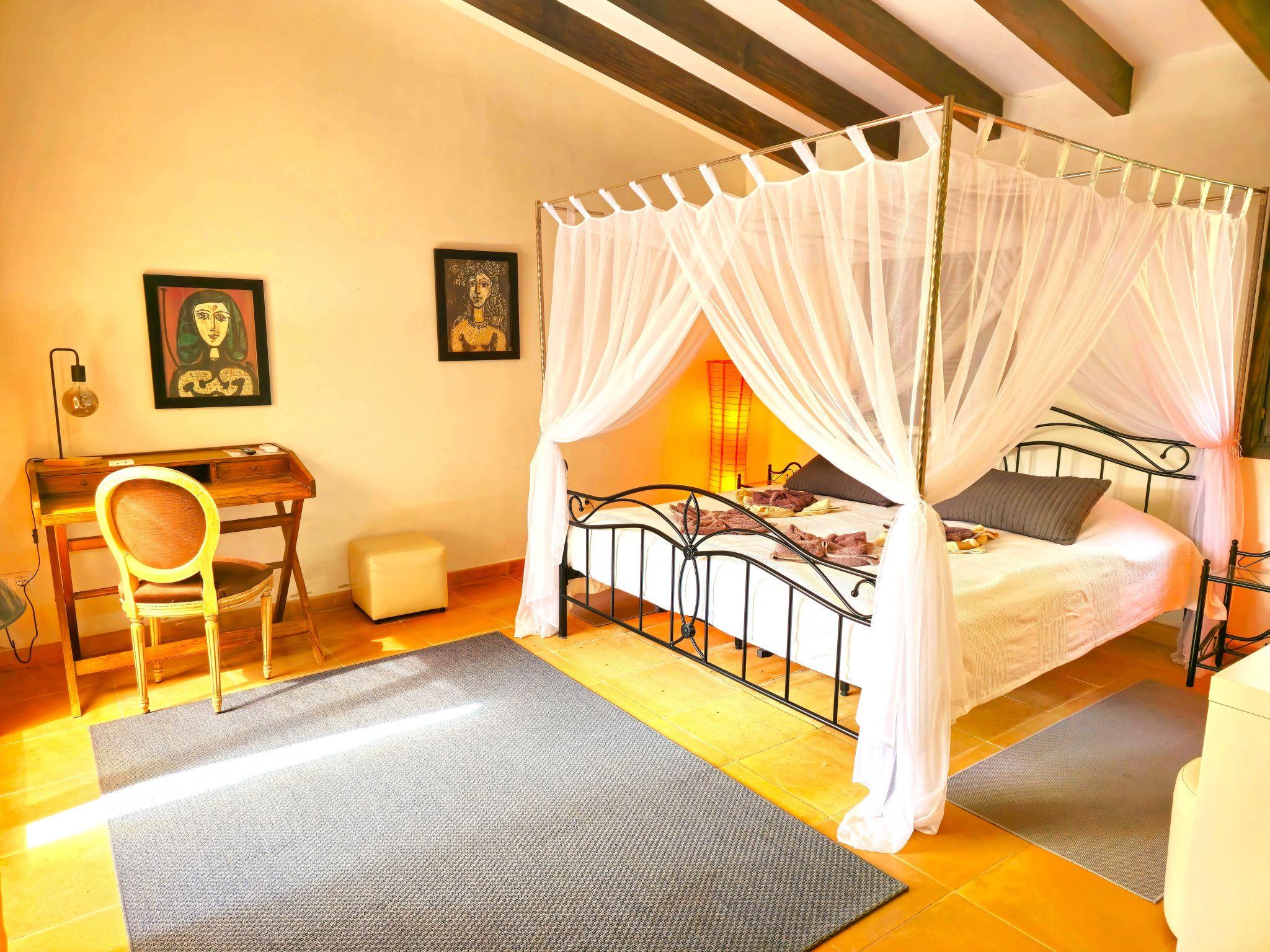 The spaciousness of the finca is perfect for anyone who wants to spend a harmonious holiday alone or with their children, with their parents or with friends. The 2 additional sun and shade terraces in the living/dining area with barbecue, electric grill, lockable patio cover and further terraces in the pool area offer plenty of space for socialising. The 8 x 4 metre pool with easy access via steps and outdoor shower invites you to take a refreshing dip. An automated pool control system ensures consistently good water quality. Depending on your preference, you can choose between sunny and shady spots on the many terrace areas and relax from the stresses of everyday life. In the hot season, the Persians protect all rooms from the sun's rays and still provide pleasant fresh air. The bedrooms are also equipped with air conditioning. The cosy open fireplace in the living/dining area and the oil central heating in all rooms ensure a comfortable atmosphere in the cooler seasons.