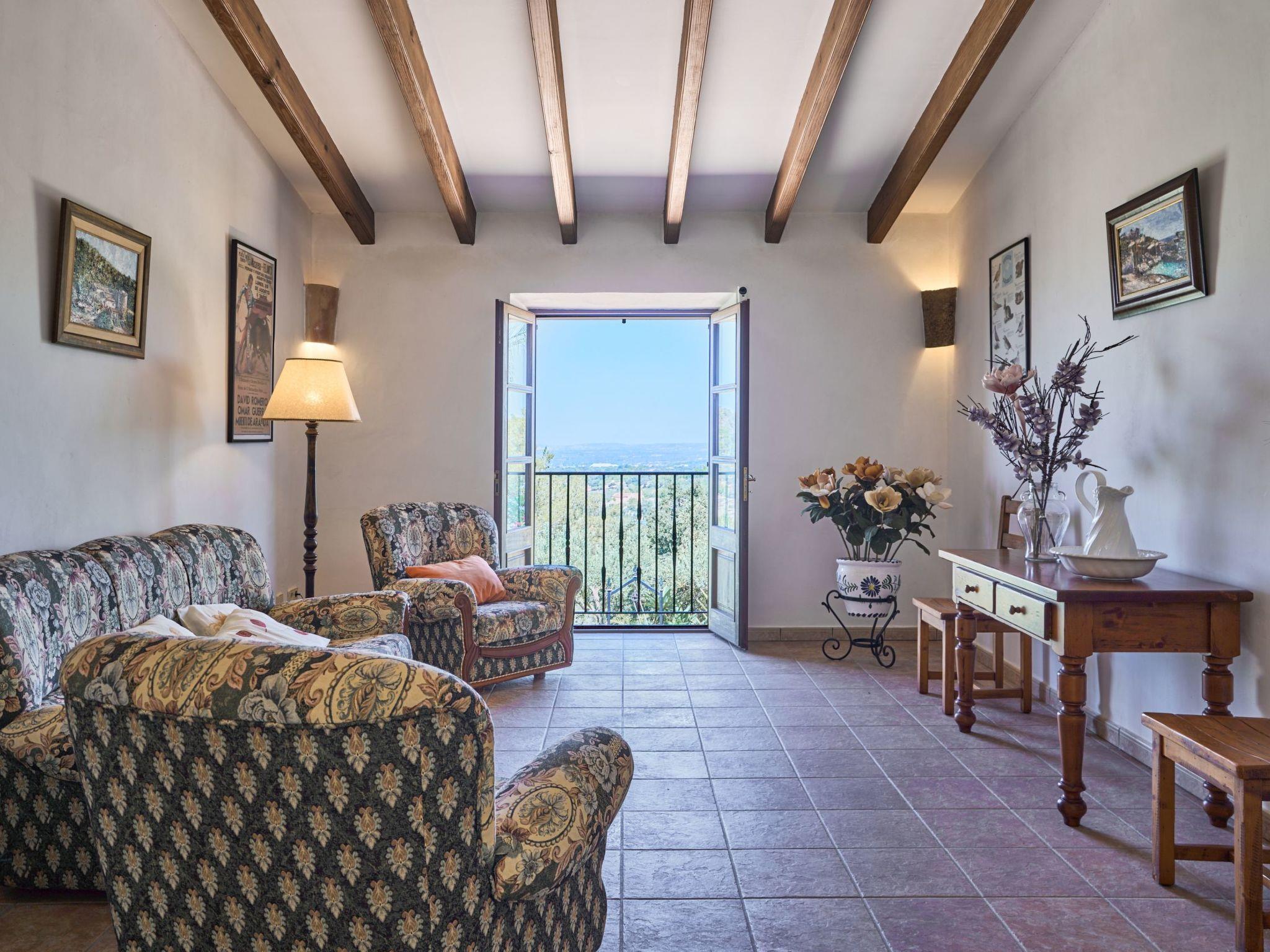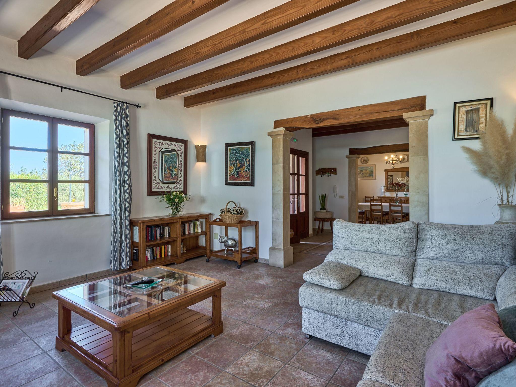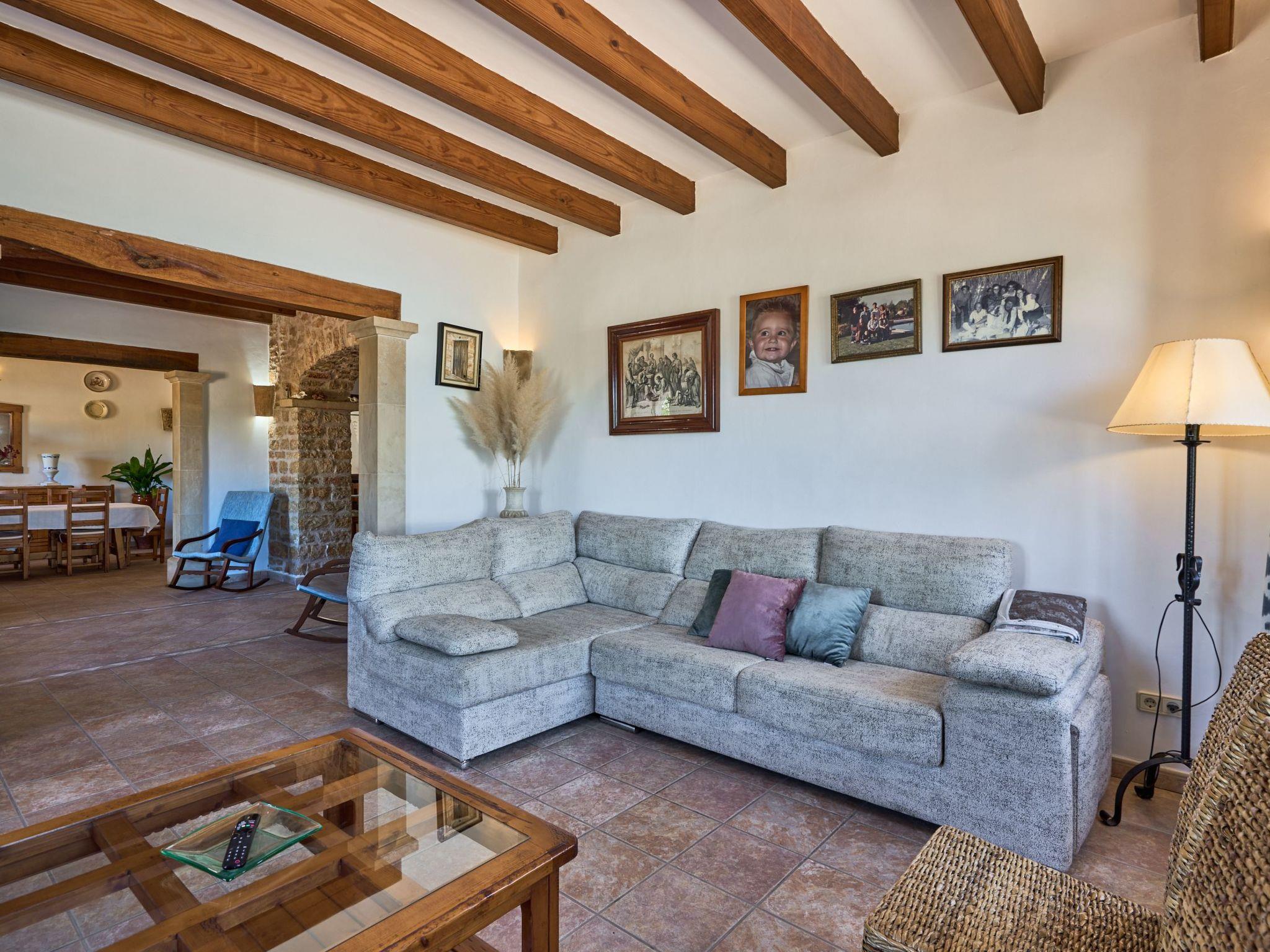 Carritxo is a spacious Mallorcan country-style house spread over two floors. The exterior is clad in natural stone. The interior has high ceilings with wooden beams.