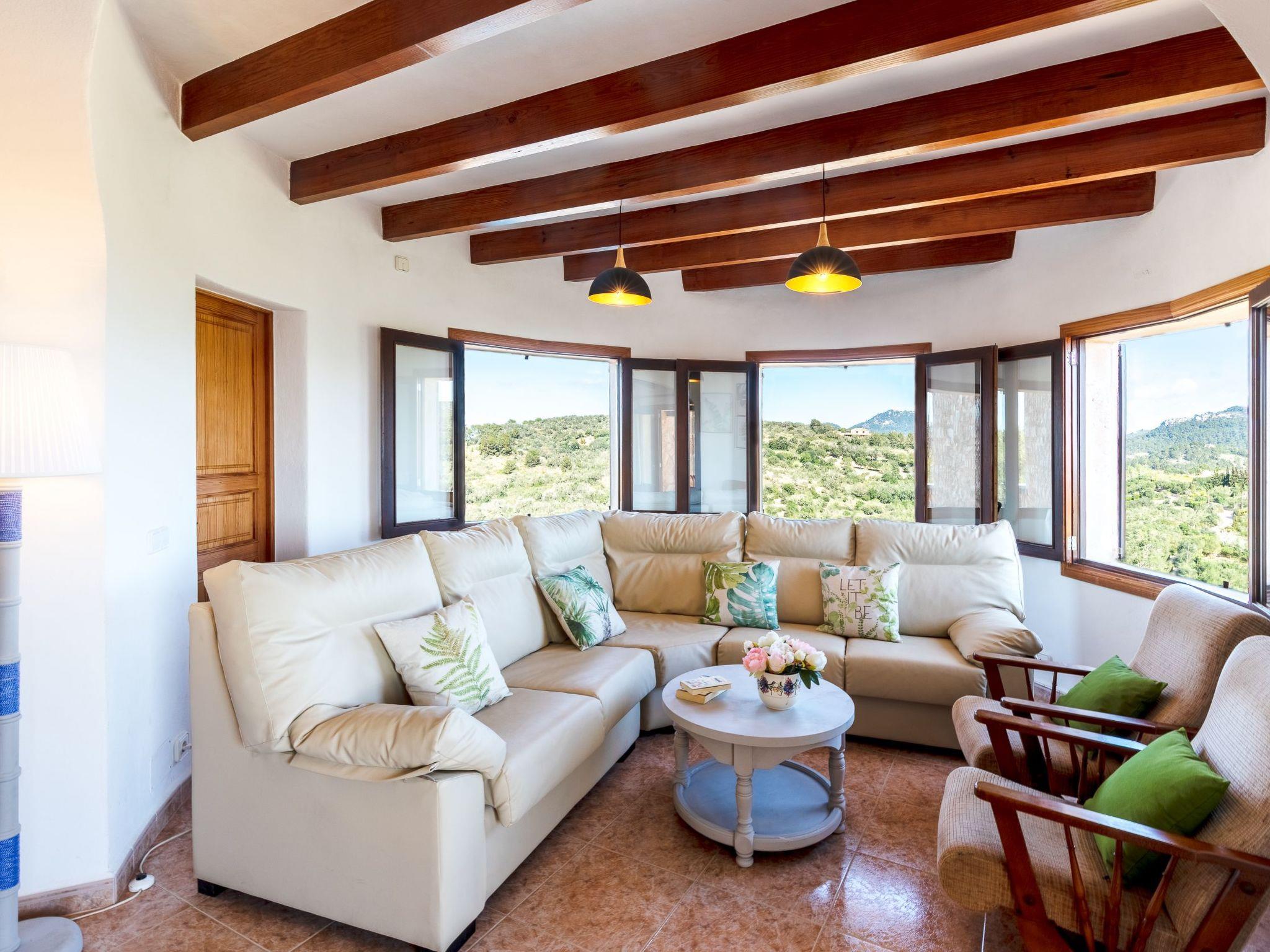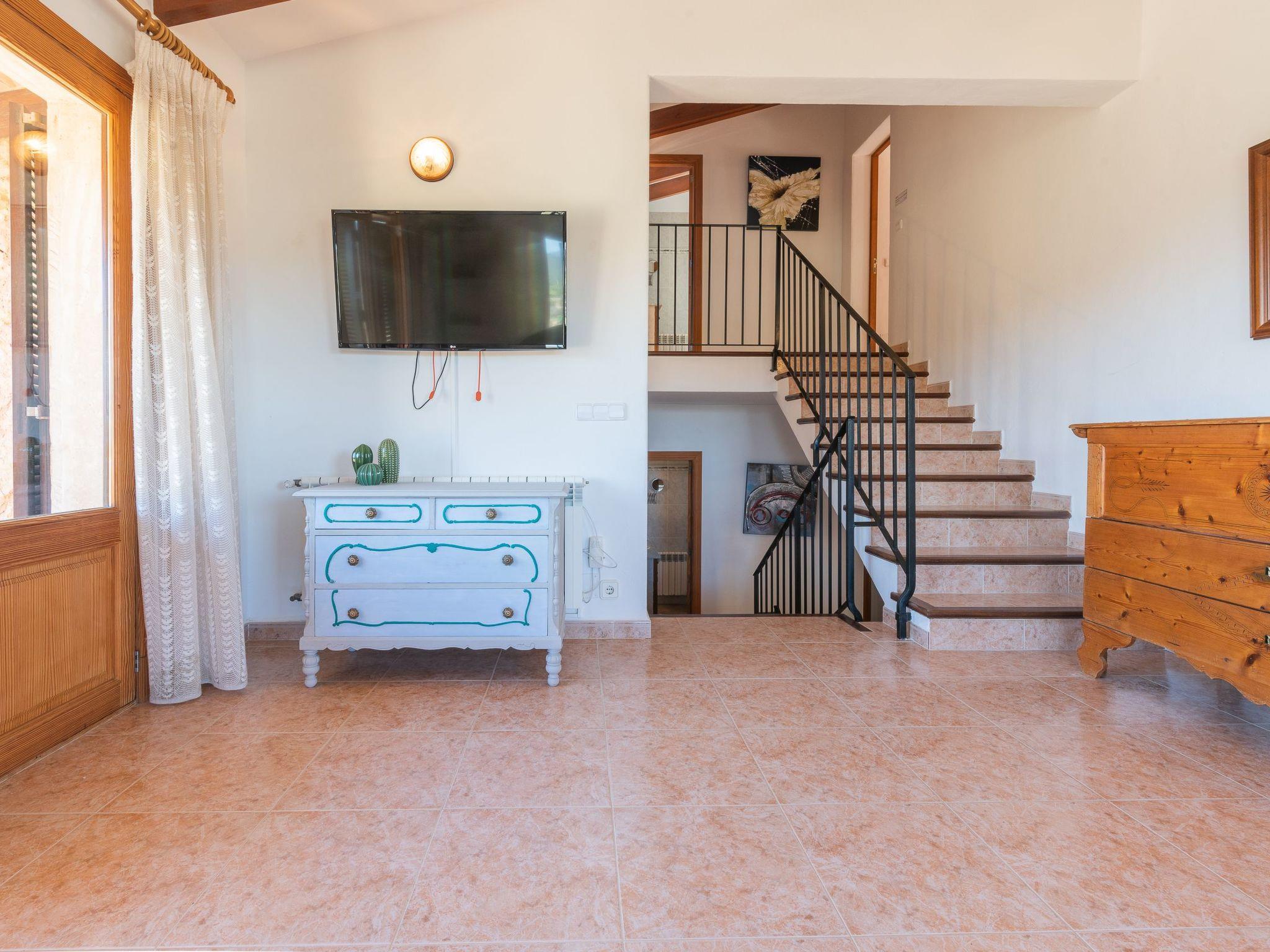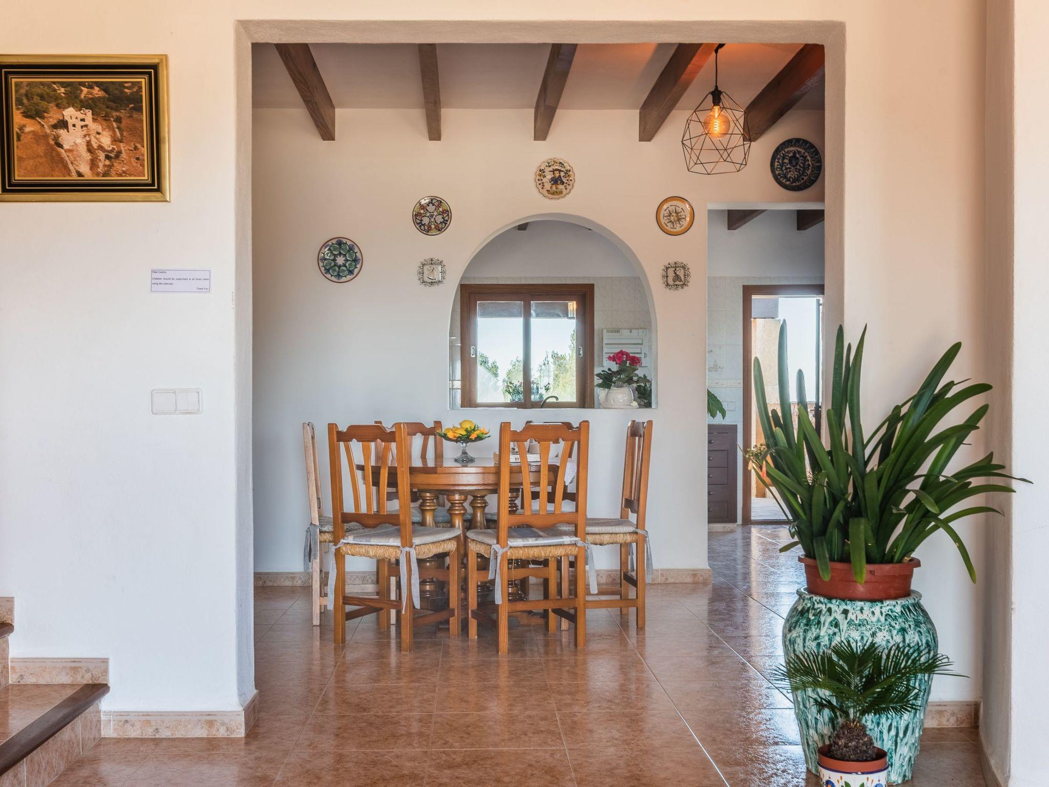 Roca is a beautiful holiday finca with a side tower. The house, whose exterior walls are clad in natural stone, is divided into three levels. On the ground floor there is a hallway with open passageways to 2 dining areas, one with a fireplace, the other with an archway to the spacious kitchen, which is well equipped and has direct access to the covered terrace with dining table. This floor has a shower room and a utility room with washing machine. A staircase leads to the first floor, where there are two bedrooms. One bedroom with a single bed with a small, covered terrace with views of the surrounding area and a second bedroom with a double bed and balcony with beautiful views can be found here. These bedrooms share a bathroom. From here a few steps lead up to the middle floor where there is a twin bedroom with a small balcony overlooking the central plain of Mallorca. The lounge is in the tower and has glass doors that give access to the lovely terrace with views of the surrounding area with the coast in the distance. A few steps lead to the top floor where there is a double bedroom, a separate bathroom with shower and a terrace with marvellous views.
