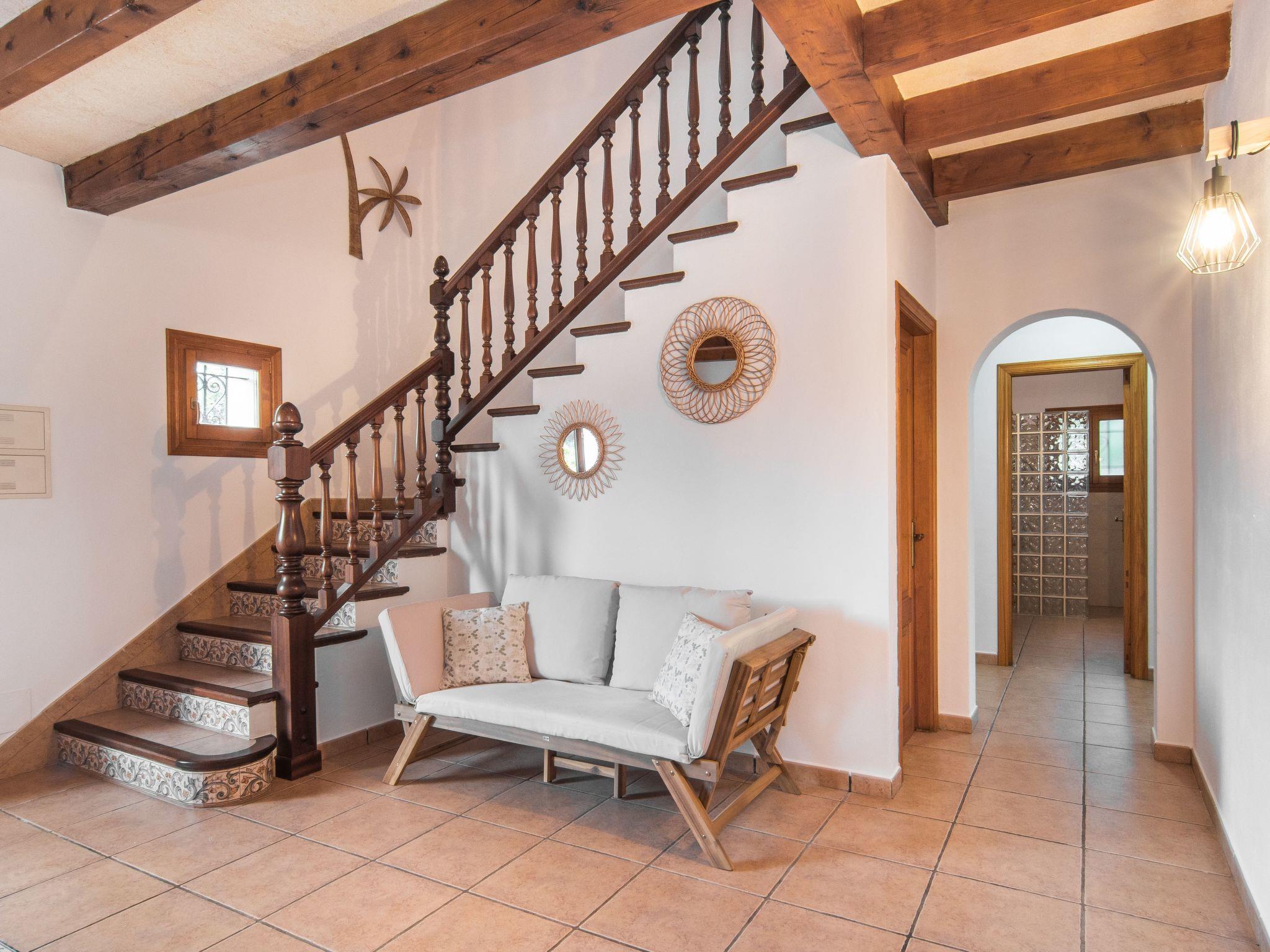 The Peris house is an attractive Mallorcan-style country house with large rooms. The terraces invite you to relax and enjoy the marvellous views over the countryside. From the entrance area there is access to a cosy living/dining area with comfortable sofas, a fireplace and a large wooden table for 10 people. From here you also have access to the covered terrace with dining area and the large kitchen, which has a pantry and a breakfast nook. Next to the dining area is a bedroom with two single beds and a shower room, which also has a washing machine and tumble dryer. On the other side of the living room there are two further bedrooms, one with two single beds and one with a double bed and access to the terrace with views over the countryside. These two bedrooms share a bathroom. From the entrance area, steps lead to the upper floor with two further bedrooms, one with a double bed and en suite bathroom, the other with two single beds and en suite bathroom. Both bedrooms share a terrace with views of the garden and pool area as well as the mountains in the distance.