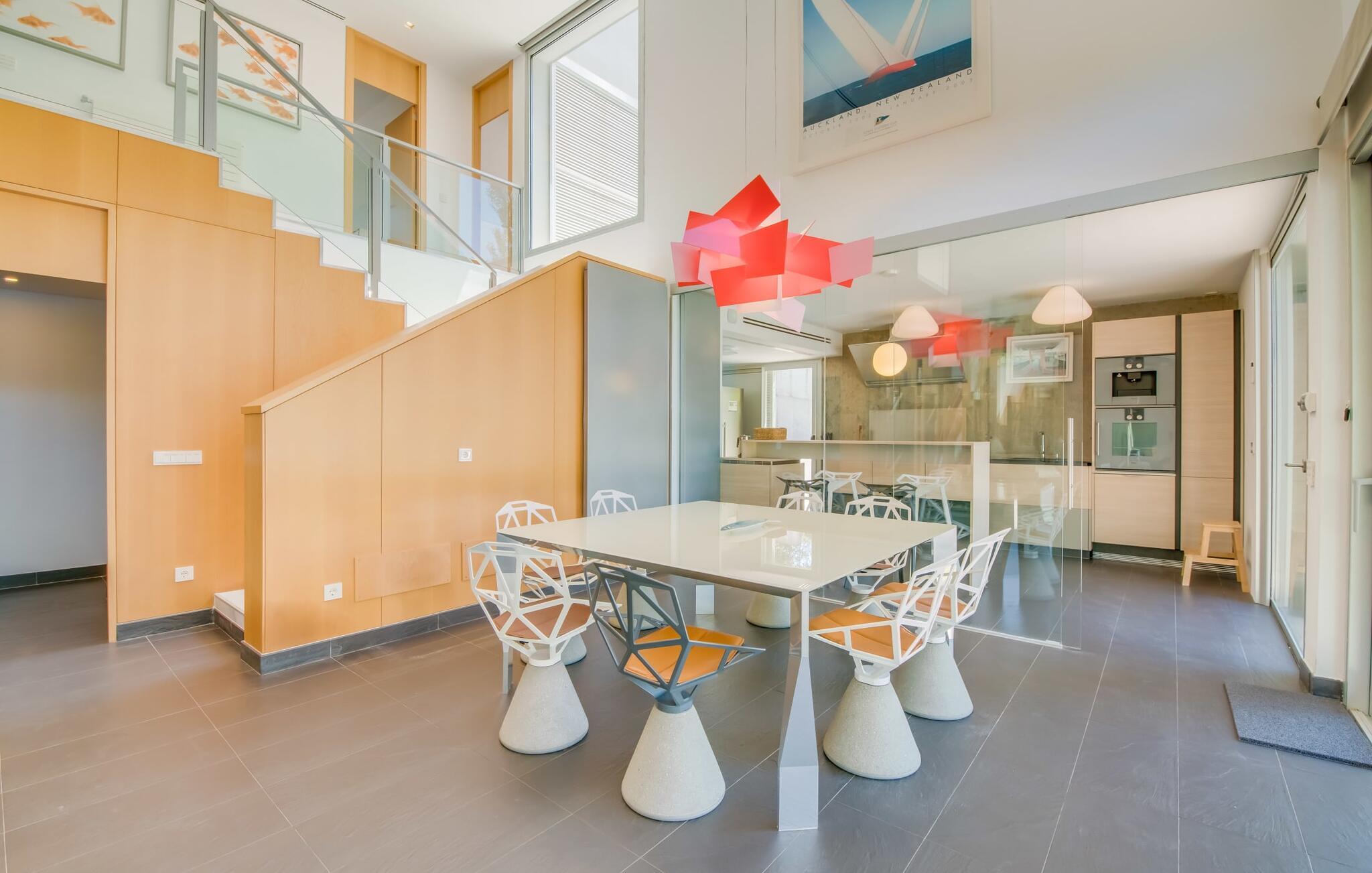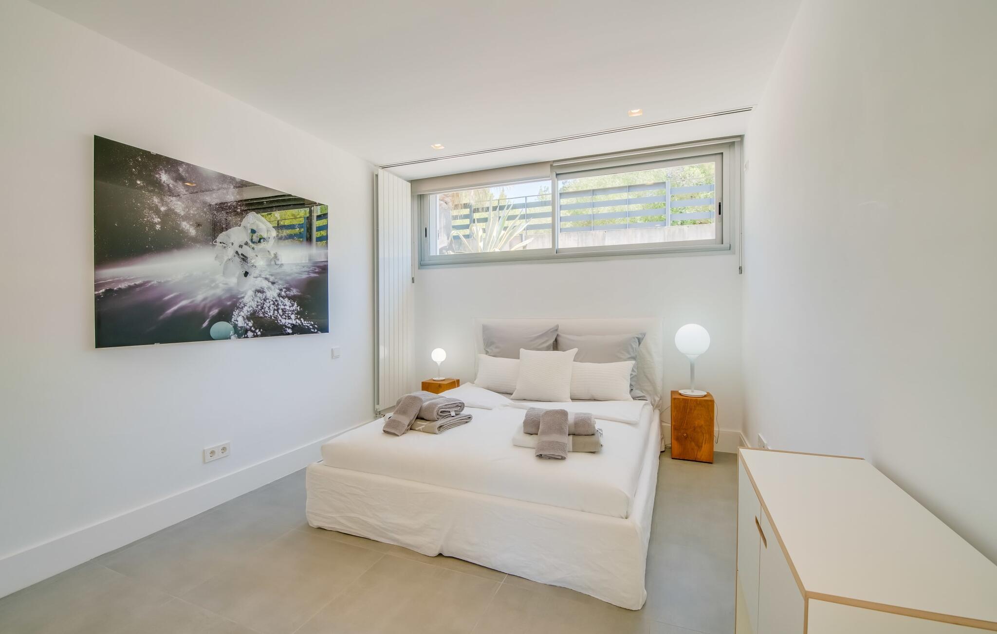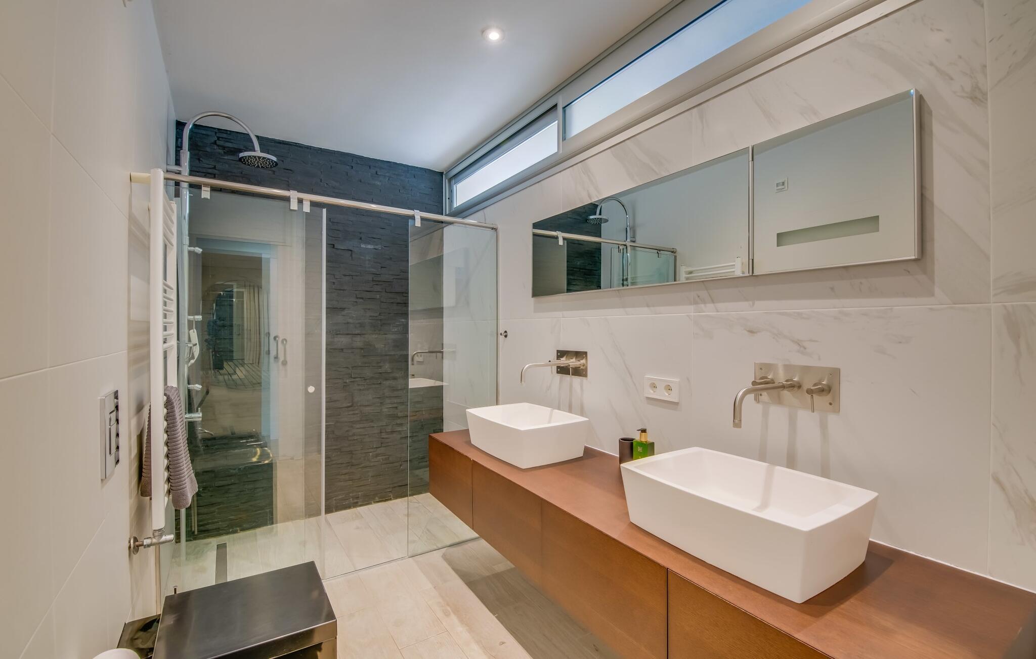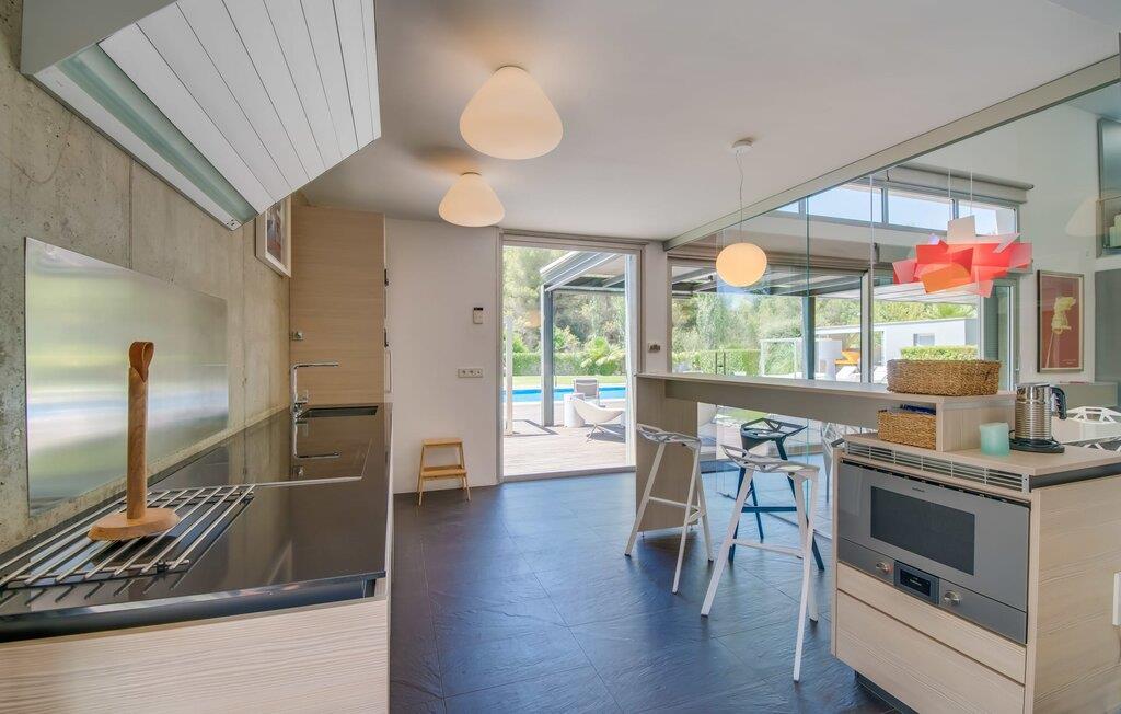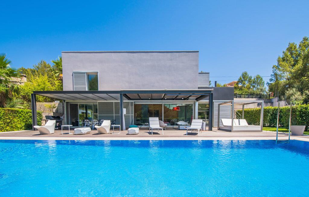 Hvis I elsker puristisk modernitet, har sans for godt design og værdsætter det i hverdagen - så bør I helt sikkert kigge nærmere på stuehuset "Casa Croc". Det mørkegrå, kubiske feriehus har en førsteklasses beliggenhed i en urbanisering i den vestlige del af Mallorca mellem Sóller og Palma. På grund af sin nærhed til Tramuntana-bjergene, nyder boligen godt af en lille hældning - hvilket bringer en utrolig mængde grønt, mægtige stenge og den typiske vegetation i de mallorcanske bjerge med sig. Et spektakulært, men børnevenligt udendørsområde med flere sportsfaciliteter, en fantastisk pool og talrige terrasser byder på dejlige dage året rundt. Udover varmtvandsudendørsbruseren er der et ekstra gæstetoilet. Den ligger lige ved siden af det smarte udekøkken med en kølig pizzaovn. Så I kan simpelthen tilbringe dagene helt udendørs, slappe af i de afslappede udendørsmøbler, dyrke sport (hvilket også er muligt i fitnessrummet i stueetagen af stuehuset), fremtrylle en lækker BBQ på den professionelle gasgrill eller slappe af mellem anerkendte restauranter Design og bordpejs. Rigdommen af valg symboliserer jeres personlige frihed. Hvad der også er overbevisende ved “Casa Croc” er den absolut harmoniske design og arkitektoniske linje, som også er dokumenteret i indretningen. Ned til mindste detalje. Fra dekorative genstande til møblerne i den åbne stue og spisestue til Gaggenau-køkkenet adskilt af en glasrude - alt er af absolut høj kvalitet og tro mod den innovative designlinje. Det fuldt udstyrede køkken af høj kvalitet vil få enhver passioneret (amatør)koks hjerte til at banke hurtigere. Farver spiller en stor rolle i designet, uden at få interiøret til at fremstå for farverigt, men derimod behageligt livligt og ekstremt muntert. Så I vil ikke opleve sanseoverbelastning, bare et fantastisk feriehus med mallorcanske rødder, der fremstår absolut afbalanceret. Det gælder selvfølgelig også de fire fantastiske, klimatiserede soveværelser og de tre individuelle indendørs badeværelser med bruseniche eller fritstående badekar. Den afslappede atmosfære smitter af og giver jer mulighed for at nyde en førsteklasses ferie med en anden familie eller venner - op til otte (voksne) personer i alt - med en eksklusiv følelse af designraffinement og en topplacering. Intet mere er muligt! Det udtryksfulde bondehus "Casa Croc" beviser, at design og familievenlighed ikke behøver at være en selvmodsigelse. Det varierede udeareal med pool, terrasser, udekøkken og badeværelse er på trods af sin beliggenhed i en urbanisation med udelukkende beboelsestrafik behageligt privat. For at shoppe kan I tage til den bakkede bjerglandsby Bunyola. Mellem bjergene og havet kan I nyde nærheden til øens hovedstad Palma og derfor også til vestkystens strande som Passeig del Molinar. Begge er omkring 25 minutter væk i bil.