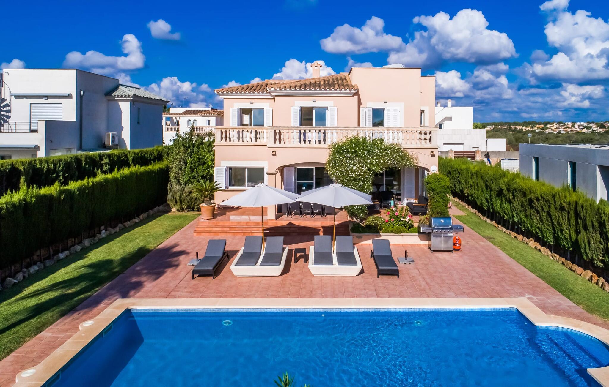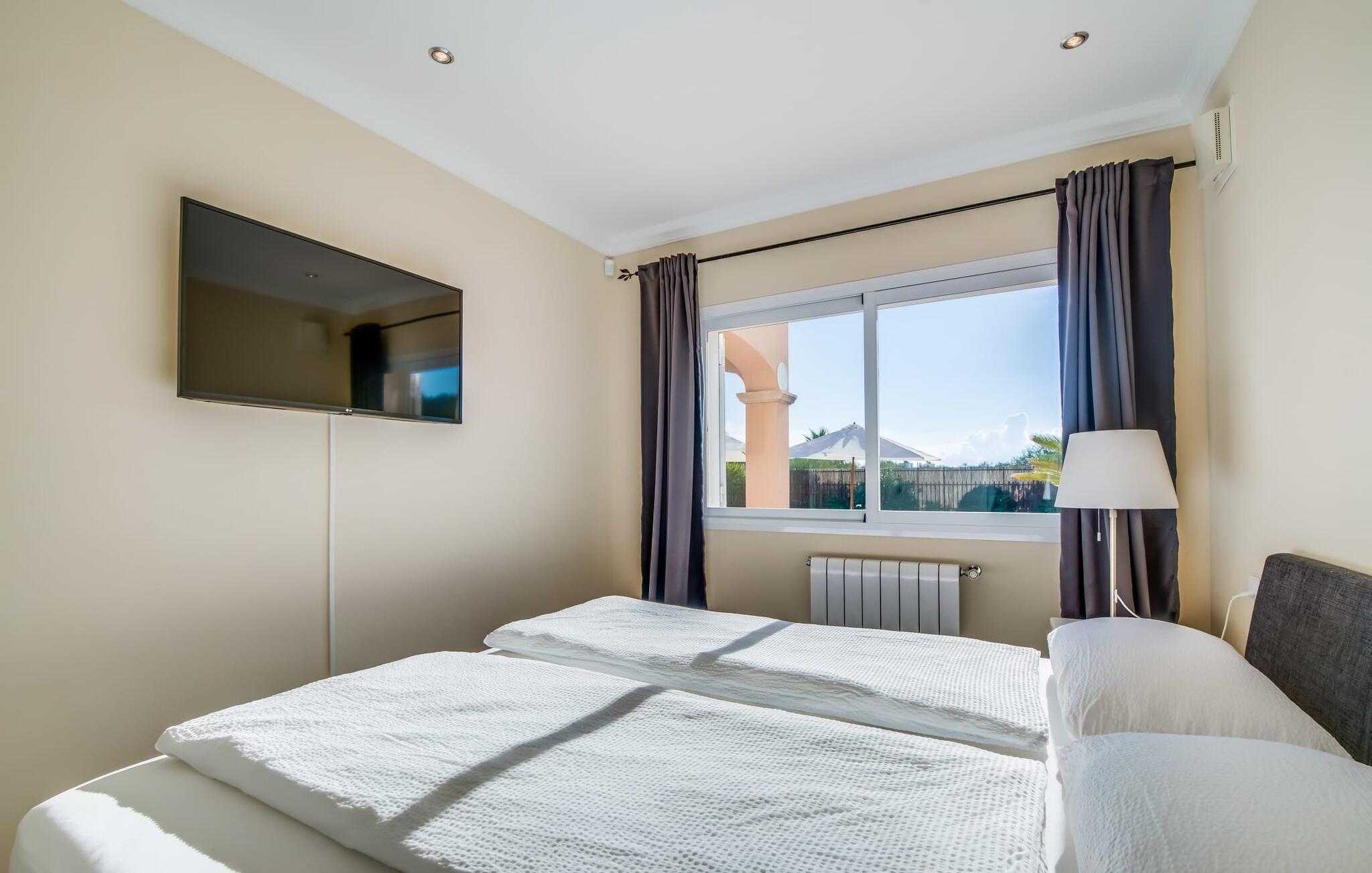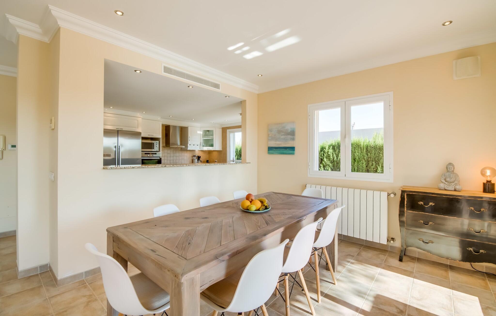 Udkanten af landsbyen. Tæt på stranden. Pool. Tre ønsker, der står øverst på nogle feriegæsters ønskeliste. En sydlig eksponering, god infrastruktur og et nutidigt, moderne design står også på nogle ønskelister. Villaen "Casa Estela" har ingen problemer med nogen af disse punkter - tværtimod rummer den dem alle uden problemer! Haven, omgivet af kvarteret og alligevel helt privat, byder med sin velholdte atmosfære på yderst attraktive rammer for længerevarende ophold under den mallorcanske himmel. Superkomfortable liggestole og daybeds inviterer jer til at tilbringe et par timer mere udenfor og få mest muligt ud af jeres fritid. Hvis det bliver for varmt, vil poolen dekoreret med blå mosaiksten køle jer ned, og I kan nemt glide ned i vandet via de romerske trappetrin. Den praktiske udendørsbruser kan også bruges til kortvarig afkøling. På verandaen kan I sidde med stil enten i den smarte lounge eller ved spisebordet, hvor morgenmaden med garanti vil være lækker og I også kan nyde en kulinarisk grillaften. I er endnu tættere på himlen på altanen og tagterrassen. Fra verandaen er der adgang til husets indre gennem flere gulv-til-loft vinduer, som lukker masser af middelhavslys ind. En stor stue-spisestue imponerer med sin rummelighed og omhyggeligt og harmonisk afstemte møbler, som effektivt suppleres af dekorative individuelle stykker. Køkkenet, som i øvrigt er rummeligt, er halvåbent med en luge og har naturligvis alt hvad I skal bruge til komplet selvforplejning. Det omfattende udstyr inkluderer endda et vinkøleskab! På denne stueplan er der også et hyggeligt soveværelse med dobbeltseng og et badeværelse. Yderligere to soveværelser, hvoraf det ene er perfekt til ledsagende børn, er placeret ovenpå med udgang til altan og tagterrasse, samt et andet badeværelse. Den smukke villa “Casa Estela” ligger på en velholdt grund på næsten 800 m², ikke langt fra havnen og havet på Mallorcas sydkyst. I bor her i udkanten, i en blind vej, og kan hurtigt nå flere skønne strande, herunder Platja de Sa Rapita eller Racó de s'Arena. Butikker og restauranter ligger inden for gåafstand. Den lille by Campos er omkring 15 minutter væk i bil. Der vil I finde et bageri og andre supermarkeder. Bemærk venligst, at denne ejendom ikke accepterer ungdomsgrupper eller polterabender. En ungdomsgruppe på denne ejendom består af personer under 30 år. Book ikke denne ejendom, hvis I er en ungdomsgruppe eller polterabend, da jeres reservation vil blive afvist, når den er booket, hvilket også kan være tilfældet ved ankomst til ejendommen eller under jeres ophold, og I vil ikke modtage en refusion. El, aircondition og varme er inkluderet i lejeprisen, hvis forbruget er rimeligt. I sjældne tilfælde vil I blive opkrævet gebyret kontant på stedet.
