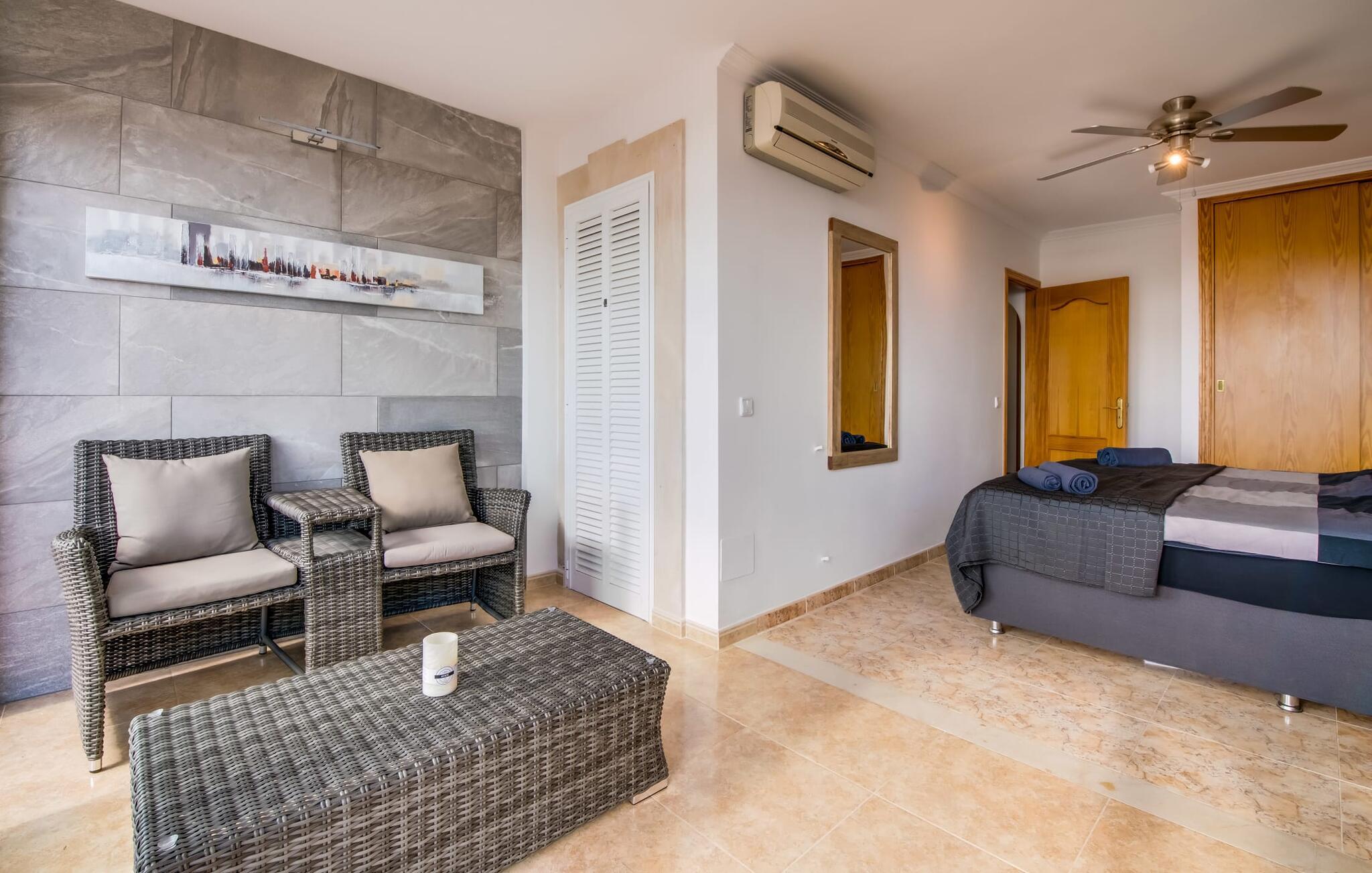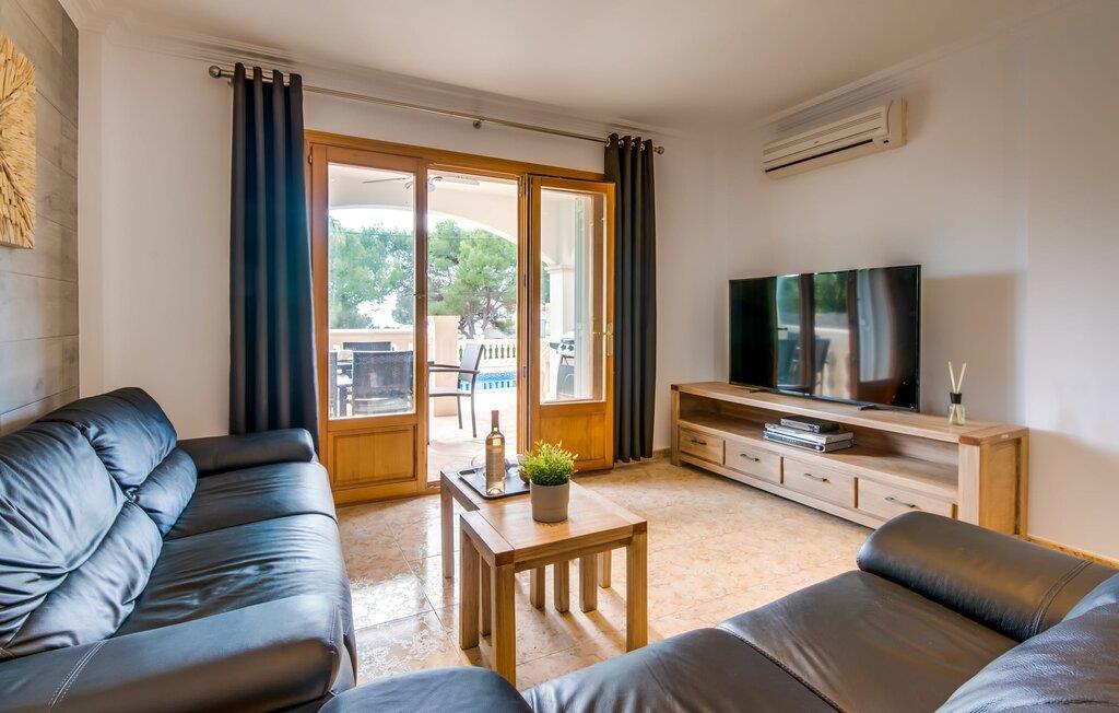 Den stilfulde villa "Casa Habana" kombinerer luksus med en afslappet, munter atmosfære. Beliggende blandt palmer og en naturstenterrasse har villaen smarte liggestole, en parasol og en fælles pool med mosaikfliser, som deles med naboen "Casa Cuba" (EMI110), perfekt til en ferie med venner eller familie. Nyd måltider på den overdækkede terrasse med havudsigt eller lav mad på gasgrillen. En rummelig balkon og tagterrasse giver yderligere steder at slappe af og nyde omgivelserne. Indenfor byder den åbne stue og spisestue på moderne komfort. Der er to dobbeltværelser med aircondition med adgang til tagterrassen på første sal og et med to enkeltsenge i stueetagen. To flisebadeværelser sikrer komfort, mens det fuldt udstyrede køkken byder på alt hvad I behøver til selvforplejning. Villaen er perfekt til at nyde øens charme. Havudsigtsvillaen "Casa Habana" ligger to gader væk fra de fænomenale klipper i den dejlige kystby Cala Pi. Denne velholdte urbanisering giver jer mulighed for at tilbringe skønne timer på lange gåture langs den imponerende kystregion. I kan gøre jeres indkøb i de omkringliggende byer på den sydlige del af øen. Den børnevenlige badebugt Cala Pi ligger kun 2 km væk.