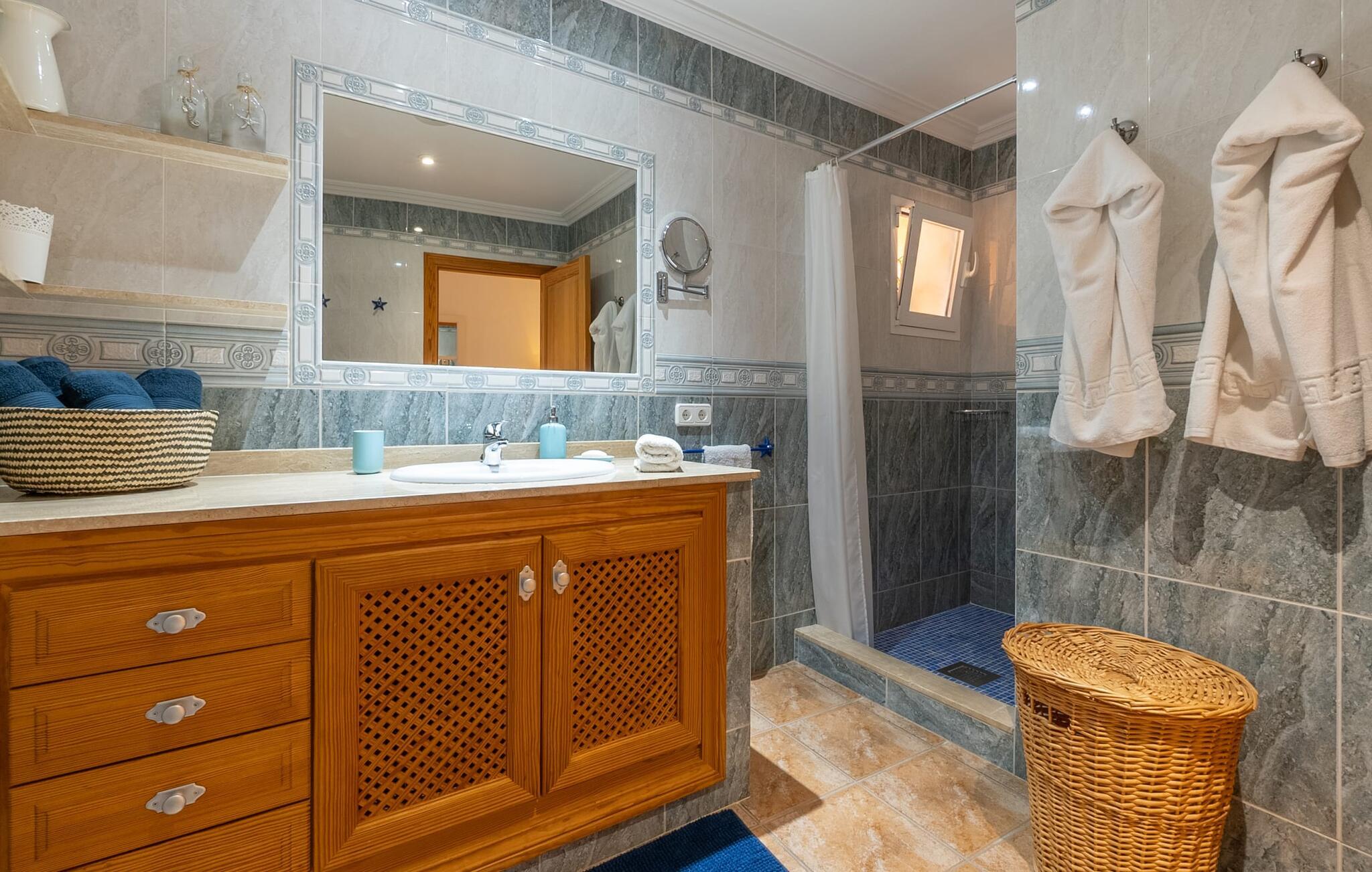 Det indre af huset er lyst og behageligt. Der er hyggelig stue med spiseplads, rummeligt, moderne køkken med yderligere spiseplads, badeværelse med bruseniche, bryggers og fire skønne dobbeltværelser. En af dem har eget badeværelse med badekar. Alle soveområder er udstyret med aircondition.