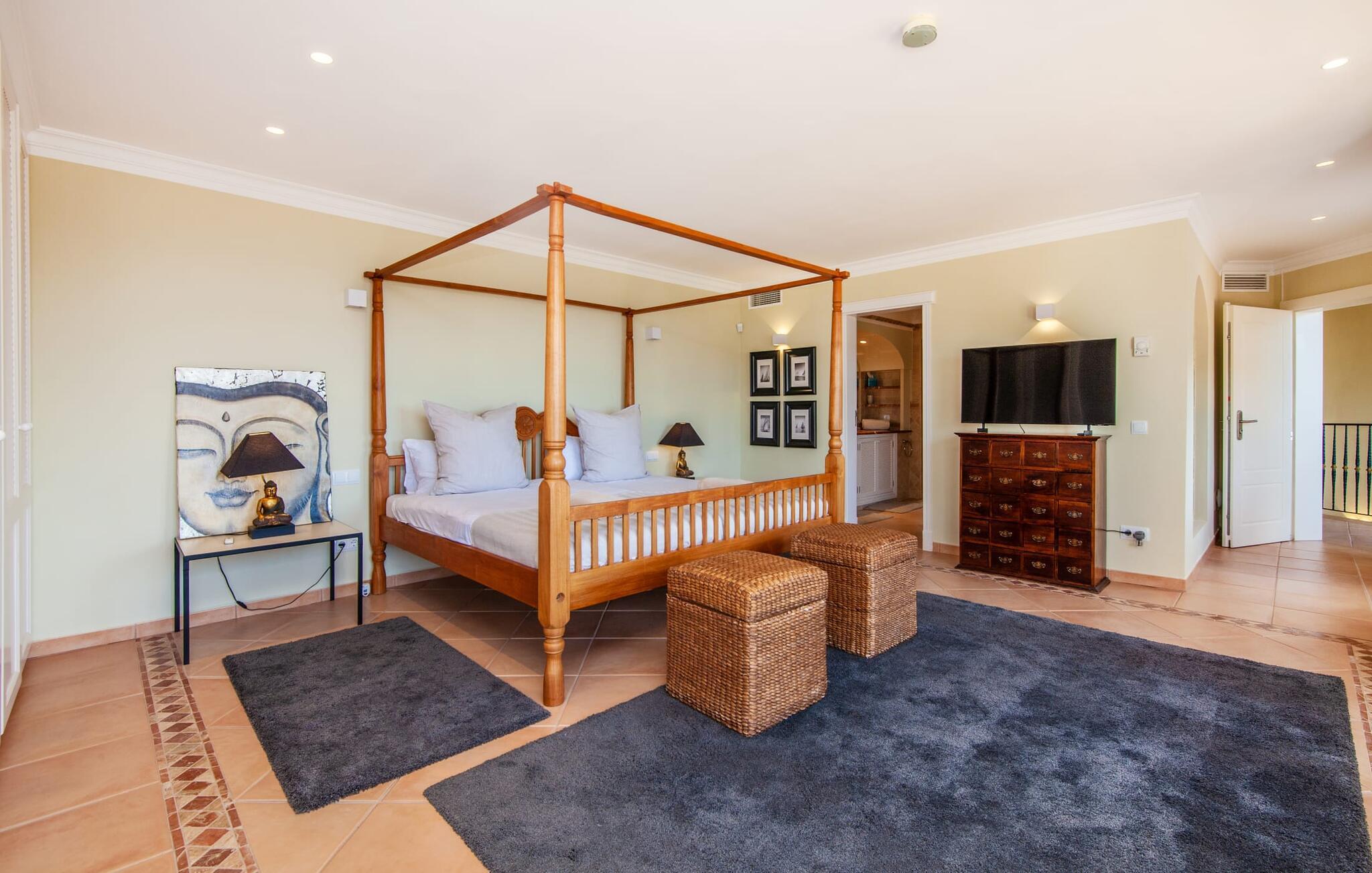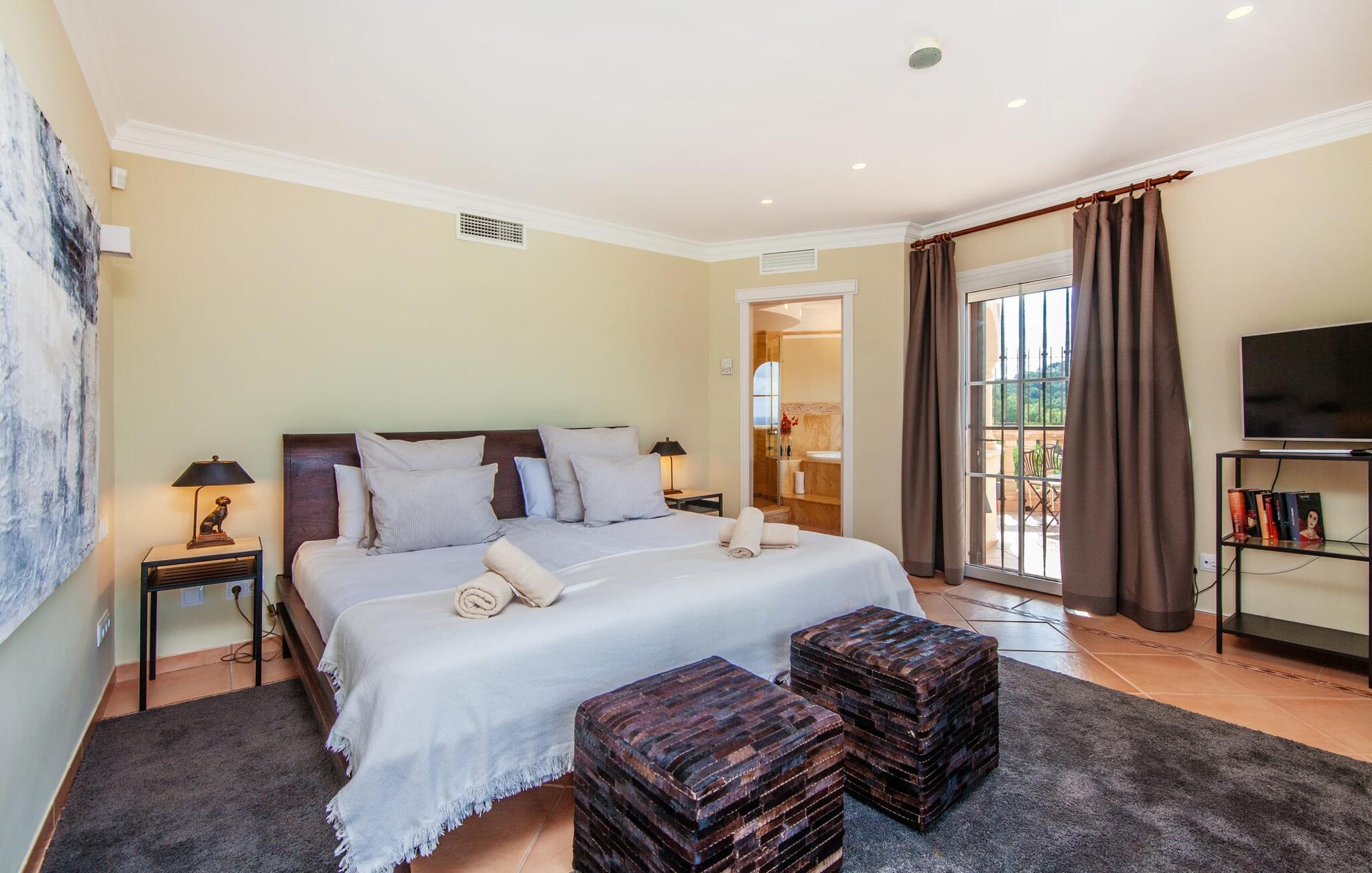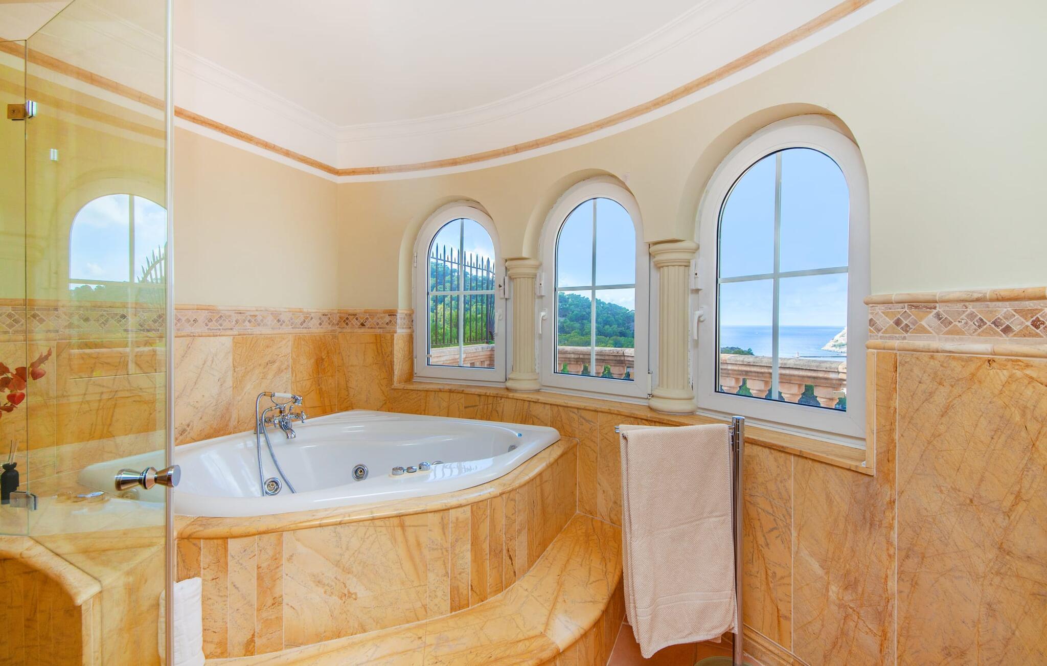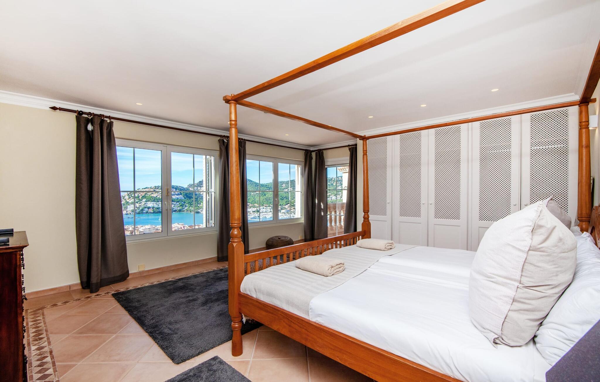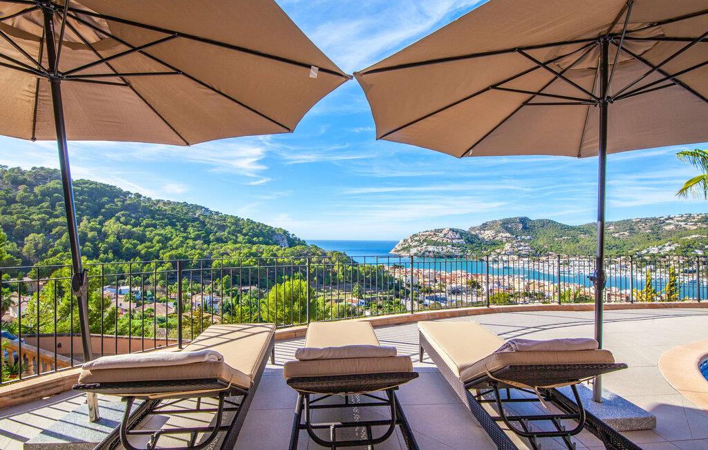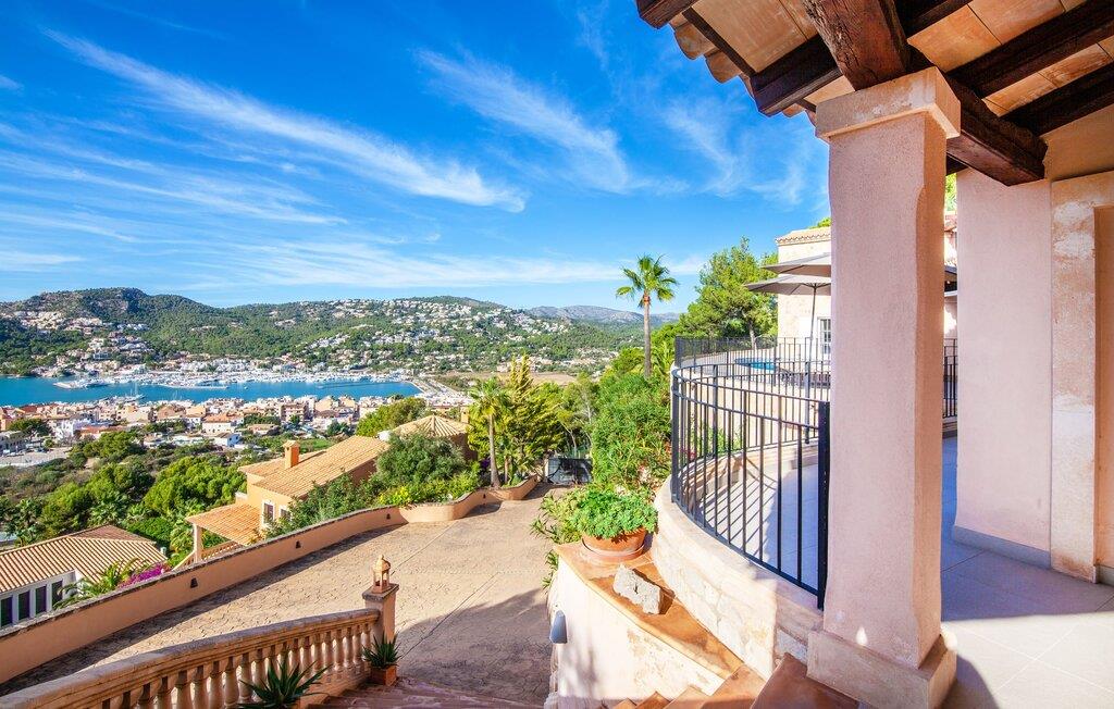 Indenfor er den usædvanligt elegante villa meget rummelig, hvilket sikrer en høj grad af privatliv, selv når den er fuldt besat. Behageligt naturligt lys strømmer ind gennem de delvist gulv-til-loft-vinduer, mens den smukke panoramaudsigt også kan nydes indefra. Elegante møbler, søjler, naturstenselementer, effektiv belysning og kunstneriske dekorationer skaber en usædvanlig stilfuld atmosfære. Huset strækker sig over to etager. Stueetagen består af et stort køkken med en tilstødende spiseplads og en stue, hvor pejsen tjener et rent dekorativt formål. Et soveværelse med dobbeltseng og eget badeværelse er også placeret på denne etage. Ovenpå er der fire rummelige soveværelser, hver med eget badeværelse. Nyd øjeblikke med ren afslapning i spabadet ved vinduet. Huset har også et fitnessrum med spinningcykel, træningsstation, frie vægte og et yogaområde. Denne luksusvilla er udstyret med aircondition og gulvvarme, hvilket sikrer en komfortabel bolig året rundt. Den luksuriøse "Casa Iris" ligger i udkanten af ??et boligområde over Port d'Andratx på Mallorca. Her finder I en fantastisk udsigt over bugtens imponerende havn samt de omkringliggende bjerge. Indkøb kan foretages direkte i landsbyen eller i Andratx, cirka 6 km væk. Smukke bugter og andre strande ligger kun en kort køretur væk.