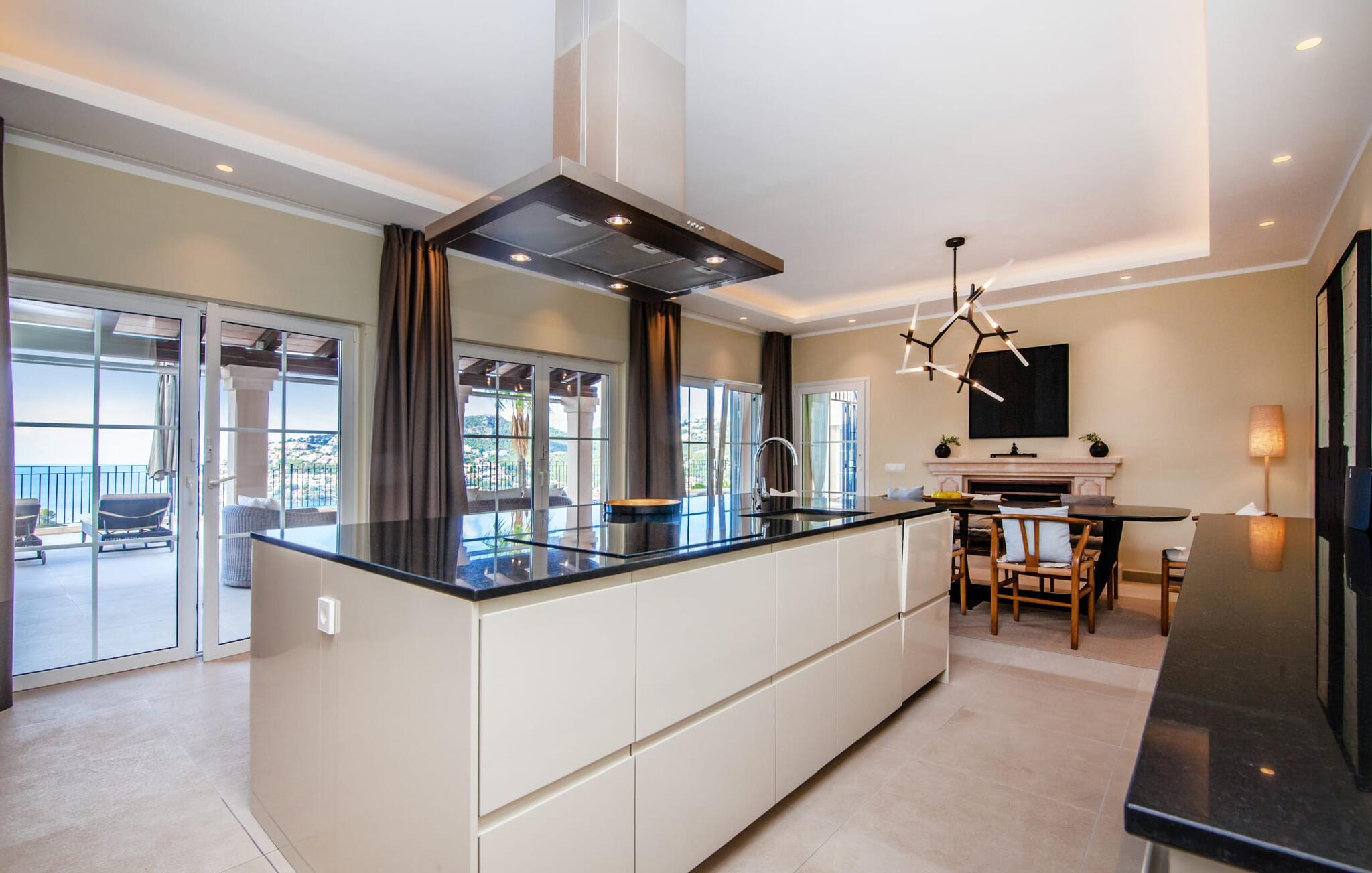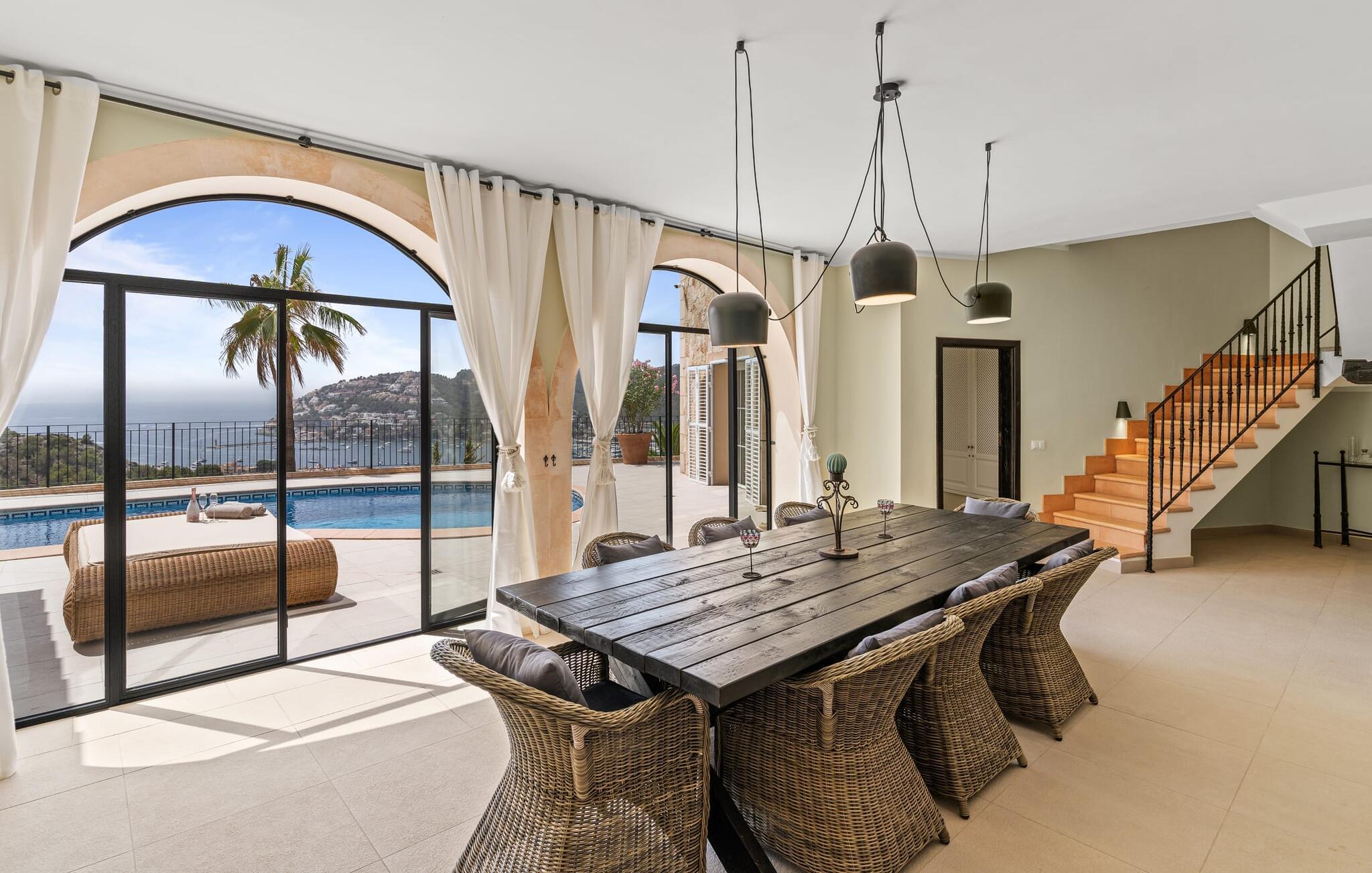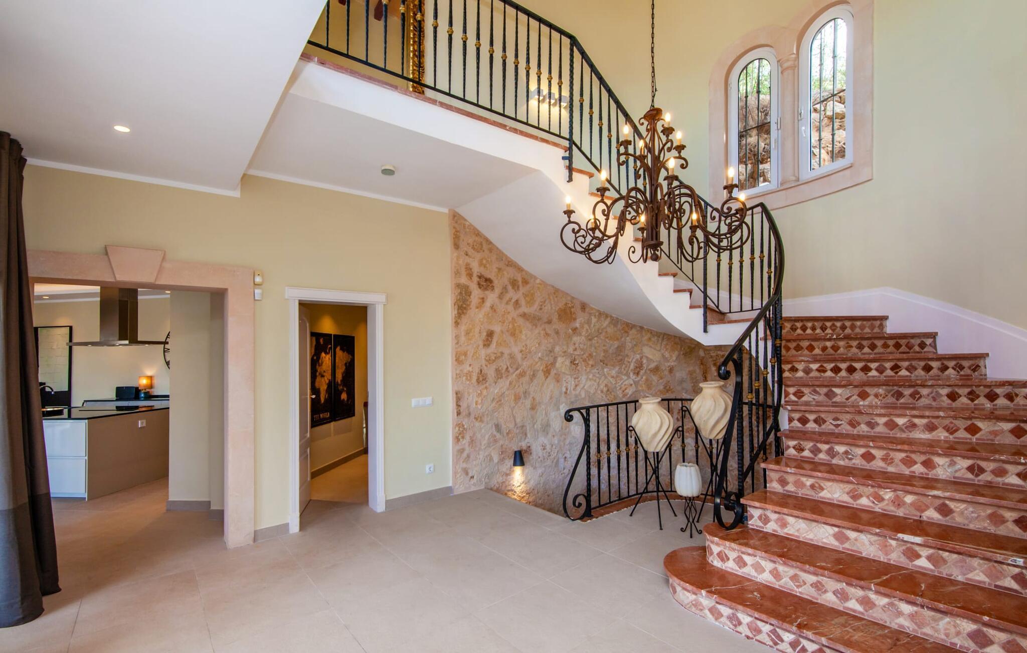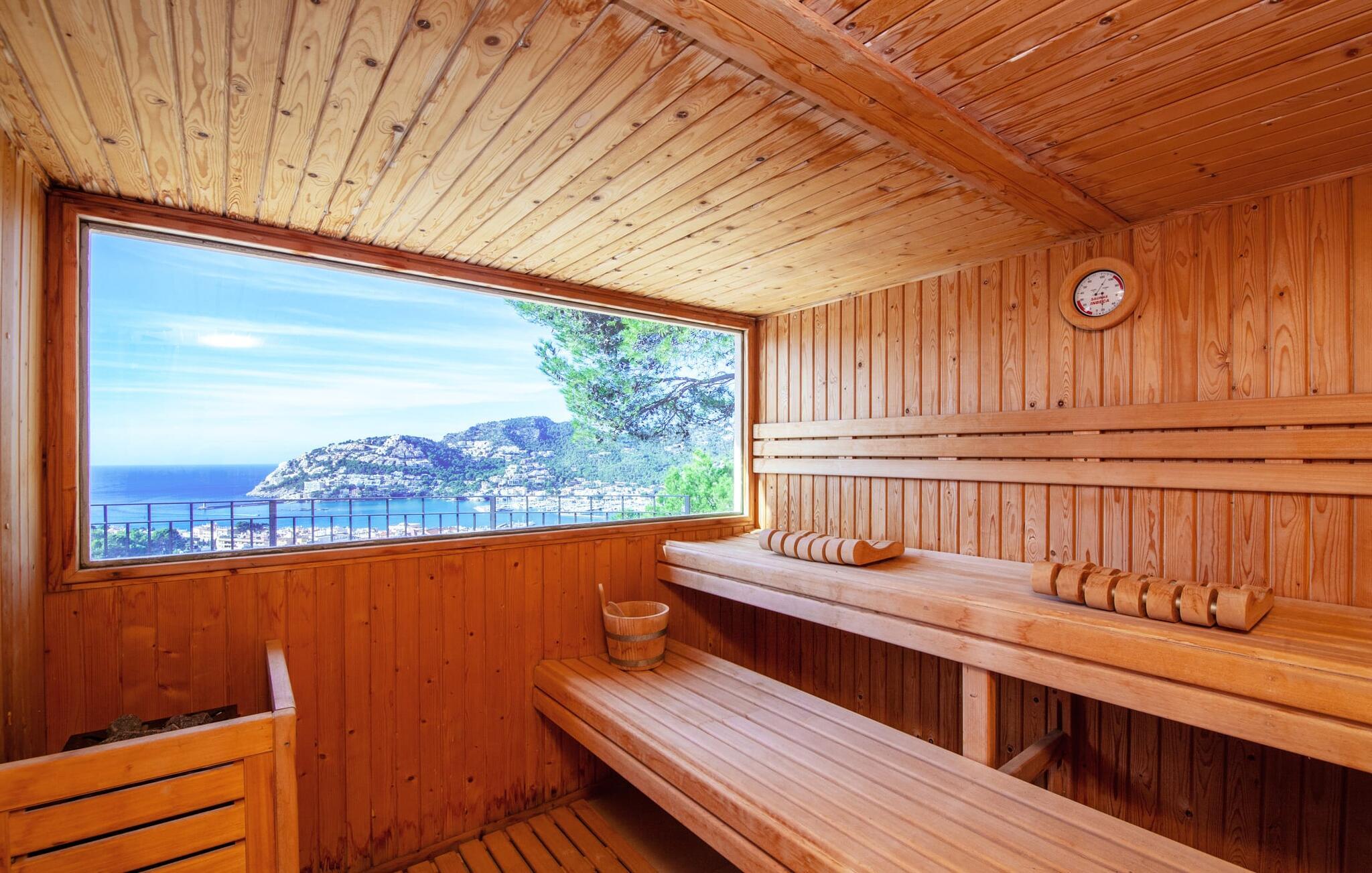 Dette luksuriøse feriehus og dets udendørsområde er smukt designet. Omkring poolen, som er let tilgængelig via trapper, er der forskellige steder med betagende udsigt, herunder den hyggelige lounge og daybed. Spisebordet på den overdækkede terrasse bag buerne tilbyder også et storslået panorama. En balkon ovenpå fuldender det udendørs opholdsområde. En sauna er også tilgængelig i udendørsområdet i dette feriehus på Mallorca.