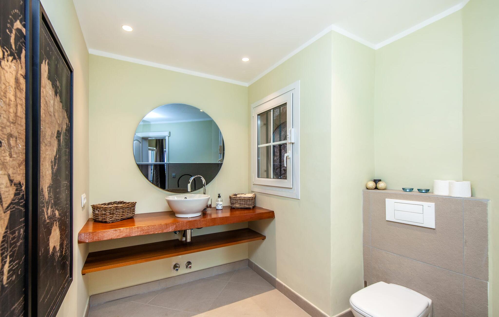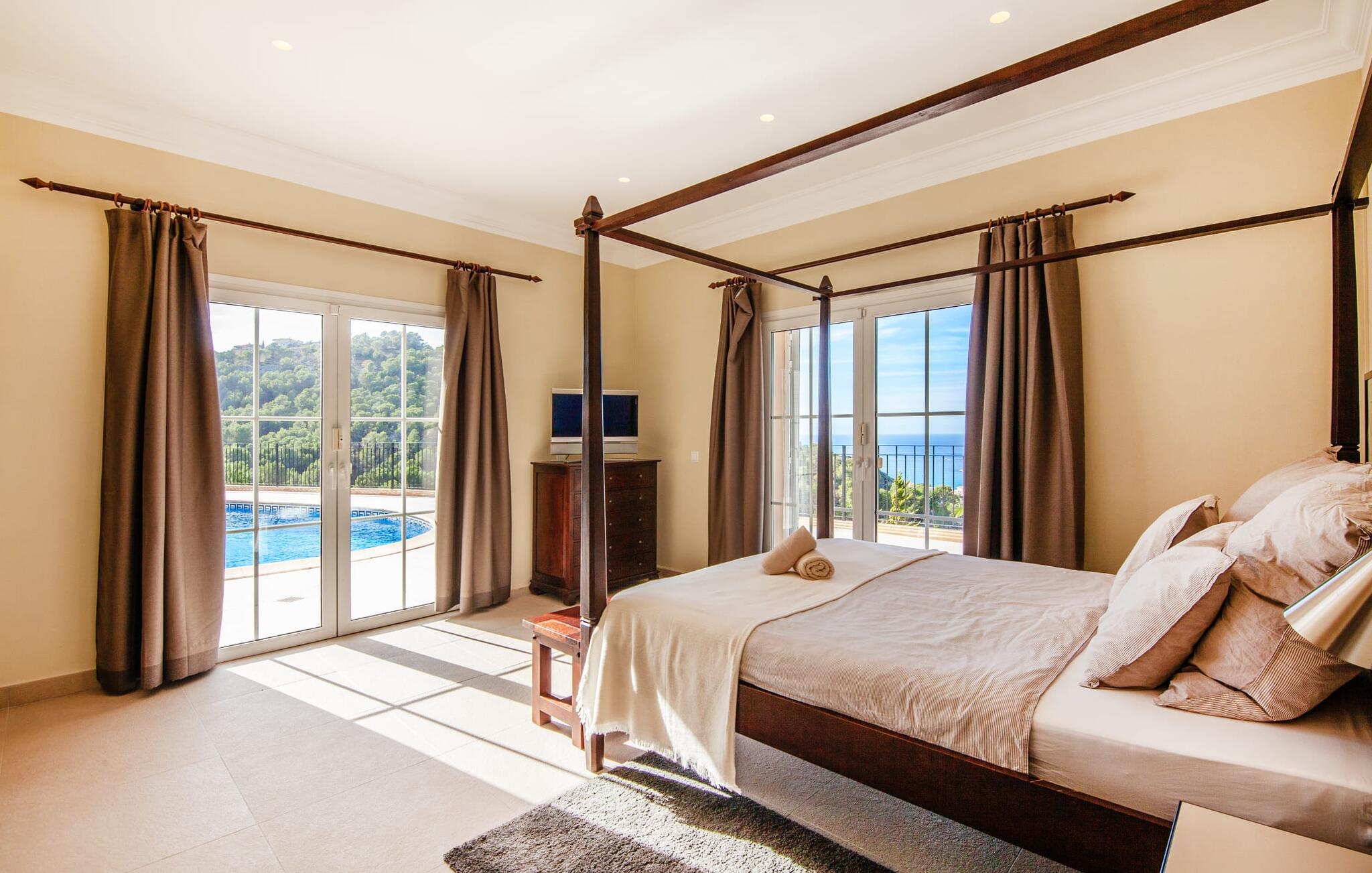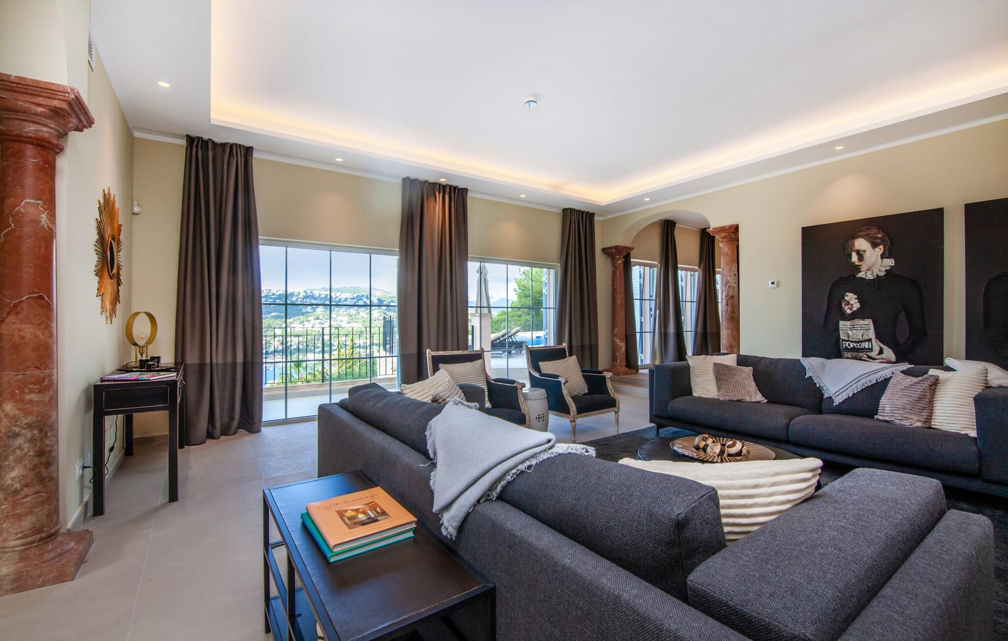 Dette luksuriøse feriehus og dets udendørsområde er smukt designet. Omkring poolen, som er let tilgængelig via trapper, er der forskellige steder med betagende udsigt, herunder den hyggelige lounge og daybed. Spisebordet på den overdækkede terrasse bag buerne tilbyder også et storslået panorama. En balkon ovenpå fuldender det udendørs opholdsområde. En sauna er også tilgængelig i udendørsområdet i dette feriehus på Mallorca.
