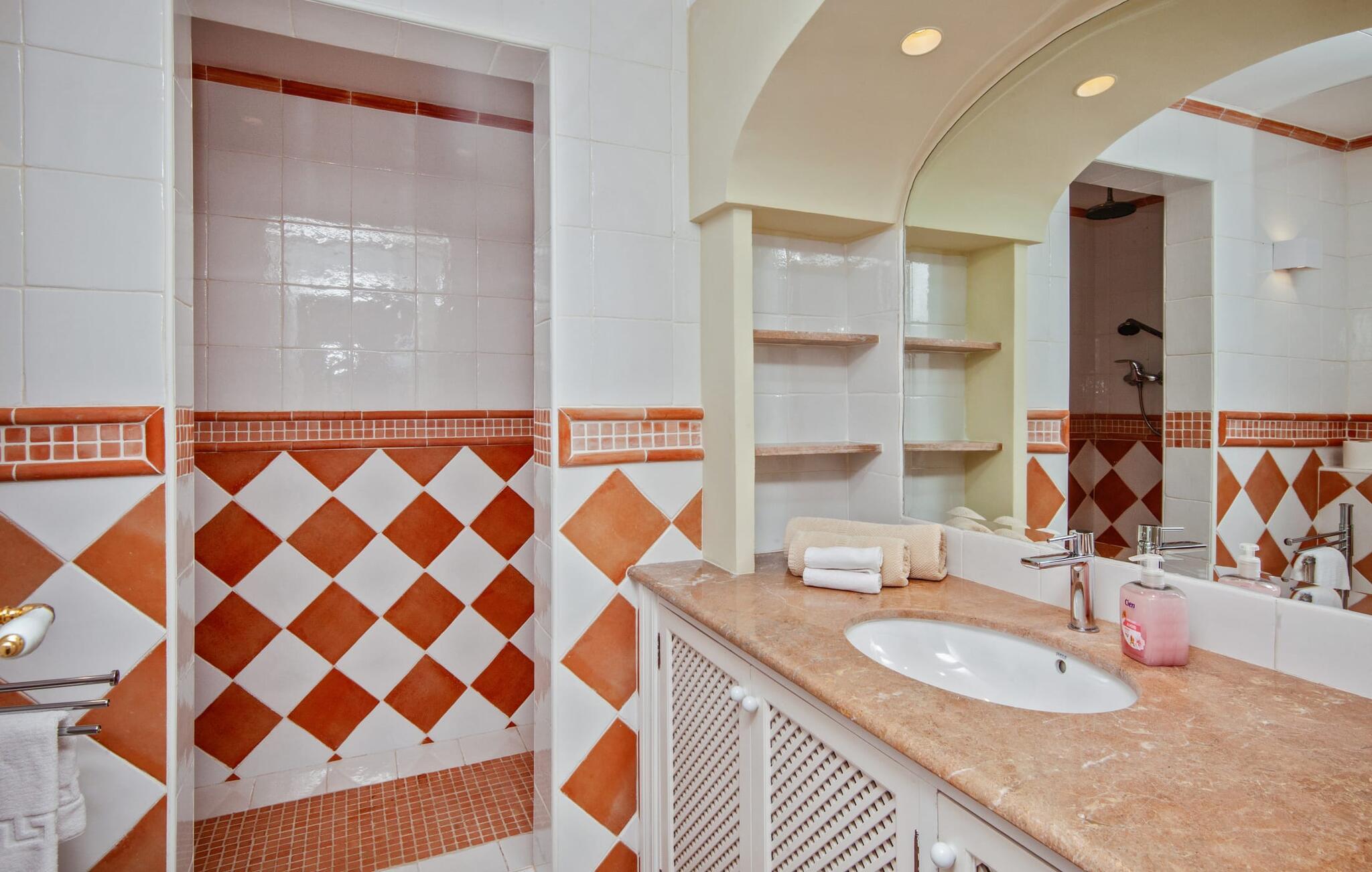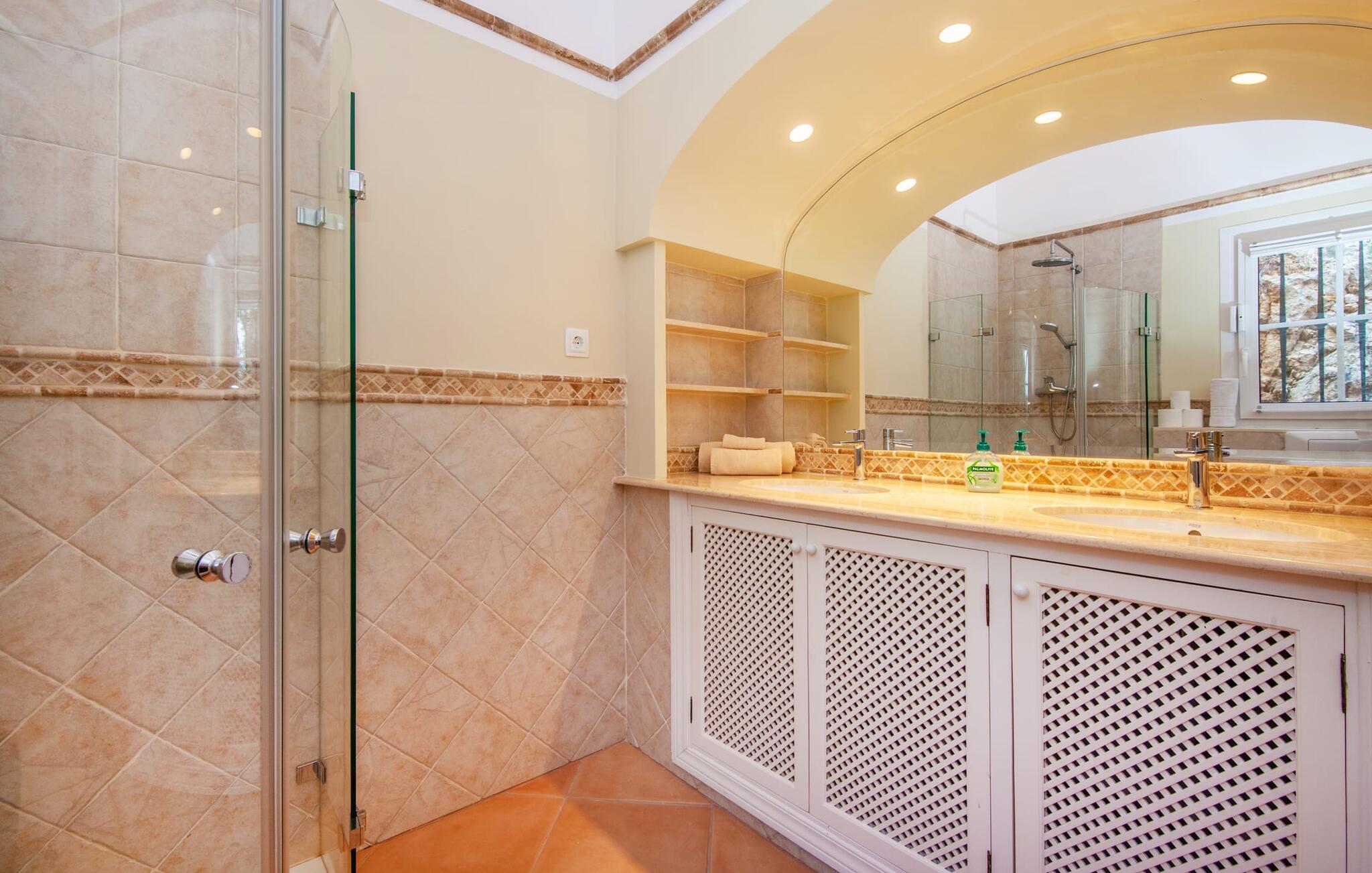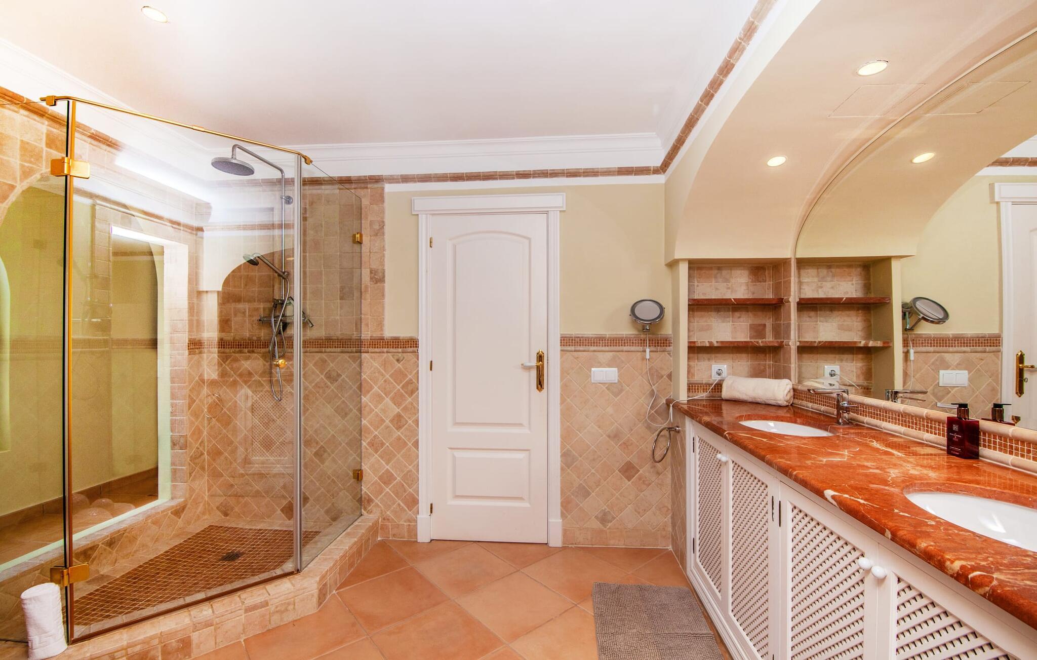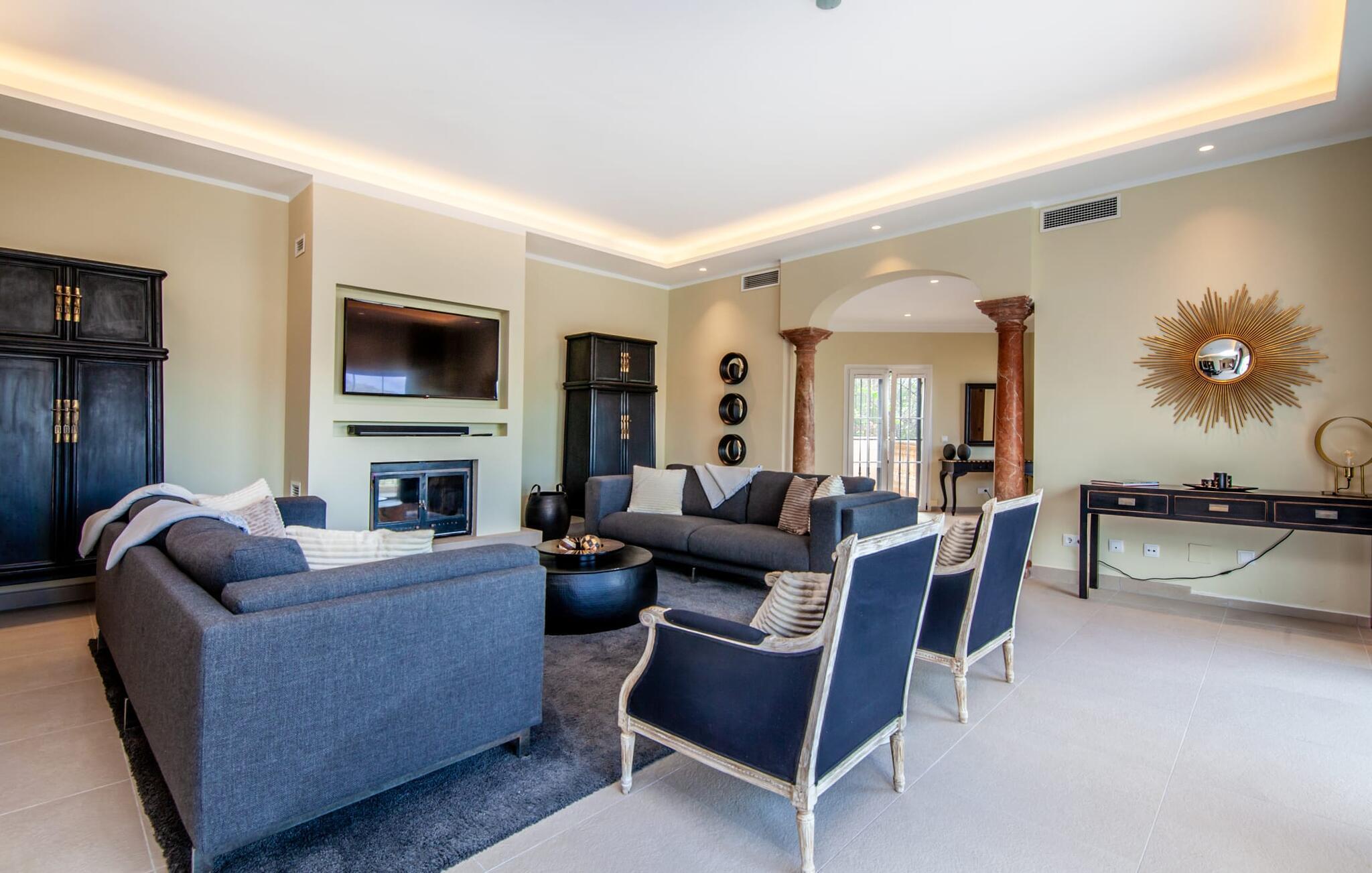 Dette luksuriøse feriehus og dets udendørsområde er smukt designet. Omkring poolen, som er let tilgængelig via trapper, er der forskellige steder med betagende udsigt, herunder den hyggelige lounge og daybed. Spisebordet på den overdækkede terrasse bag buerne tilbyder også et storslået panorama. En balkon ovenpå fuldender det udendørs opholdsområde. En sauna er også tilgængelig i udendørsområdet i dette feriehus på Mallorca.