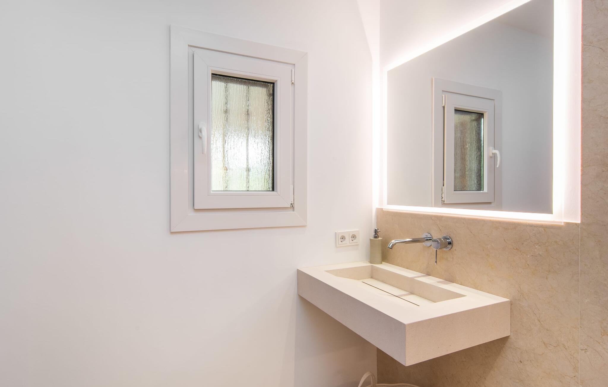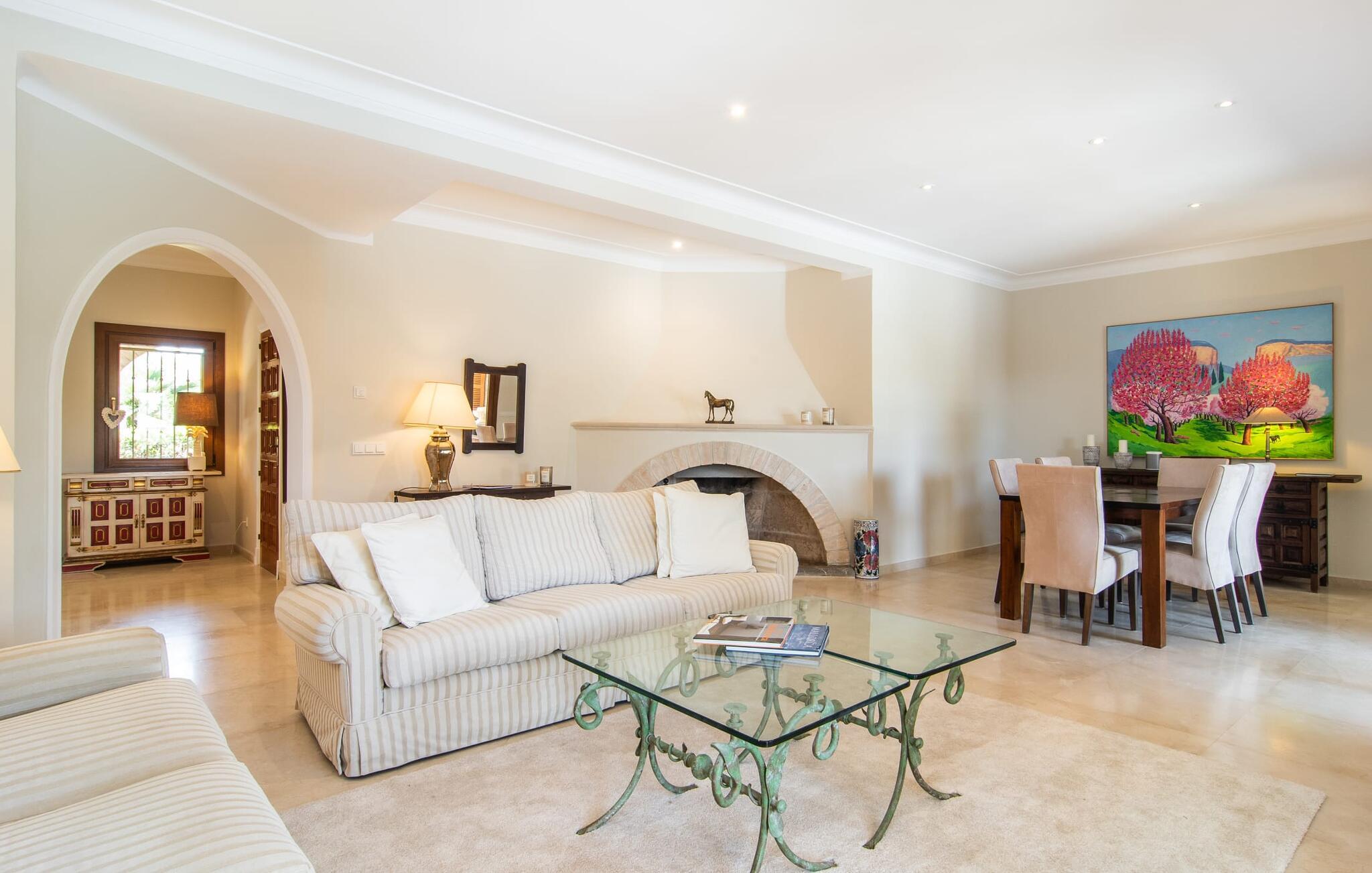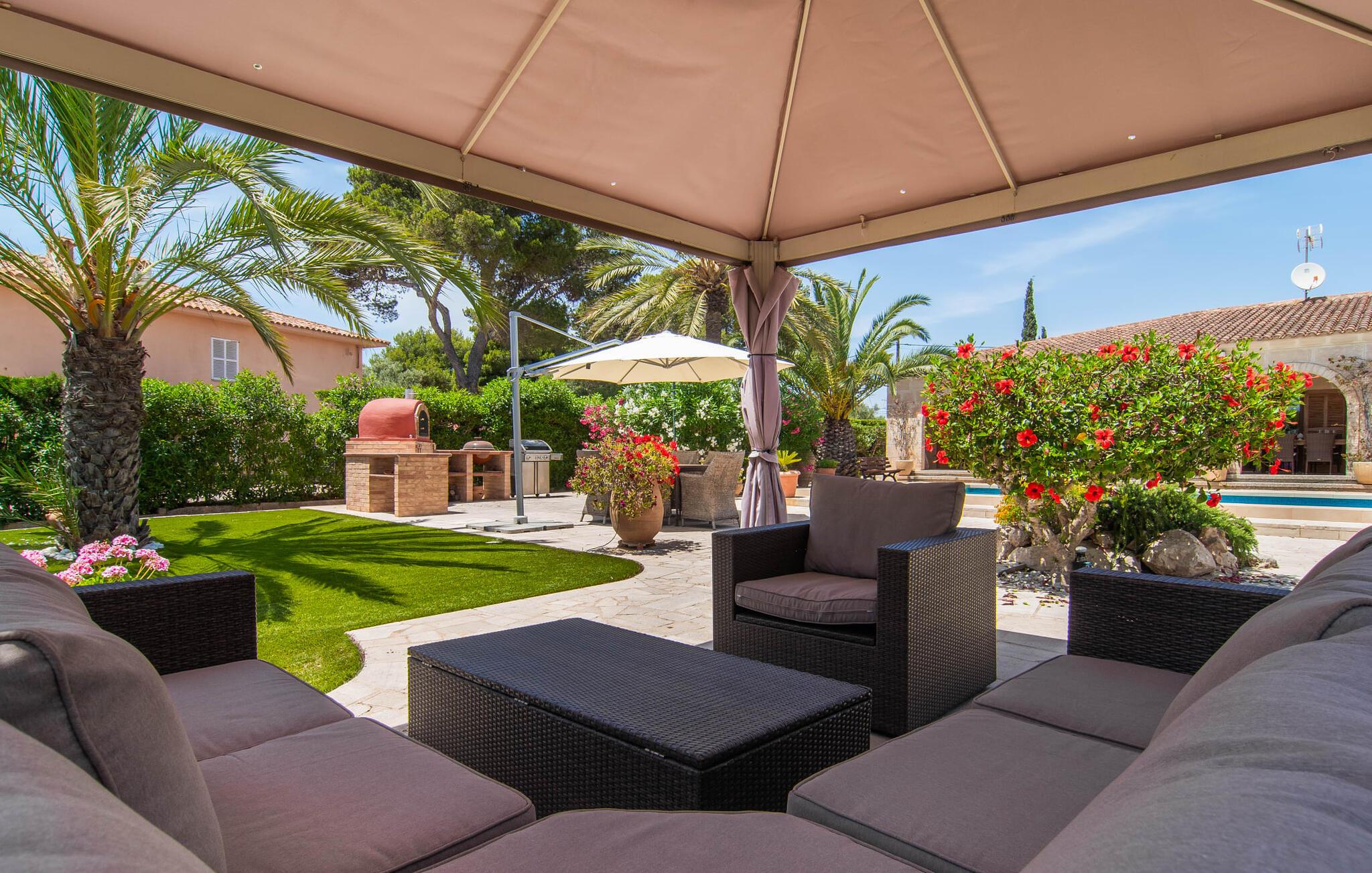 En smukt designet, rummelig have er højdepunktet i denne højkvalitetsvilla på Mallorca, som absolut scorer point i form af design og indretning. Flisearealer, græsplæner og smukke stier præger området, kombineret med en vidunderlig middelhavsflora. Fans af velholdt udendørs Chile vil få noget for pengene her: overdækkede terrasseområder og områder i det fri, et område dækket med markiser, en chill-out lounge - og sidst men ikke mindst, selvfølgelig, de vidunderligt smukke solbadeområder ved poolen inviterer jer til at nyde ferielivet om dagen for at bevæge jer helt udendørs og slentre fra det ene yndlingssted til det andet. Det, I altid skal have med jer, er den rigtige drink, som I kan nippe til fra tid til anden. I kan også nyde en fantastisk kulinarisk oplevelse udenfor. To forskellige griller og en pizzaovn inviterer jer til velsmagende udflugter til jeres eget rige. Svømmeentusiaster vil blive henrykte over poolens imponerende størrelse, og der er også en praktisk udendørs bruser. Fra den overdækkede terrasse fører flere gulv-til-loft vinduer direkte ind i forskellige områder af huset. Standarden videreføres konsekvent i interiøret og strækker sig også til alle udendørsarealer. Lyse gulve, vægge, lofter og tekstiler samt omhyggeligt afmålte, stilfulde tilbehør, der effektivt pifter stemningen op, præger den levende flair. Den kombinerede stue og spisestue er et fantastisk sted at tilbringe tid med jeres medrejsende, mens I stadig kan nyde forskellige aktiviteter. Ved siden af ligger det rummelige, fuldt udstyrede køkken, som også har udgang til terrassen. Tre smukke dobbeltværelser rummer vidunderlige fredsøer til afslappende ferienætter. Tre bruserum, hvoraf to har eget bad, runder rummeligheden af i denne villa på Mallorca, som vi anbefaler til alle, for hvem nærhed til havet og overlegen komfort står øverst på deres ferieønskeliste. Den eksklusive villa "Casa Pi" ligger sydvendt i urbaniseringen Vallgonera nær den smukke kystby Cala Pí. Absolut højdepunkt: I kan gå til havet fra jeres bolig. Supermarkeder og restauranter er heller ikke langt væk. Takket være dens beliggenhed på en stille gade, kan I nå forskellige destinationer på ingen tid. Den krystalklare, azurblå bugt Playa de Cala Pí lader jer glemme hverdagens stress.
