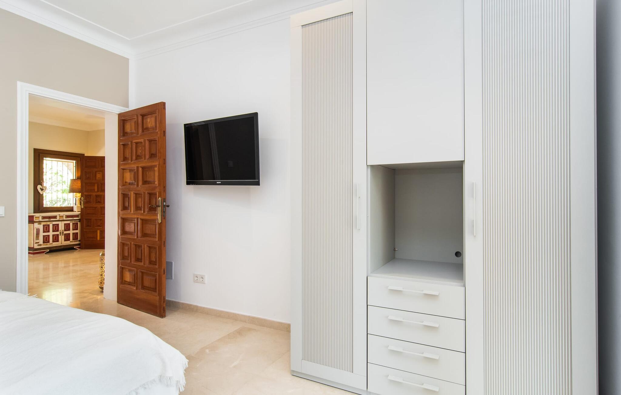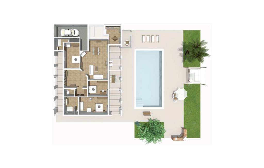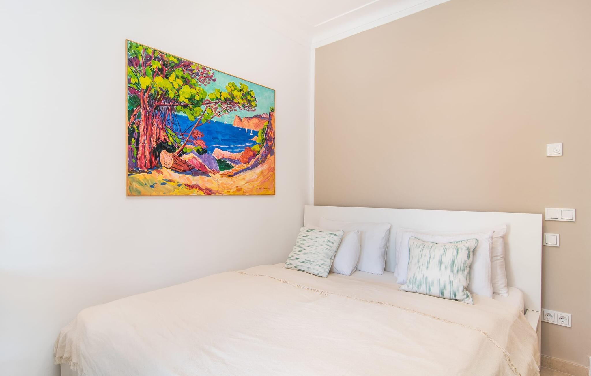En smukt designet, rummelig have er højdepunktet i denne højkvalitetsvilla på Mallorca, som absolut scorer point i form af design og indretning. Flisearealer, græsplæner og smukke stier præger området, kombineret med en vidunderlig middelhavsflora. Fans af velholdt udendørs Chile vil få noget for pengene her: overdækkede terrasseområder og områder i det fri, et område dækket med markiser, en chill-out lounge - og sidst men ikke mindst, selvfølgelig, de vidunderligt smukke solbadeområder ved poolen inviterer jer til at nyde ferielivet om dagen for at bevæge jer helt udendørs og slentre fra det ene yndlingssted til det andet. Det, I altid skal have med jer, er den rigtige drink, som I kan nippe til fra tid til anden. I kan også nyde en fantastisk kulinarisk oplevelse udenfor. To forskellige griller og en pizzaovn inviterer jer til velsmagende udflugter til jeres eget rige. Svømmeentusiaster vil blive henrykte over poolens imponerende størrelse, og der er også en praktisk udendørs bruser. Fra den overdækkede terrasse fører flere gulv-til-loft vinduer direkte ind i forskellige områder af huset. Standarden videreføres konsekvent i interiøret og strækker sig også til alle udendørsarealer. Lyse gulve, vægge, lofter og tekstiler samt omhyggeligt afmålte, stilfulde tilbehør, der effektivt pifter stemningen op, præger den levende flair. Den kombinerede stue og spisestue er et fantastisk sted at tilbringe tid med jeres medrejsende, mens I stadig kan nyde forskellige aktiviteter. Ved siden af ligger det rummelige, fuldt udstyrede køkken, som også har udgang til terrassen. Tre smukke dobbeltværelser rummer vidunderlige fredsøer til afslappende ferienætter. Tre bruserum, hvoraf to har eget bad, runder rummeligheden af i denne villa på Mallorca, som vi anbefaler til alle, for hvem nærhed til havet og overlegen komfort står øverst på deres ferieønskeliste. Den eksklusive villa "Casa Pi" ligger sydvendt i urbaniseringen Vallgonera nær den smukke kystby Cala Pí. Absolut højdepunkt: I kan gå til havet fra jeres bolig. Supermarkeder og restauranter er heller ikke langt væk. Takket være dens beliggenhed på en stille gade, kan I nå forskellige destinationer på ingen tid. Den krystalklare, azurblå bugt Playa de Cala Pí lader jer glemme hverdagens stress.
