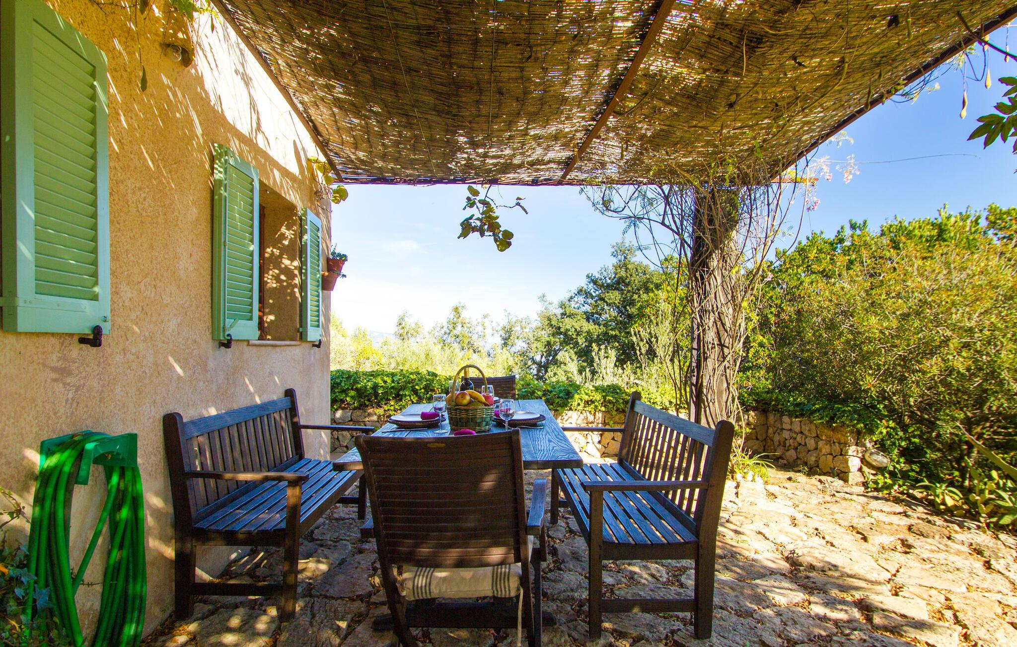 I finder et nyt yndlingssted hver dag. Forskellige siddeområder tilbyder skyggefulde hjørner eller uhindret udsigt, perfekt til spisning under åben himmel eller blot at nyde de rolige omgivelser. En naturskøn sti fører fra huset til poolen, som ligger på et lavere niveau og tilbyder en betagende panoramaudsigt. Den blidt skrånende pool lægger op til at slappe af og tilbyder rigelig plads med liggestole til jeres komfort. En grillplads fuldender udendørsoplevelsen.