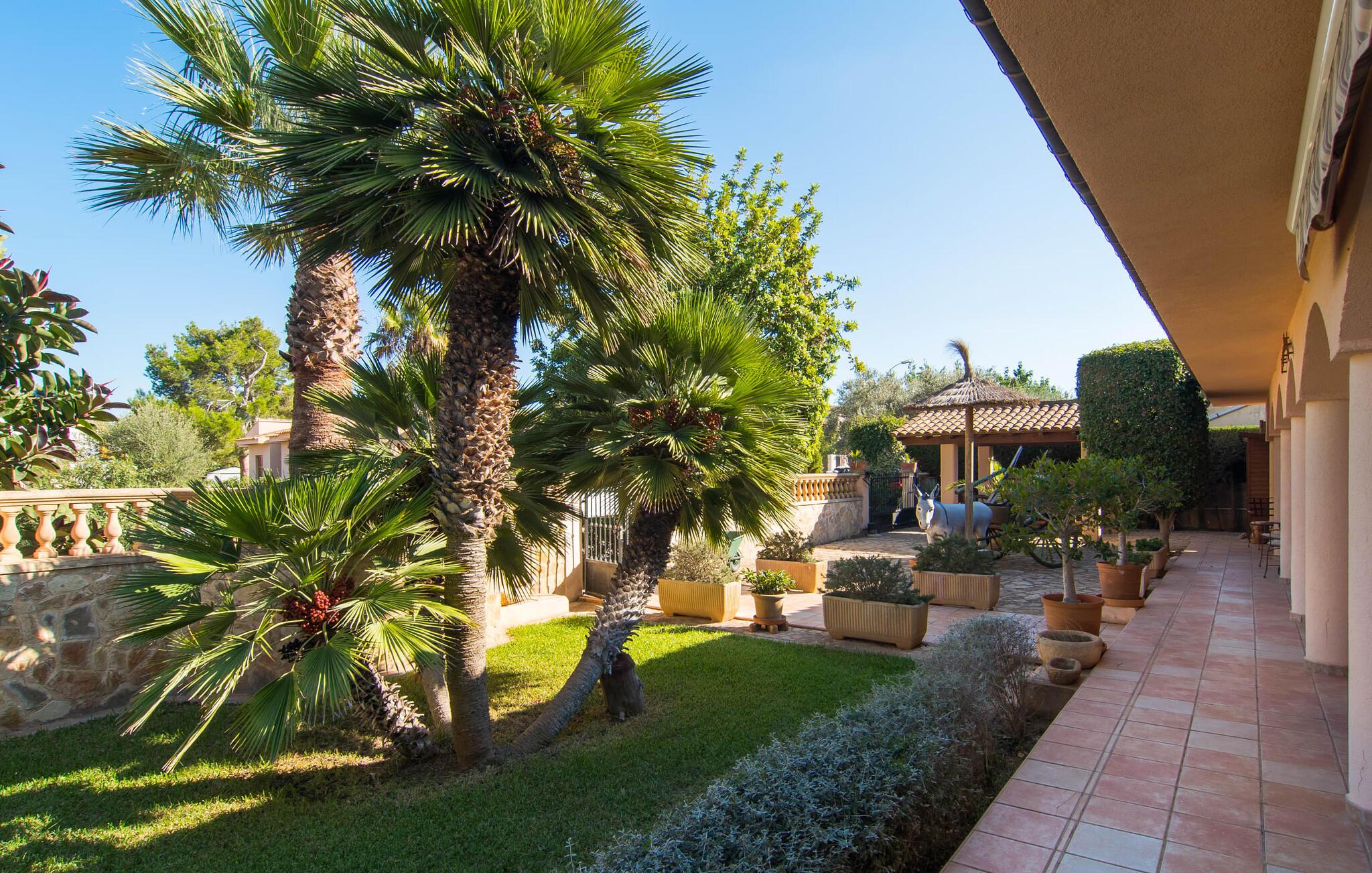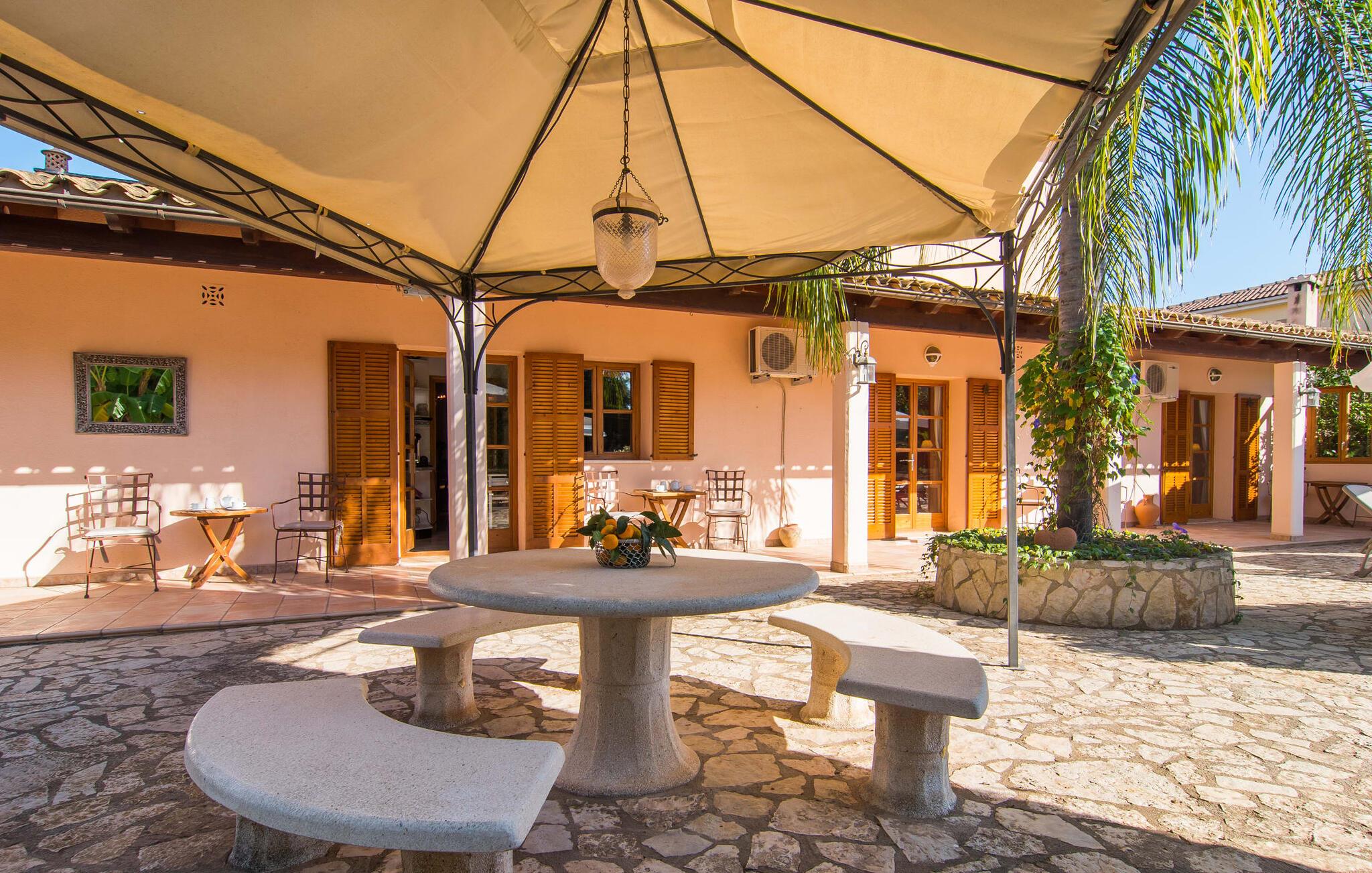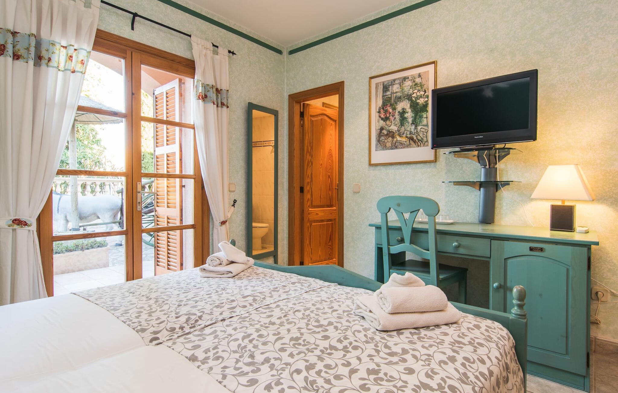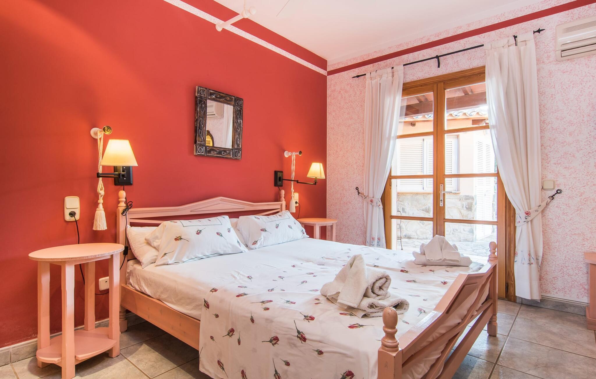 "Casa Romantica" er en charmerende villa i Sa Coma, perfekt for dem, der leder efter en central, men tæt på stranden beliggenhed. Beliggende på en rummelig grund byder ejendommen på et smukt vedligeholdt udendørsområde med indbydende terrasser, palmer og blomsterbede, der skaber en afslappende middelhavsstemning. Nyd at slappe af ved poolen med liggestole og parasoller eller forkæl jer selv med al fresco-måltider tilberedt ved grillpladsen eller i det fuldt udstyrede køkken. Et særligt kendetegn er den udendørs sauna, som giver jeres ferie et strejf af luksus. Parkeringspladser er tilgængelige direkte foran villaen. Indvendigt emmer villaen af en hyggelig bondegårdsstemning, med rustikke træmøbler, vinduesrammer og døre, der gør det nemt at slappe af og føle sig hjemme. I stueplan er der spisestue, opholdsstue med pejs og lyst køkken med udgang til terrasse. Fire dobbeltværelser, hver med eget badeværelse og rummelige garderobeskabe, sikrer privatliv og komfort. En vindeltrappe fører til et yderligere soveværelse med dobbeltseng med en-suite badeværelse, der fuldender hjemmets indbydende og velindrettede rum. Den velholdte finca "Casa Romantica" ligger på en rummelig grund i Sa Coma på det østlige Mallorca. Takket være den centrale beliggenhed kan I nemt nå restauranter og butikker til fods. Stranden i Sa Coma ligger kun omkring 1,8 km væk. I kan køre til andre strande som Cala Millor eller Cala Petita via den akustisk mærkbare vej, kun 3,2 km, eller 4,9 km med en lejebil. Og det ugentlige marked Son Servera ligger kun omkring 5,5 km væk.