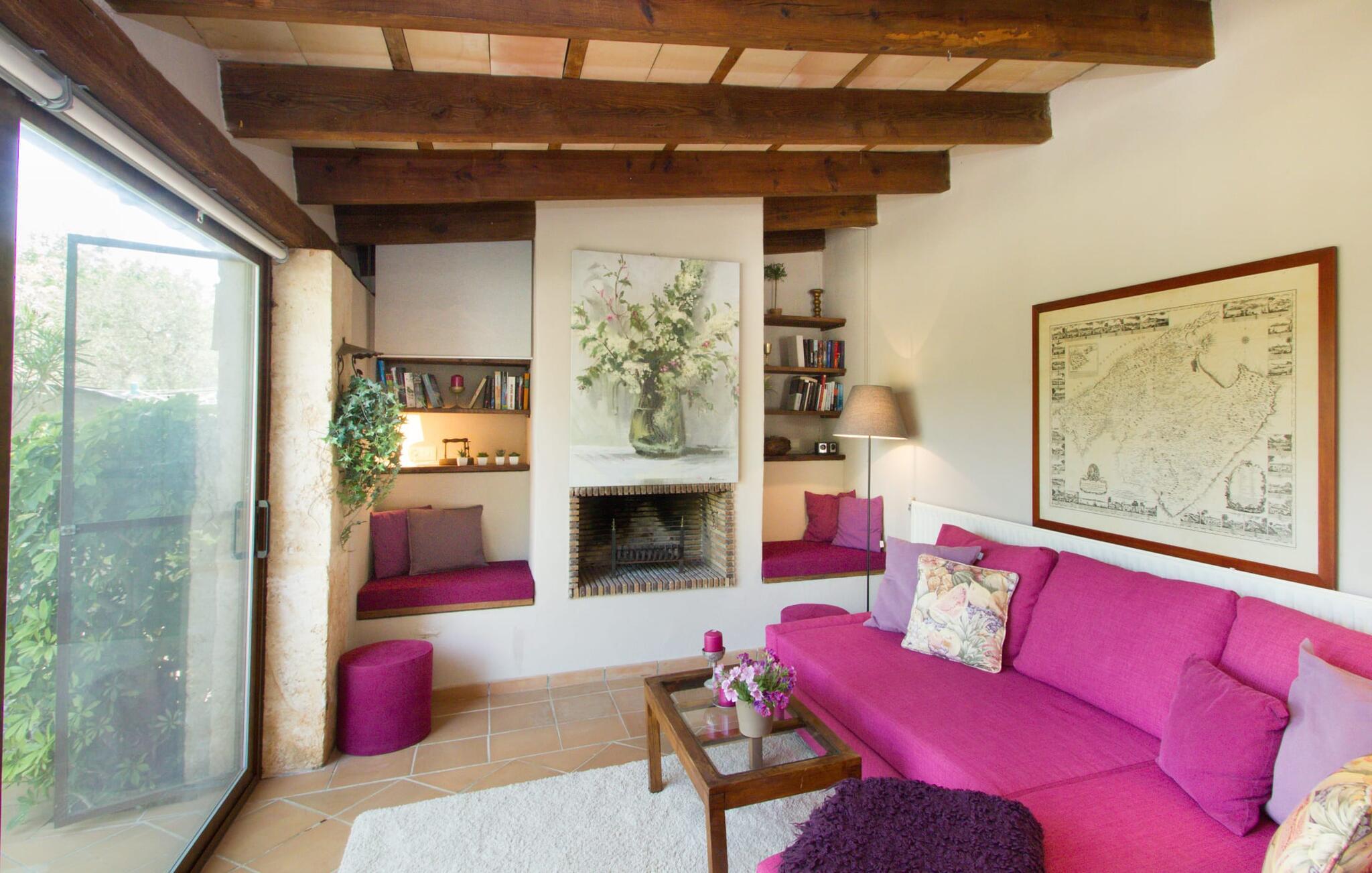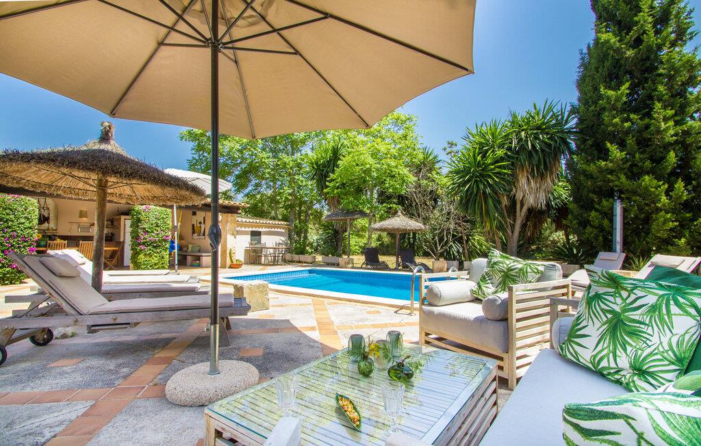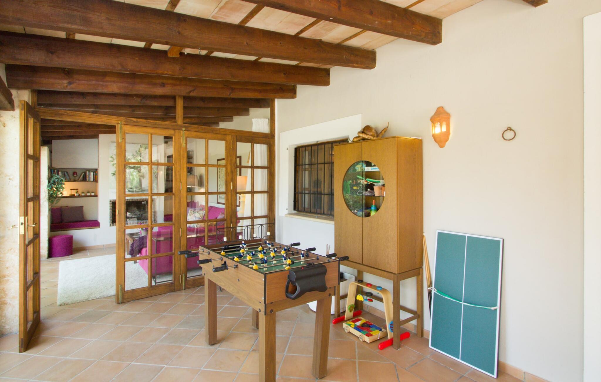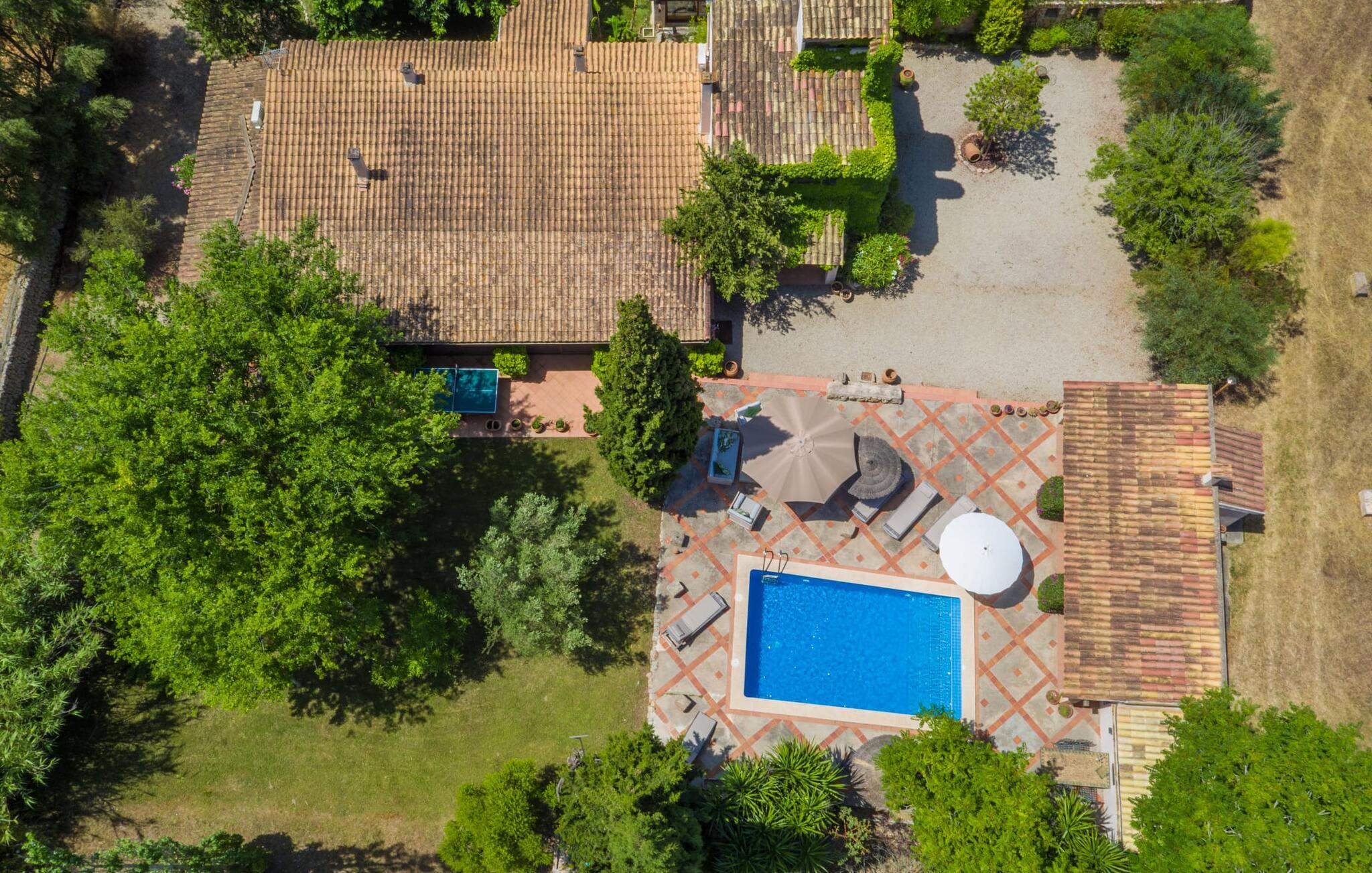 Midt på øen og midt i et typisk middelhavslandskab: dette er den idylliske beliggenhed af villaen "Casa S'Era de Costitx", som blev bygget på en grund på over 5.000 m². Det kønne hus, delvist bevokset med frodigt grønt, passer meget smagfuldt ind i omgivelserne - i ordets bedste forstand føles det, som om bygningen altid har ligget her. Udendørsområdet, designet med stor sans for detaljer, er et rigtigt højdepunkt. Med så mange muligheder vil I have svært ved at beslutte, hvor I skal hen først. I kan vælge liggestolene under parasoller eller de polstrede udendørs siddepladser. Udekøkkenet med spisebord og stole har også et flot, rustikt udtryk - og en gynge til børn med udsigt til poolen. I kan spise på den overdækkede terrasse direkte ved huset, eller få en kop kaffe i det elegante opholdsområde på siden af huset eller på den solrige tagterrasse. Eller I kan spille et spil bordtennis med jeres medrejsende ved hotellets eget bord i den behagelige skygge. En fantastisk blanding af traditionel og moderne stil venter jer i jeres sommerhus. Hvide vægge, loftsbjælker, vindues- og dørkarme i træ og naturfarvede fliser skaber en vidunderlig autentisk landstedsstemning, som får et nutidigt præg af smart boligtilbehør. I stueplan finder I indgangspartiet og et gæstetoilet samt det rummelige køkken med spisekammer, som er åbent og løber direkte ud i spisepladsen. Det runde spisebord er oplyst af en lysekrone - her kan I nyde en fest sammen i fred og ro. Køkkenet og spisepladsen er også halvåbne til stuen - så I kaster måske allerede et længselsfuldt blik på de to komfortable sofaer, der gerne vil lokke jer over fra naboen. Når I er træt, kan I trække jer tilbage til et af de to romantisk indrettede soveværelser, nogle med naturstensvægge og charmerende skodder. Et moderne badeværelse fuldender boligkomforten i stueetagen. På øverste etage er der endnu et soveværelse med et elegant en-suite badeværelse. Pak en flaske vand og et par snacks og tag afsted: I vil se, at det er det værd - det imponerende landskab i centrum af øen har sin helt særlige charme! Omgivelserne omkring jeres hus er herligt landlige, der er næsten ikke direkte naboer - kun villaejerne, som I kun deler indkørslen med. For at gøre jeres indkøb skal I køre de 6,8 km til Costitx, langs vejen, som kan være hørbar afhængigt af vindretningen. Landsbyen er ikke en af Mallorcas kendte turistmål, men netop derfor er den et besøg værd. Byens centrum er rådhuset, en kirke fra 1600-tallet og en markedsplads indrammet af mange attraktive palæer. Hvis I kommer på en lørdag, kan I slentre gennem det ugentlige marked ved Mare de Déu og Plaça del Jardí. Derudover driver Costitx øens eneste planetarium og observatorium, som også tilbyder guidede ture. Hvis I foretrækker at besøge havet, kan I køre cirka 33 km til den rolige, for det meste uberørte strand Es Penyo. Placeringen af villaen "Casa S'Era de Costitx", delvist romantisk indrettet med frodige grønne områder, er ideel for naturelskere, der kan lide at gå, vandre eller cykle gennem landskabet. Men den store ejendom byder også på et godt sted at slappe af: lige ved siden af huset med dets forskellige terrasseområder finder I ikke kun poolen, men også en gynge, et bordtennisbord, et bordfodboldbord og et fantastisk udekøkken. Den nærmeste strand ligger cirka 33,8 km væk, mens landsbyen Costitx kun ligger 6,8 km væk.