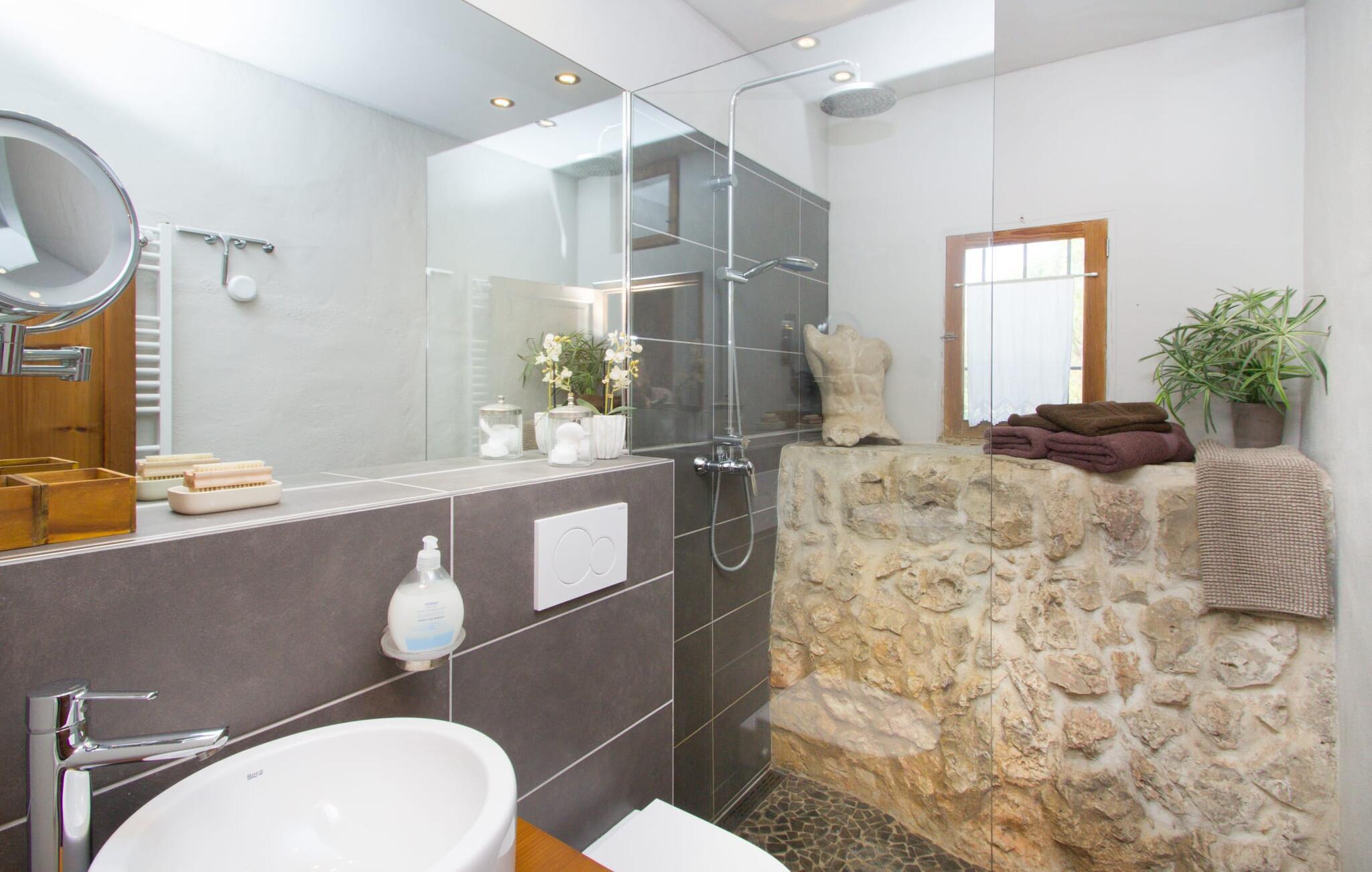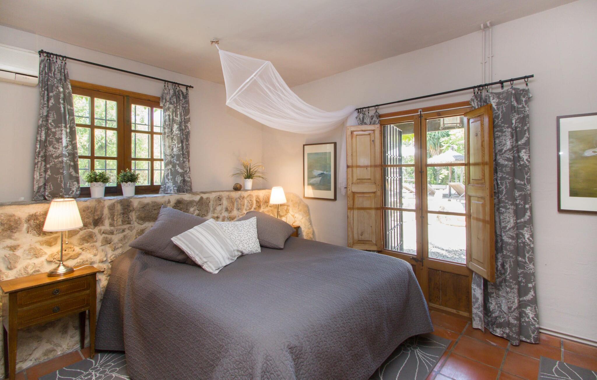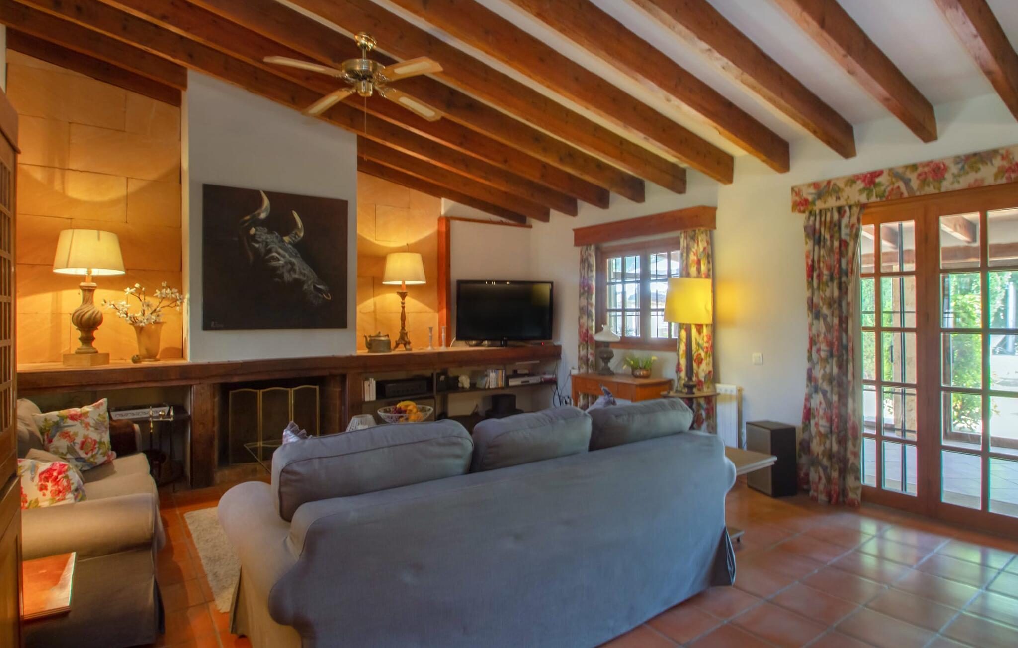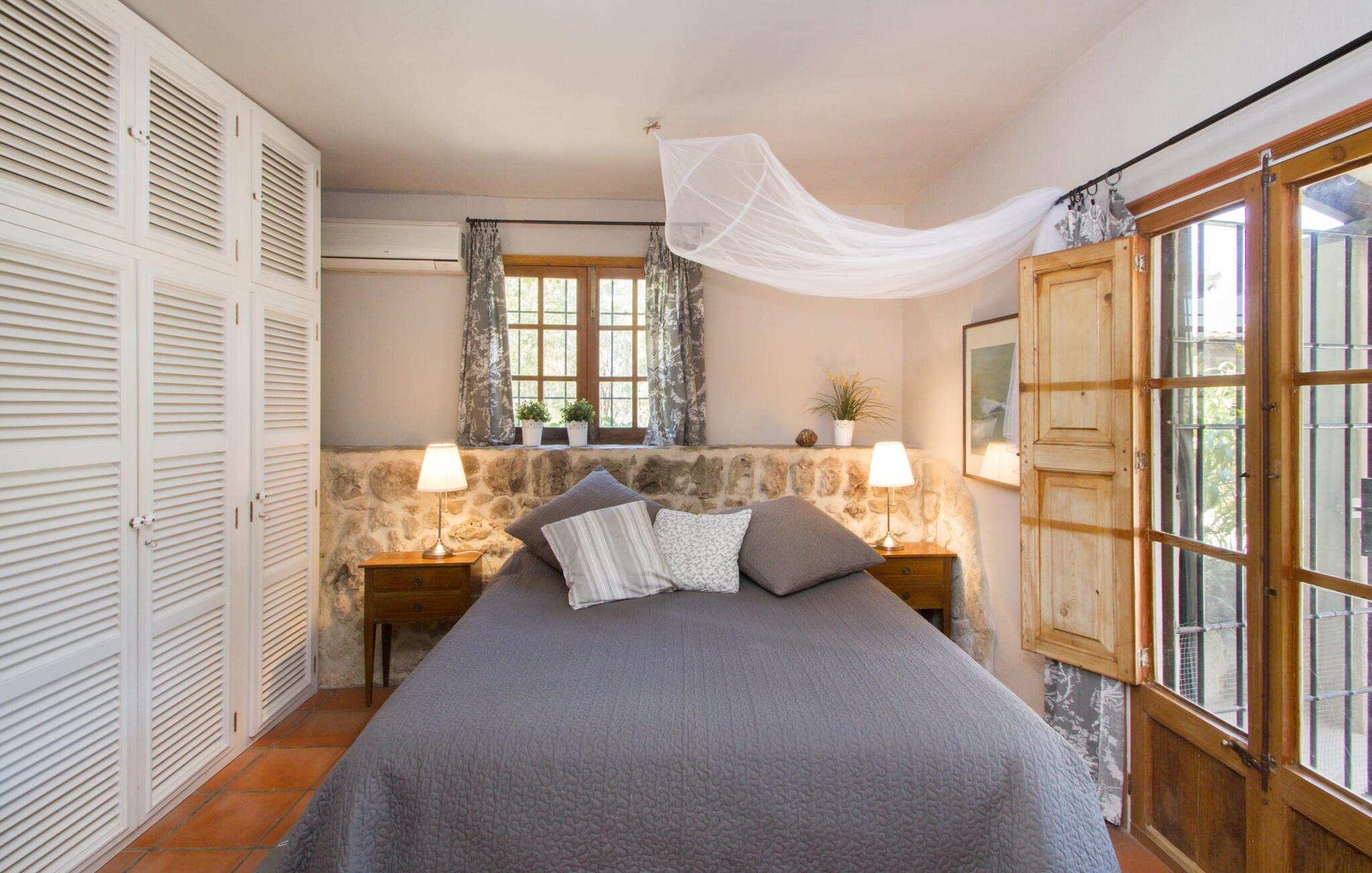 Midt på øen og midt i et typisk middelhavslandskab: dette er den idylliske beliggenhed af villaen "Casa S'Era de Costitx", som blev bygget på en grund på over 5.000 m². Det kønne hus, delvist bevokset med frodigt grønt, passer meget smagfuldt ind i omgivelserne - i ordets bedste forstand føles det, som om bygningen altid har ligget her. Udendørsområdet, designet med stor sans for detaljer, er et rigtigt højdepunkt. Med så mange muligheder vil I have svært ved at beslutte, hvor I skal hen først. I kan vælge liggestolene under parasoller eller de polstrede udendørs siddepladser. Udekøkkenet med spisebord og stole har også et flot, rustikt udtryk - og en gynge til børn med udsigt til poolen. I kan spise på den overdækkede terrasse direkte ved huset, eller få en kop kaffe i det elegante opholdsområde på siden af huset eller på den solrige tagterrasse. Eller I kan spille et spil bordtennis med jeres medrejsende ved hotellets eget bord i den behagelige skygge. En fantastisk blanding af traditionel og moderne stil venter jer i jeres sommerhus. Hvide vægge, loftsbjælker, vindues- og dørkarme i træ og naturfarvede fliser skaber en vidunderlig autentisk landstedsstemning, som får et nutidigt præg af smart boligtilbehør. I stueplan finder I indgangspartiet og et gæstetoilet samt det rummelige køkken med spisekammer, som er åbent og løber direkte ud i spisepladsen. Det runde spisebord er oplyst af en lysekrone - her kan I nyde en fest sammen i fred og ro. Køkkenet og spisepladsen er også halvåbne til stuen - så I kaster måske allerede et længselsfuldt blik på de to komfortable sofaer, der gerne vil lokke jer over fra naboen. Når I er træt, kan I trække jer tilbage til et af de to romantisk indrettede soveværelser, nogle med naturstensvægge og charmerende skodder. Et moderne badeværelse fuldender boligkomforten i stueetagen. På øverste etage er der endnu et soveværelse med et elegant en-suite badeværelse. Pak en flaske vand og et par snacks og tag afsted: I vil se, at det er det værd - det imponerende landskab i centrum af øen har sin helt særlige charme! Omgivelserne omkring jeres hus er herligt landlige, der er næsten ikke direkte naboer - kun villaejerne, som I kun deler indkørslen med. For at gøre jeres indkøb skal I køre de 6,8 km til Costitx, langs vejen, som kan være hørbar afhængigt af vindretningen. Landsbyen er ikke en af Mallorcas kendte turistmål, men netop derfor er den et besøg værd. Byens centrum er rådhuset, en kirke fra 1600-tallet og en markedsplads indrammet af mange attraktive palæer. Hvis I kommer på en lørdag, kan I slentre gennem det ugentlige marked ved Mare de Déu og Plaça del Jardí. Derudover driver Costitx øens eneste planetarium og observatorium, som også tilbyder guidede ture. Hvis I foretrækker at besøge havet, kan I køre cirka 33 km til den rolige, for det meste uberørte strand Es Penyo. Placeringen af villaen "Casa S'Era de Costitx", delvist romantisk indrettet med frodige grønne områder, er ideel for naturelskere, der kan lide at gå, vandre eller cykle gennem landskabet. Men den store ejendom byder også på et godt sted at slappe af: lige ved siden af huset med dets forskellige terrasseområder finder I ikke kun poolen, men også en gynge, et bordtennisbord, et bordfodboldbord og et fantastisk udekøkken. Den nærmeste strand ligger cirka 33,8 km væk, mens landsbyen Costitx kun ligger 6,8 km væk.