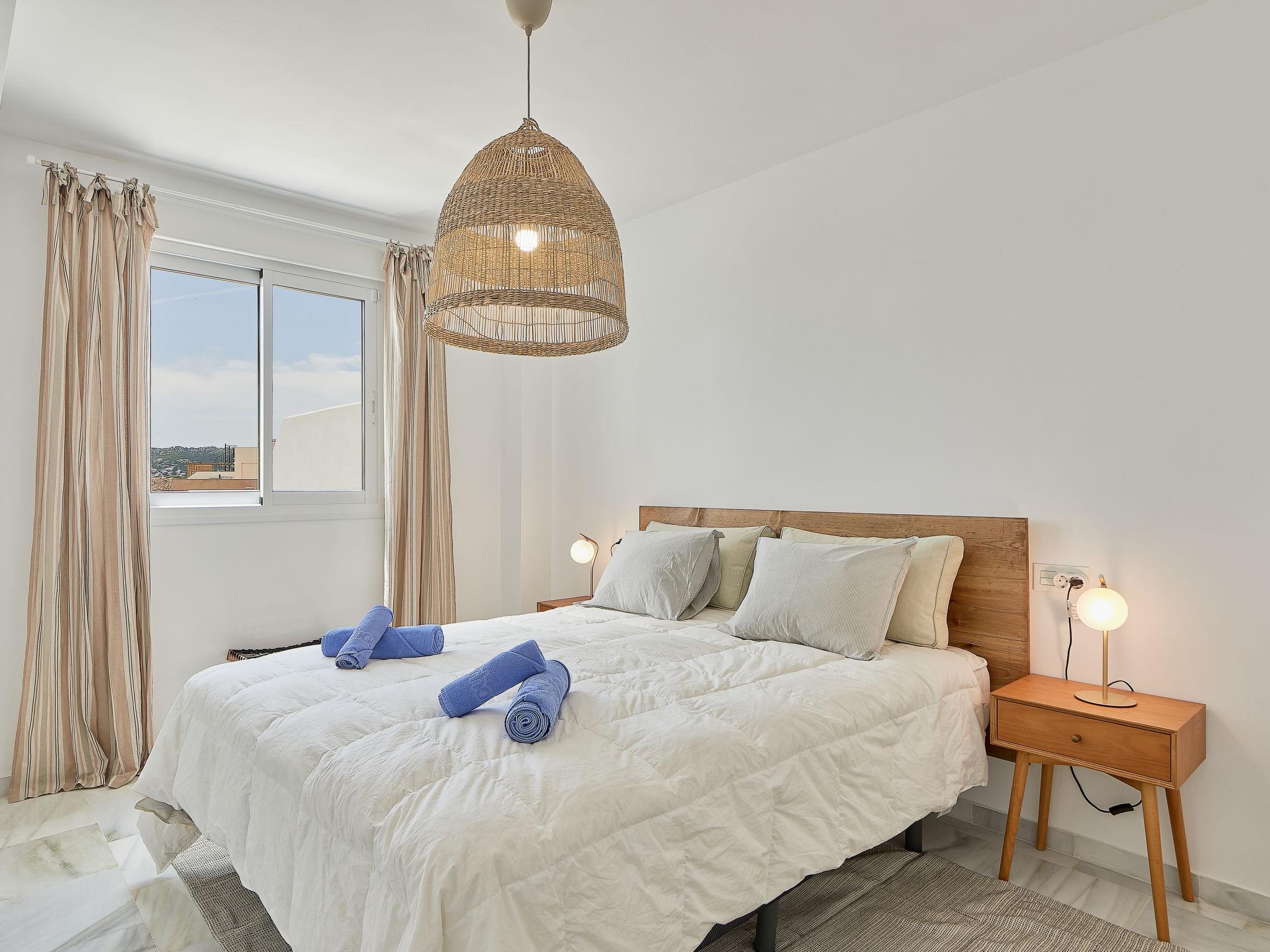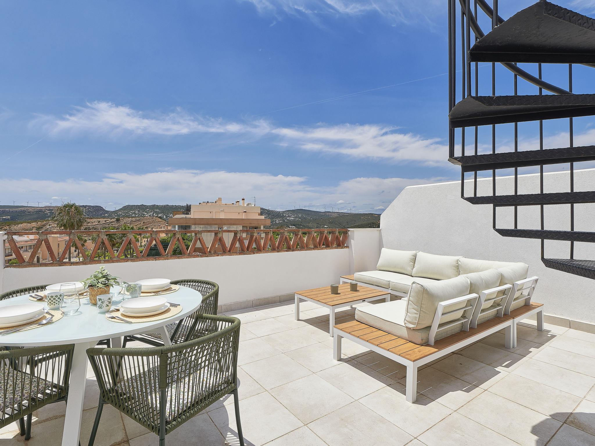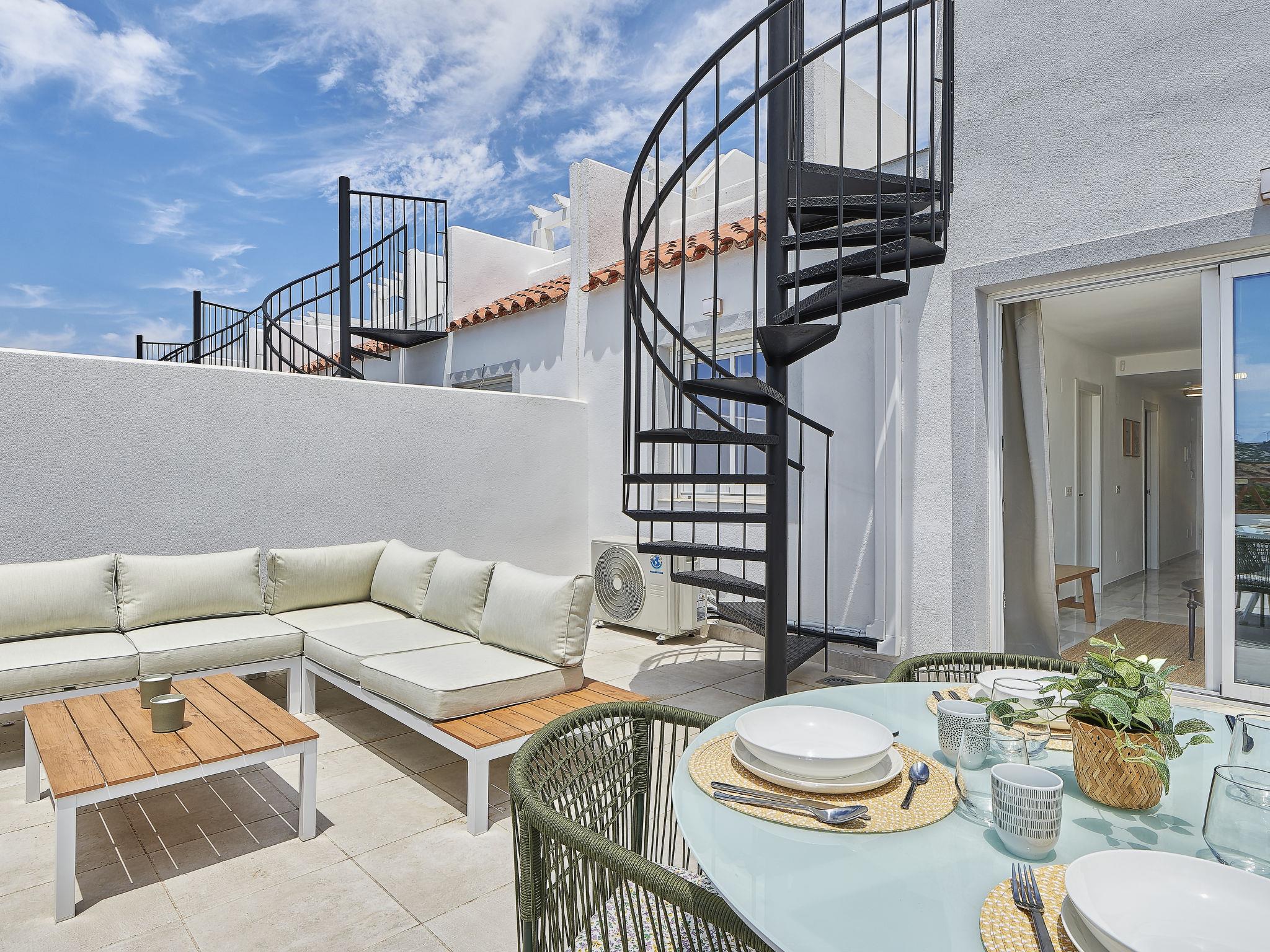 "Doña Julia Golf Views", 3-room penthouse 122 m2 on 2 levels. Very beautiful and modern furnishings: living/dining room with bathroom, digital TV, air conditioning and forced-air heating. Exit to the terrace. 1 room with 2 beds (90 cm, length 200 cm), bath/shower/WC, air conditioning and forced-air heating. 1 room with 1 french bed (160 cm, length 200 cm), hand-basin, shower/WC, air conditioning and forced-air heating. Exit to the terrace. Open kitchen (oven, dishwasher, 3 ceramic glass hob hotplates, toaster, kettle, microwave, electric coffee machine). Large terrace 25 m2, large terrace 45 m2. Terrace furniture. Facilities: washing machine, iron, children's high chair, baby cot, hair dryer. Internet (WiFi, free). Garage space n 19 (1 car). VUT/MA/66126 // Reg. Nr.: ESFCTU0000290400003885050000000000000000VUT/MA/661268