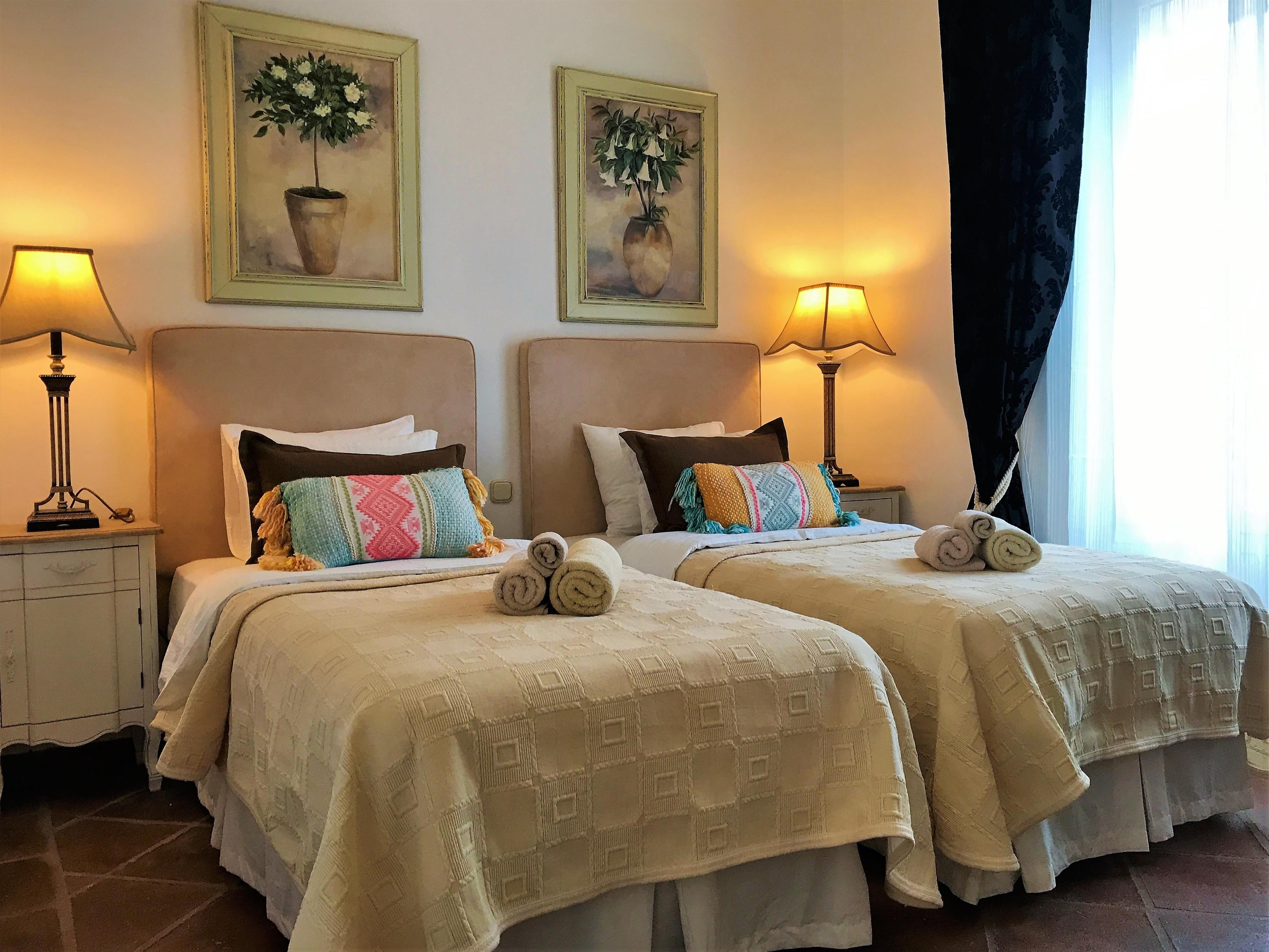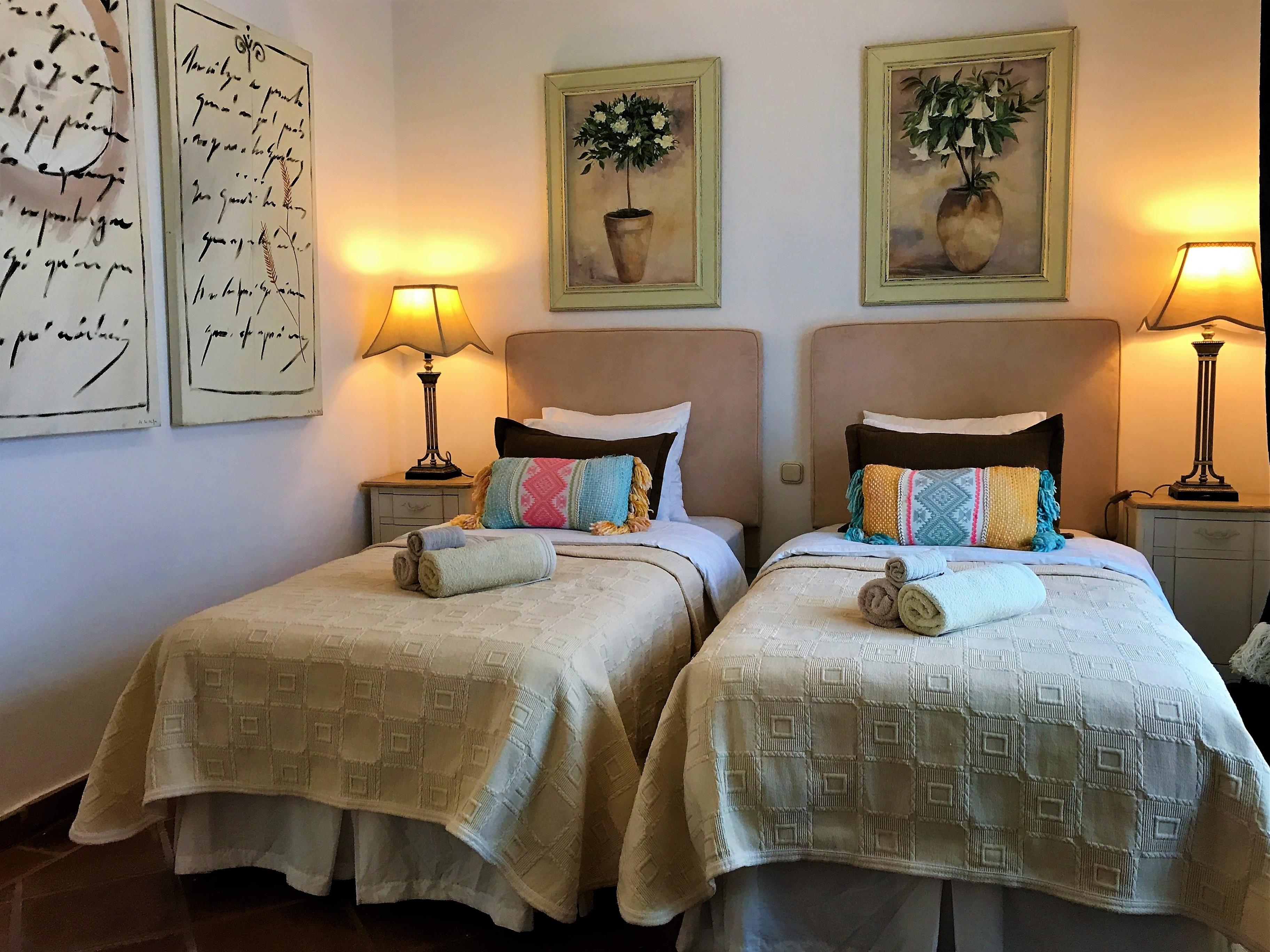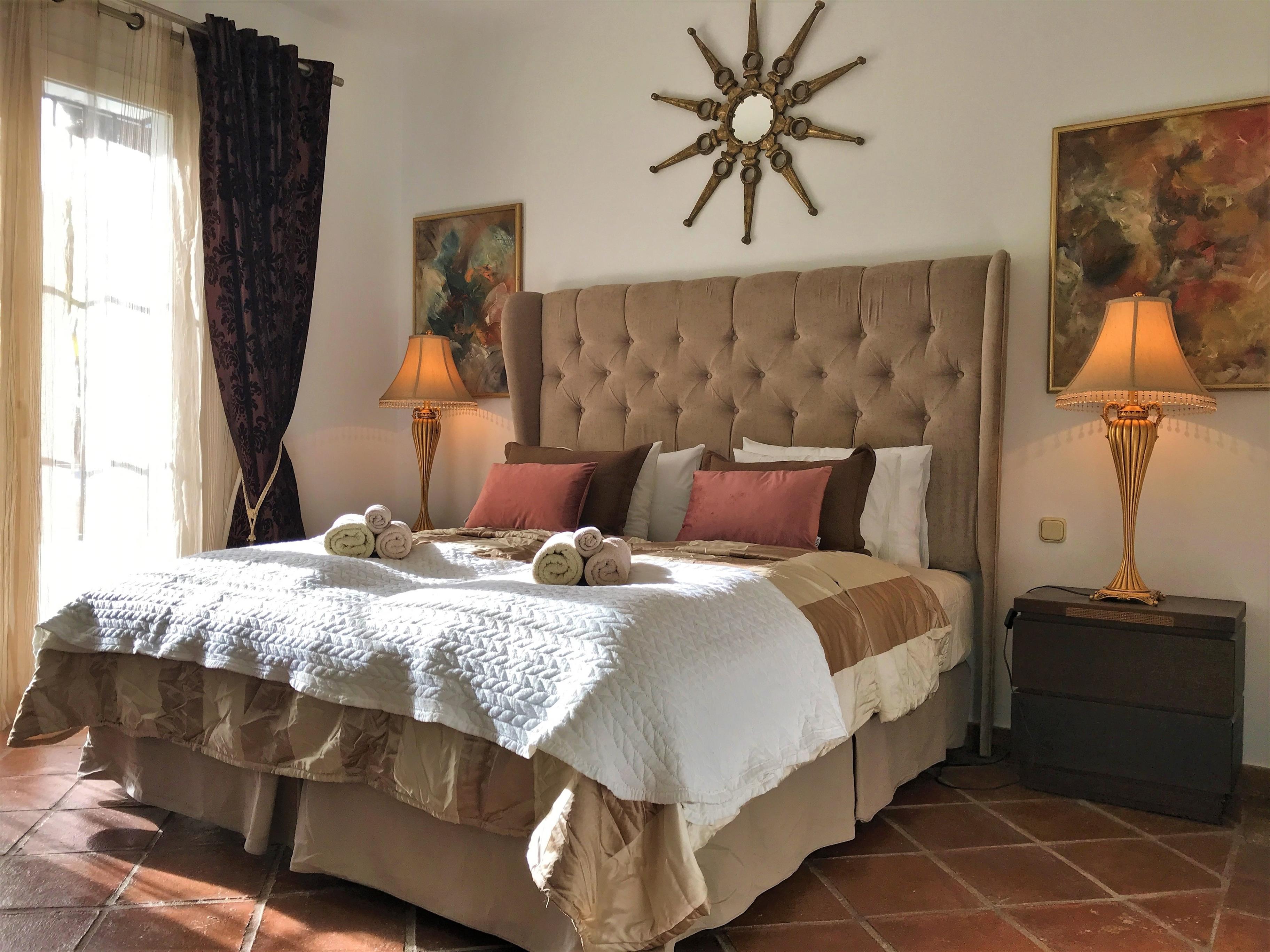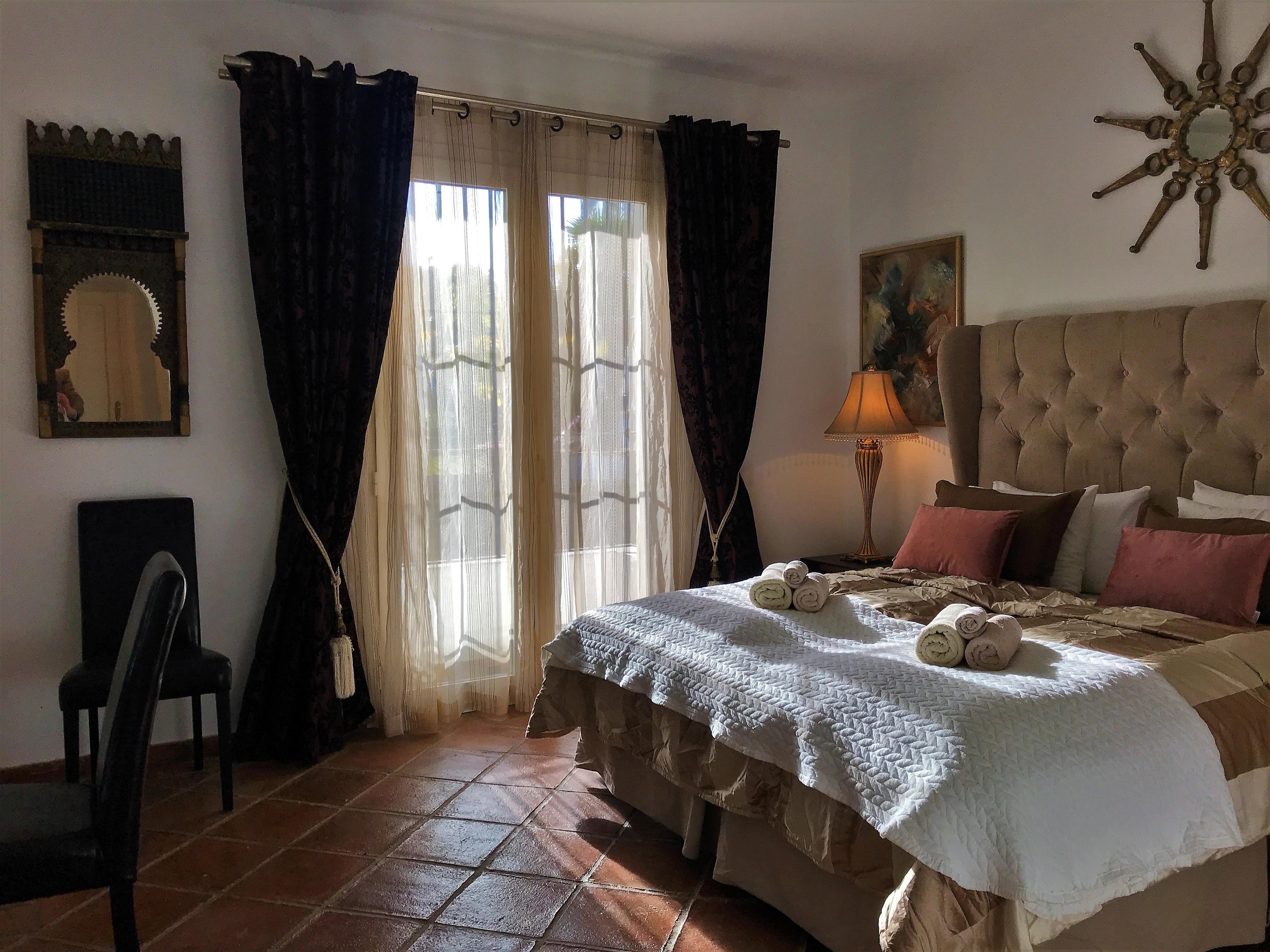Neben dem Essbereich führen 2 Türen zu den Schlafzimmern: Das Hauptschlafzimmer ist etwas geräumiger & bietet neben grossem Doppelbett, direkten Pool- und Meerblick & ein grosses en-suite Vollbad mit Doppelwaschbecken, WC, Bidet, Badewanne & separate Dusche.