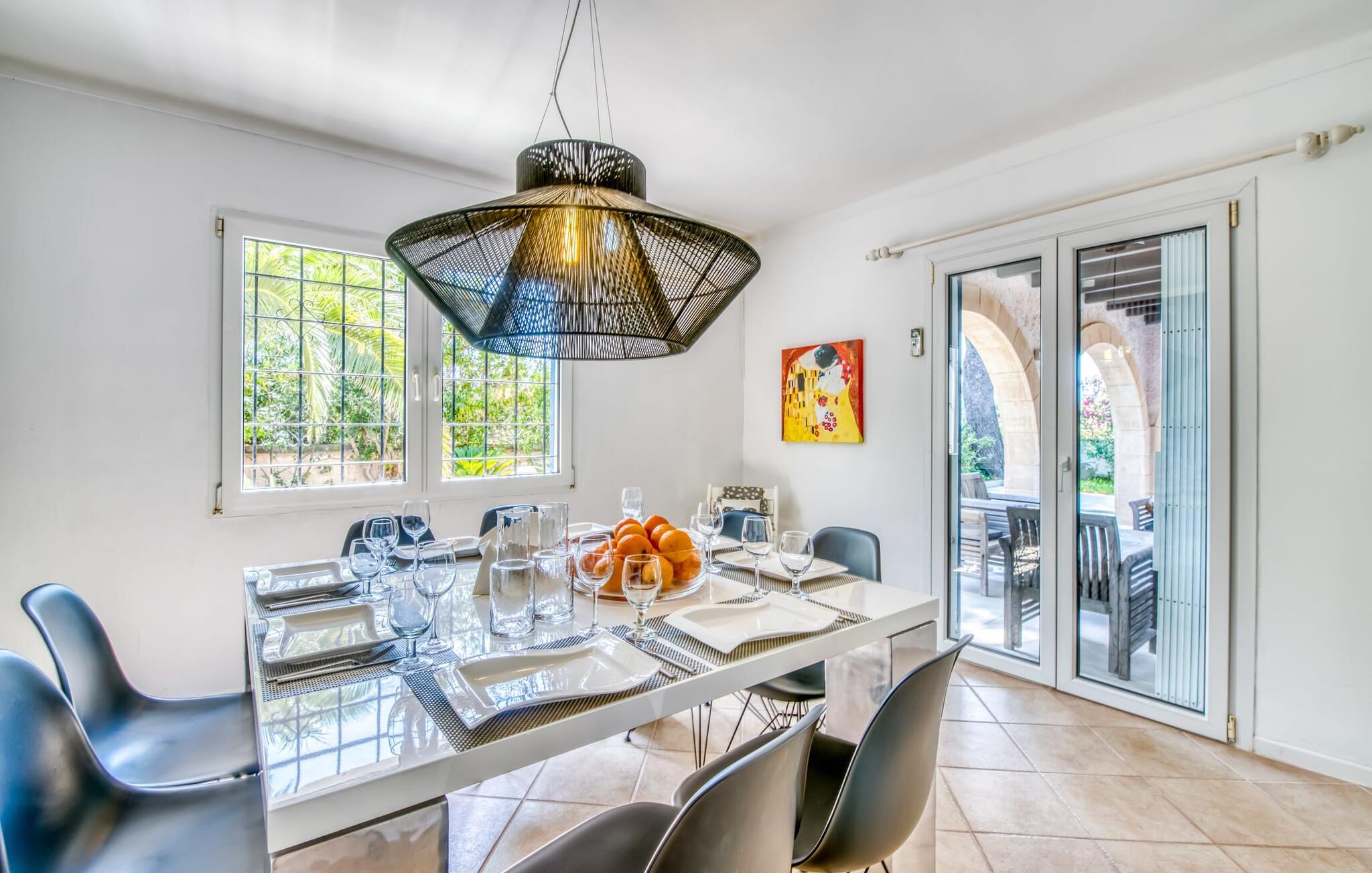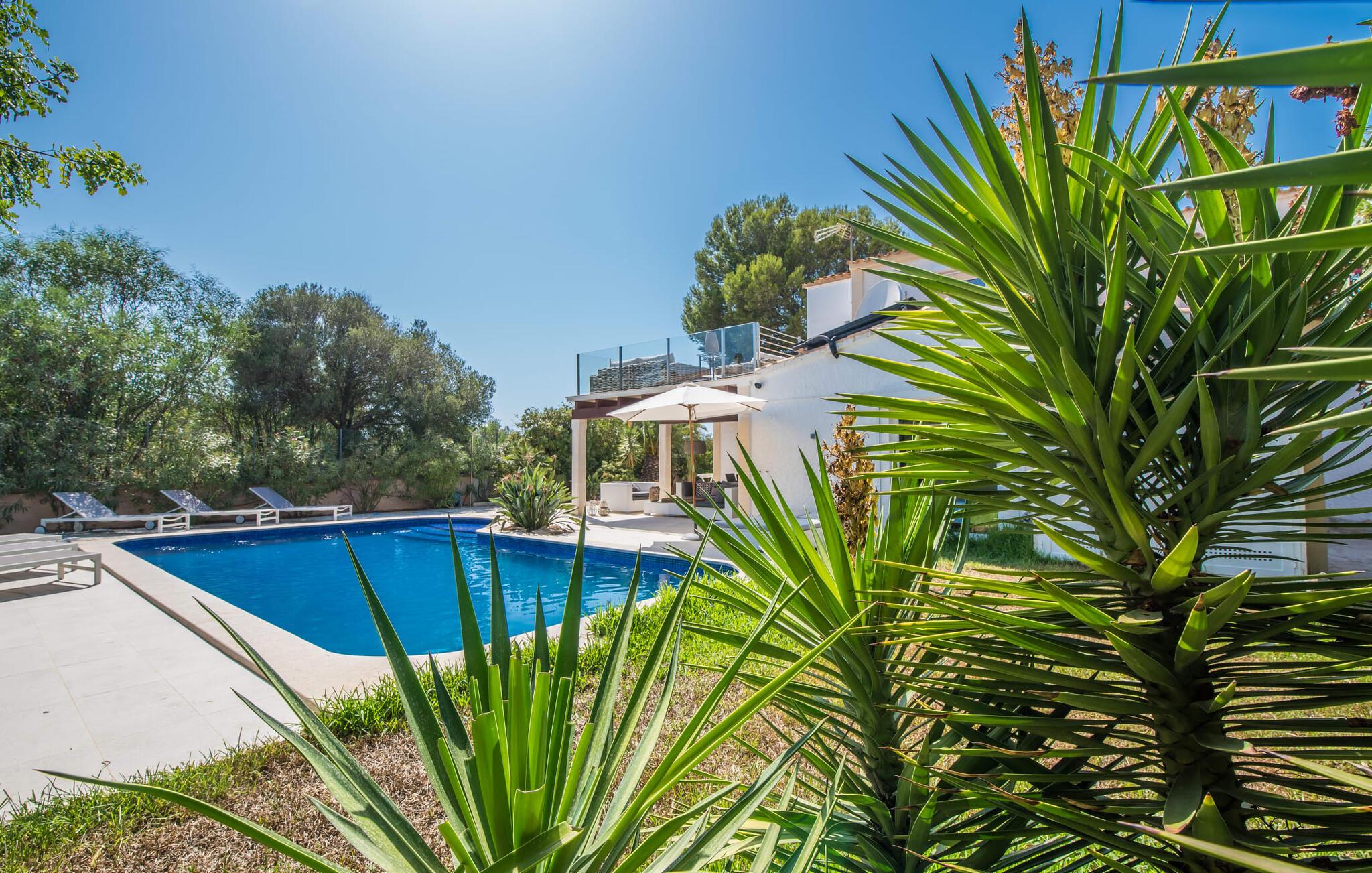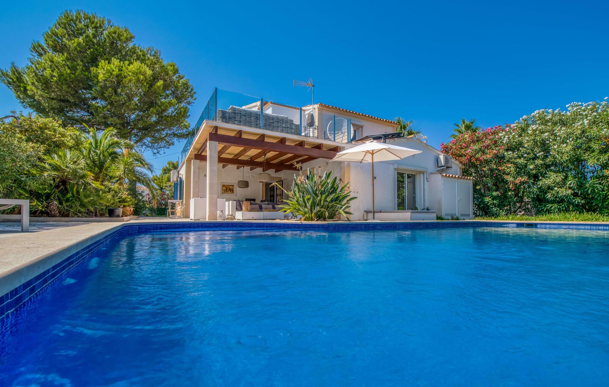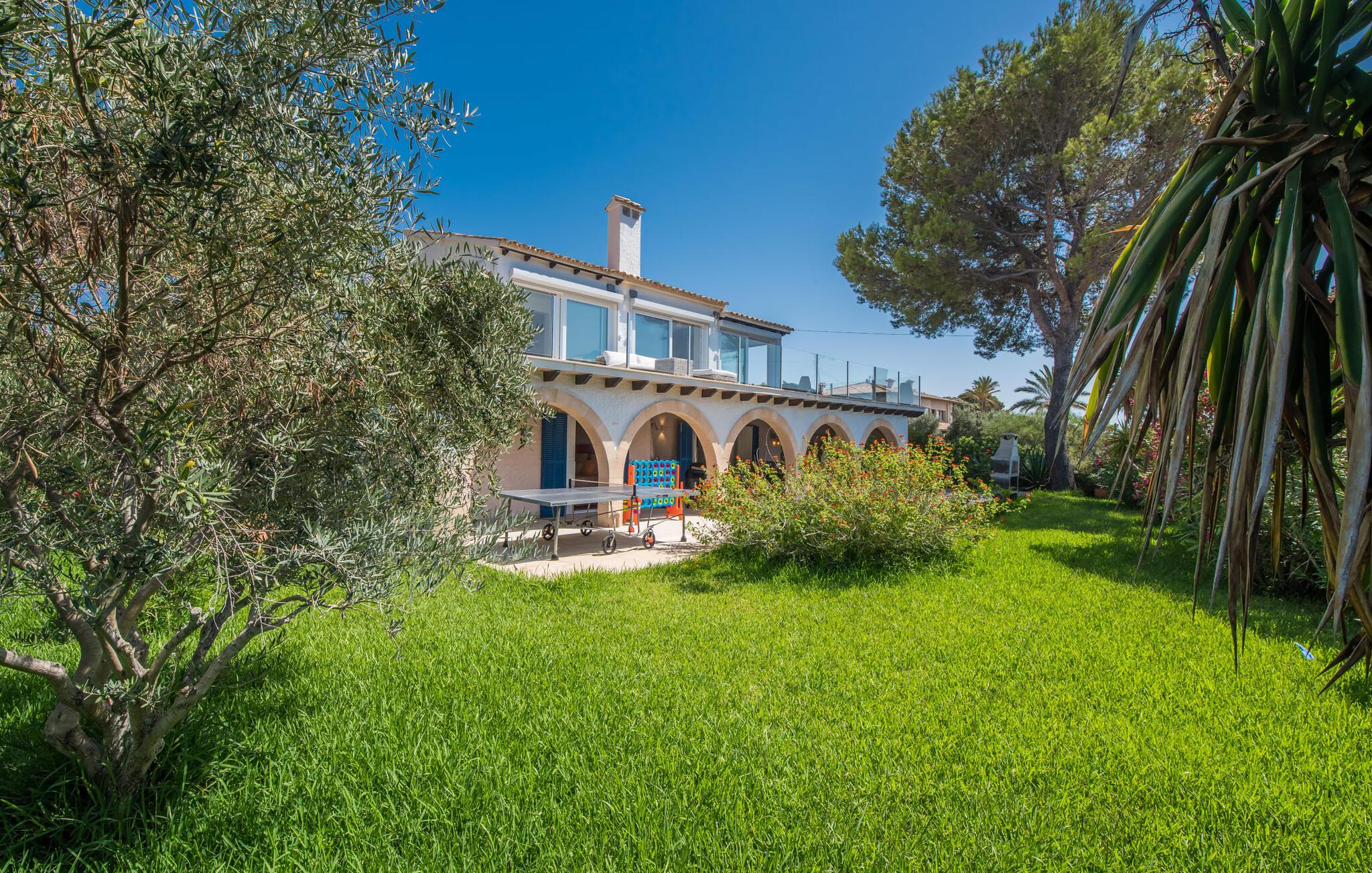 Oplev ferielykke i bebyggelsen "Cielo de Bonaire", kun få skridt fra havet. Denne charmerende villa med havudsigt har blå døre og skodder, der afspejler kystens skønhed. Ejendommen har en majestætisk have og en privat nyreformet pool omgivet af godt polstrede rattanmøbler til afslapning. Nyd den hyggelige udendørs lounge under et skyggefuldt tag og den betagende havudsigt fra terrasserne ovenpå. Villaens design omfatter indbydende buer, der skaber komfortable siddepladser perfekt til afslapning efter stranddage. En grillaften og en flaske vin venter jer til skønne sommeraftener. Mens parkering er tilgængelig på en stille gade, er garagen ikke inkluderet i lejeprisen. Indenfor byder "Casita de Nicolas" på en stilfuld blanding af indretning og et rummeligt opholds- og spiseområde, der er problemfrit forbundet med udendørsområdet. Det moderne køkken er veludstyret og de fire forskellige soveværelser, lige fra de livlige en-suite soveværelser med terrasseudgang til de to rolige ovenpå soveværelser med private terrasser og havudsigt, passer til enhver smag og lejlighed. Fra lufthavnen til jeres destination på en time: Den stilfulde villa "Casita de Nicolas" med sine indbydende buegange ligger ved foden af Pollença-bugten, kun få skridt fra vandet. Blot et par kilometer fra den gamle bydel i Alcúdia og det nærmeste store supermarked er det solidt forankret i det eksklusive feriested Bonaire - inklusive en overflod af topstrande og bugter. Mal Pas byder på en marina med barer og restauranter. Sejlads og bådture er organiseret fra lystbådehavnen.
