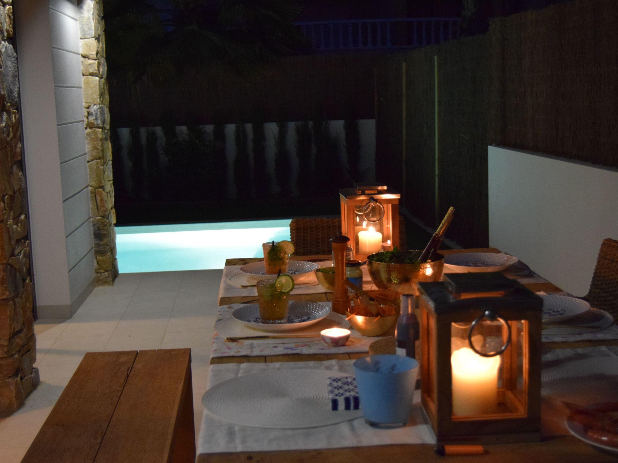The two roof terraces are equipped with 4 sun loungers and a lounge area with room for 6 people. A small lower terrace is equipped with a table with 4 chairs. The main terrace is equipped with an oak table for 8 people with awning overlooking the pool and outdoor shower