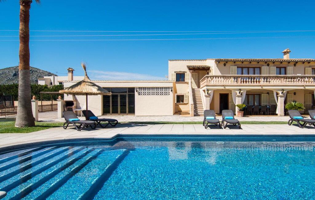 Den to-etagers villa "Catalina", som ligger på en kæmpe grund på 30.000 m², byder os velkommen som sande grundejere. Villaen med udjævnede, gul-orange vægge og en stor altan med terrasser nedenunder passer problemfrit ind i middelhavslandskabet i den nordlige del af Mallorca. De smukke cremefarvede skodder beskytter mod varme om sommeren og mod kulde om vinteren. Et stort højdepunkt er den store pool med en bred trinindgang, som inviterer jer til at slappe af og svømme. Poolområdet har en solterrasse med liggestole og masser af parasoller. Solterrassen grænser op til det overdækkede terrasselandskab. Efter en dag ved poolen kan I grille med jeres venner og nyde et godt glas vin ved det trendy udendørs spisebord i patina-look. Det er vigtigt at tage sig god tid og slappe af – den smarte lounge-facilitet lige ved siden af spisepladsen er perfekt til dette. Indenfor finder vi lyse og rummelige fællesarealer med talrige træskodder og komfortable sofaer i iøjnefaldende trendy farver (gul og grøn), som inviterer til hyggelige timer foran fjernsynet eller til at læse en god bog. Tilbehør til hjemmet som moderne træskulpturer understreger denne villas moderne karakter. Det moderne trækøkken er ganske enkelt rummeligt med smarte kromkontraster (komfur og keramisk kogeplade, opvaskemaskine, stort køle-fryseskab, brødrister, kaffemaskine og meget mere). Det runde glas spisebord passer problemfrit. I alt syv soveværelser kan rumme op til 12 personer, hvilket gør det til et fantastisk feriehus for to til tre familier eller en stor gruppe af rejsevenner. Soveværelserne er indrettet i harmoniske farver; Her finder I orange-brune jordfarver, bløde lilla og blomstermønstre. Gæsterne har adgang til adskillige moderne badeværelser (med bruser og/eller badekar), en vigtig komfort under jeres ferieophold. Placeringen af villaen er ikke isoleret, men er i udkanten af byen Alcúdia. Herfra kan I hurtigt og nemt nå den historiske gamle bydel i Alcúdia og dens fascinerende bymure - nogle fra middelalderen og renæssancen - inviterer jer til at udforske, slentre og nyde. I Alcúdia er der marked tirsdag og søndag, hvor forskellige gader i den gamle bydel er lukket for trafik, og der tilbydes et stort udvalg af forskelligartede varer. Hvis I kan lide at være aktiv på ferie, så besøg de smukke strande ved de lokale bugter, hvor I kan øve alle tænkelige vandaktiviteter. Alcúdia ligger i et til dels meget bjergrigt område og er derfor ideel til vandreture og mountainbiking. I vest begynder de flade sletter, som er ideelle for cyklister. De subtilt farvede og alligevel karakteristiske møbler inviterer jer til at tilbringe en afslappende og glad ferie fuld af muligheder i den storslåede villa "Catalina". Den enorme villa "Catalina" med dens overdimensionerede pool, der strækker sig langs forsiden af huset med en enorm omgivende solterrasse, ligger nær den meget smukke gamle bydel i Alcúdia på det nordlige Mallorca. Det er beliggende på en stor 30.000 m² stor grund, hvorfra I hurtigt og nemt kan nå selve byen Alcúdia (til jeres daglige indkøb, besøg i butikker eller slentre) samt de nærliggende sandstrande.