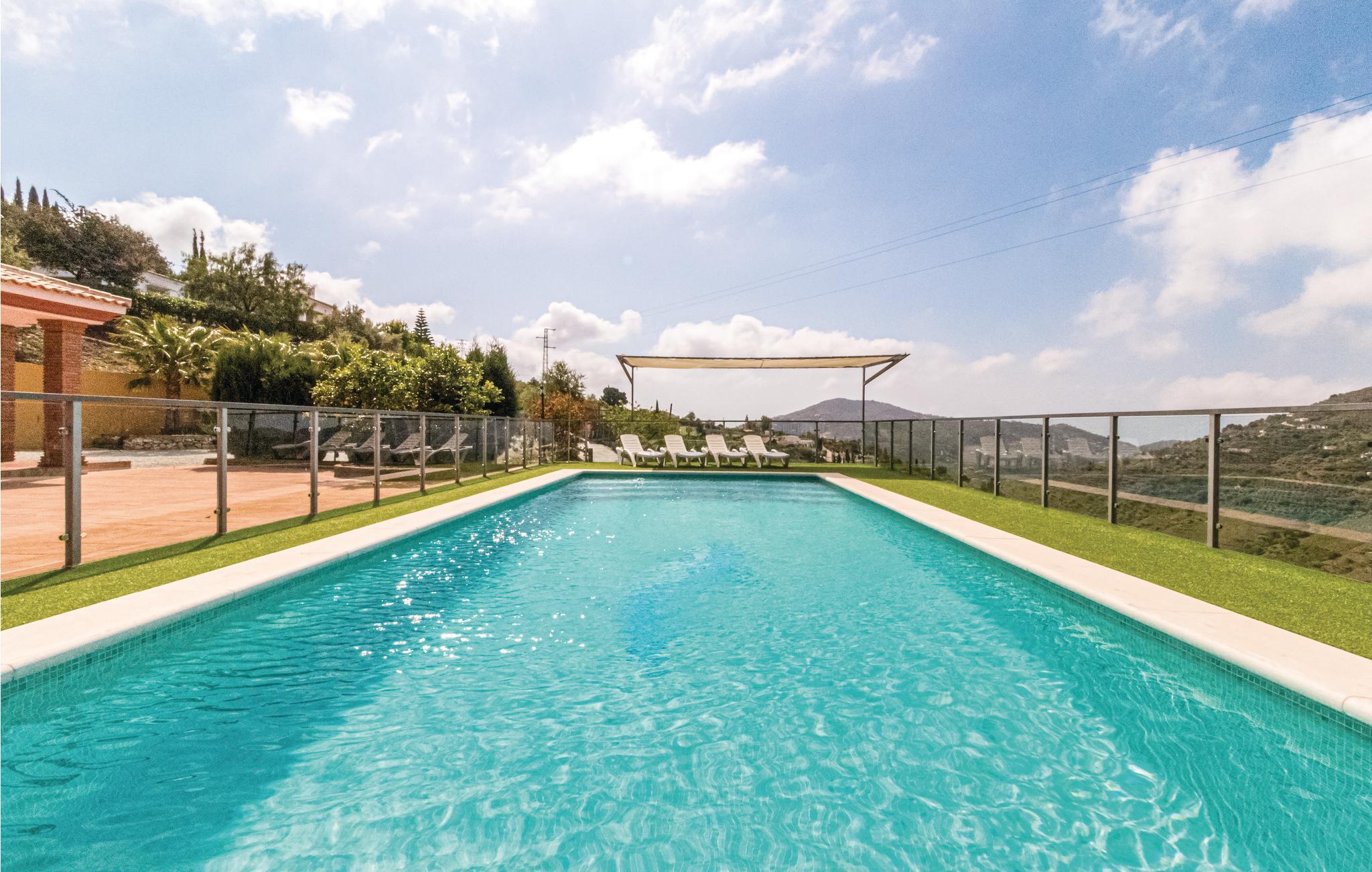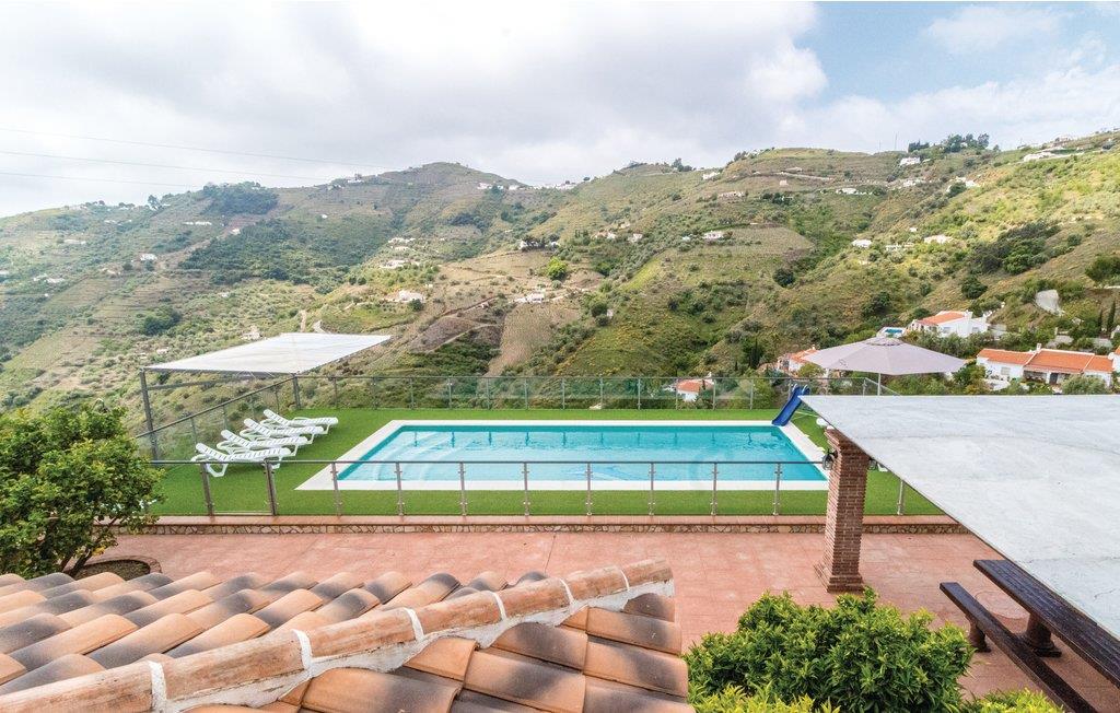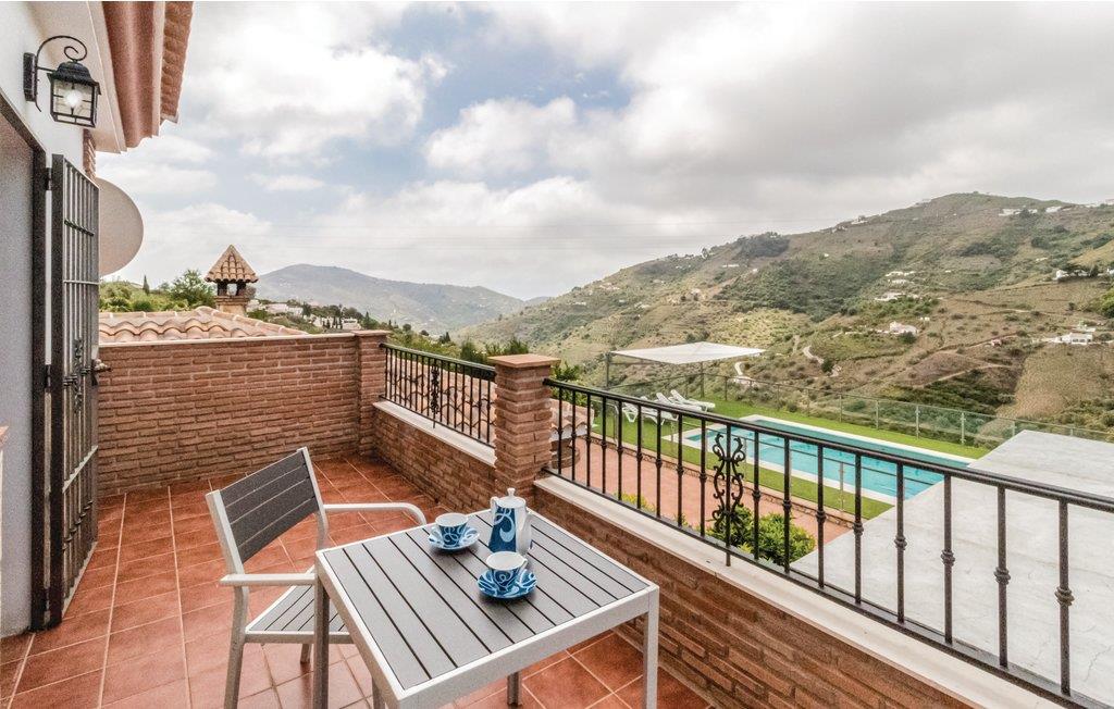 Smukt sommerhus på landet nær Cómpeta, en af de hvide landsbyer i Axarquía. Huset ligger i Sierras de Tejeda naturpark og tilbyder i kraft af sin enestående beliggenhed en spektakulær udsigt over landskabet. Dette storslåede hus ligger 5 minutters kørsel fra byen, og det tilbyder 5 store soveværelser, en stue og et køkken forbundet med en bar, så du kan nyde din families selskab, mens du laver mad. Der er også en smuk terrasse stor spiseplads ved siden af grillen og en blændende 11 meters pool med liggestole, ideel til at slappe af og nyde den lune sol på det østlige Costa del Sol. Nyd den storslåede udsigt over tropiske frugtplantager og vinmarker. De sidste 200 meter op til huset er stejl.
