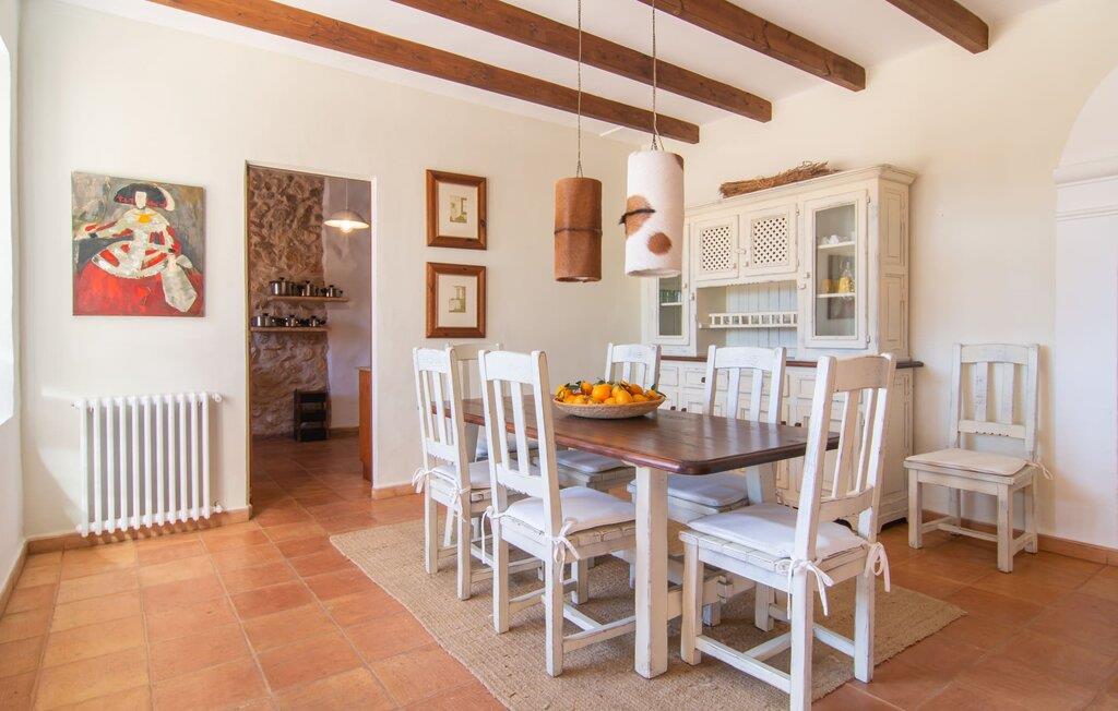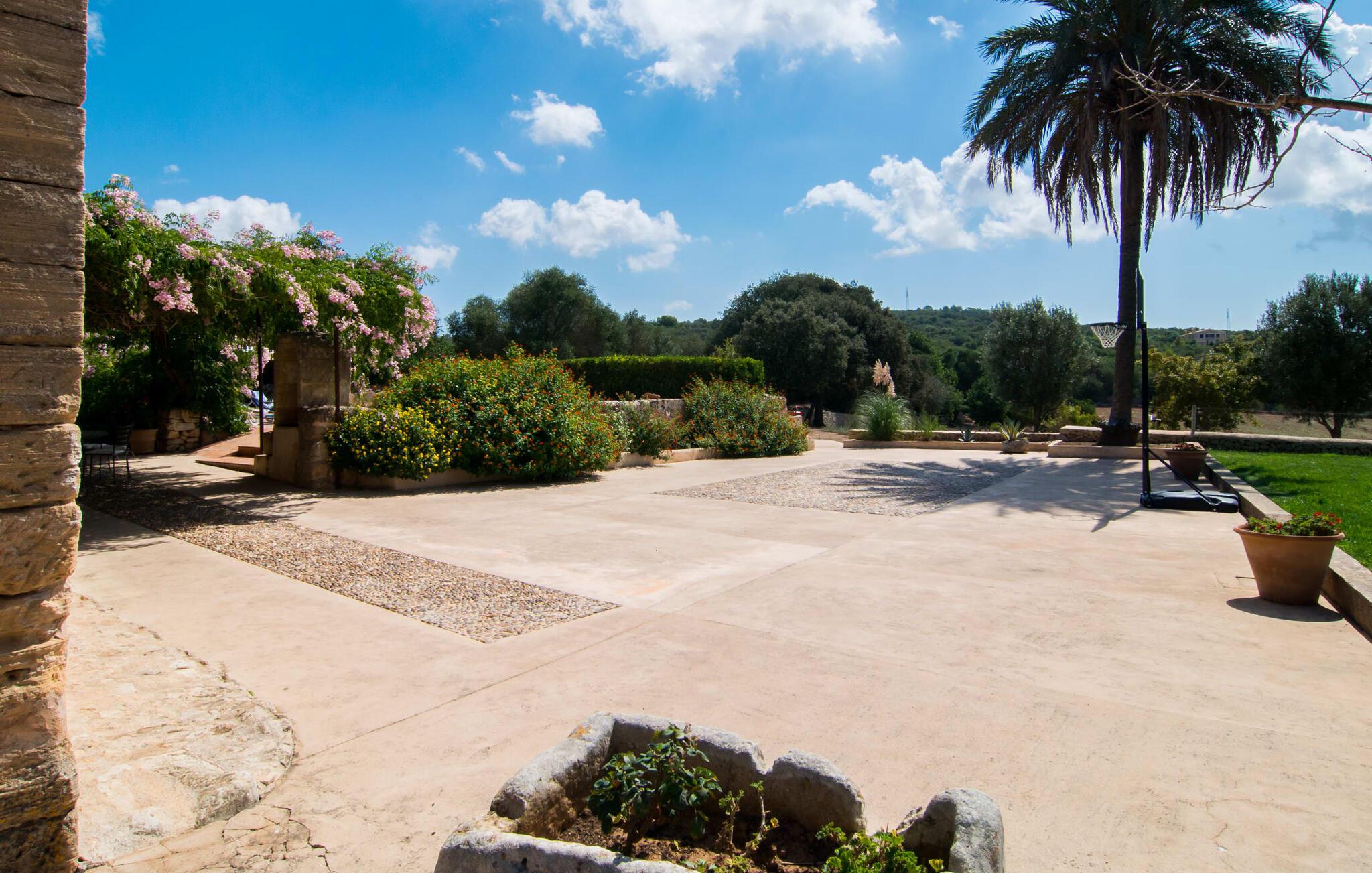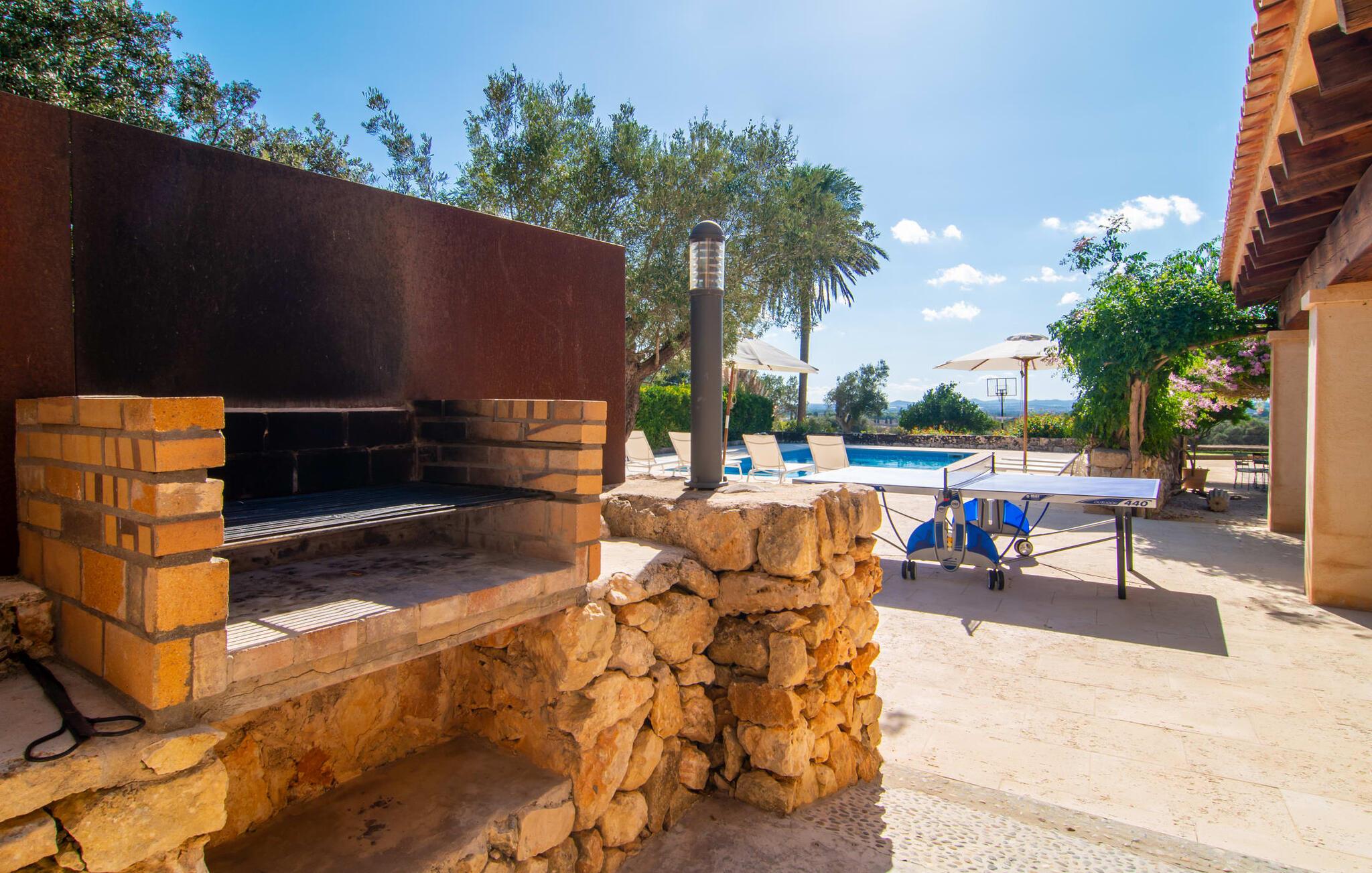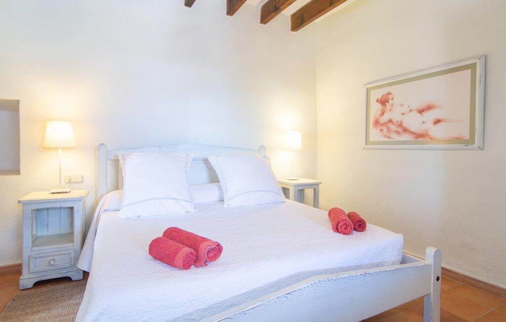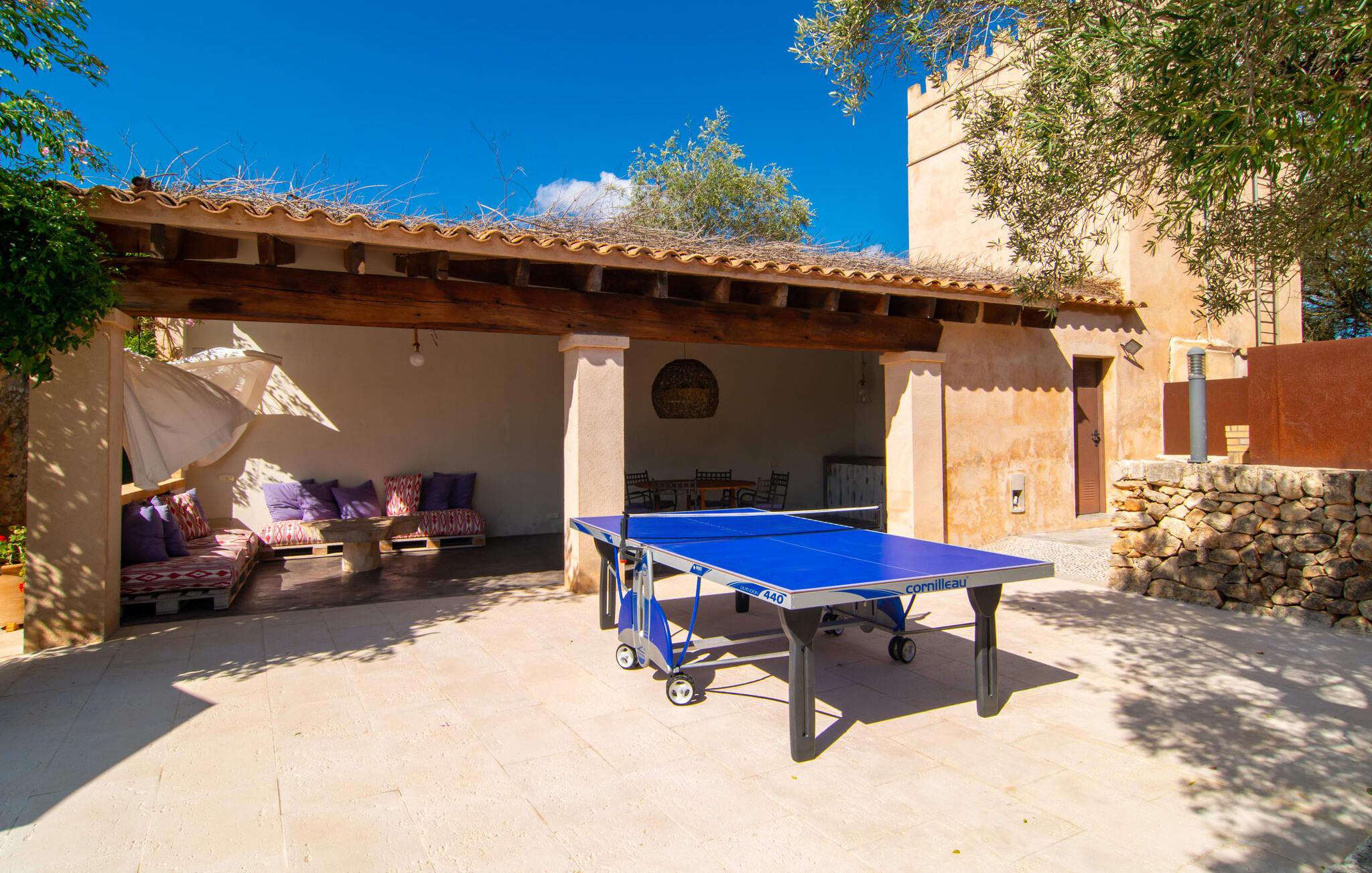 Langs den rustikke snoede sti mod Villa "Conies Vell" står det hurtigt klart, at der er tale om et virkelig elegant feriehus. Den rummelige, velholdte ejendom vil straks imponere jer, ligesom selve den herskabelige ejendom, der på mange sider er omgivet af brugbare terrasser og en idyllisk have. De høje palmer i den rummelige gårdhave samt de forskellige udendørs elementer, der er samlet omkring dette sted, er en sand fryd for øjet. Her venter en grøn græsplæne, som er et godt sted for små feriegæster at løbe rundt og lege. På den rummelige terrasse, der strækker sig over flere sider af huset, kan I nyde, hvad I vil, enten i det fri eller alternativt under det smukke, naturlige tag. Under de tætte vinstokke sidder I direkte ved huset og samtidig i umiddelbar nærhed af poolen, som I kan se evt. Et rundt spisebord med stole inviterer jer til at spise i en hyggelig atmosfære. Den åbne stue og spisestue i den lille tilstødende bygning er mindst lige så attraktiv. Her kan I slappe helt af i det helt afkølede sofahjørne eller sidde ved spisebordet. Det direkte tilstødende udendørs køkken og grill giver jer mulighed for at tilberede mad al fresco og tilbringe hele dagen udendørs i varmt vejr. Om aftenen er dette simpelthen et vidunderligt sted at afslutte en tilfredsstillende dag. Der er endda lys her! De sportsentusiaster blandt jer vil nyde at spille en eller to kampe på det mobile bordtennisbord, samt spille basketballkurven i gården. Et ord om poolen: Den 10 m lange pool er flisebelagt i en lys nuance af blå og varierer i dybden mellem 0,6 og 1,8 m. Den omkringliggende terrasse er udstyret med i alt otte komfortable liggestole, som I kan nyde solen på stråler af hjertens lyst nyde og samtidig komme jer fra en hektisk hverdag. To parasoller er tilgængelige, hvis det er nødvendigt for at beskytte jer mod stærke UV-stråler. Der er en parkeringsplads til jeres lejebil lige ved siden af bygningen. Og bag huset bor der et yndigt æsel i hans fold. Den større vej ligger 500 m fra villaen, men der er næsten ingen trafik. En spisestue indrettet i landlig stil, som er tilgængelig direkte fra husets terrasse, byder sine besøgende velkommen med et lyst og meget hjemligt præg. Dette værelse er indrettet både økonomisk og smagfuldt, så det behagelige indtryk af rummelighed og overskuelighed ikke er gået på kompromis på nogen måde. Hvide vægge og lofter, naturfarvede synlige bjælker og terracottafarvede gulvfliser skaber et meget harmonisk samspil, som suppleres af originale vintage-stykker og skaber en unik stemning. Gennem en bred bue kommer I ind i den hyggelige stue, hvor en munter, farverig sofa inviterer til afslapning. Det store fladskærms-tv med satellitforbindelse er tilgængeligt samt det lille musikanlæg og er til rådighed for gode underholdningsmuligheder. I vil måske også fordybe jer i en god bog eller en god samtale. Køkkenet, som også er tilgængeligt fra spisestuen, er udstyret med alt hvad I behøver til daglige behov, herunder en kedel og en Nespresso/espressomaskine. Meget individuelt og drømmende designede soveværelser tilbyder ikke kun plads nok til alle, der rejser med jer, men tilbyder også noget for enhver smag og sikrer en afslappende søvn. Der er et separat soveværelse med badeværelse, som kun er tilgængeligt udefra og derfor giver en helt unik mulighed for at trække sig tilbage og finde ro. Generelt er badeværelserne rummelige og ikke kun praktiske, men også æstetisk designet. Hårtørrere og strygejern er til rådighed i huset, så I ikke behøver at bekymre jer om at tage jeres egen med hjemmefra. Myggenet er også tilgængelige for jeres komfort. Fra villaen kan I nå centrum af Manacor på få minutter i bil. Her kan I opleve det ugentlige marked hver mandag. Porto Cristo er omkring 16 kilometer væk. Der finder I flere store supermarkeder, hvoraf nogle endda har åbent på søndage og helligdage. Den maleriske promenade inviterer jer til at tage en afslappet spadseretur. Nogle nærliggende strande betragtes stadig som rigtige insidertips og er kendetegnet ved, at de er ubebyggede. Den rummelige villa "Conies Vell" har en charmerende landlig beliggenhed og er omgivet af en kæmpe grund. Et supermarked og et bageri ligger kun 5 minutter væk i bil. Den smukke bugt Cala Varques ligger omkring 17 kilometer væk. Andre strande som Cala Mandia ligger i samme afstand.