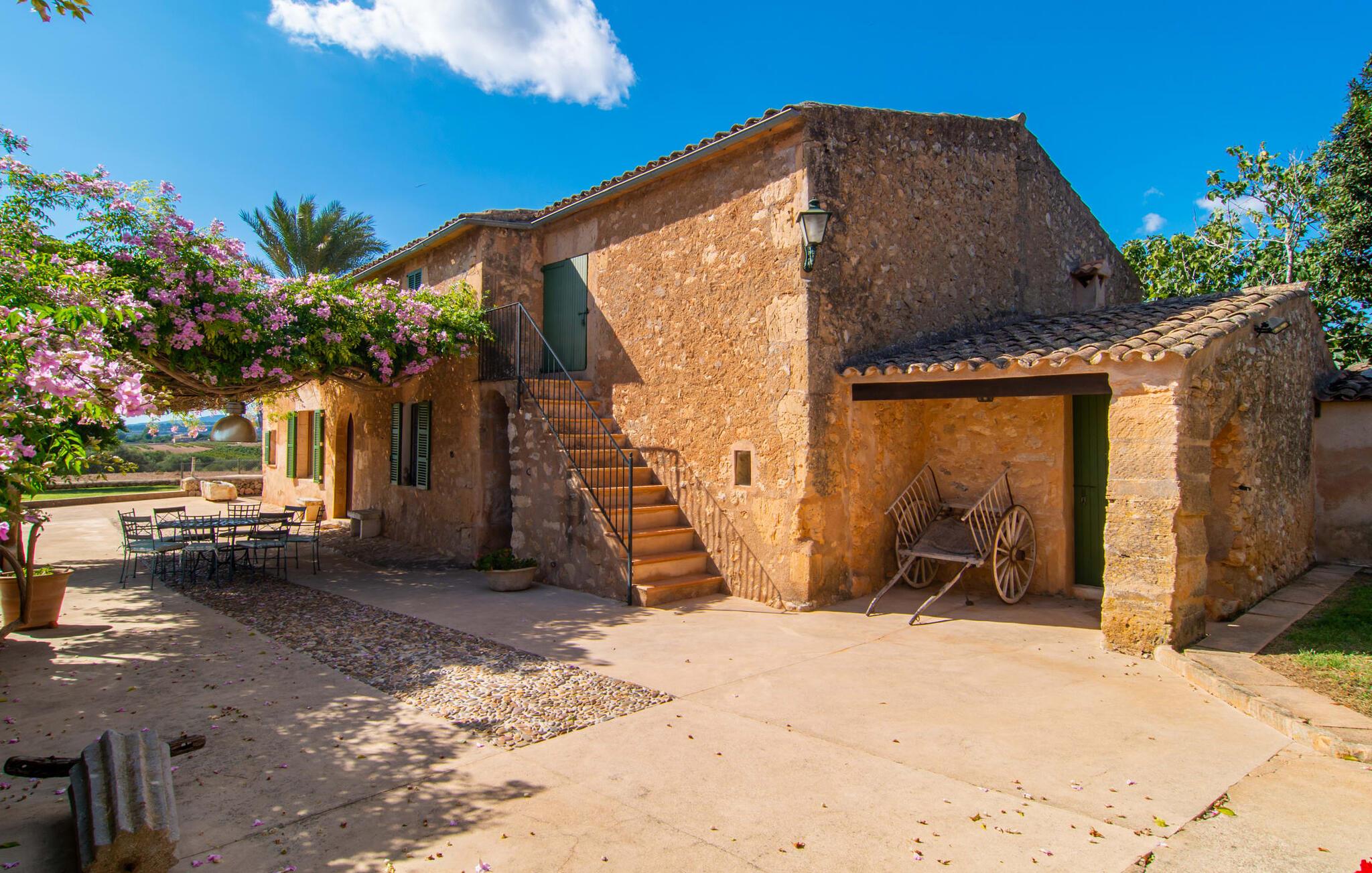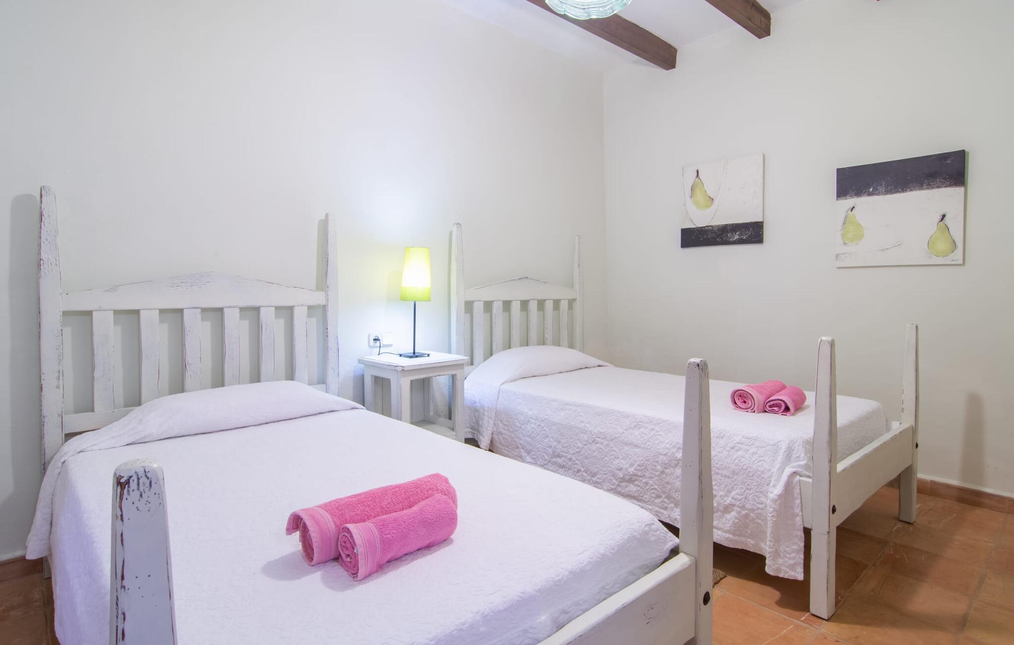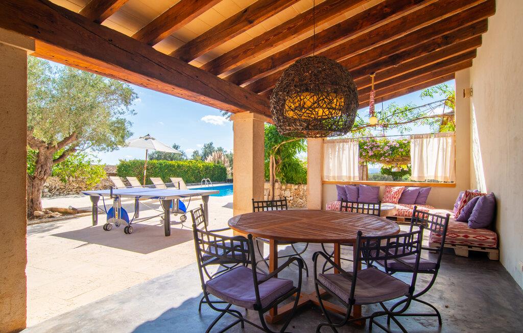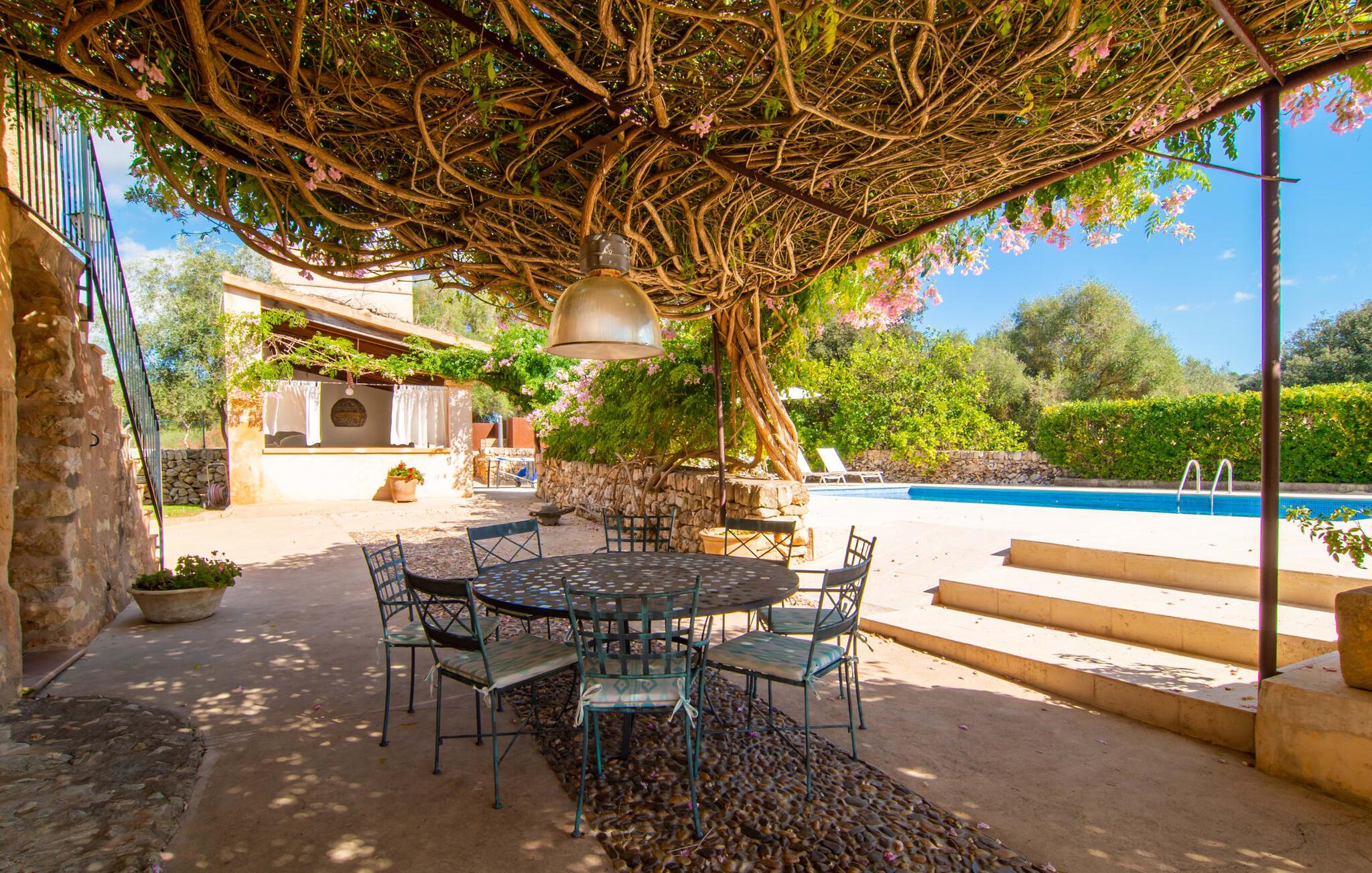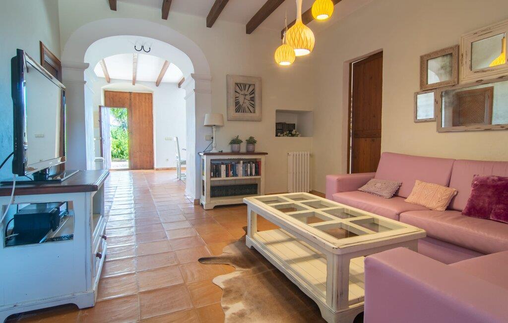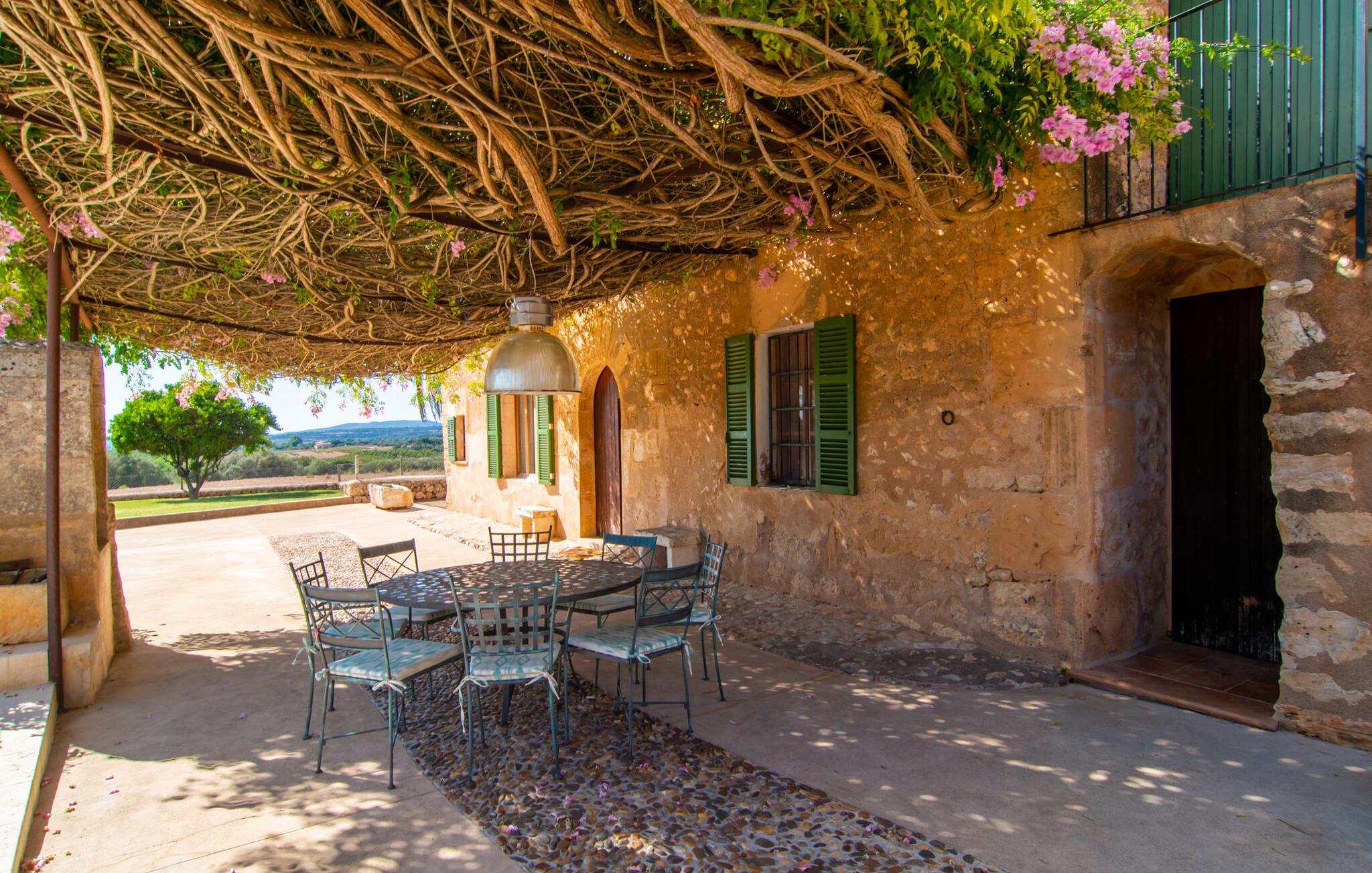 Langs den rustikke snoede sti mod Villa "Conies Vell" står det hurtigt klart, at der er tale om et virkelig elegant feriehus. Den rummelige, velholdte ejendom vil straks imponere jer, ligesom selve den herskabelige ejendom, der på mange sider er omgivet af brugbare terrasser og en idyllisk have. De høje palmer i den rummelige gårdhave samt de forskellige udendørs elementer, der er samlet omkring dette sted, er en sand fryd for øjet. Her venter en grøn græsplæne, som er et godt sted for små feriegæster at løbe rundt og lege. På den rummelige terrasse, der strækker sig over flere sider af huset, kan I nyde, hvad I vil, enten i det fri eller alternativt under det smukke, naturlige tag. Under de tætte vinstokke sidder I direkte ved huset og samtidig i umiddelbar nærhed af poolen, som I kan se evt. Et rundt spisebord med stole inviterer jer til at spise i en hyggelig atmosfære. Den åbne stue og spisestue i den lille tilstødende bygning er mindst lige så attraktiv. Her kan I slappe helt af i det helt afkølede sofahjørne eller sidde ved spisebordet. Det direkte tilstødende udendørs køkken og grill giver jer mulighed for at tilberede mad al fresco og tilbringe hele dagen udendørs i varmt vejr. Om aftenen er dette simpelthen et vidunderligt sted at afslutte en tilfredsstillende dag. Der er endda lys her! De sportsentusiaster blandt jer vil nyde at spille en eller to kampe på det mobile bordtennisbord, samt spille basketballkurven i gården. Et ord om poolen: Den 10 m lange pool er flisebelagt i en lys nuance af blå og varierer i dybden mellem 0,6 og 1,8 m. Den omkringliggende terrasse er udstyret med i alt otte komfortable liggestole, som I kan nyde solen på stråler af hjertens lyst nyde og samtidig komme jer fra en hektisk hverdag. To parasoller er tilgængelige, hvis det er nødvendigt for at beskytte jer mod stærke UV-stråler. Der er en parkeringsplads til jeres lejebil lige ved siden af bygningen. Og bag huset bor der et yndigt æsel i hans fold. Den større vej ligger 500 m fra villaen, men der er næsten ingen trafik. En spisestue indrettet i landlig stil, som er tilgængelig direkte fra husets terrasse, byder sine besøgende velkommen med et lyst og meget hjemligt præg. Dette værelse er indrettet både økonomisk og smagfuldt, så det behagelige indtryk af rummelighed og overskuelighed ikke er gået på kompromis på nogen måde. Hvide vægge og lofter, naturfarvede synlige bjælker og terracottafarvede gulvfliser skaber et meget harmonisk samspil, som suppleres af originale vintage-stykker og skaber en unik stemning. Gennem en bred bue kommer I ind i den hyggelige stue, hvor en munter, farverig sofa inviterer til afslapning. Det store fladskærms-tv med satellitforbindelse er tilgængeligt samt det lille musikanlæg og er til rådighed for gode underholdningsmuligheder. I vil måske også fordybe jer i en god bog eller en god samtale. Køkkenet, som også er tilgængeligt fra spisestuen, er udstyret med alt hvad I behøver til daglige behov, herunder en kedel og en Nespresso/espressomaskine. Meget individuelt og drømmende designede soveværelser tilbyder ikke kun plads nok til alle, der rejser med jer, men tilbyder også noget for enhver smag og sikrer en afslappende søvn. Der er et separat soveværelse med badeværelse, som kun er tilgængeligt udefra og derfor giver en helt unik mulighed for at trække sig tilbage og finde ro. Generelt er badeværelserne rummelige og ikke kun praktiske, men også æstetisk designet. Hårtørrere og strygejern er til rådighed i huset, så I ikke behøver at bekymre jer om at tage jeres egen med hjemmefra. Myggenet er også tilgængelige for jeres komfort. Fra villaen kan I nå centrum af Manacor på få minutter i bil. Her kan I opleve det ugentlige marked hver mandag. Porto Cristo er omkring 16 kilometer væk. Der finder I flere store supermarkeder, hvoraf nogle endda har åbent på søndage og helligdage. Den maleriske promenade inviterer jer til at tage en afslappet spadseretur. Nogle nærliggende strande betragtes stadig som rigtige insidertips og er kendetegnet ved, at de er ubebyggede. Den rummelige villa "Conies Vell" har en charmerende landlig beliggenhed og er omgivet af en kæmpe grund. Et supermarked og et bageri ligger kun 5 minutter væk i bil. Den smukke bugt Cala Varques ligger omkring 17 kilometer væk. Andre strande som Cala Mandia ligger i samme afstand.